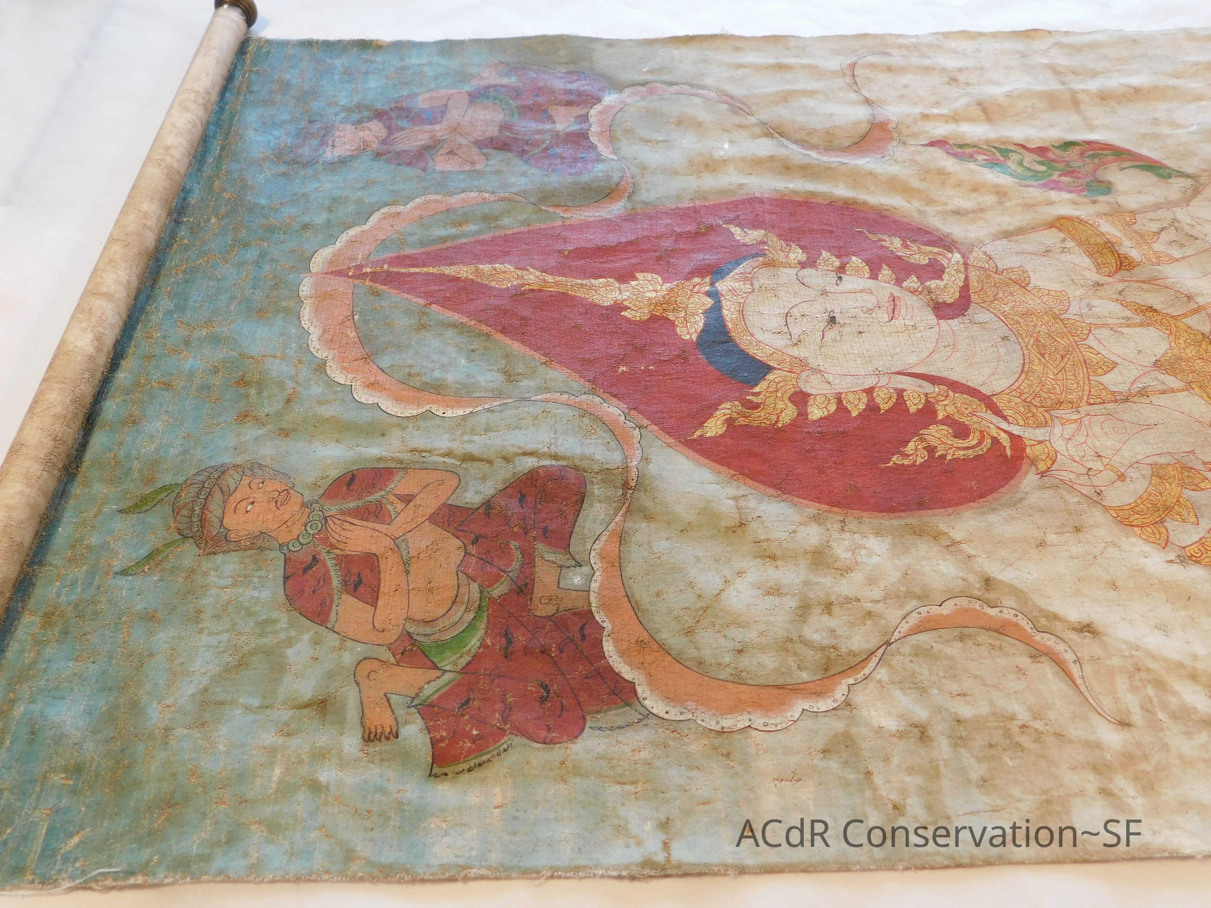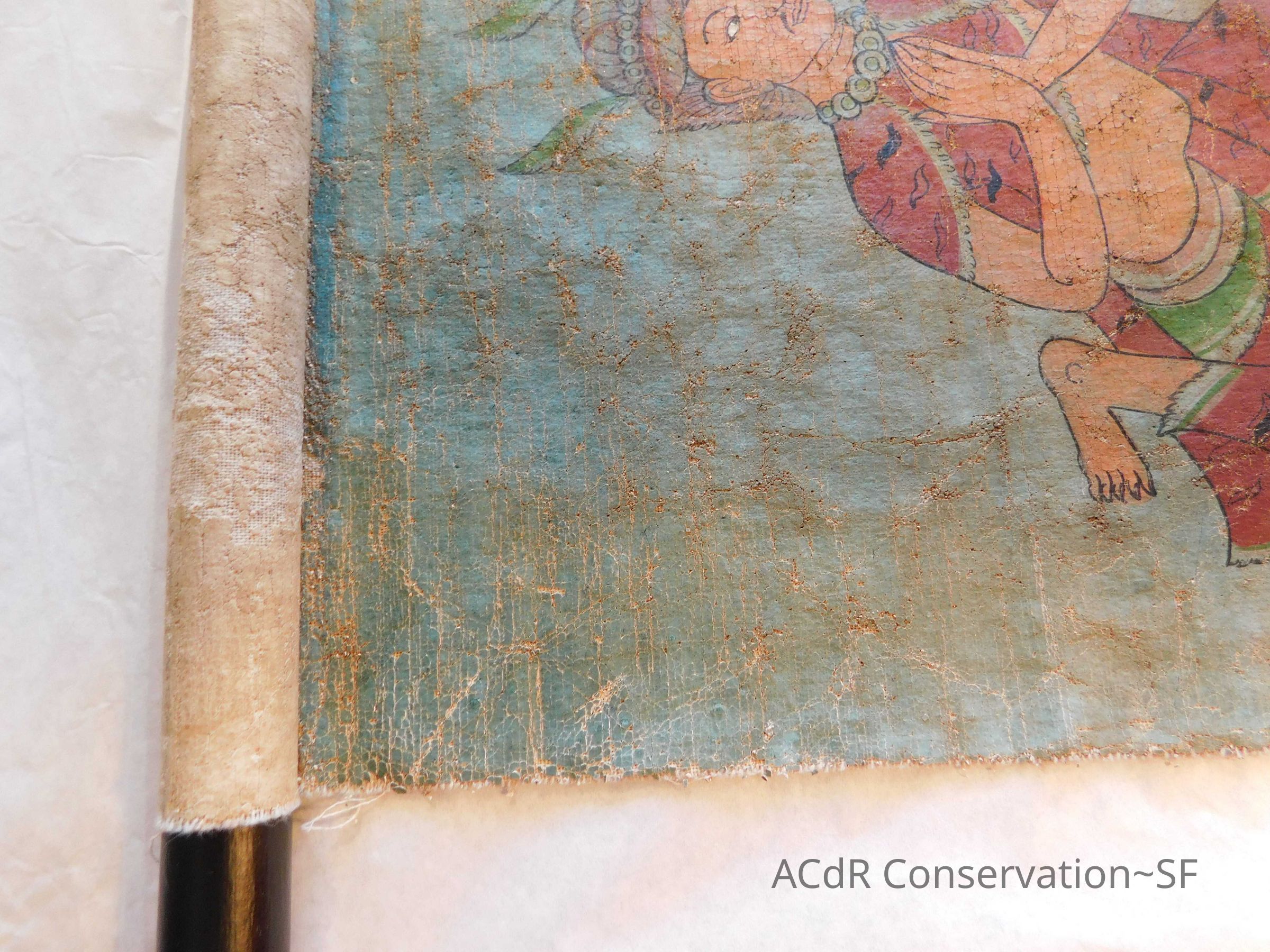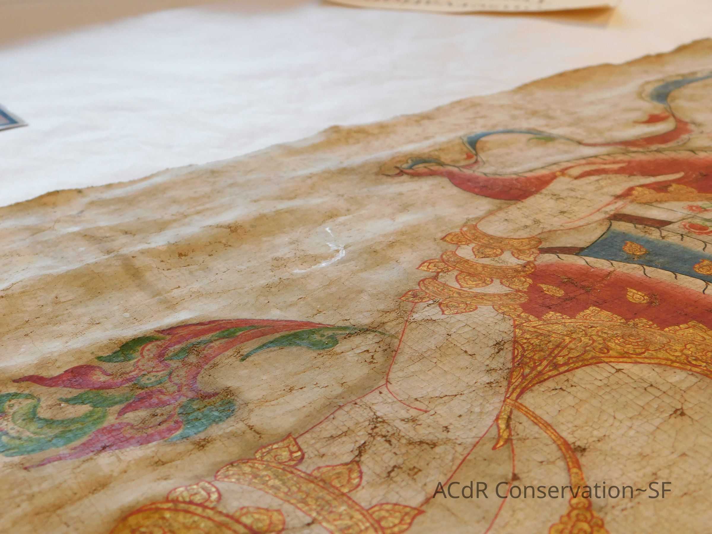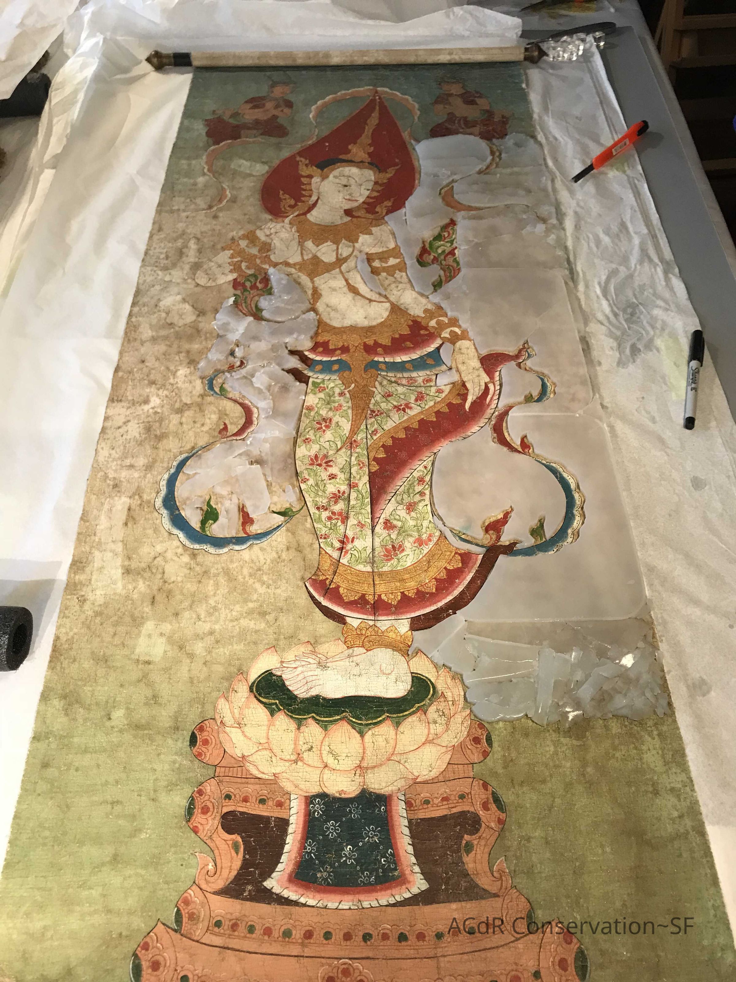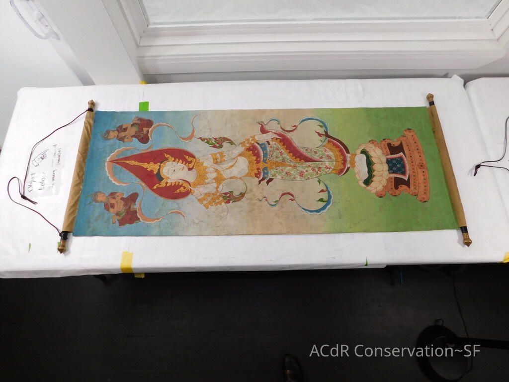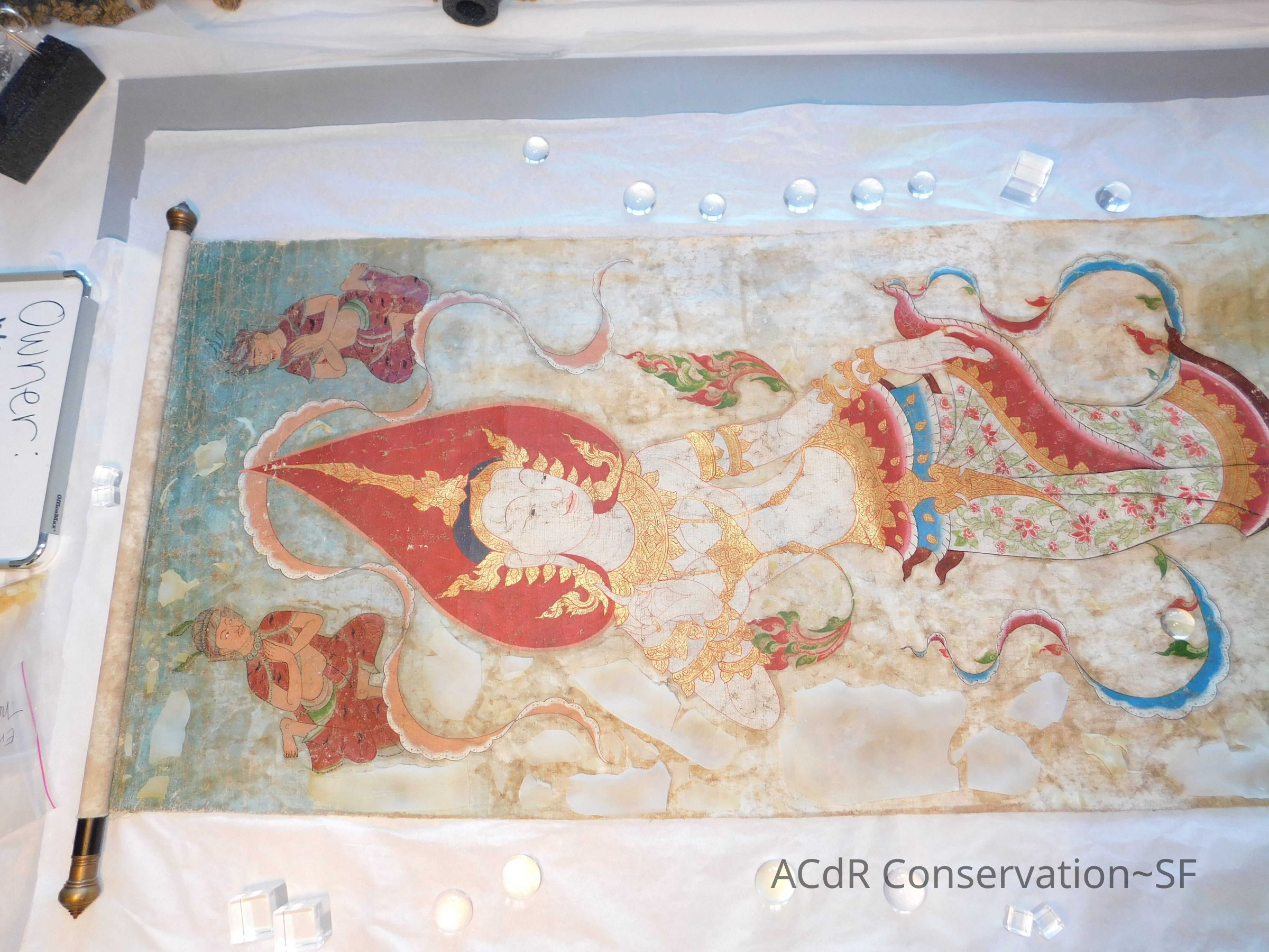 Began smoothing background appearance using wash of thinned watercolors to match what was completed on opposite scroll.