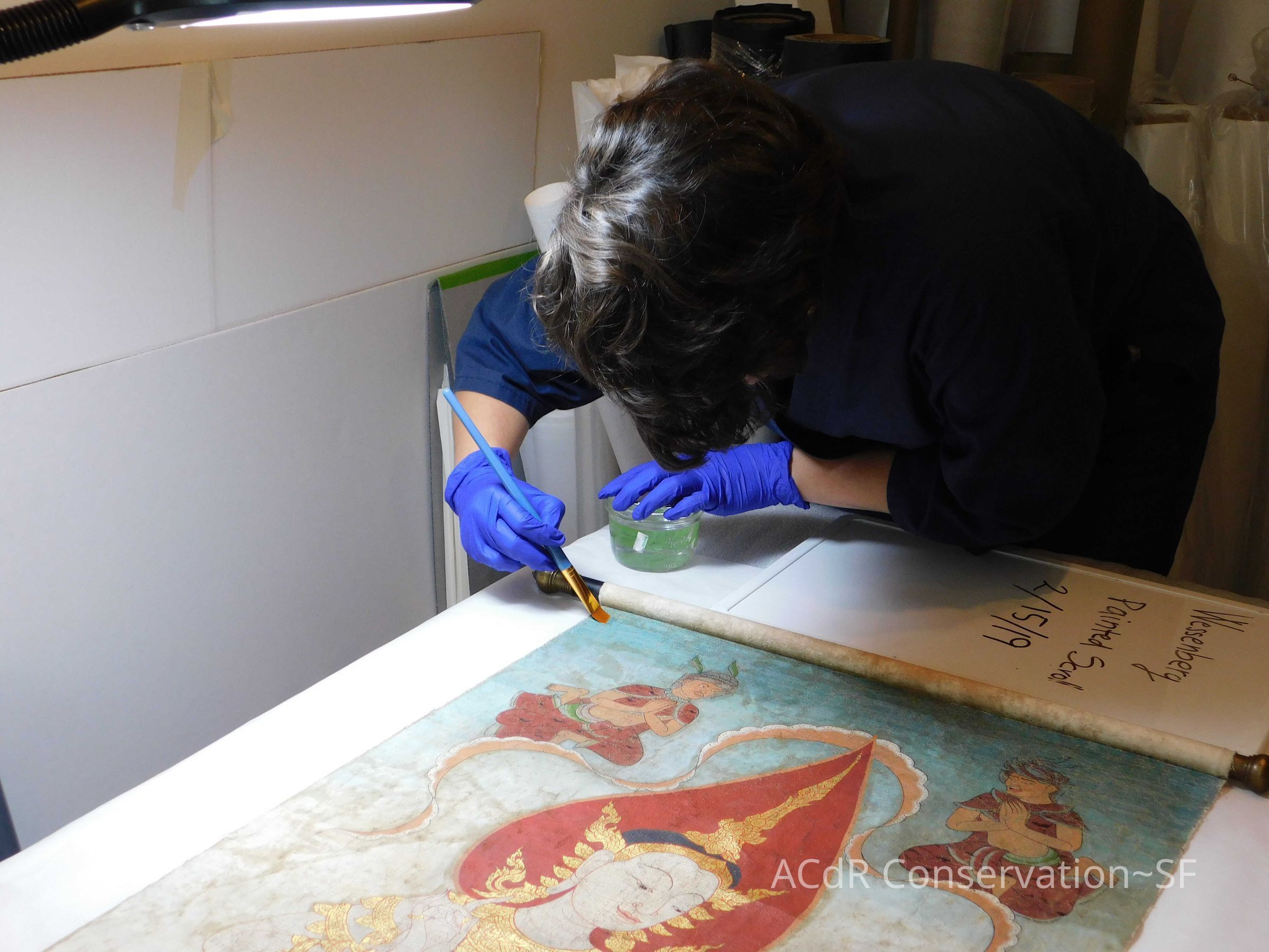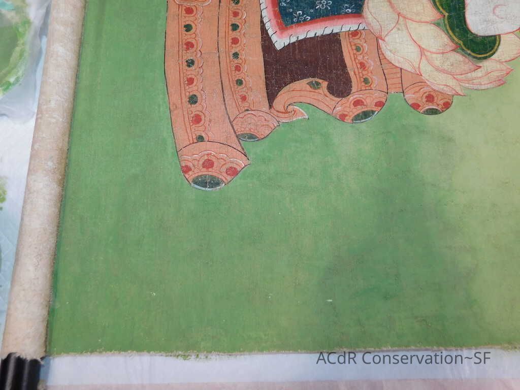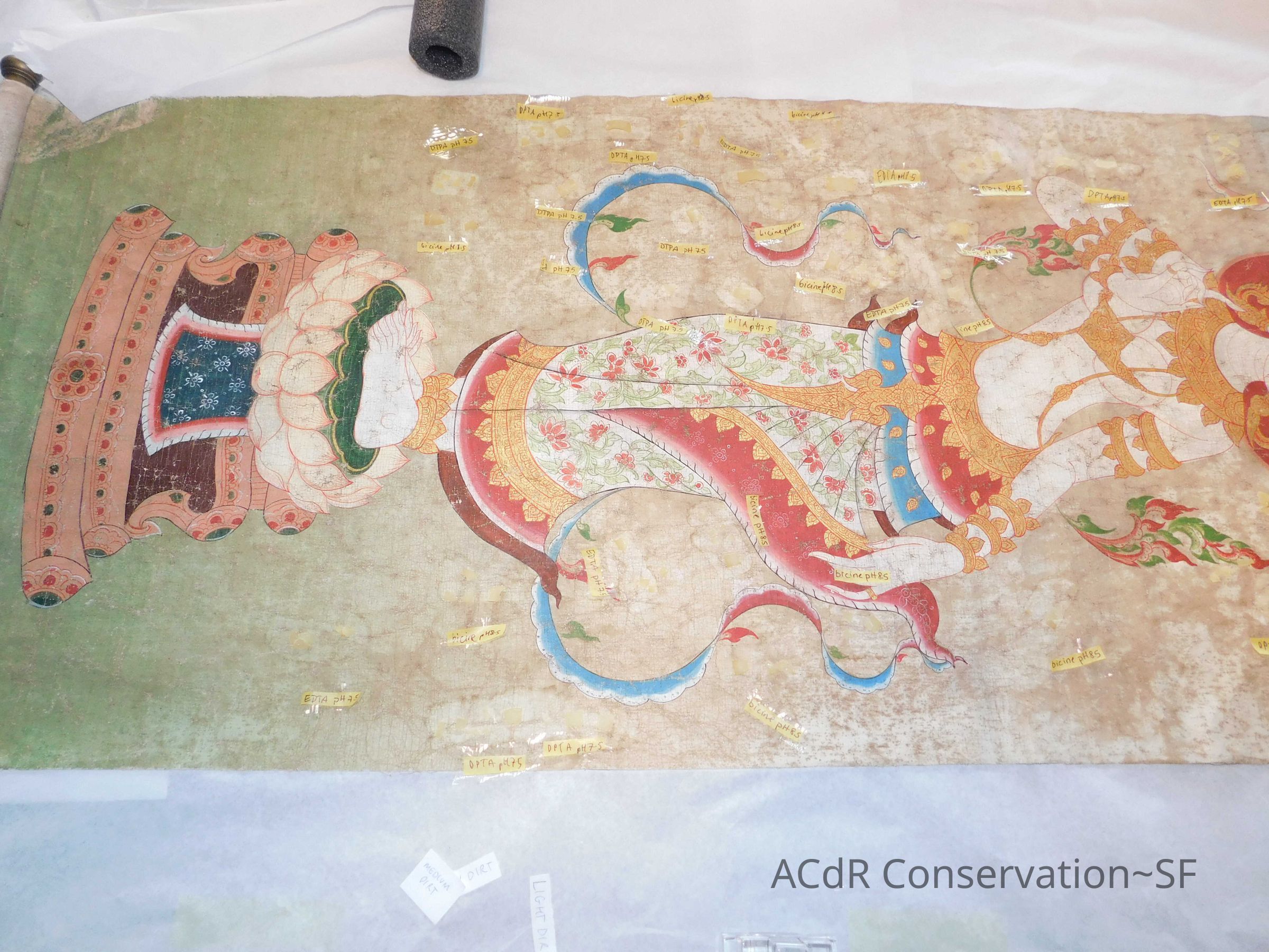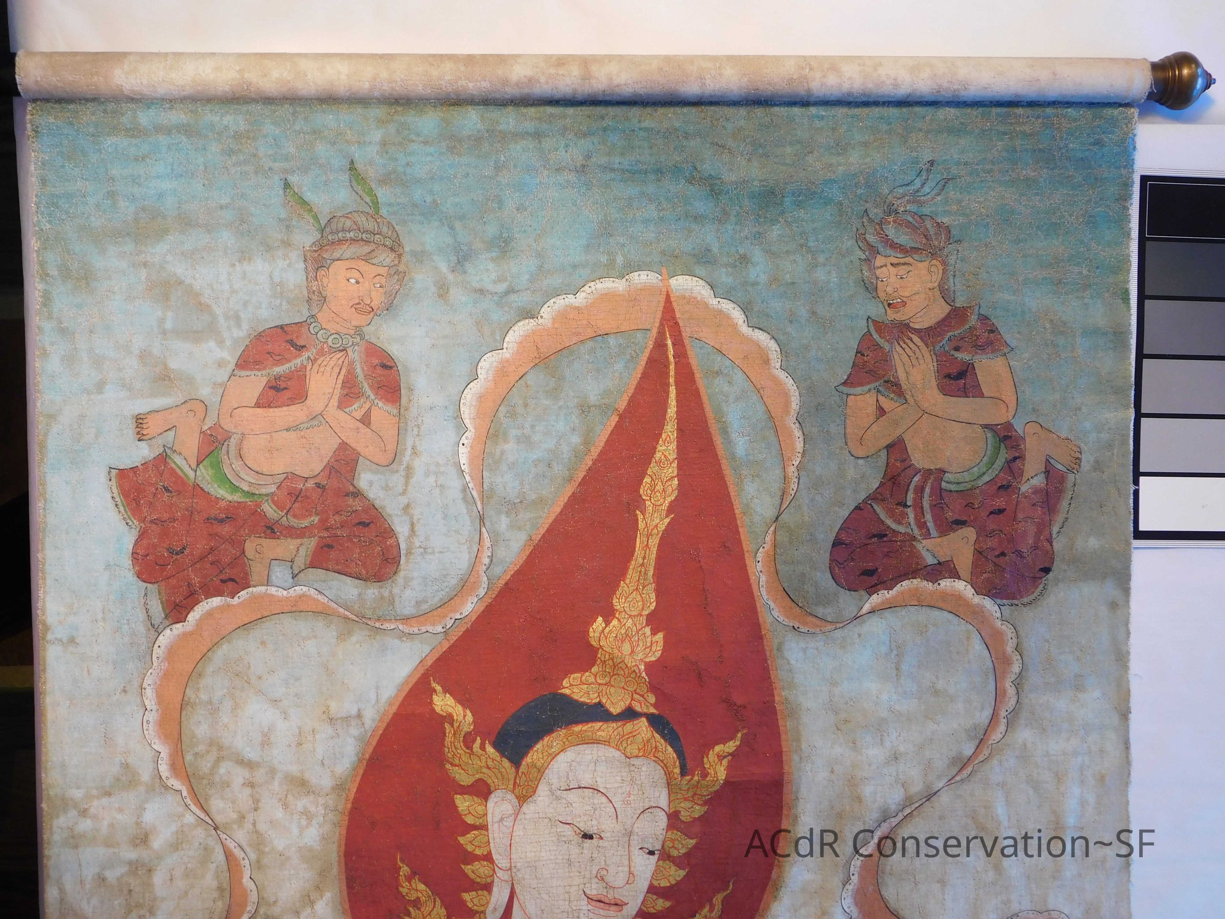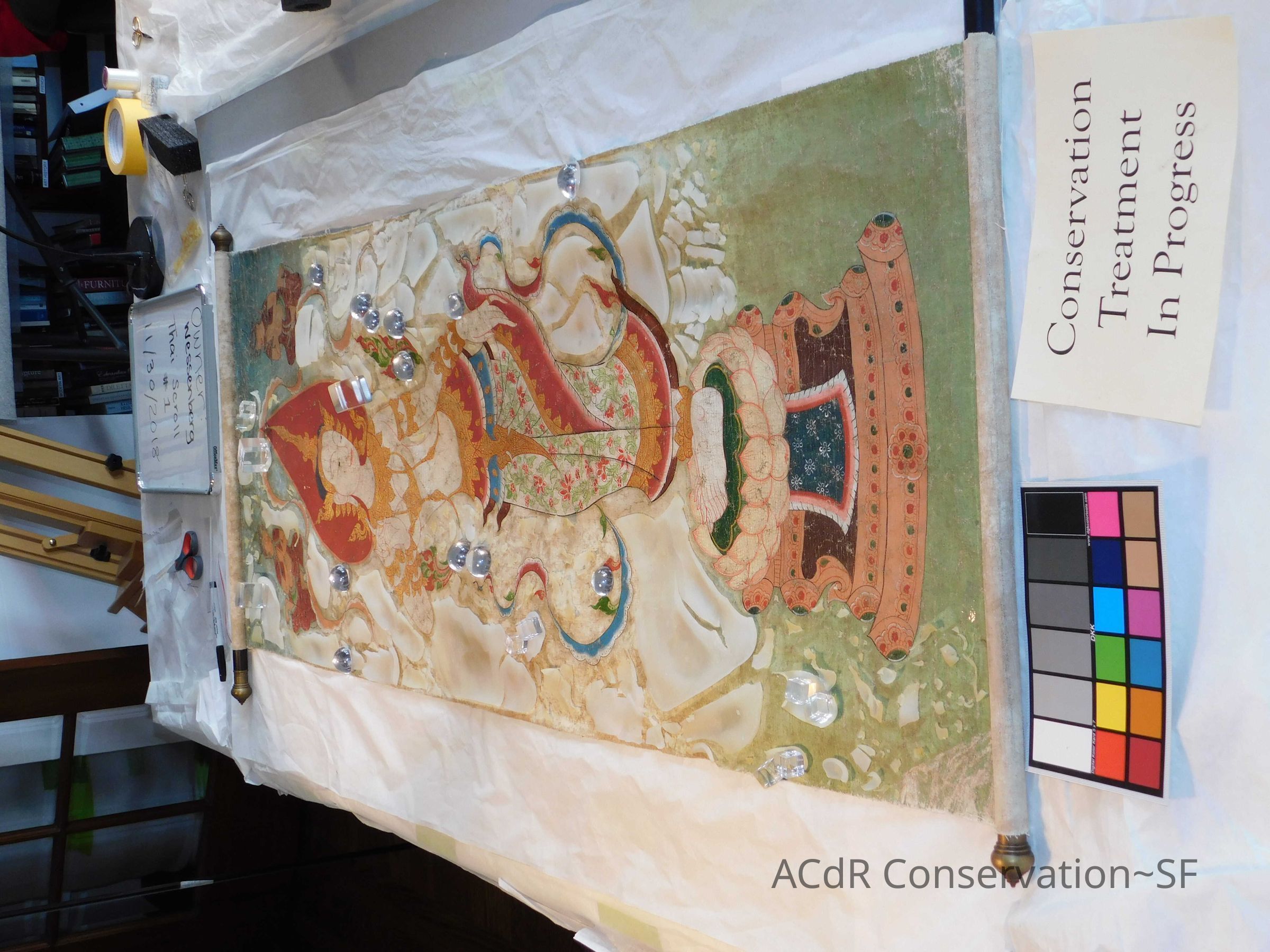 Began smoothing background appearance using wash of thinned watercolors to match what was completed on opposite scroll.