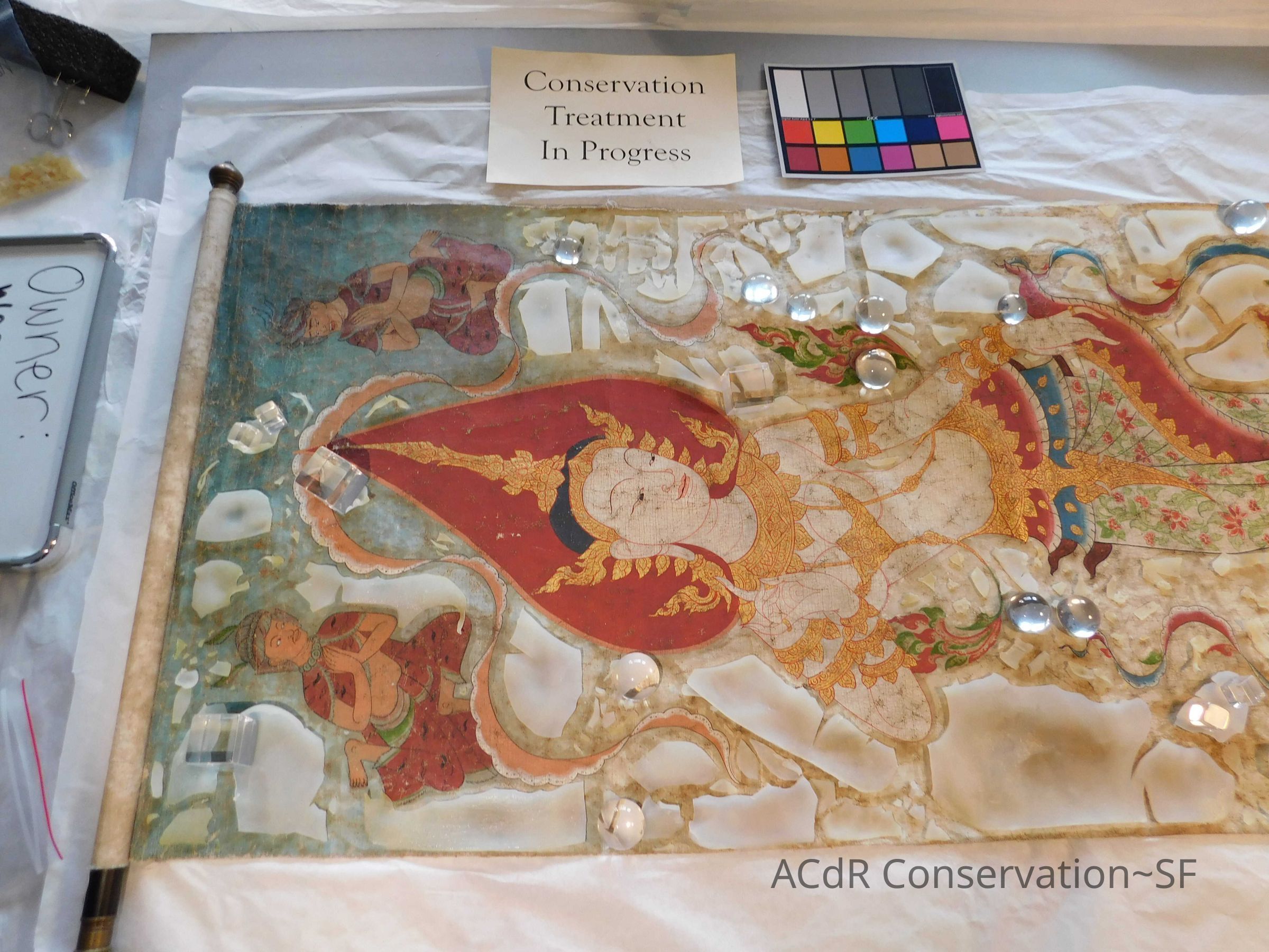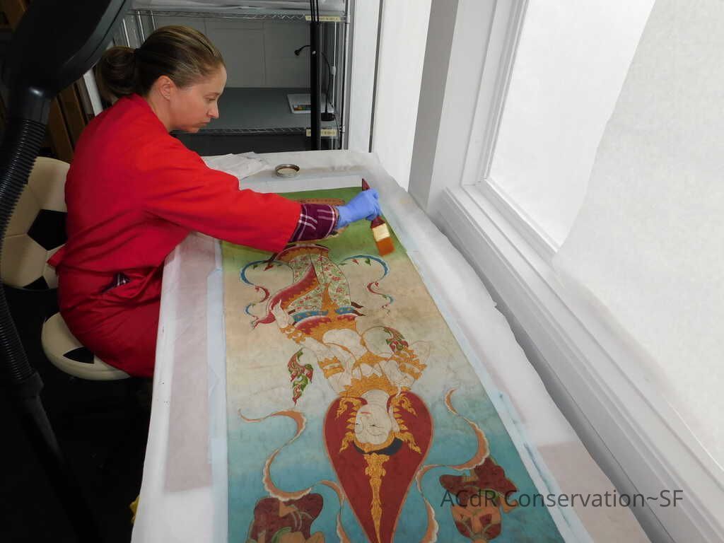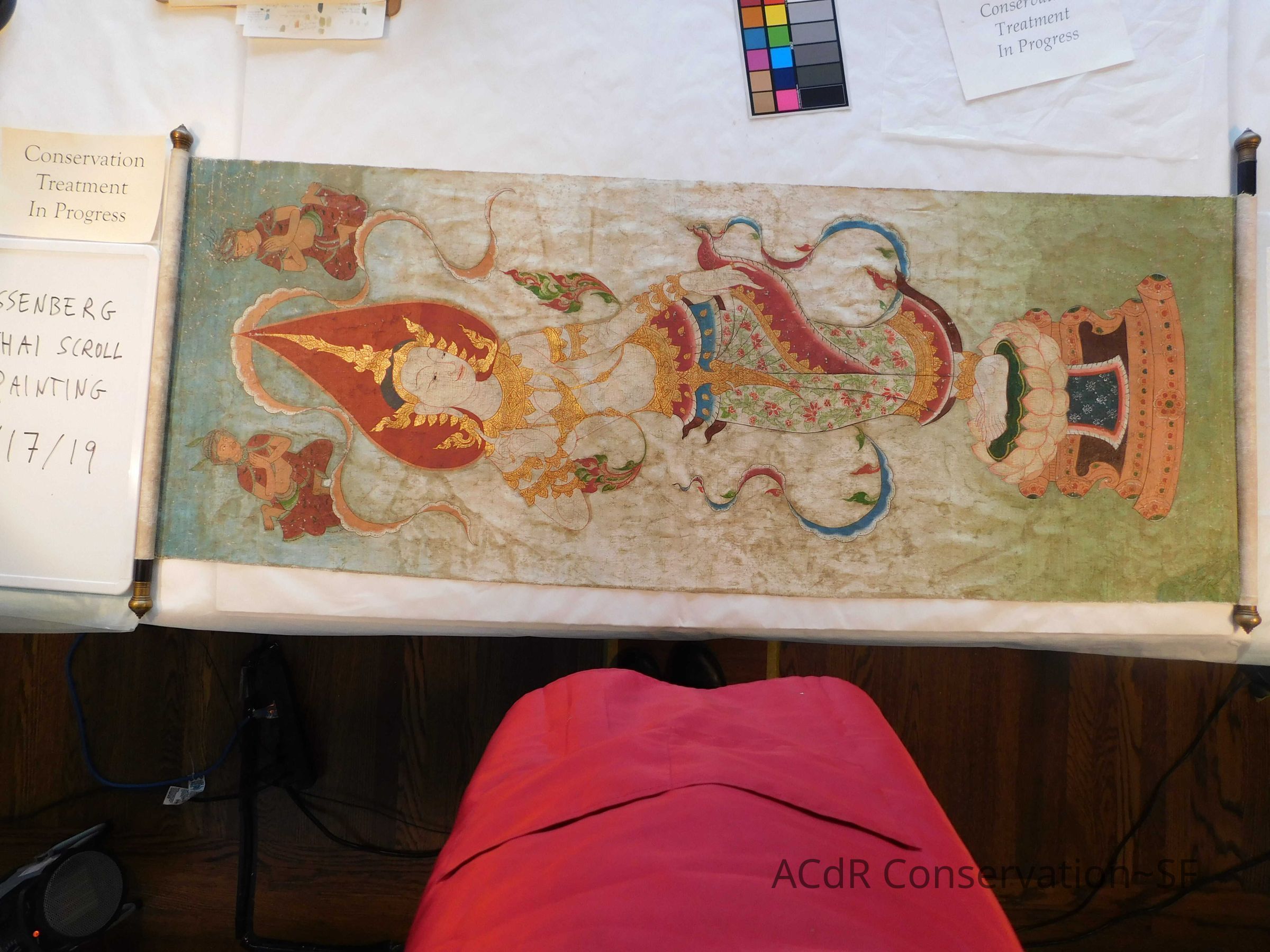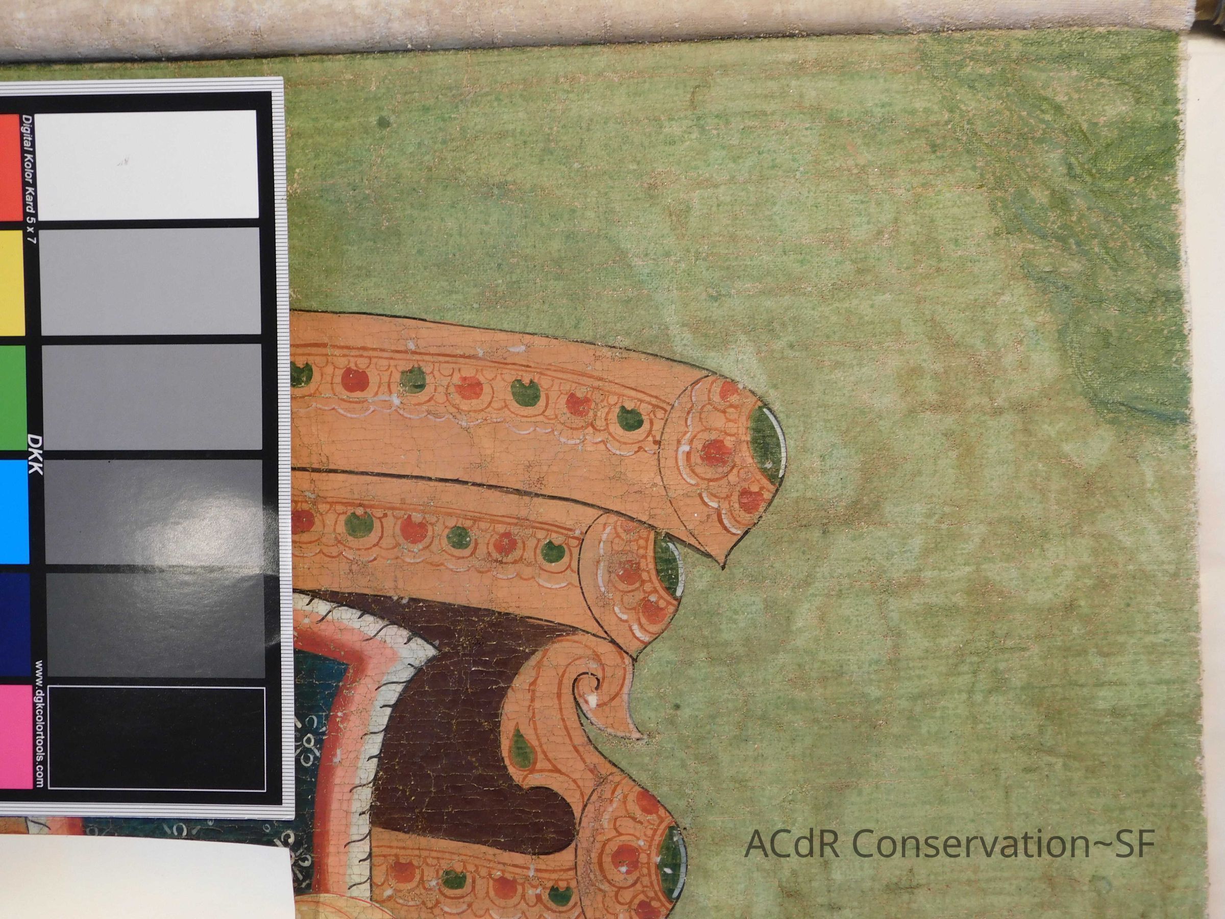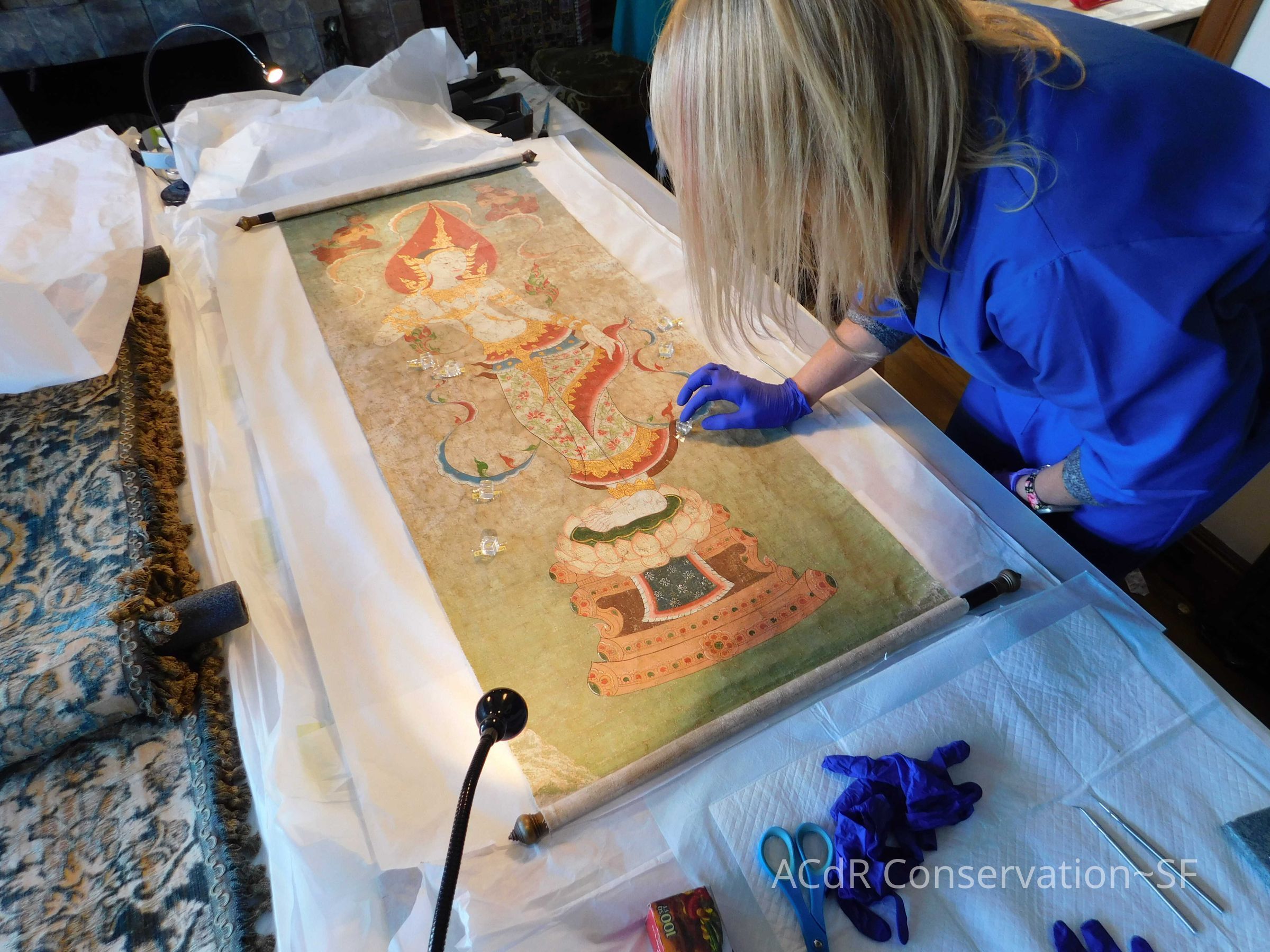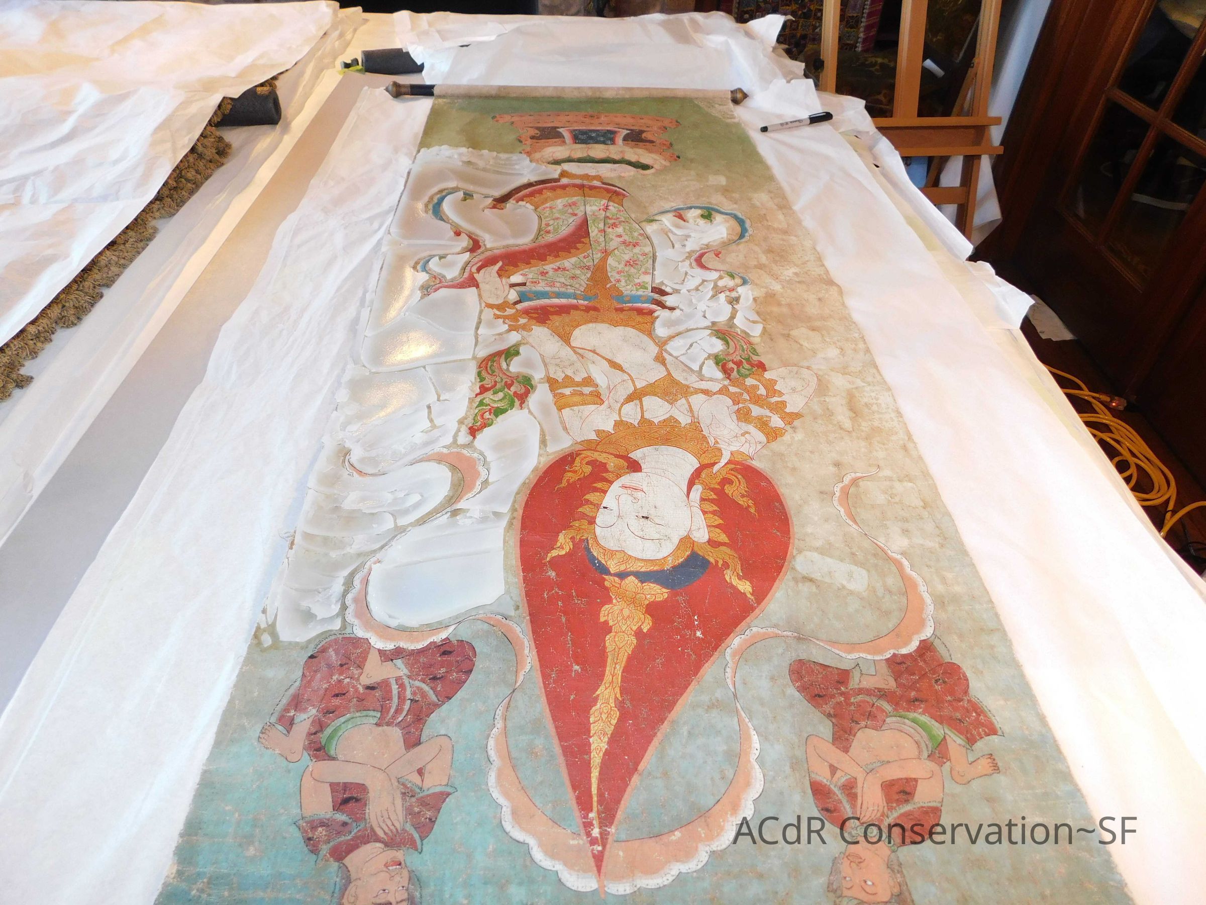 Began smoothing background appearance using wash of thinned watercolors to match what was completed on opposite scroll.