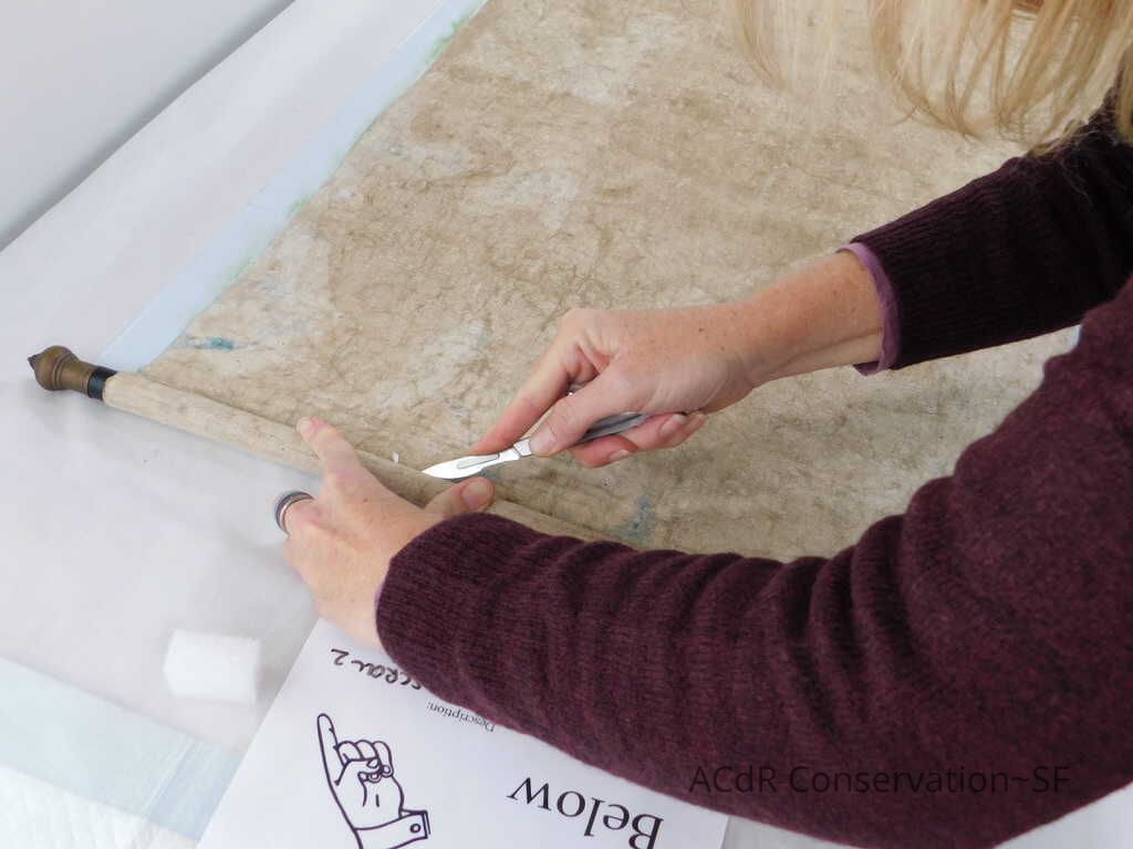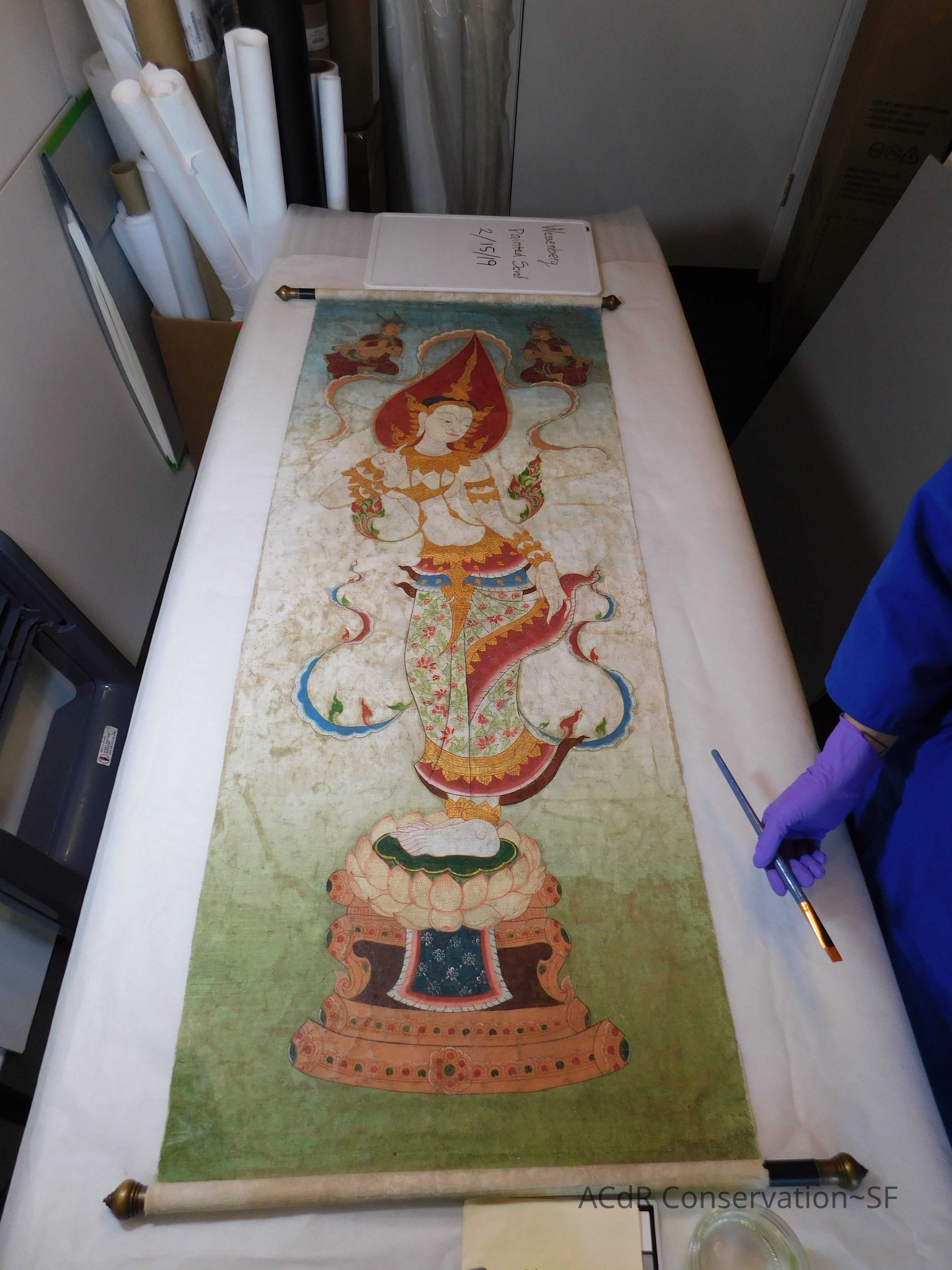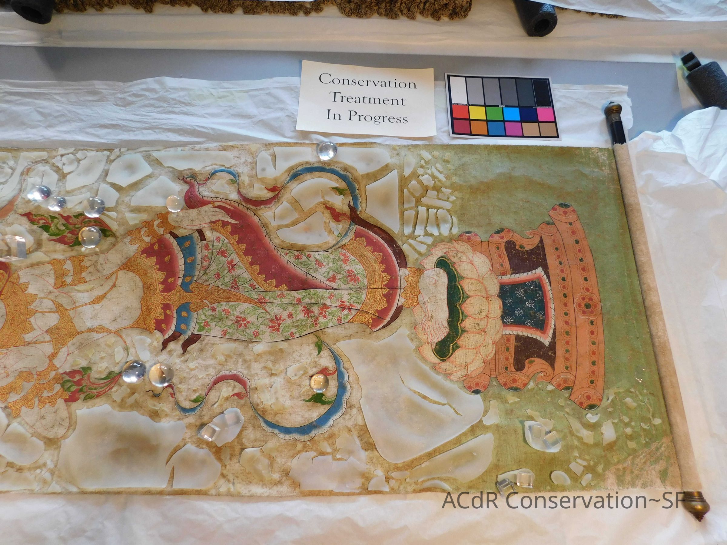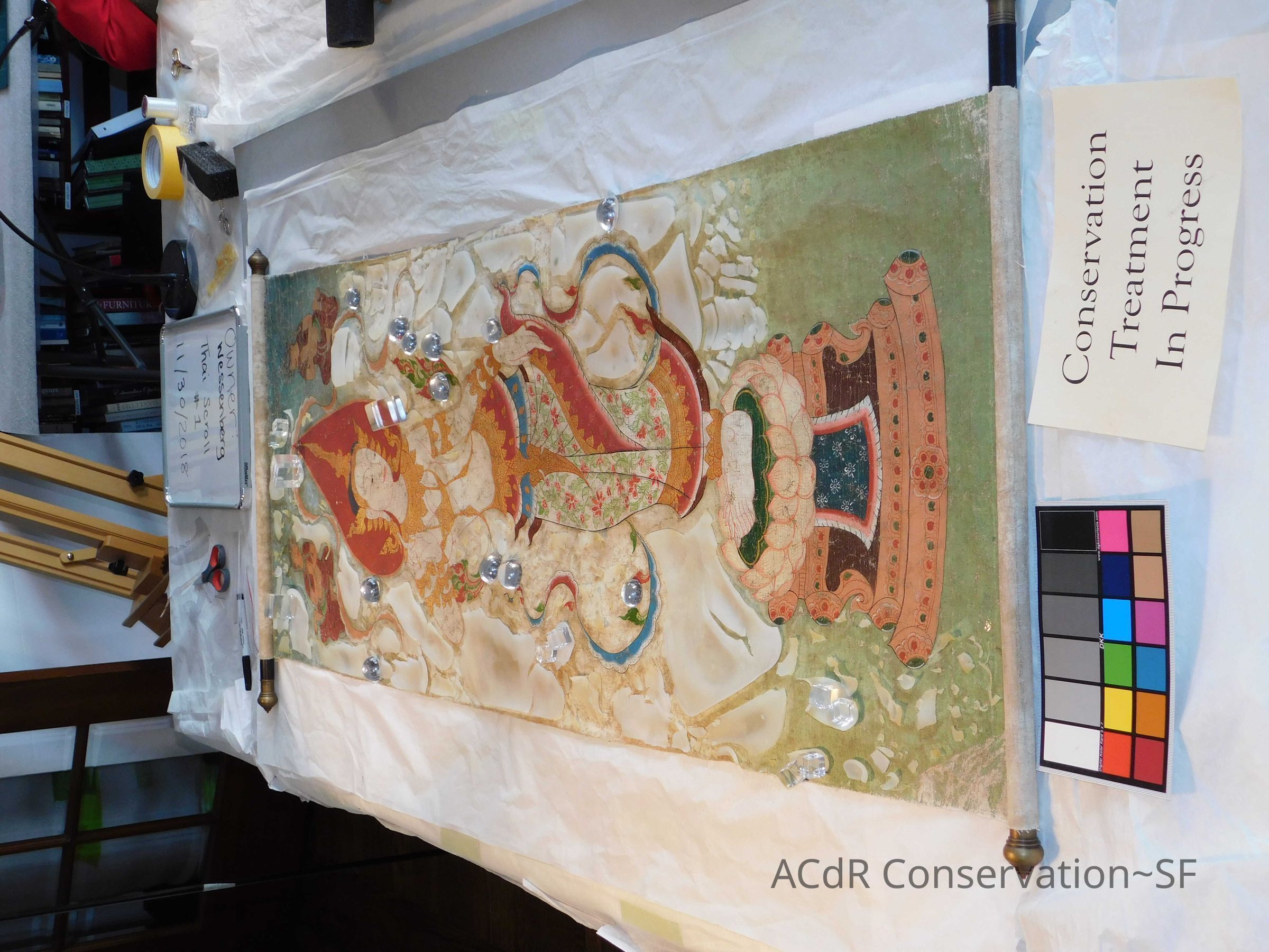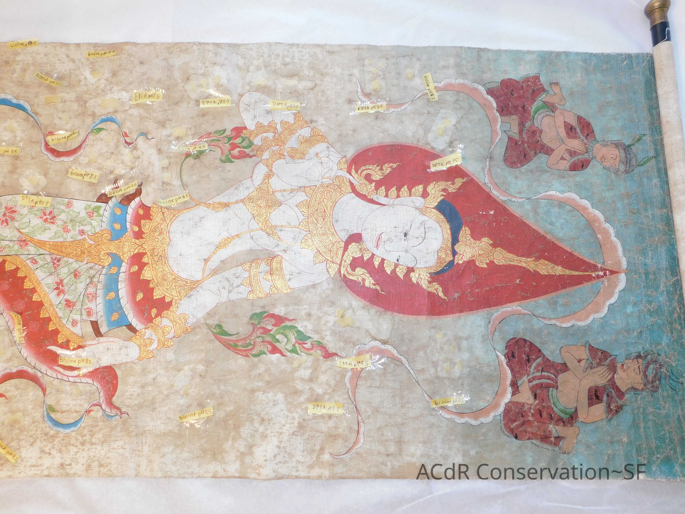 Began smoothing background appearance using wash of thinned watercolors to match what was completed on opposite scroll.