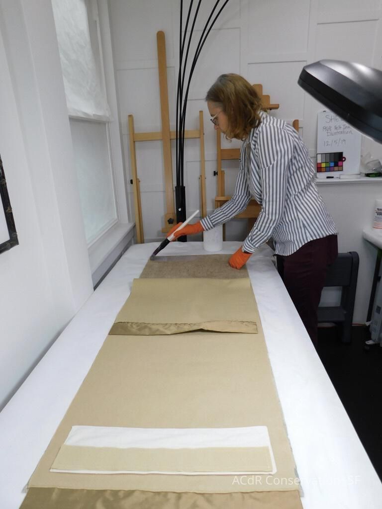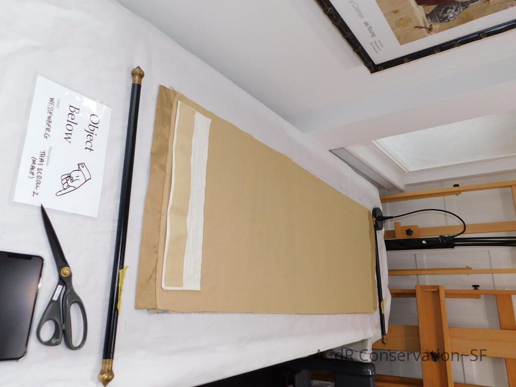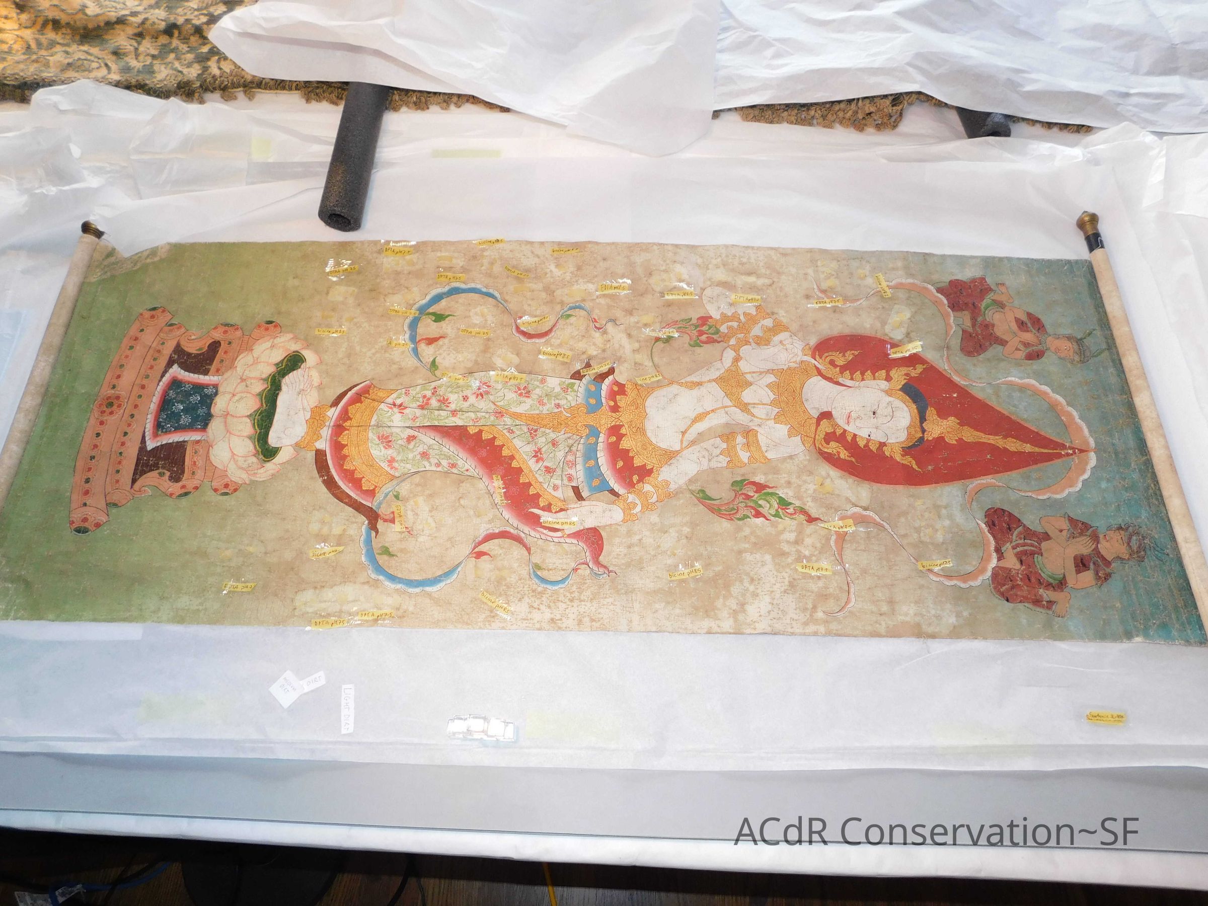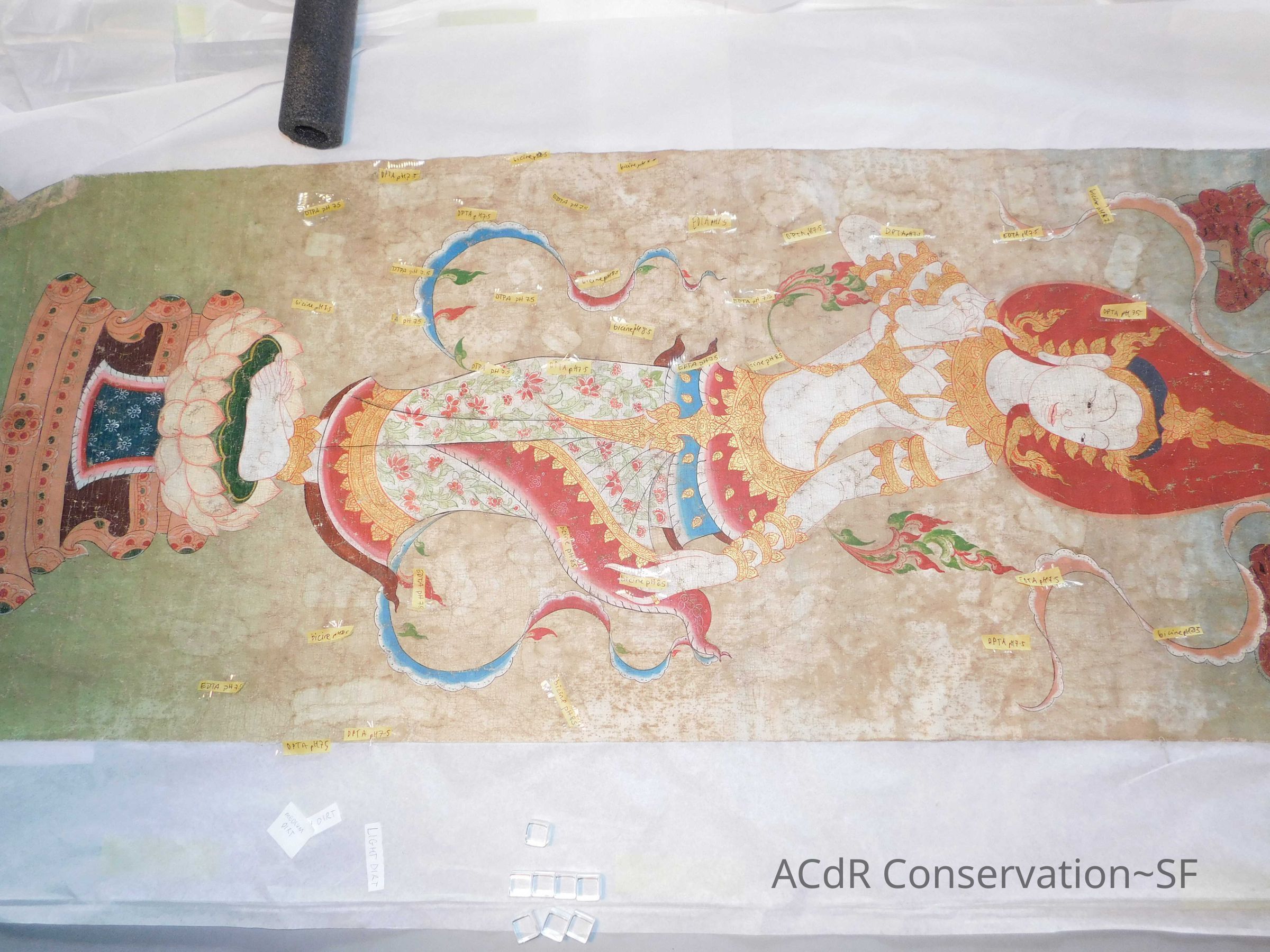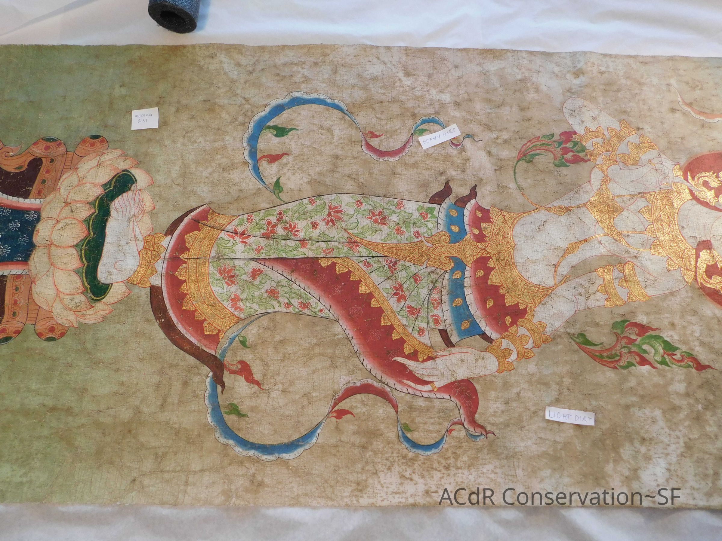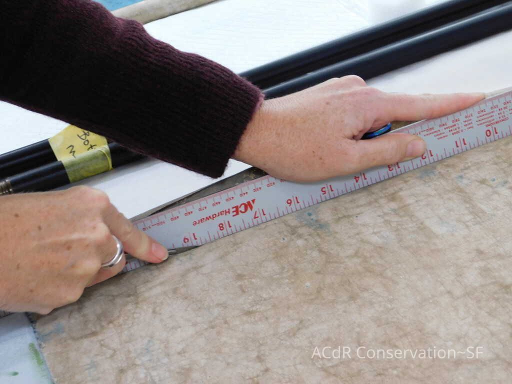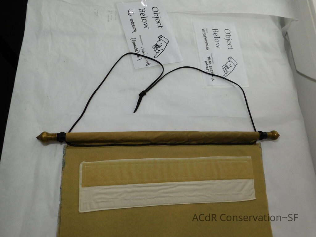 Began smoothing background appearance using wash of thinned watercolors to match what was completed on opposite scroll.