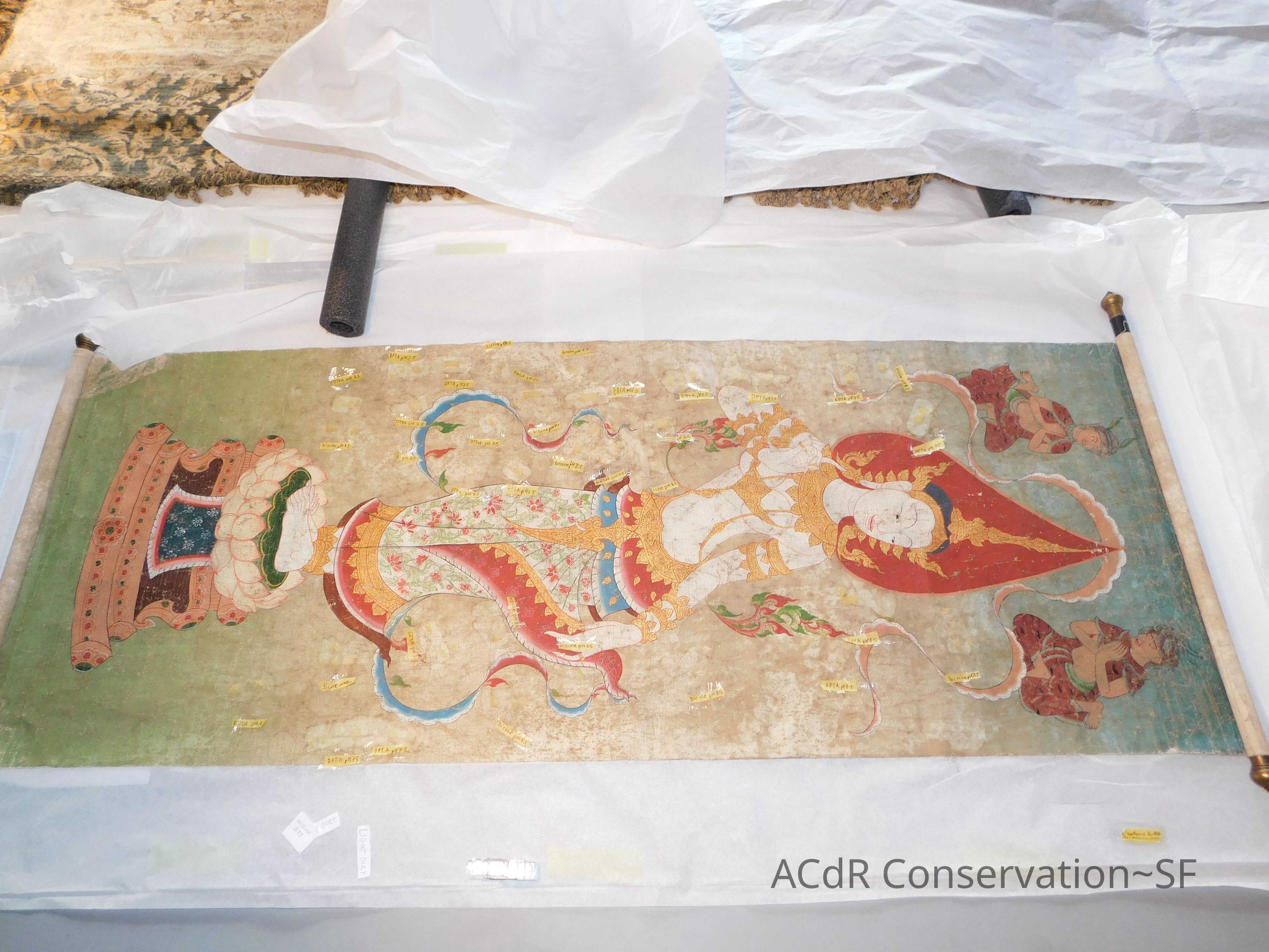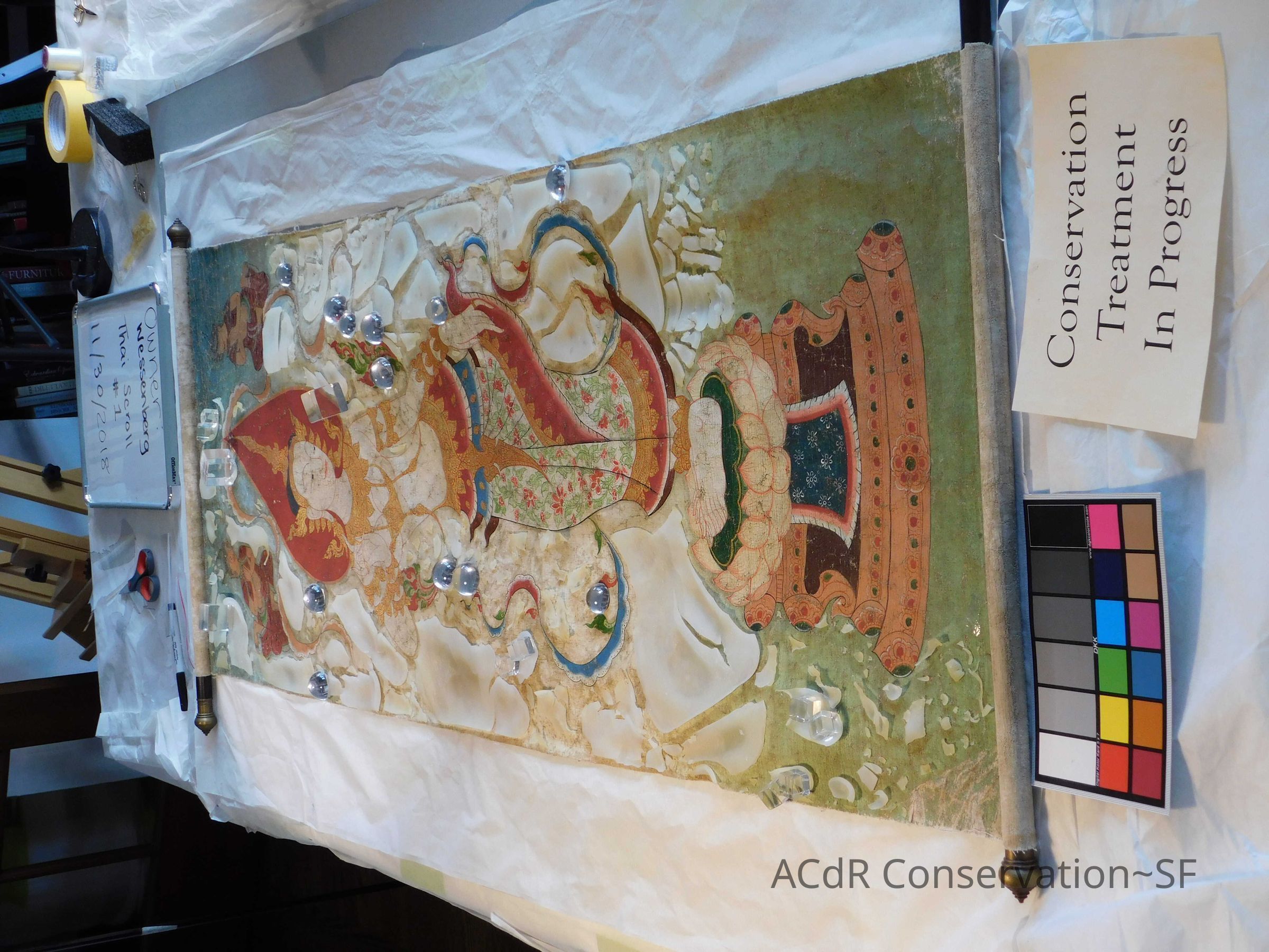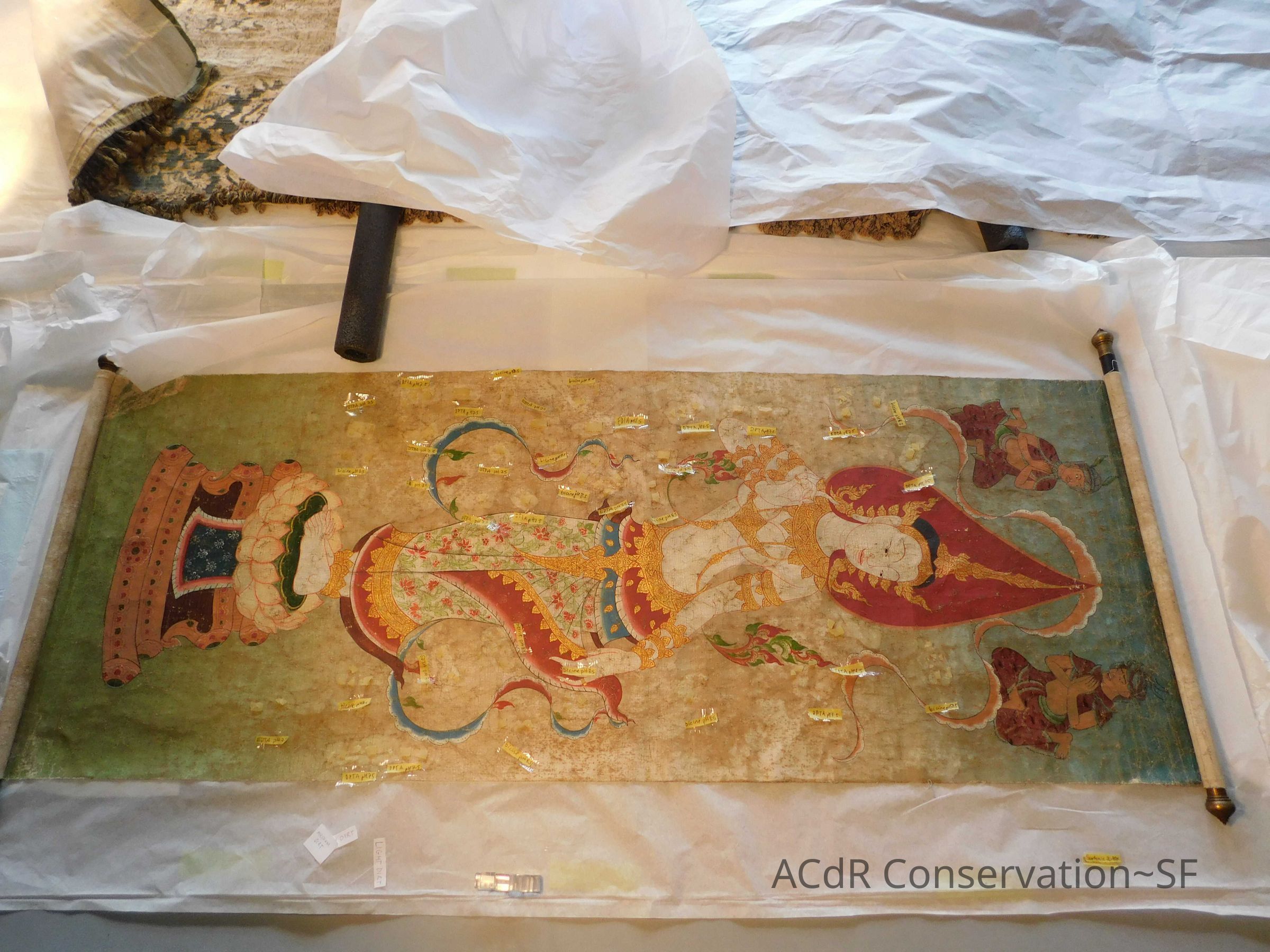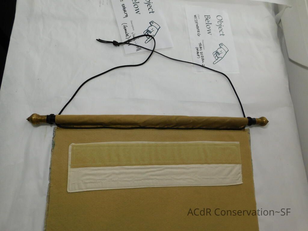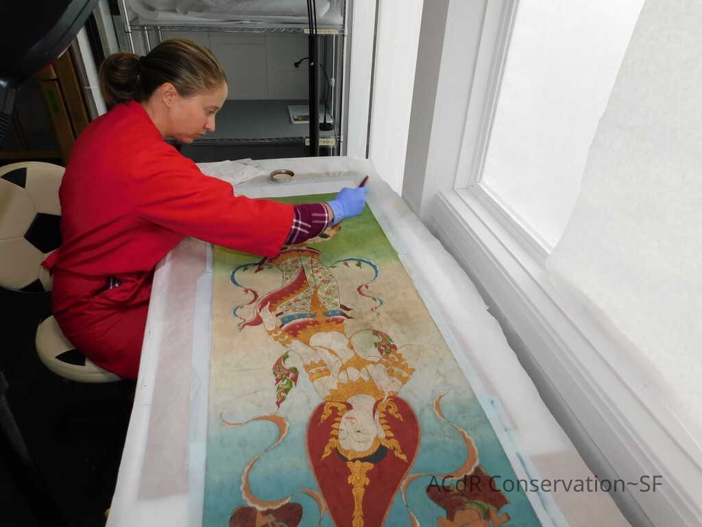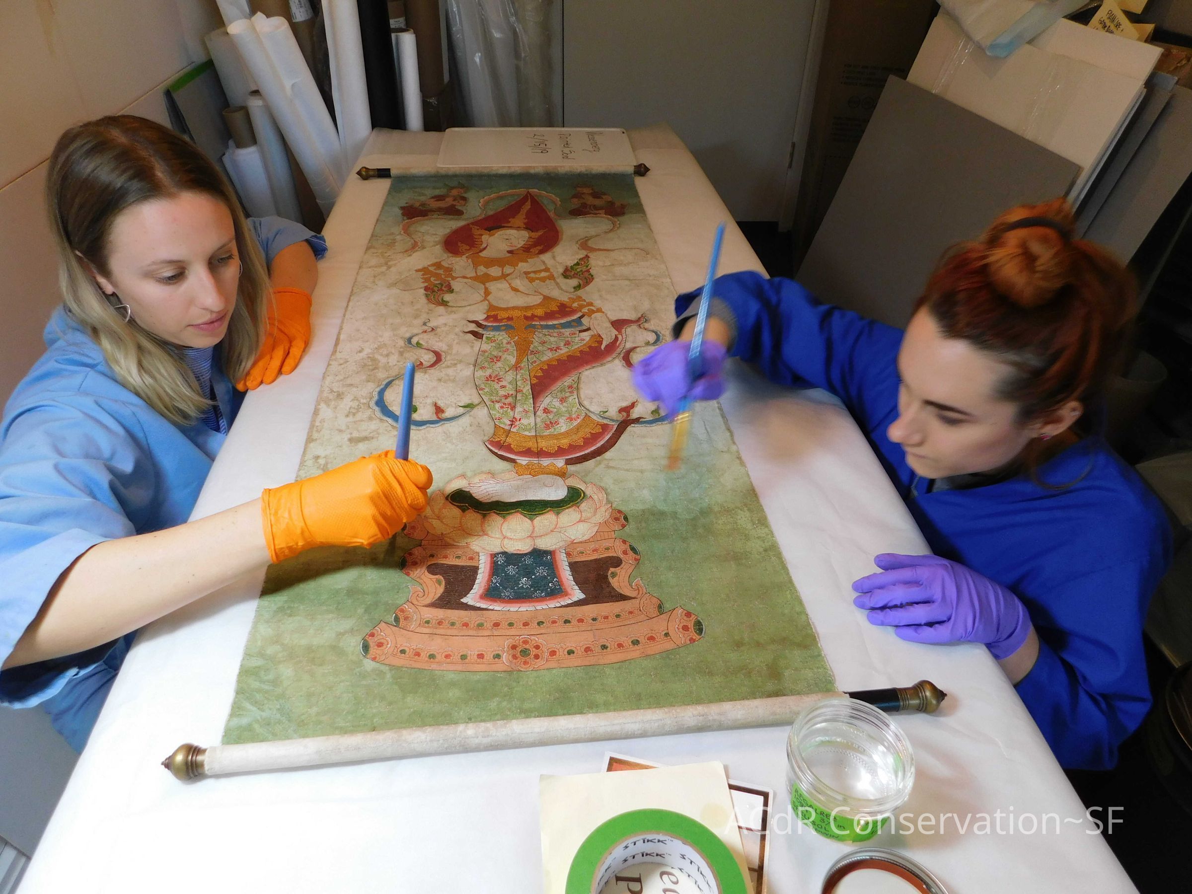 Began smoothing background appearance using wash of thinned watercolors to match what was completed on opposite scroll.