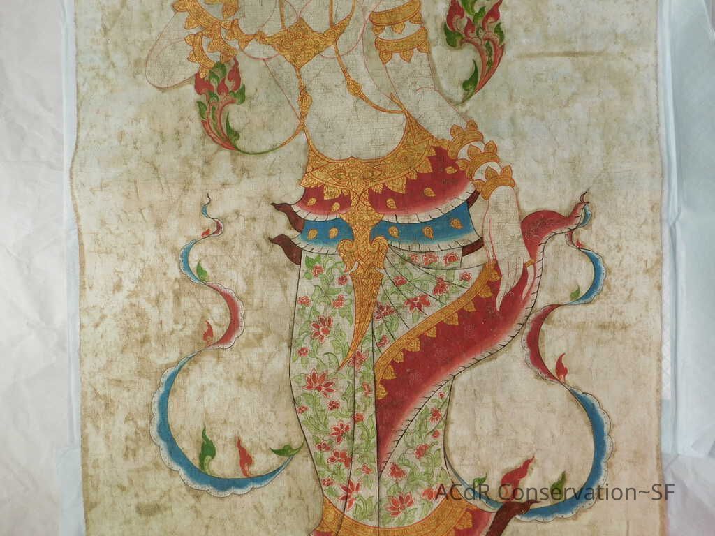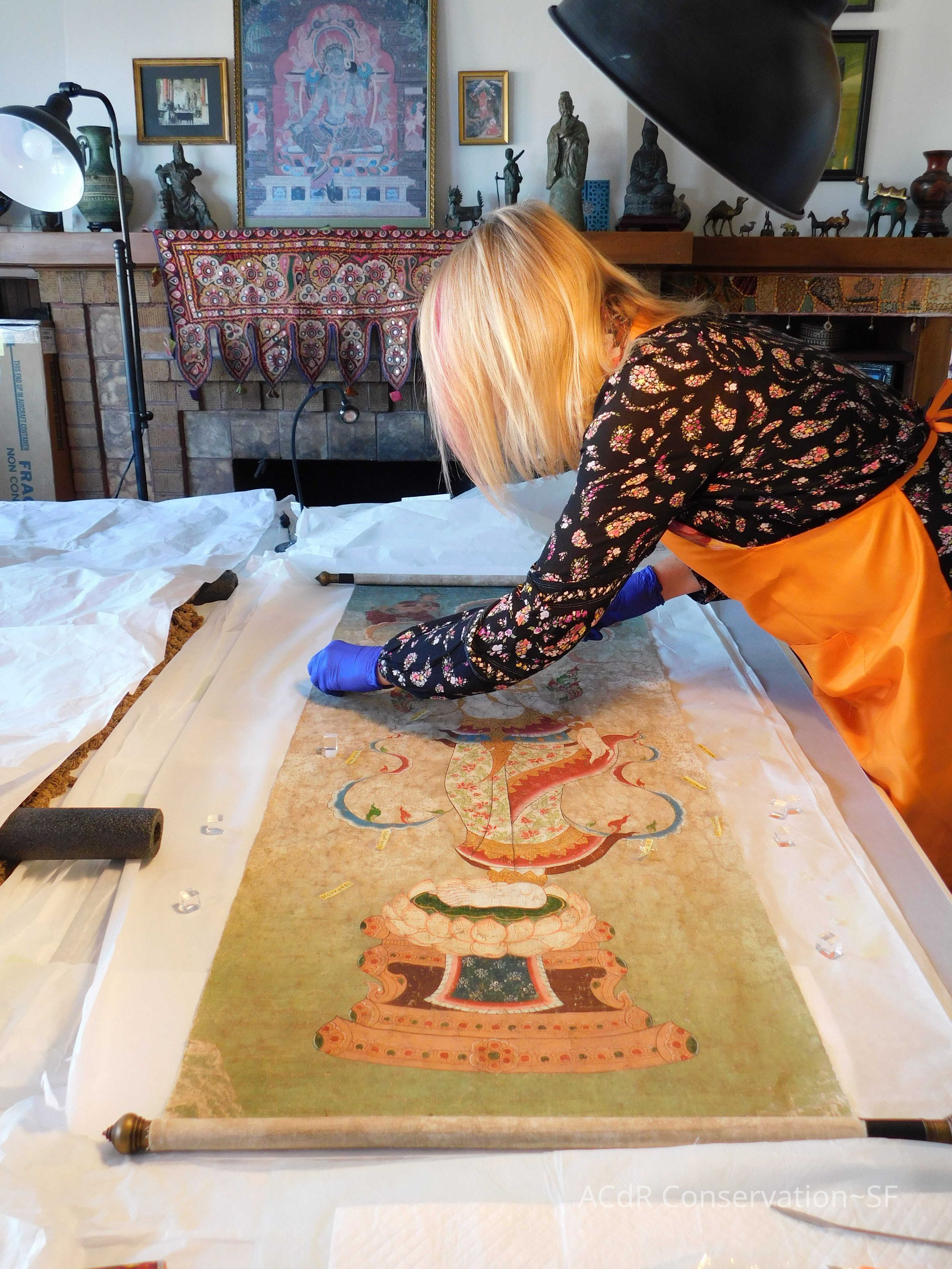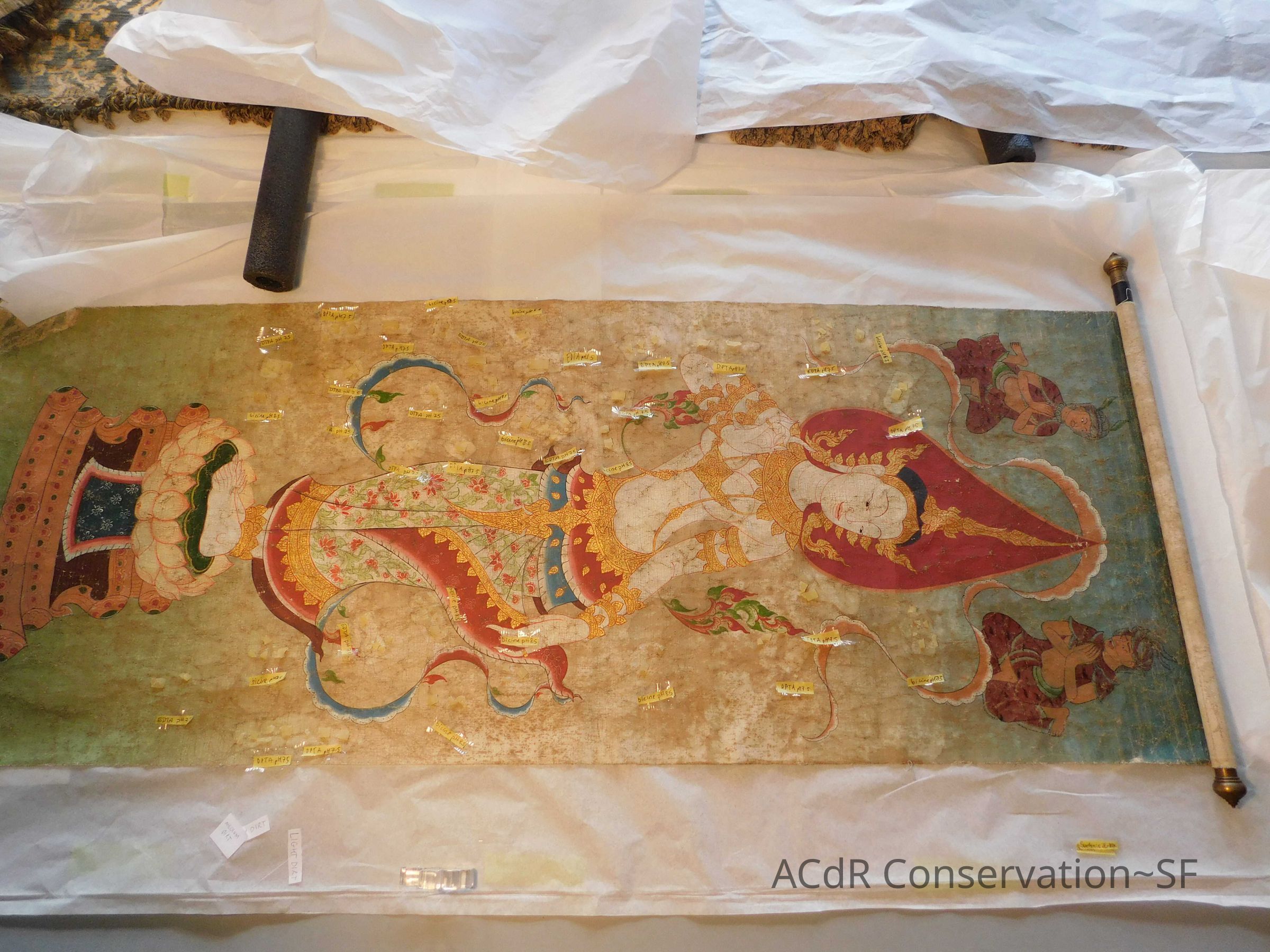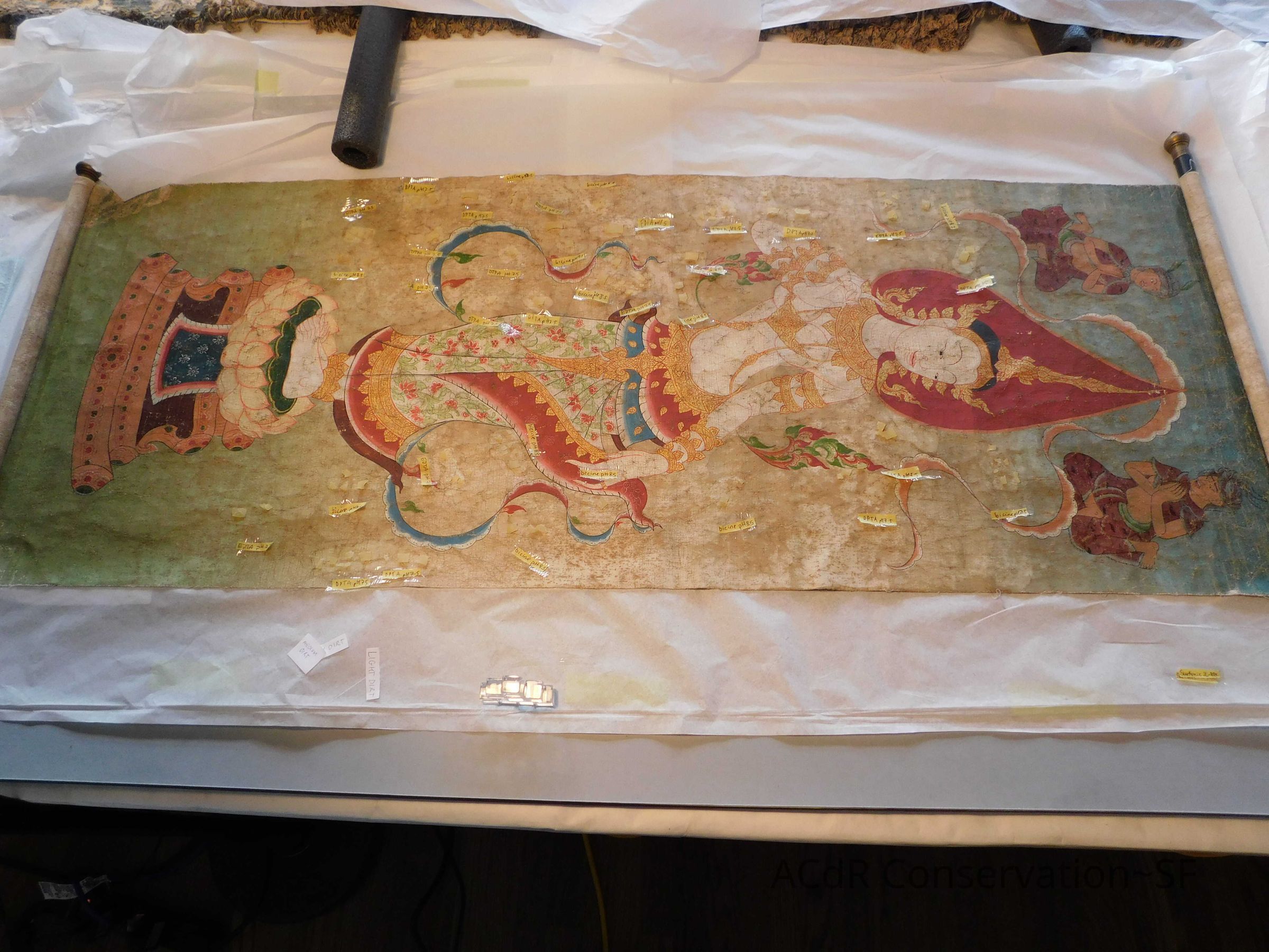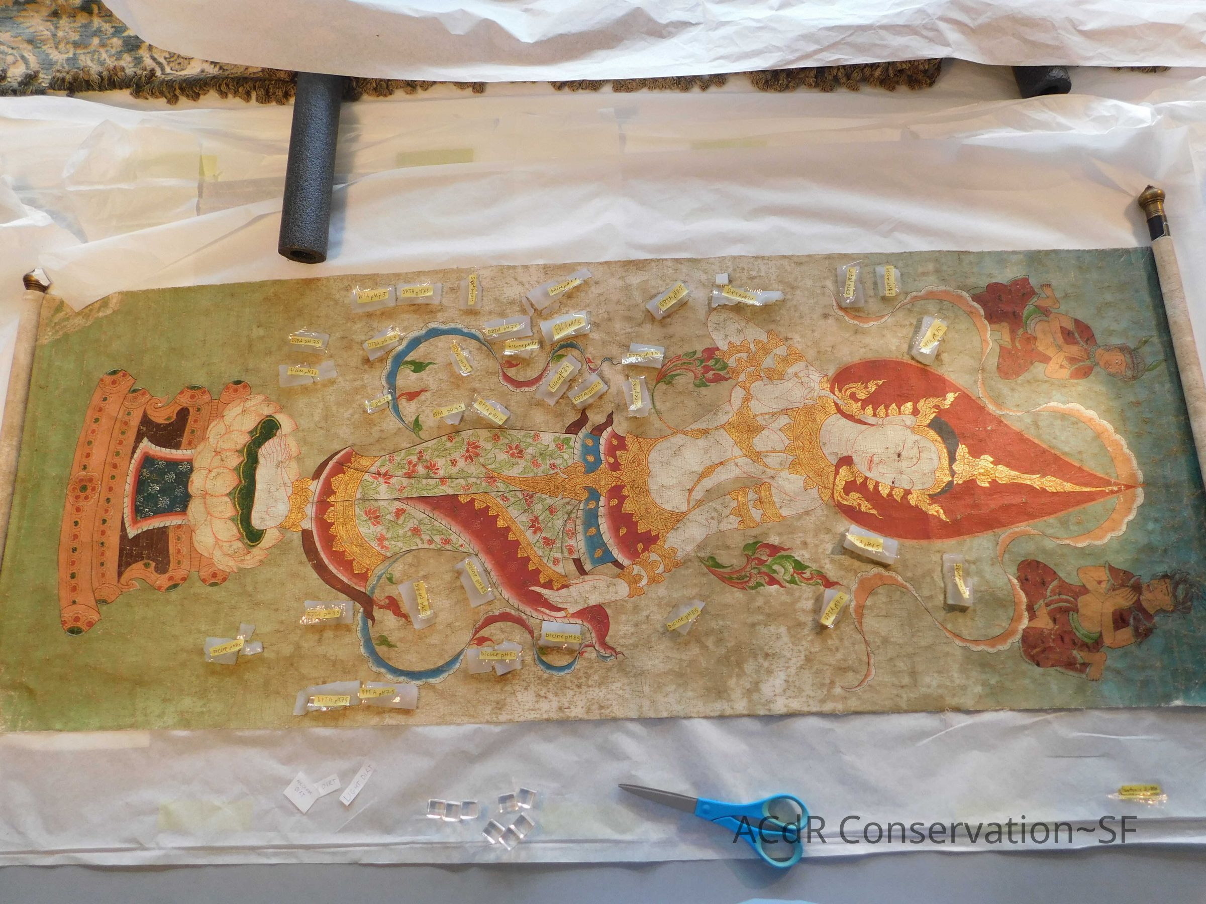 Began smoothing background appearance using wash of thinned watercolors to match what was completed on opposite scroll.