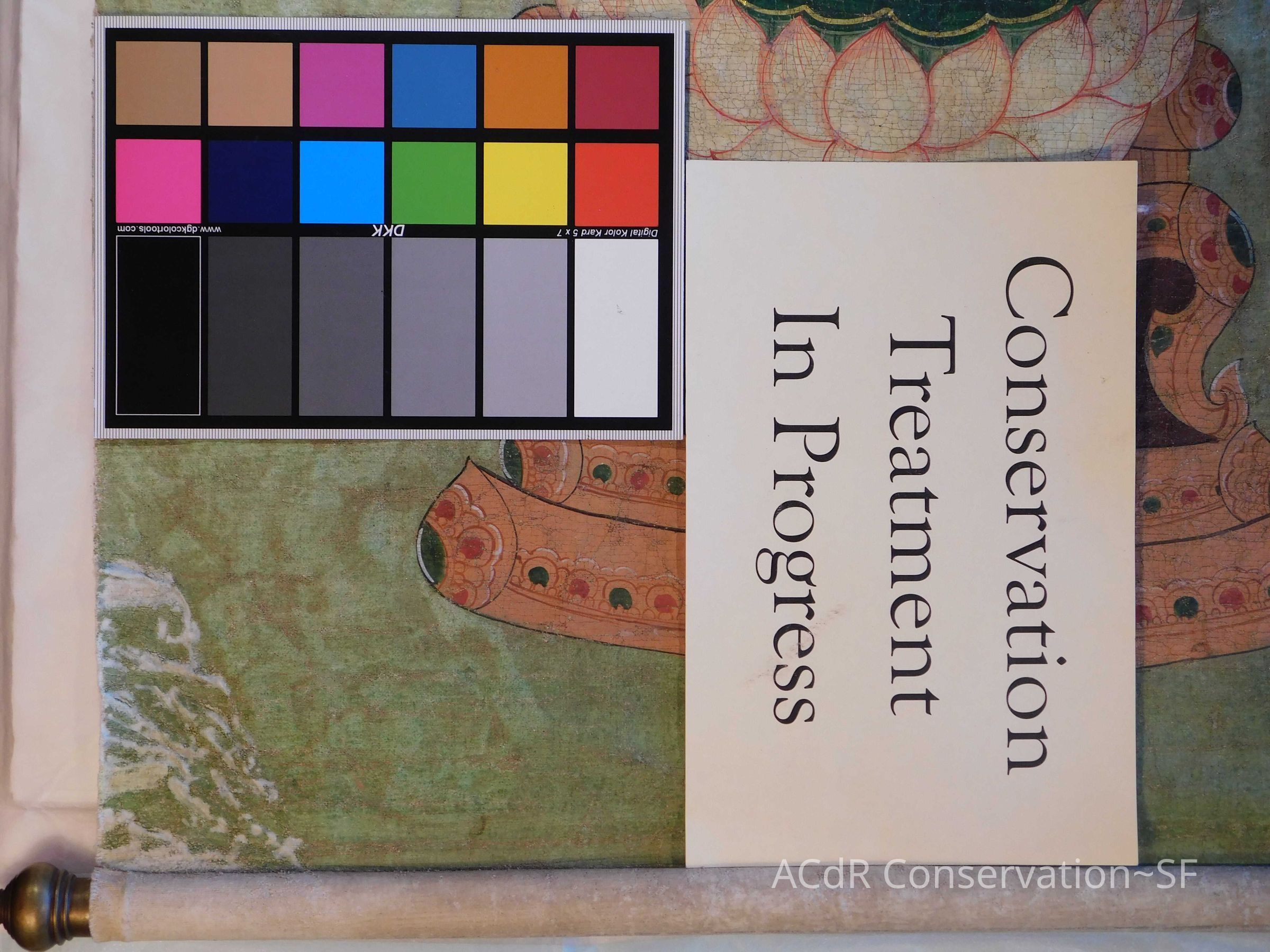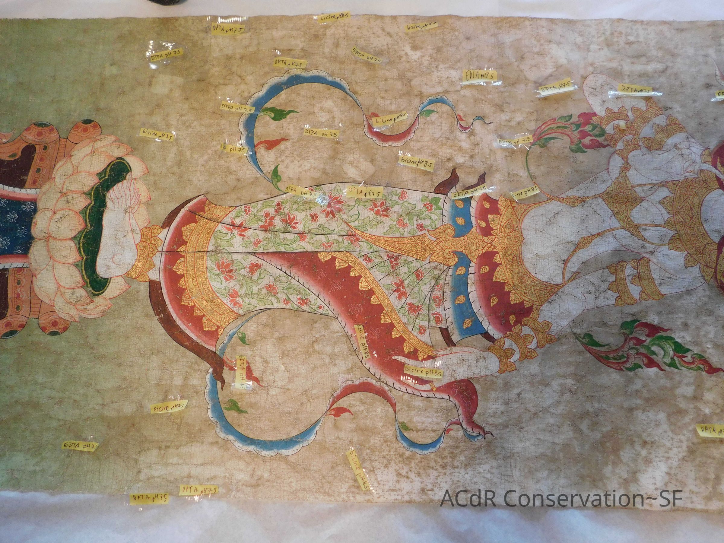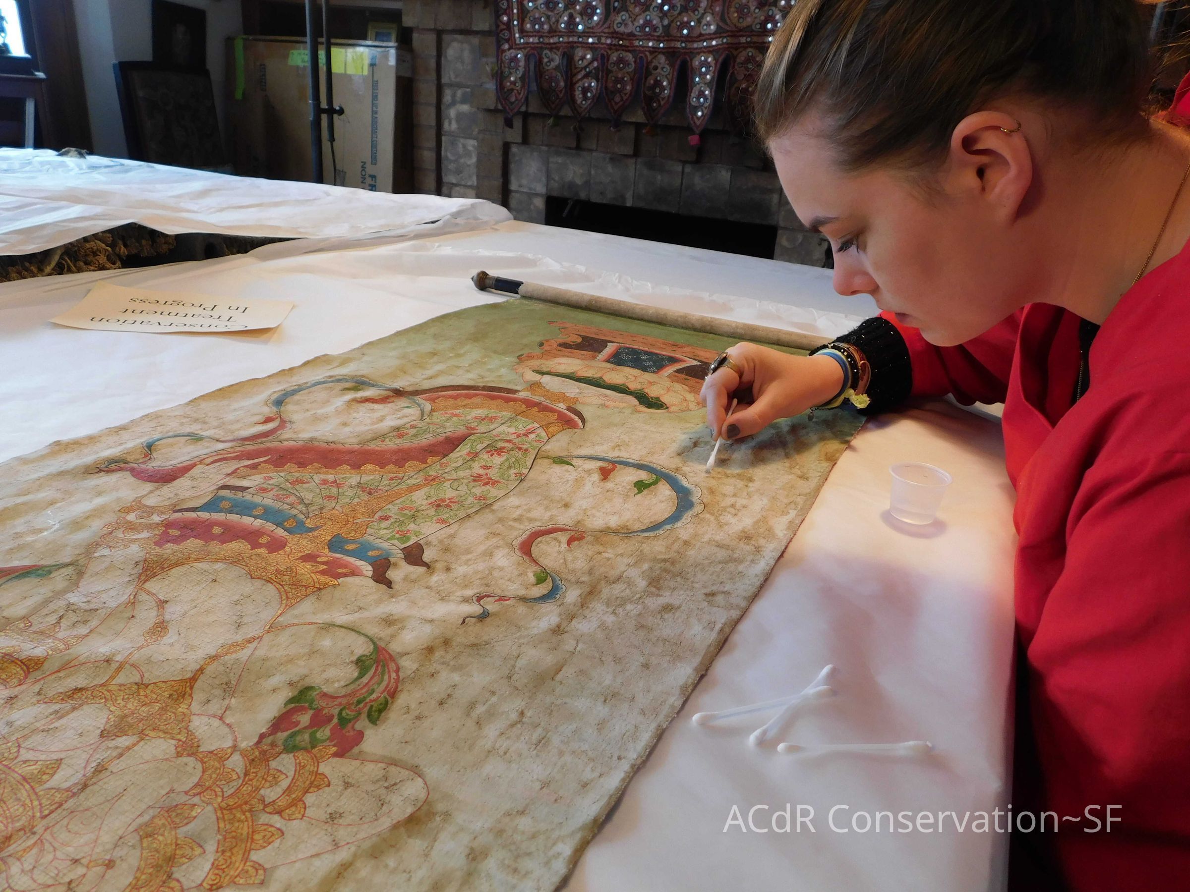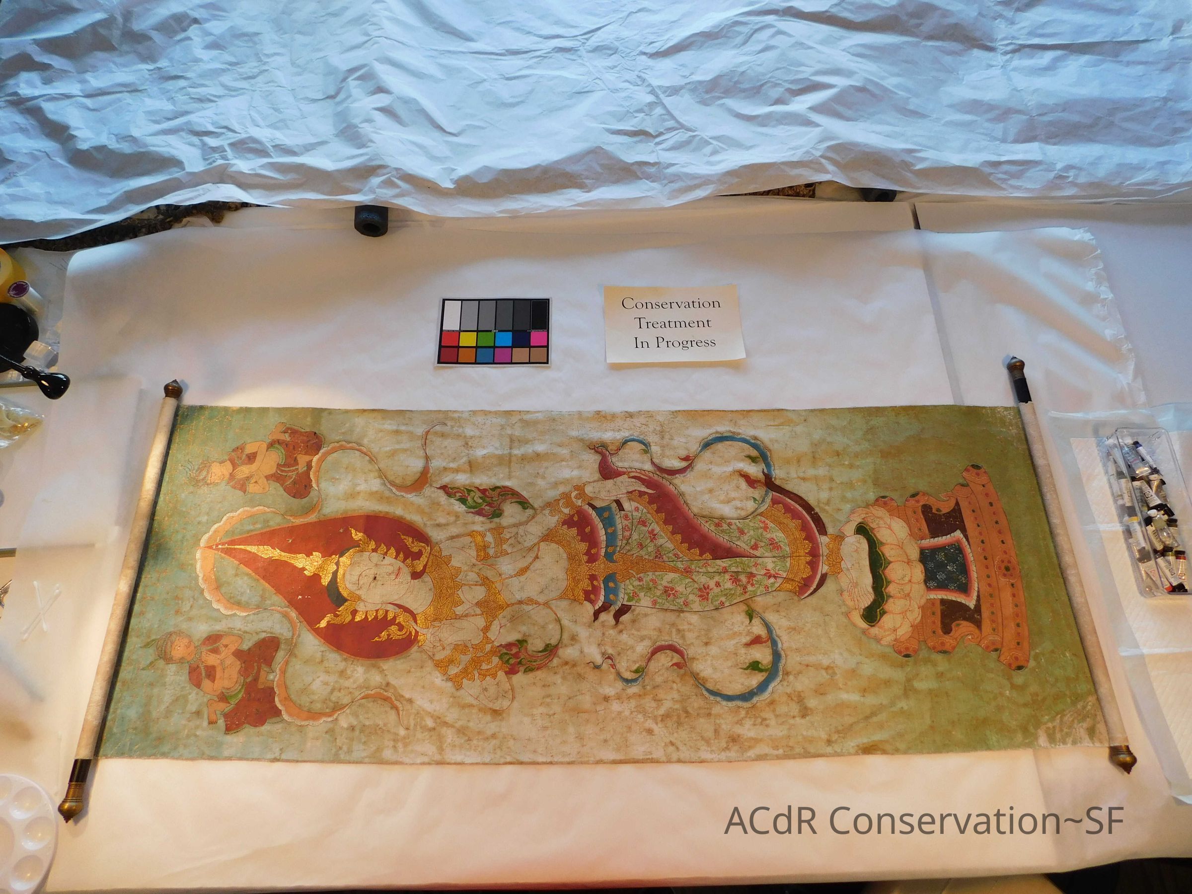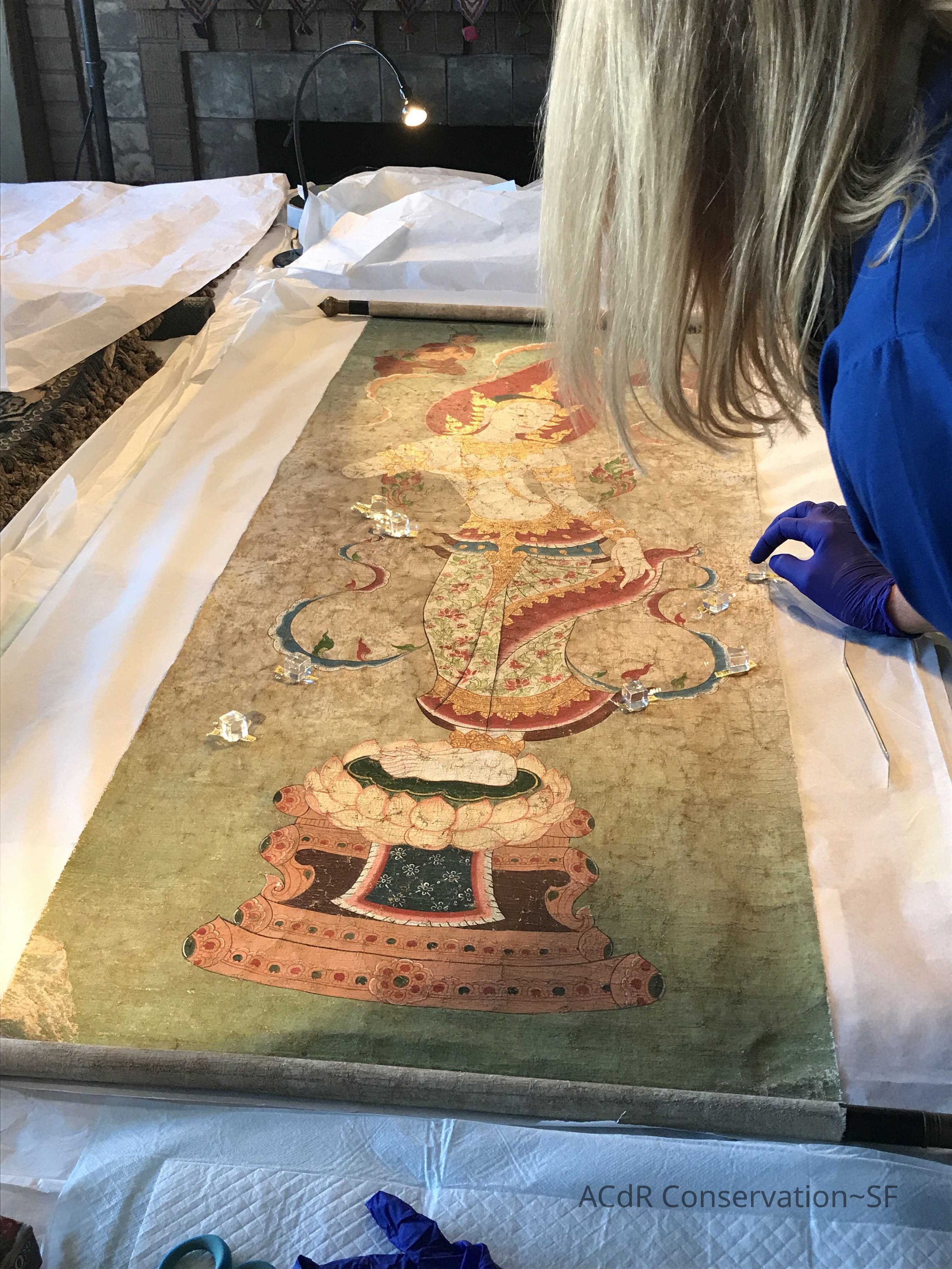 Began smoothing background appearance using wash of thinned watercolors to match what was completed on opposite scroll.