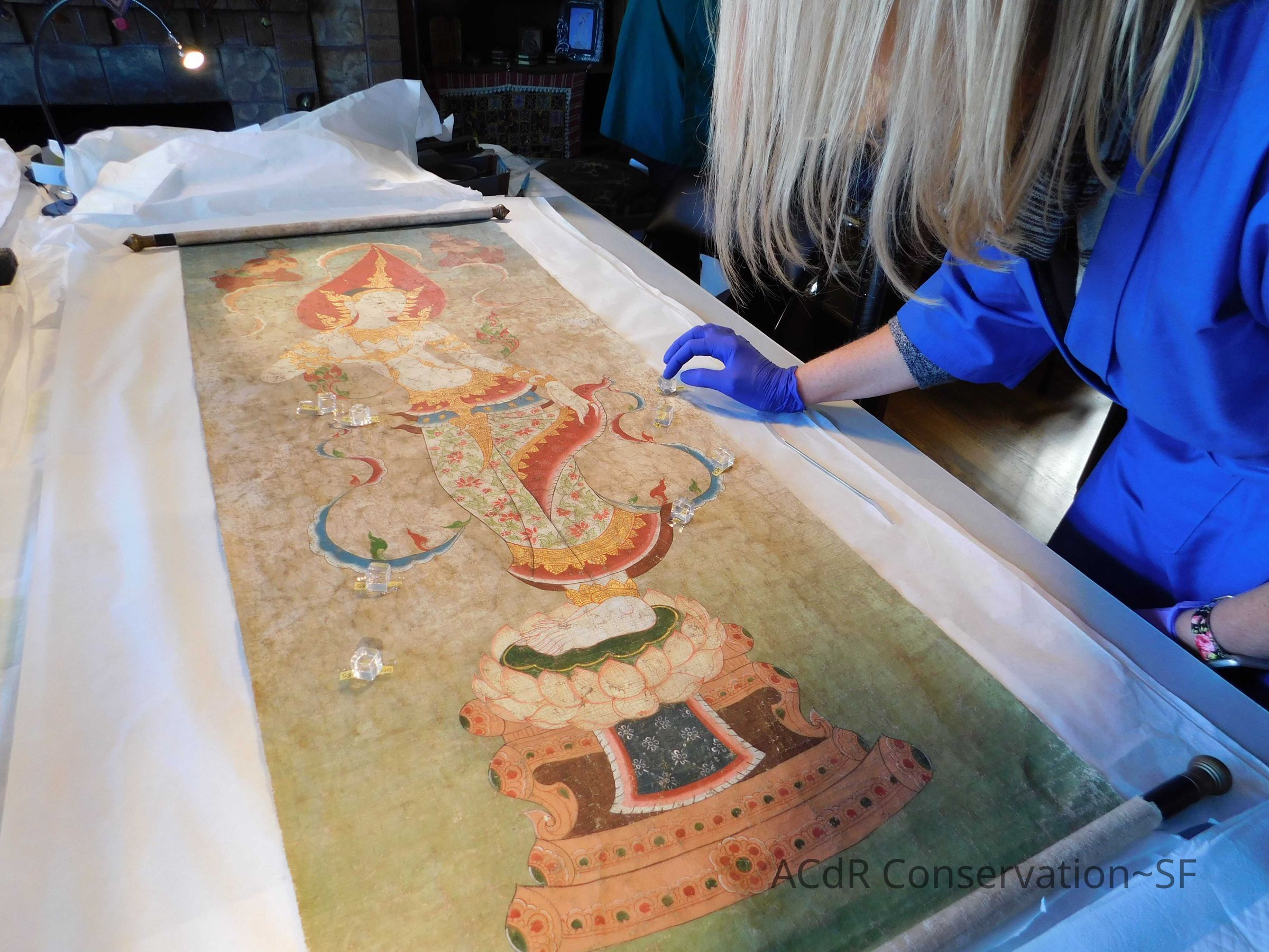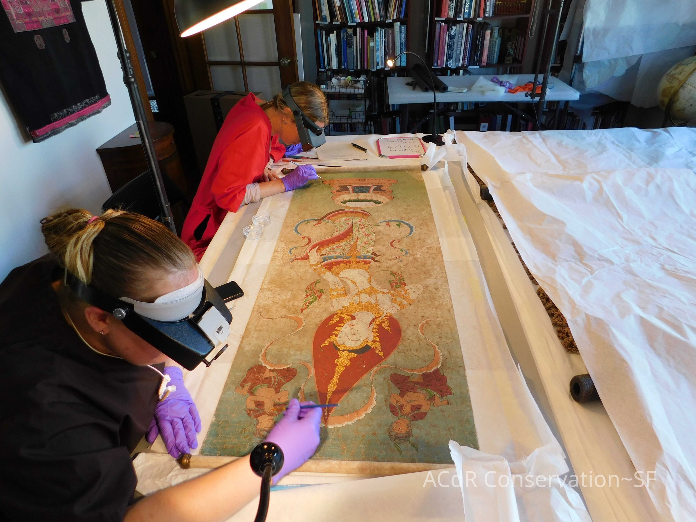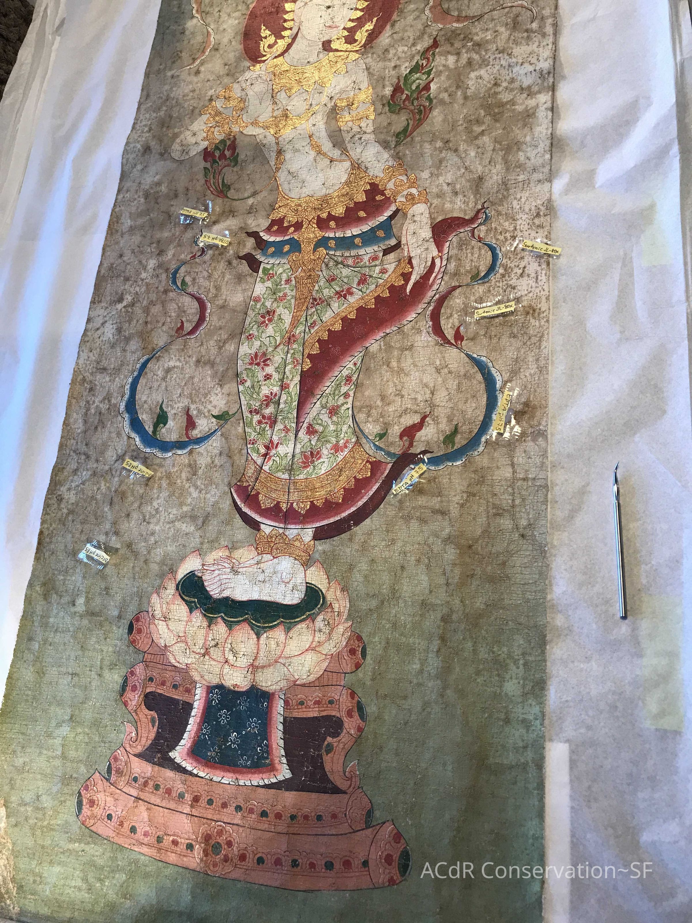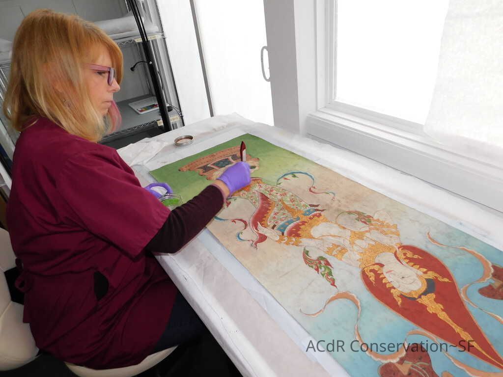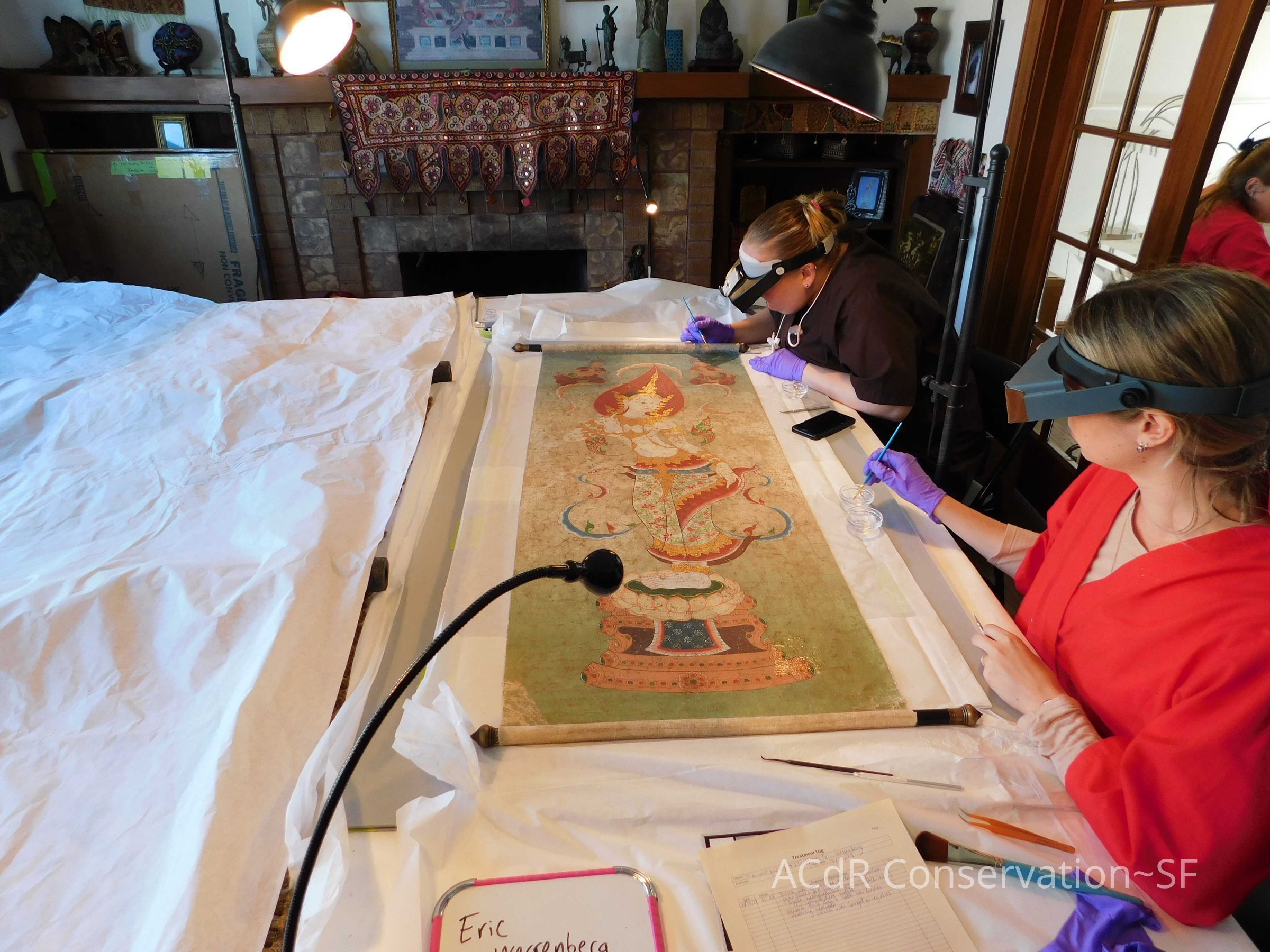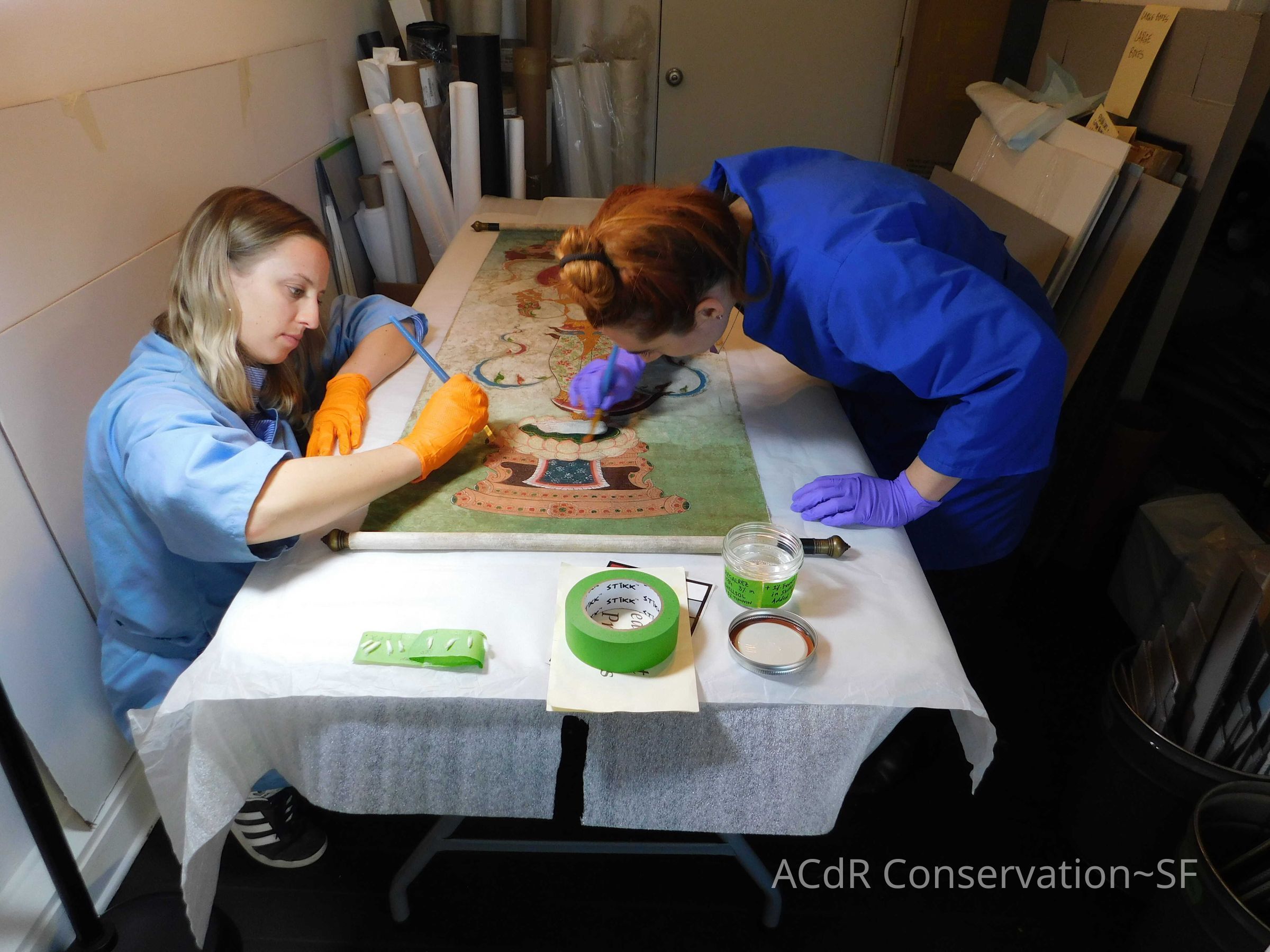 Began smoothing background appearance using wash of thinned watercolors to match what was completed on opposite scroll.