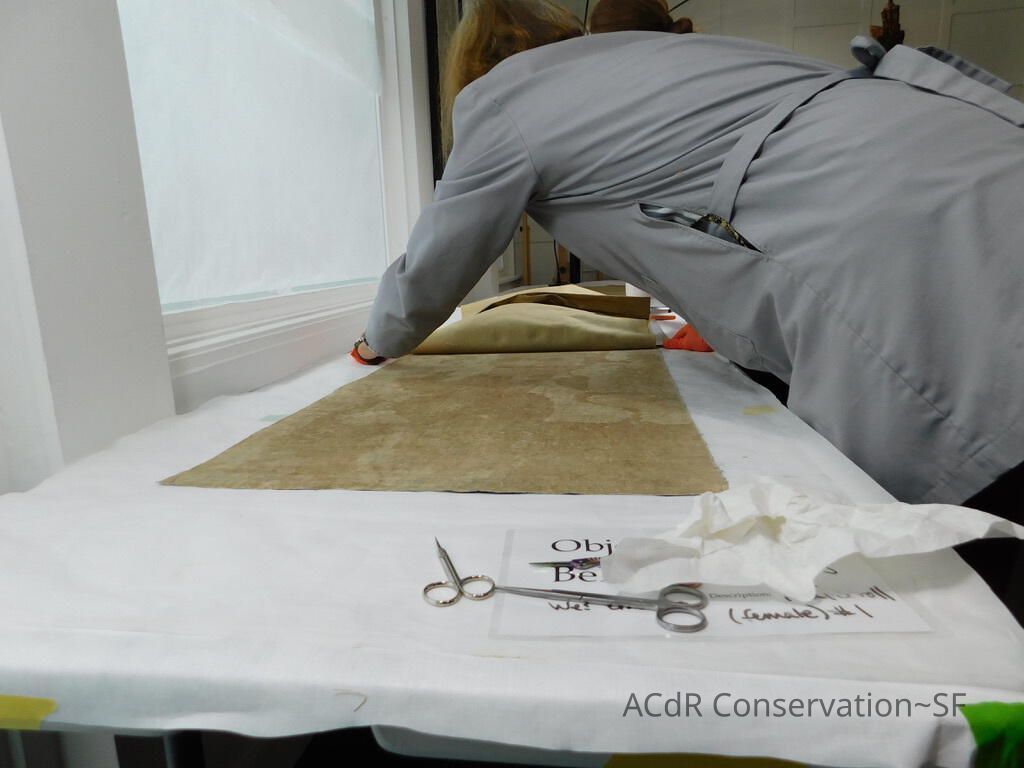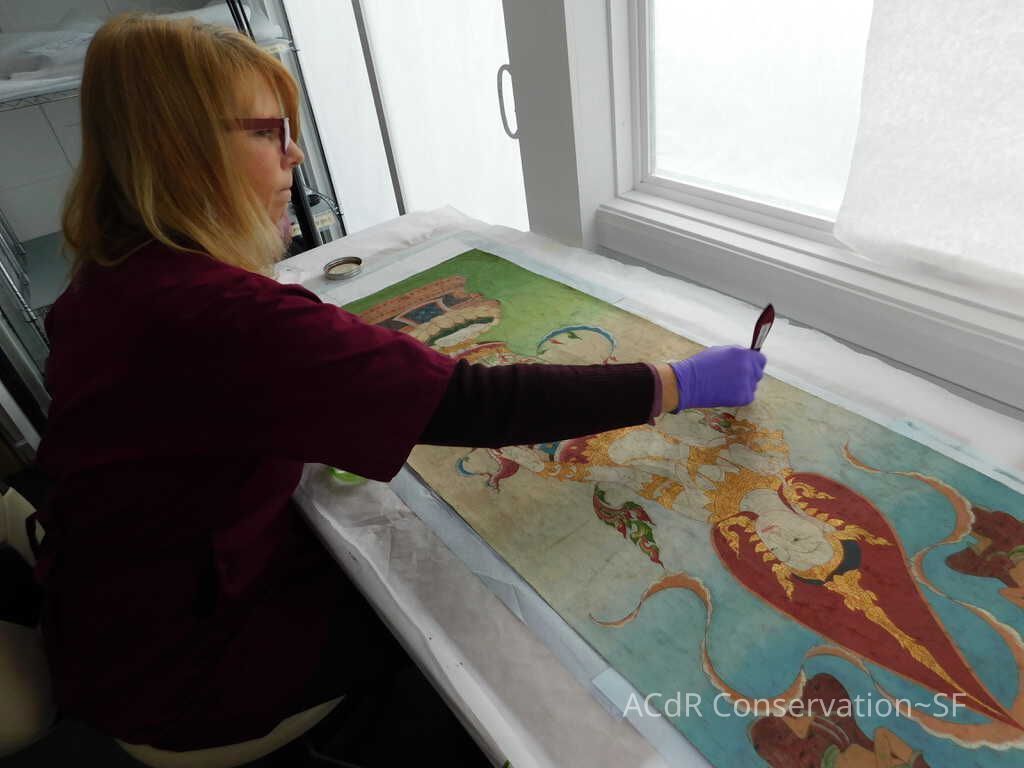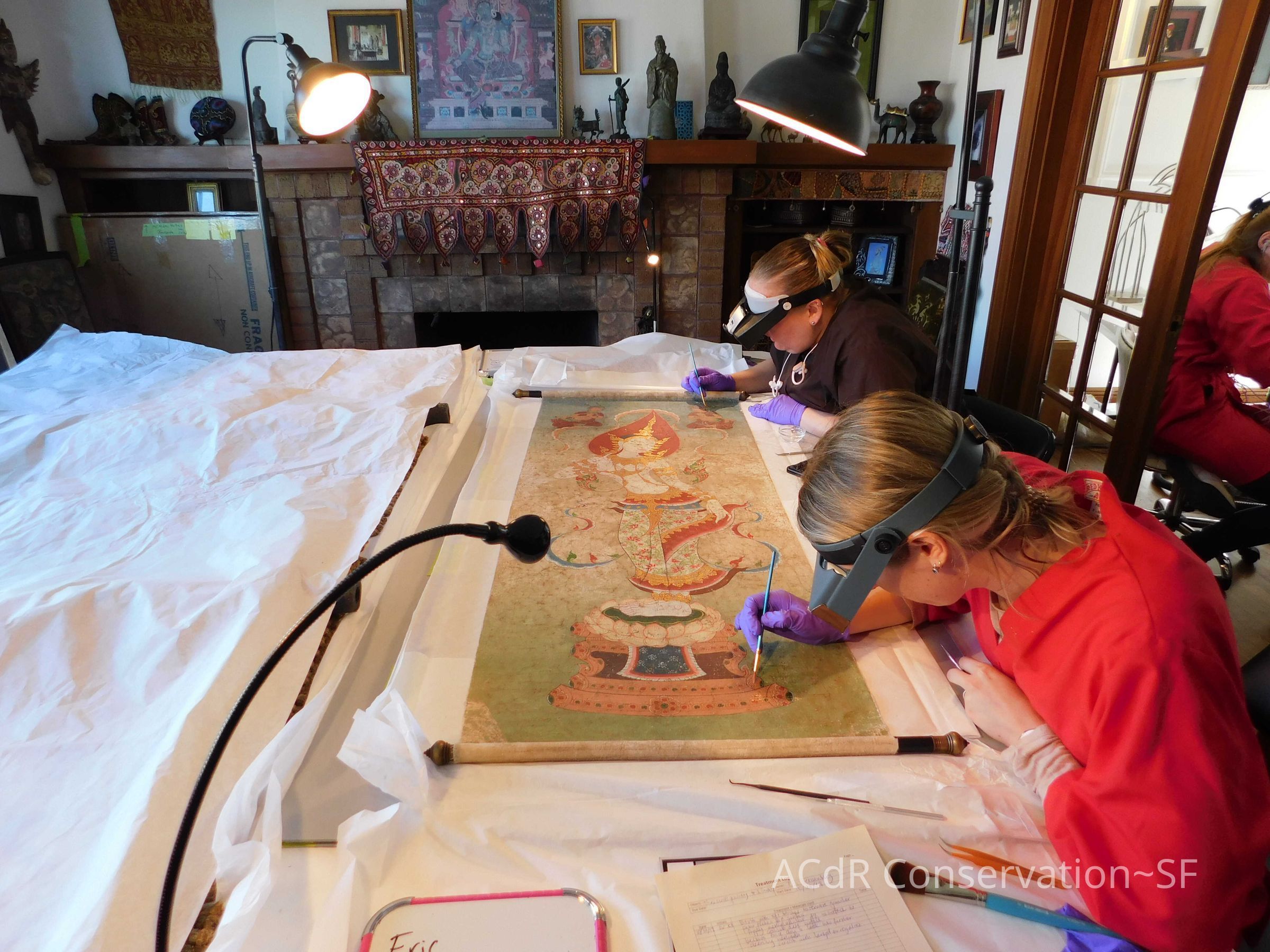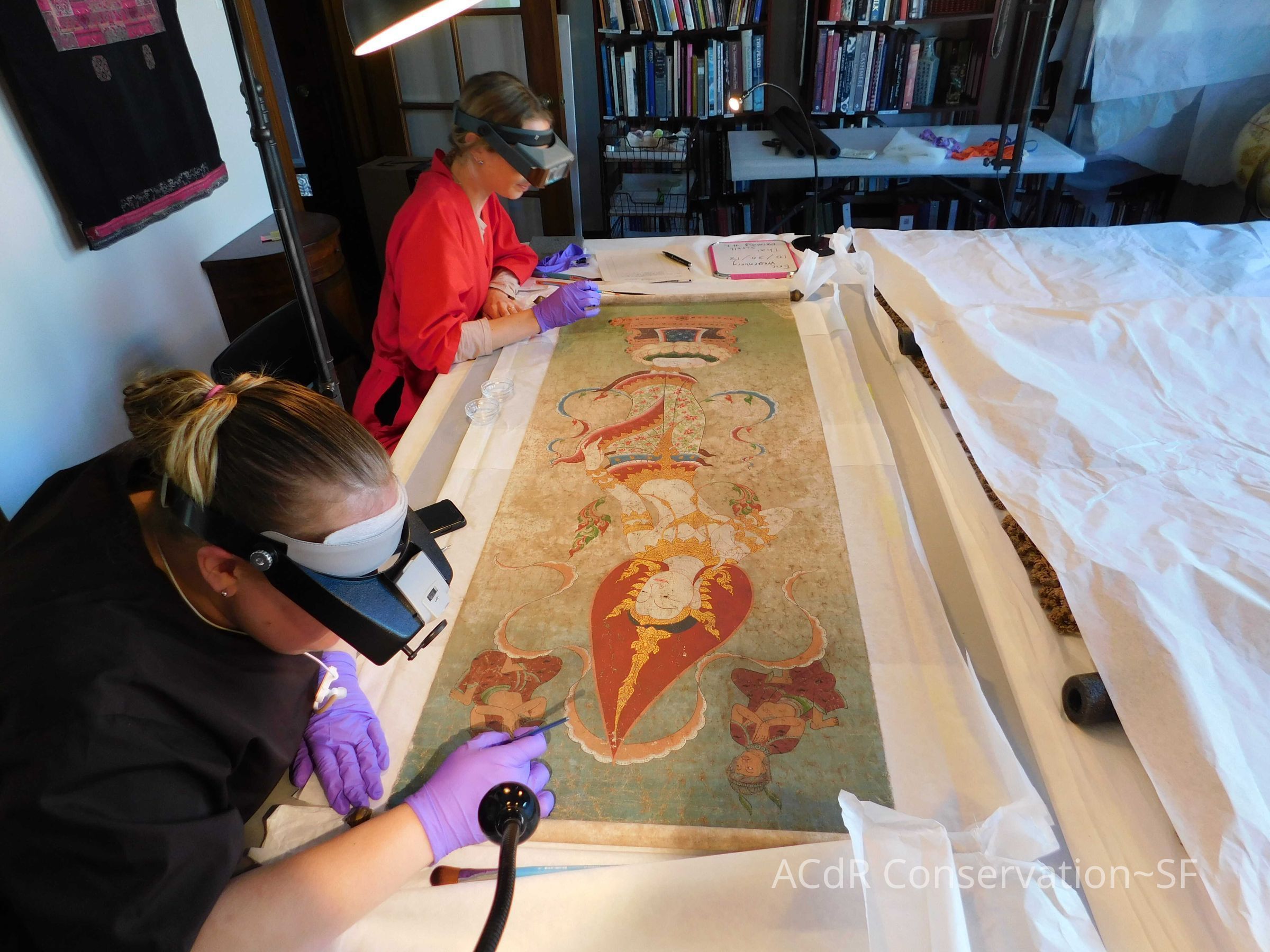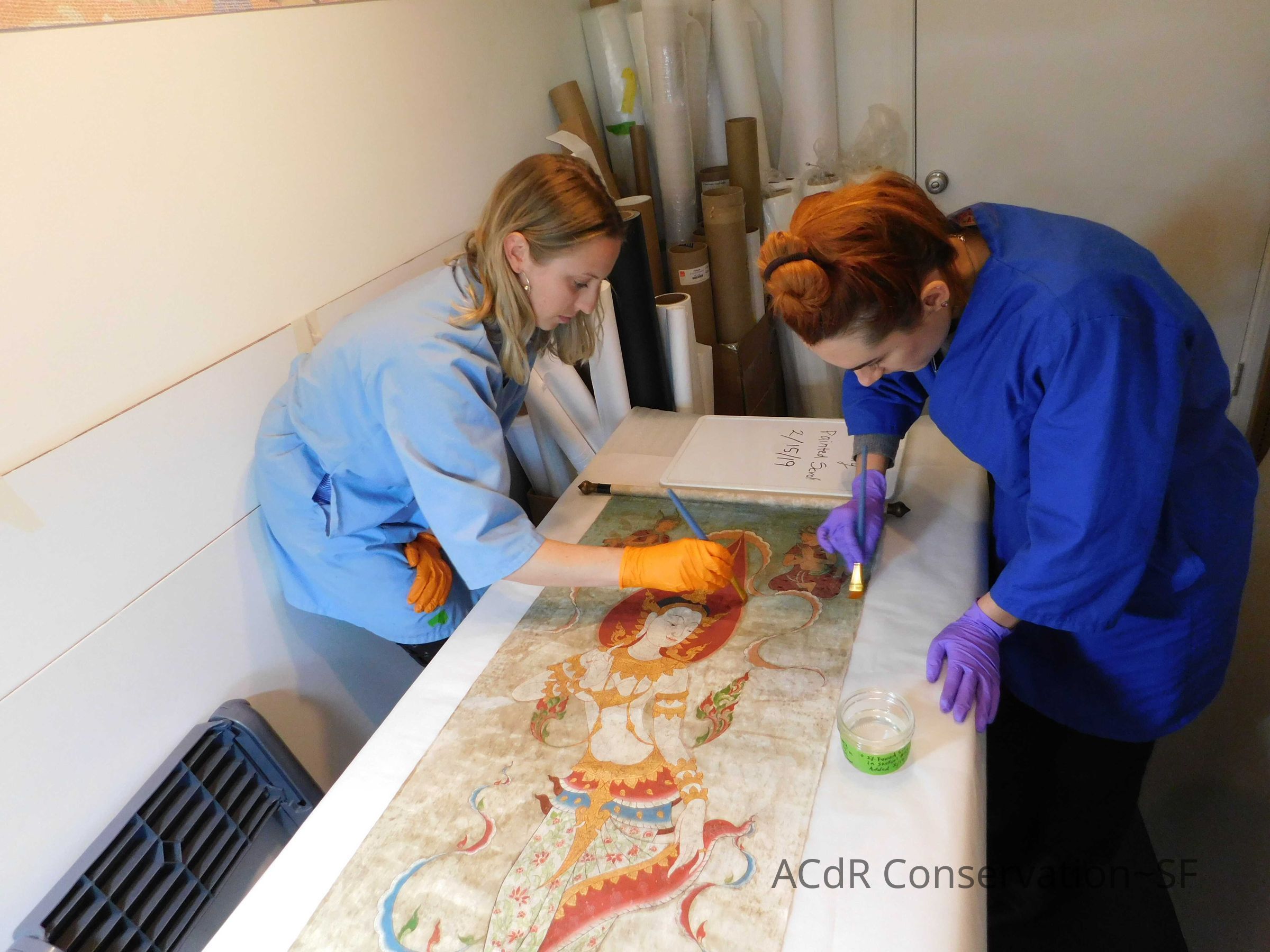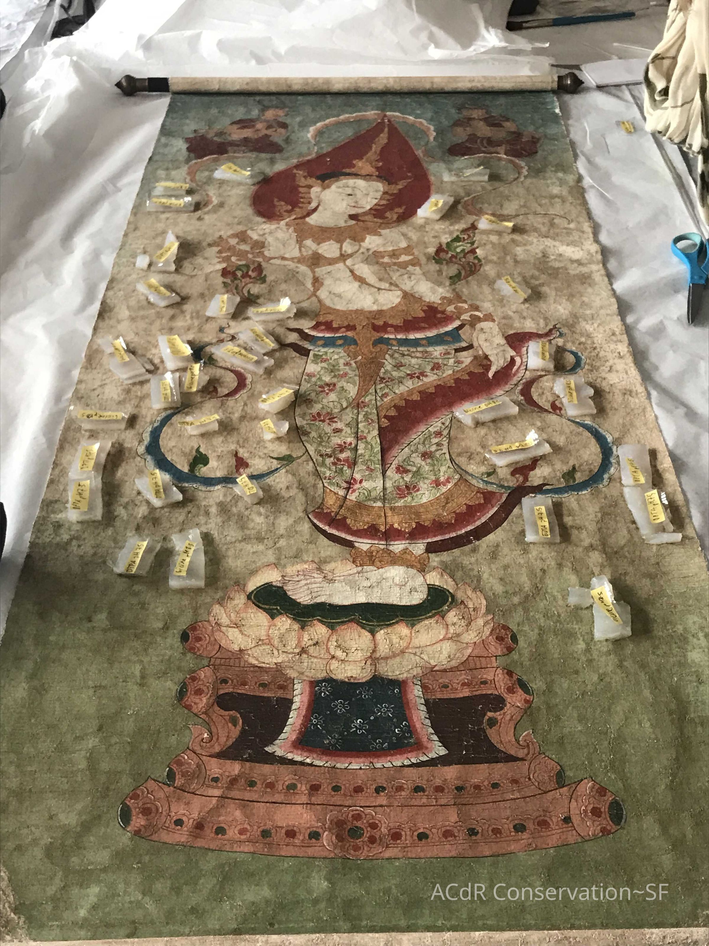 Began smoothing background appearance using wash of thinned watercolors to match what was completed on opposite scroll.