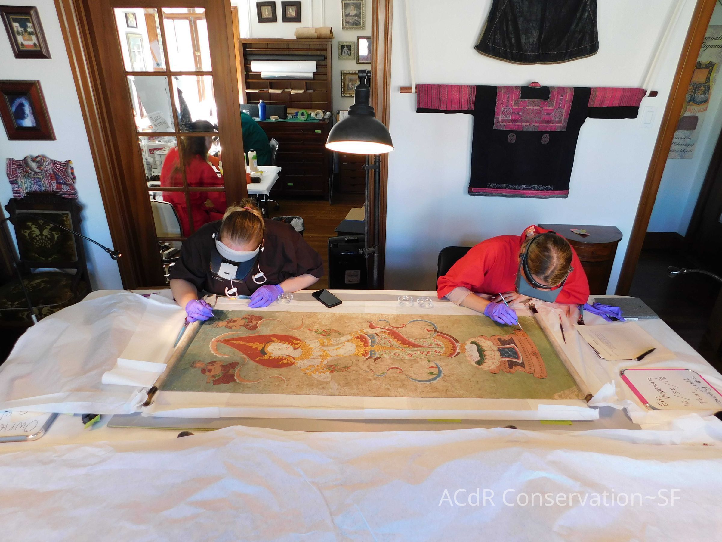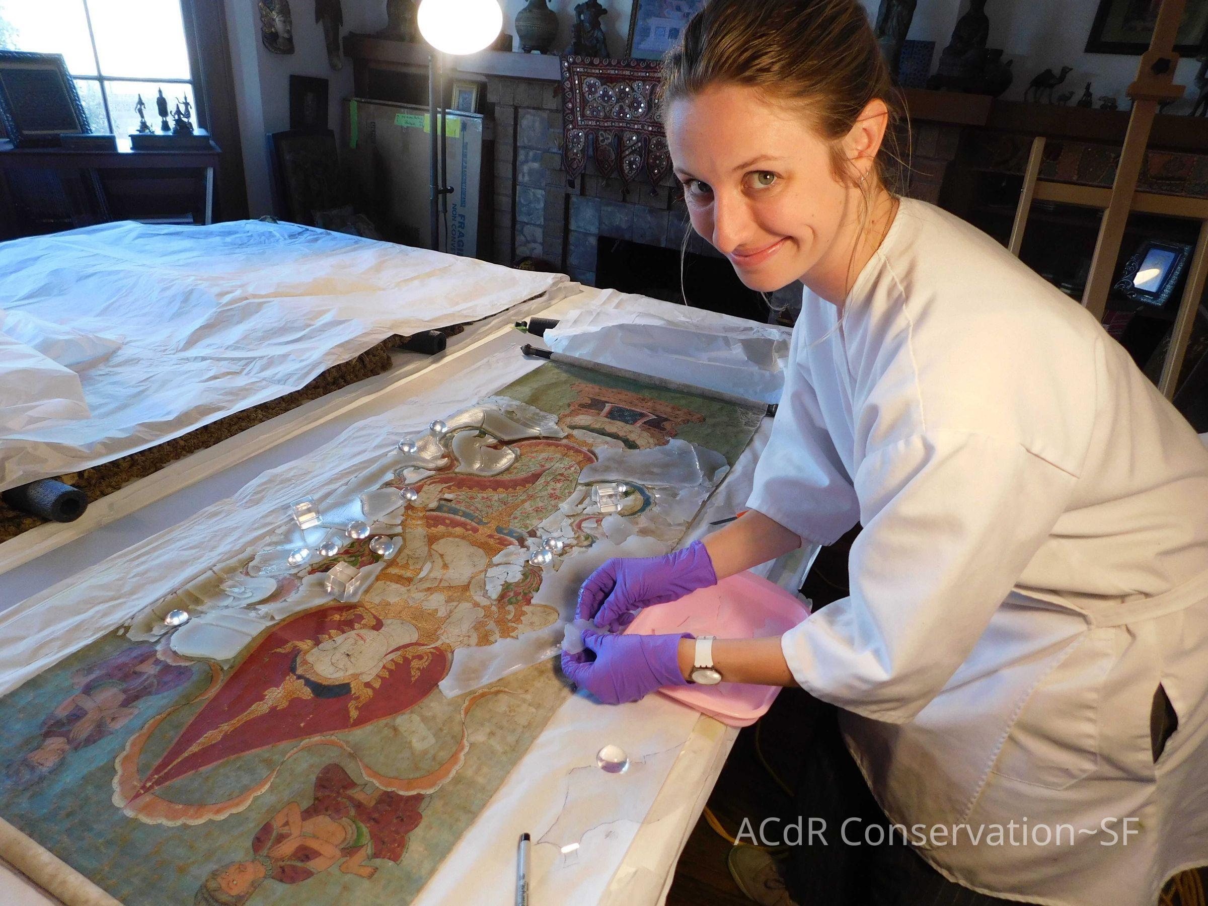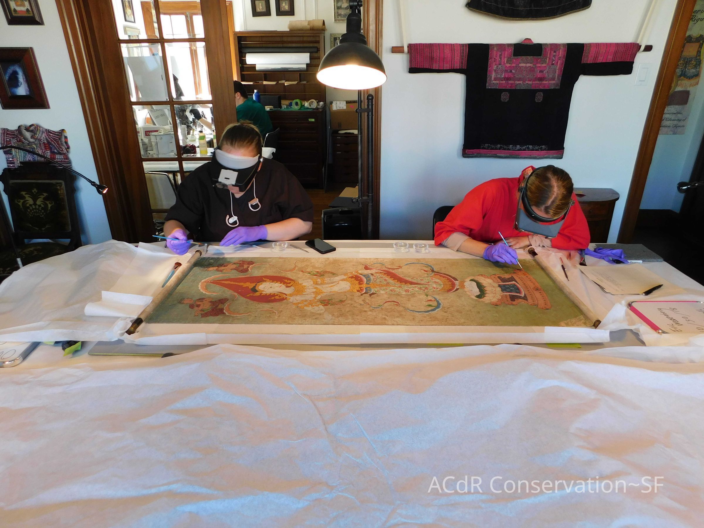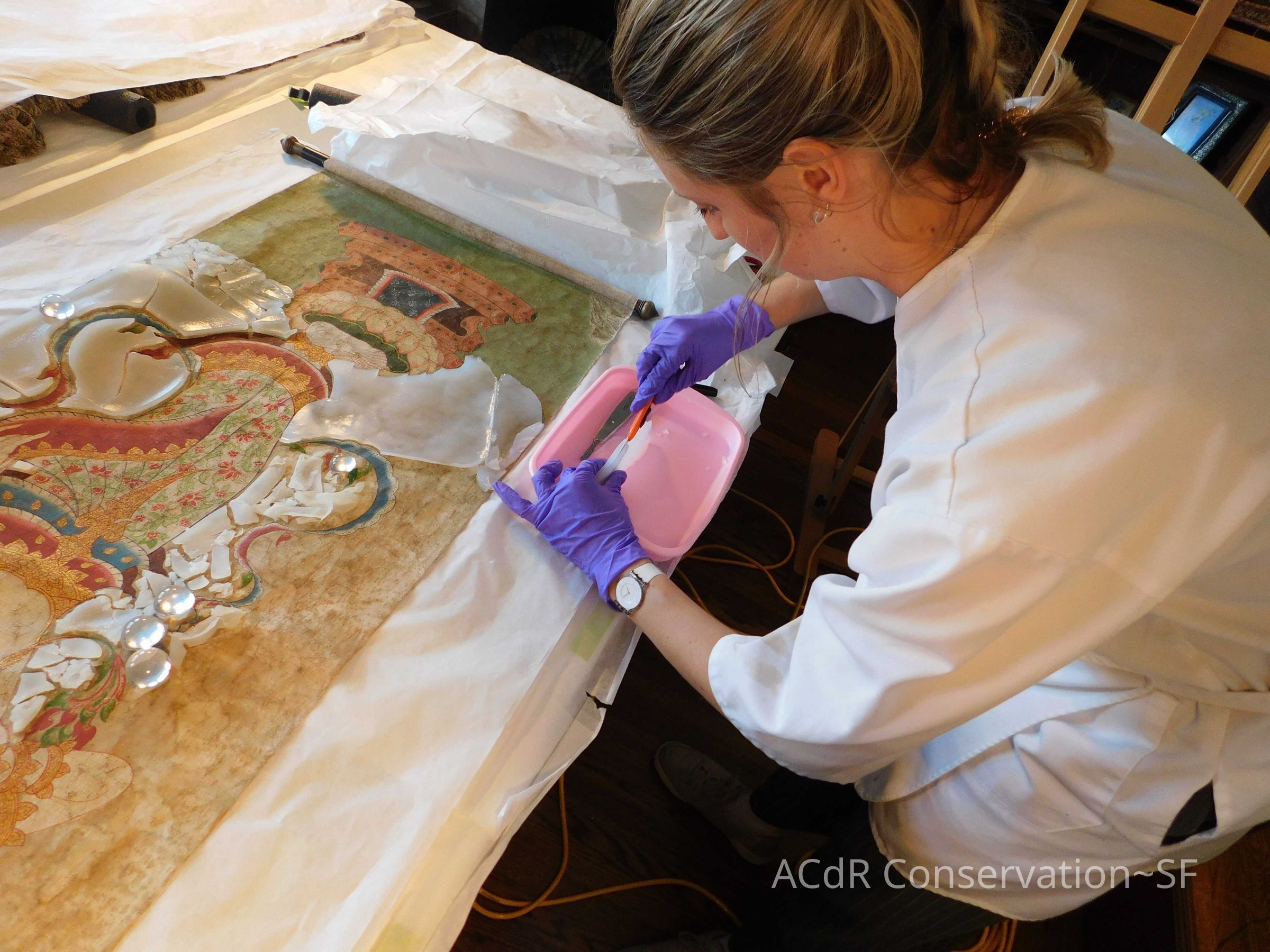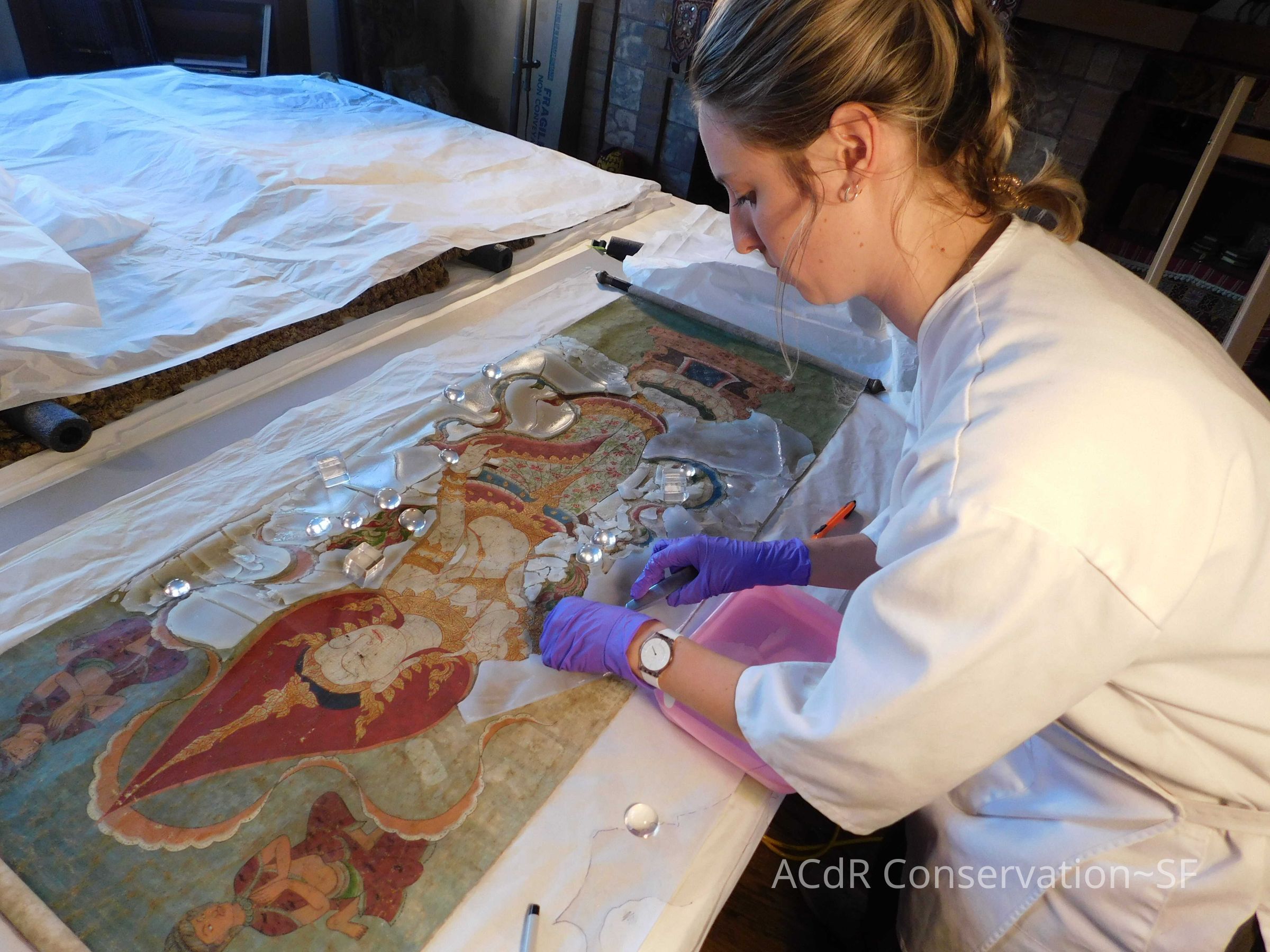 Began smoothing background appearance using wash of thinned watercolors to match what was completed on opposite scroll.