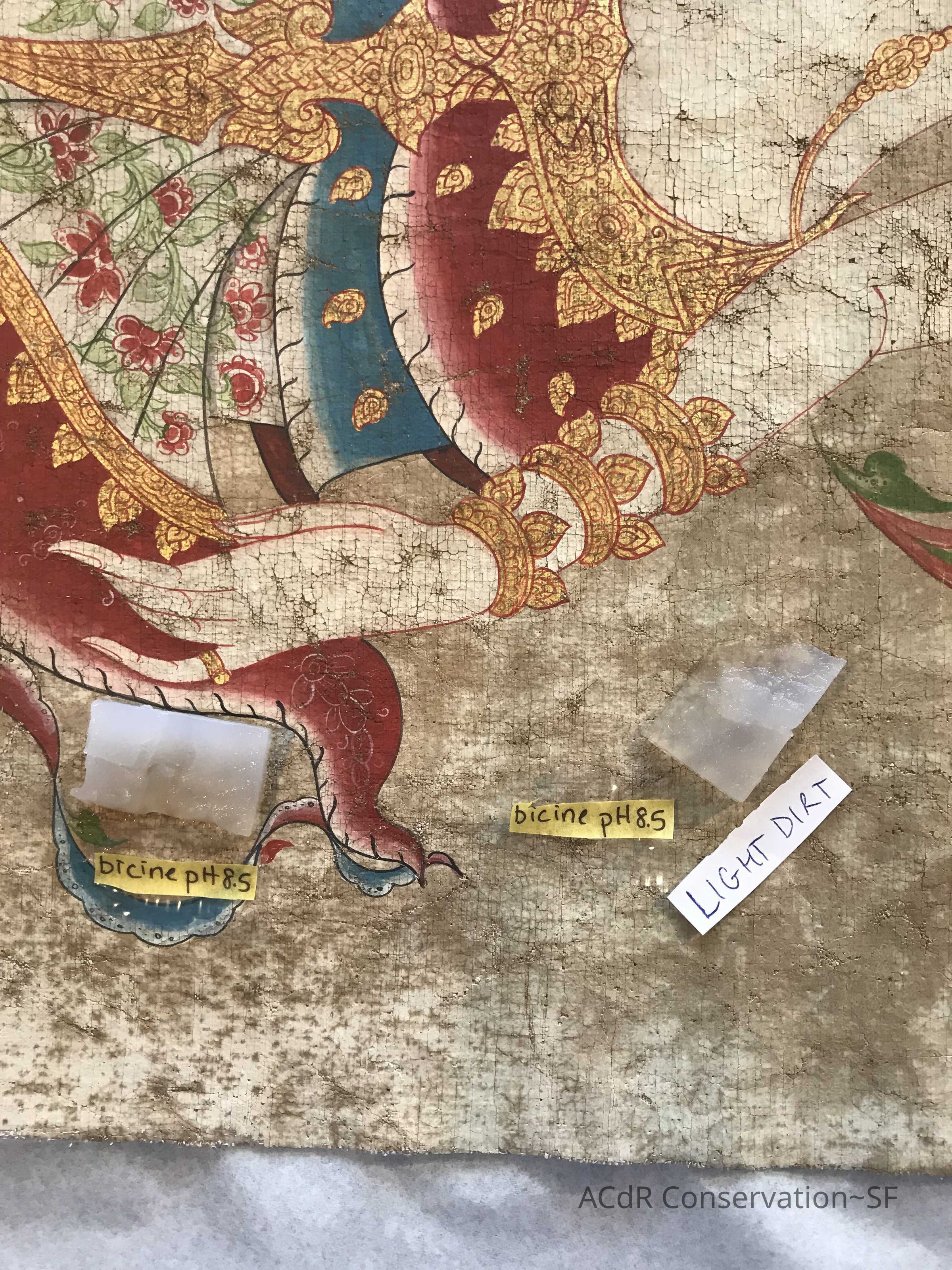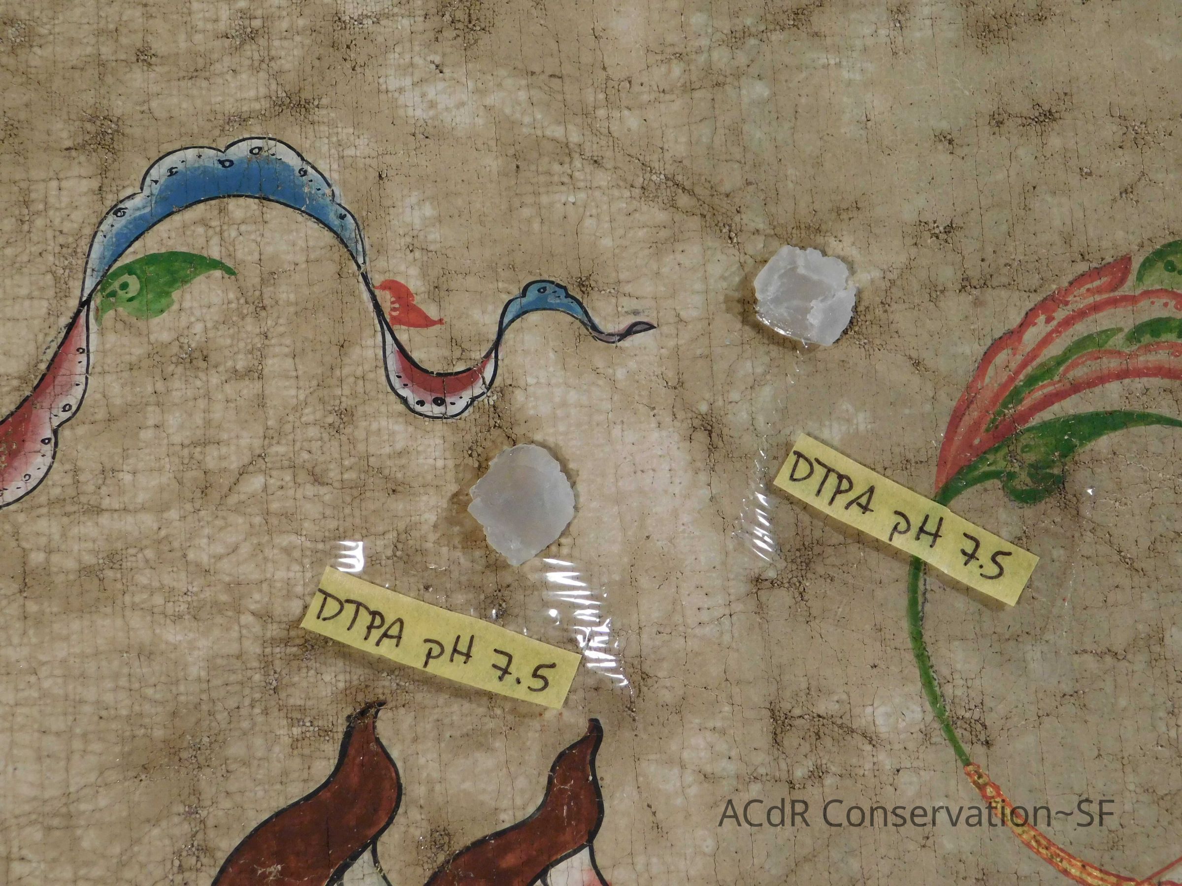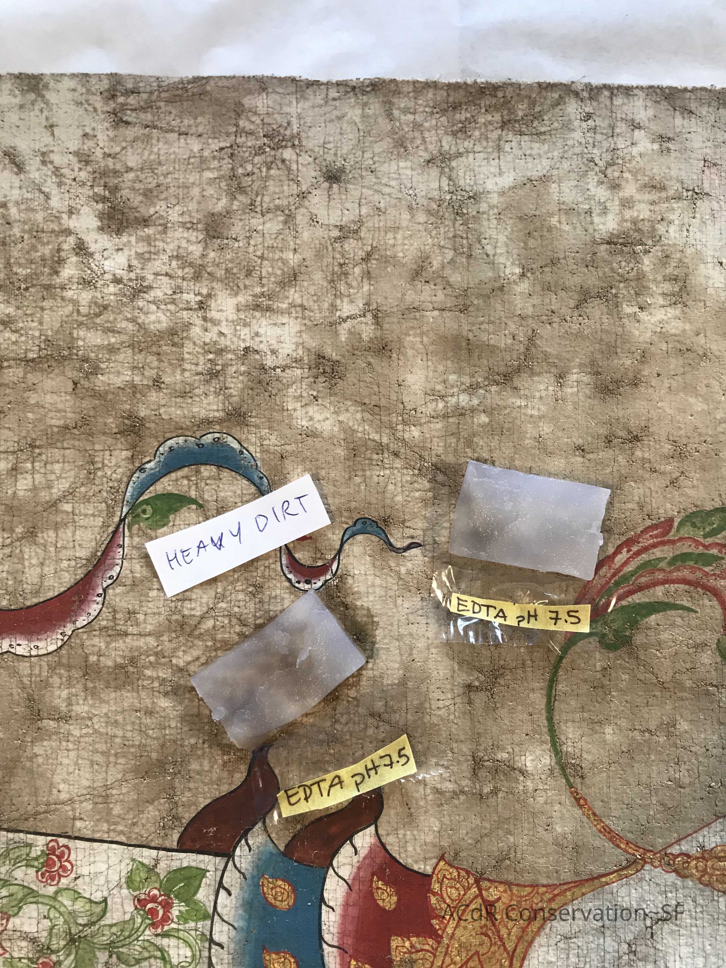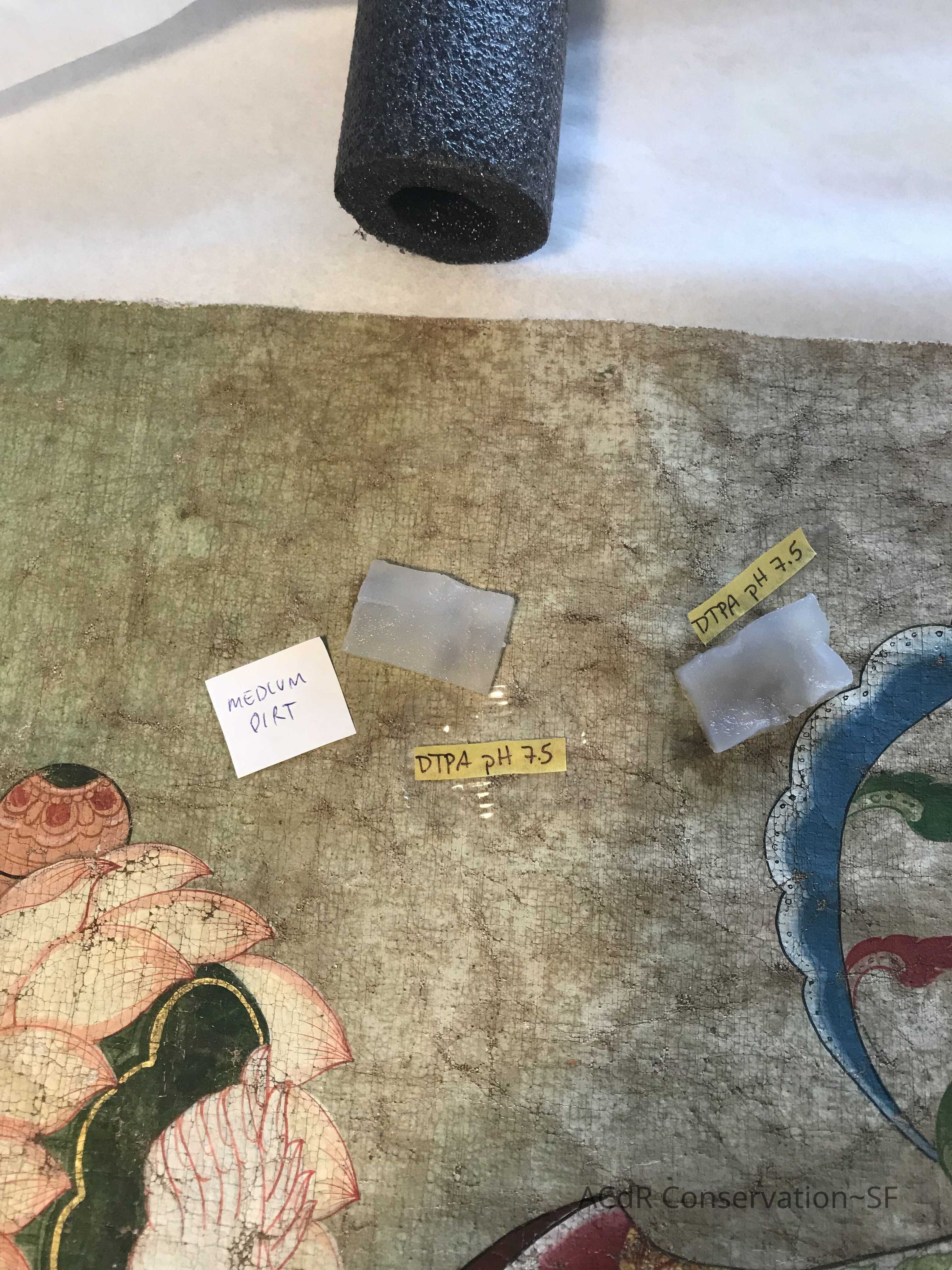 Placed 8 small blocks of agar gels with (2x) EDTA; DPTA; bicine; surfonic JL-80x across background soiled areas to test surface cleaning potential. Checked at three times throughout day (11am, 2pm, 5pm), however contact btwn agar and painting was distrubed late in the day, requiring a second attempt. Larger cubes of all four solutions of agar (2x) placed around dirty background areas under cube weights. Left to dehydrate until Mon 11/12 to allow for capillary action.