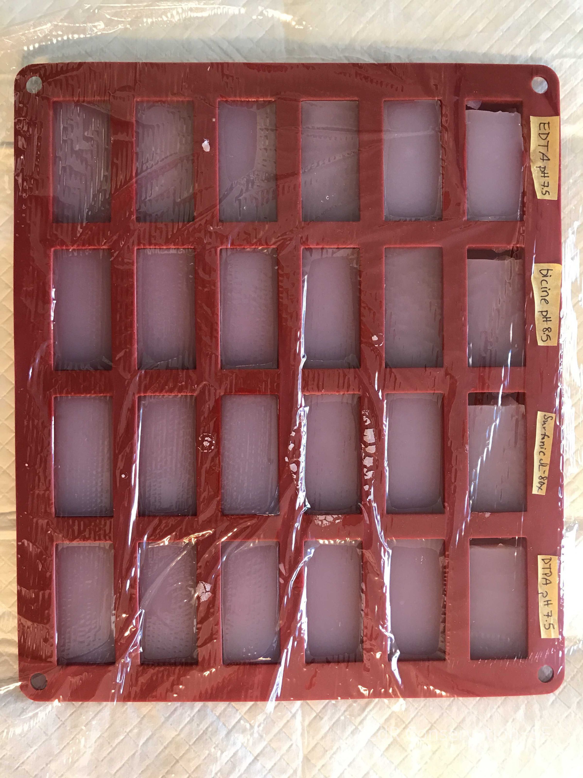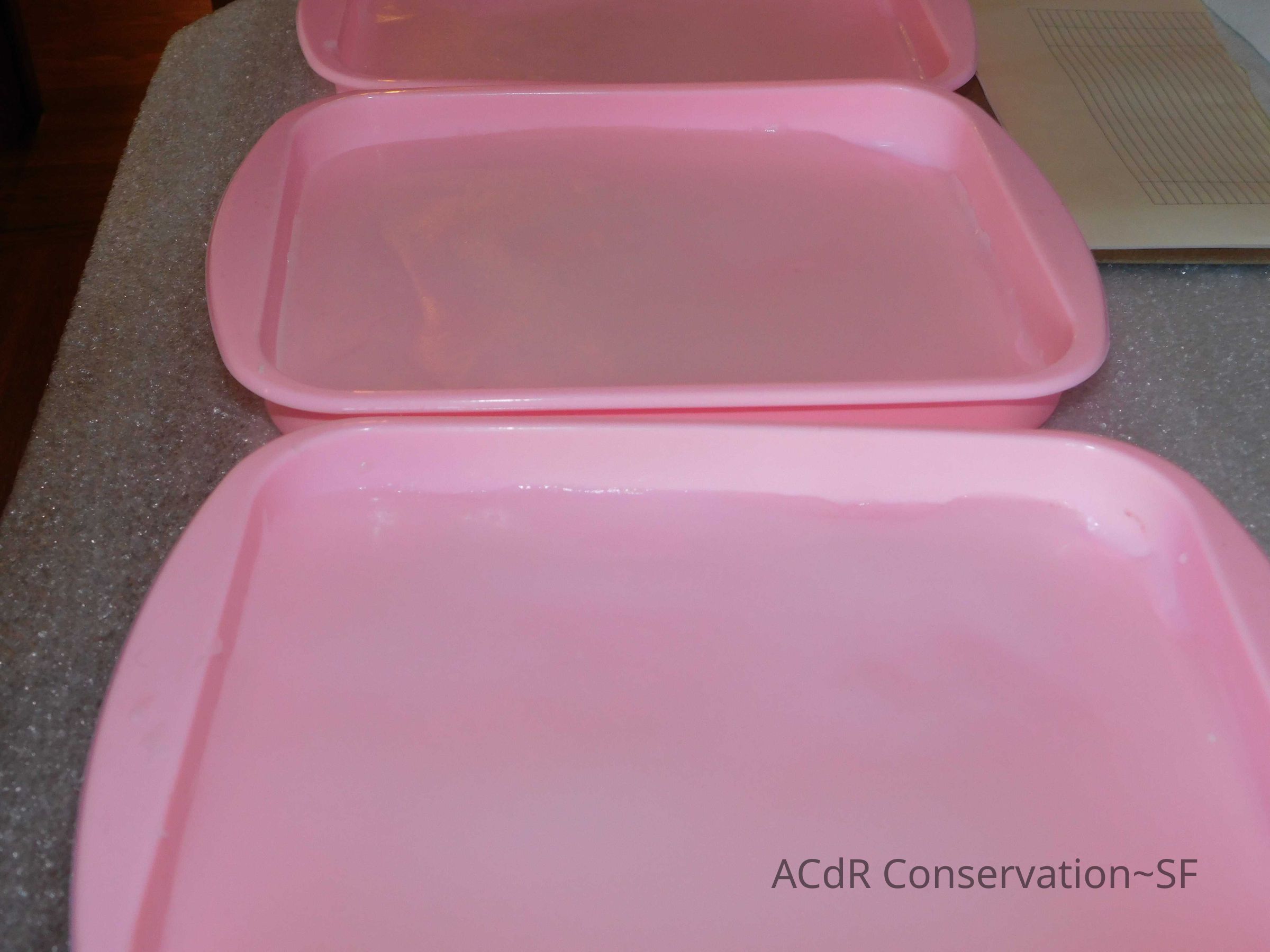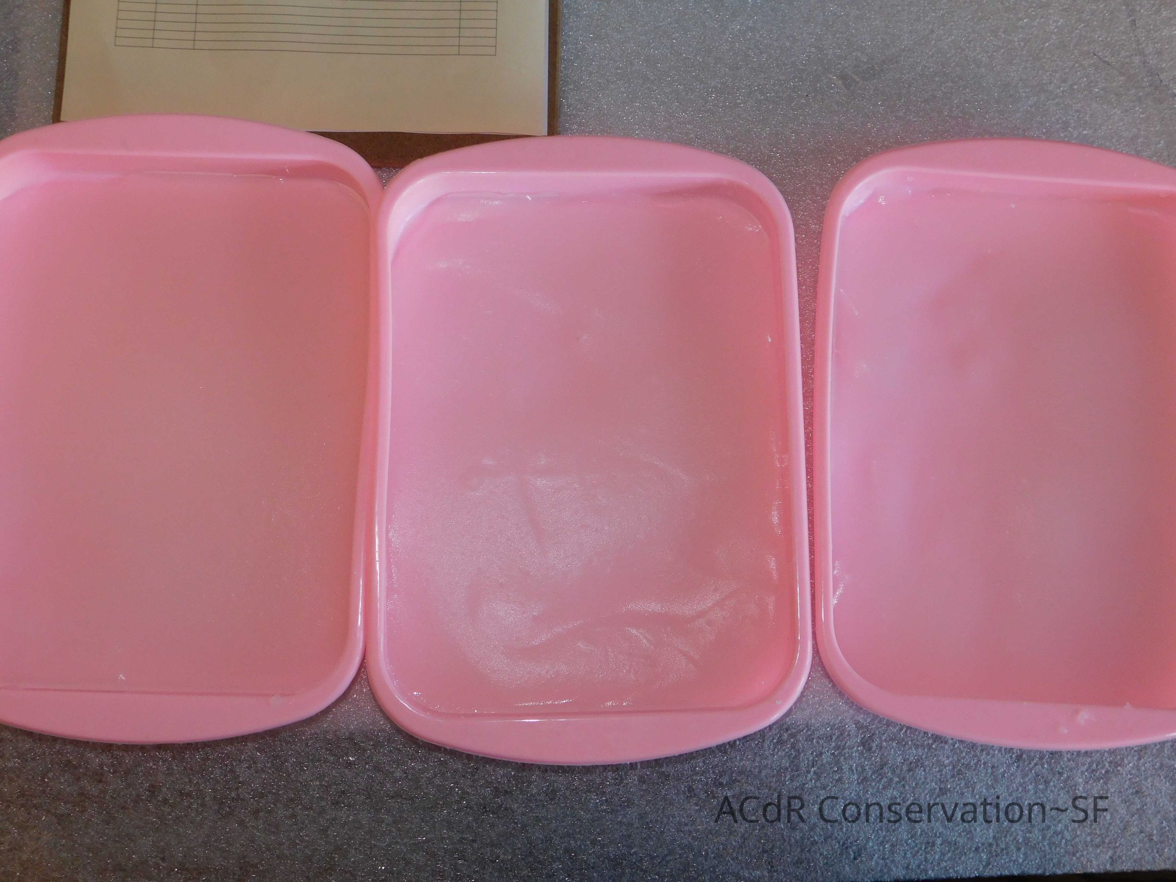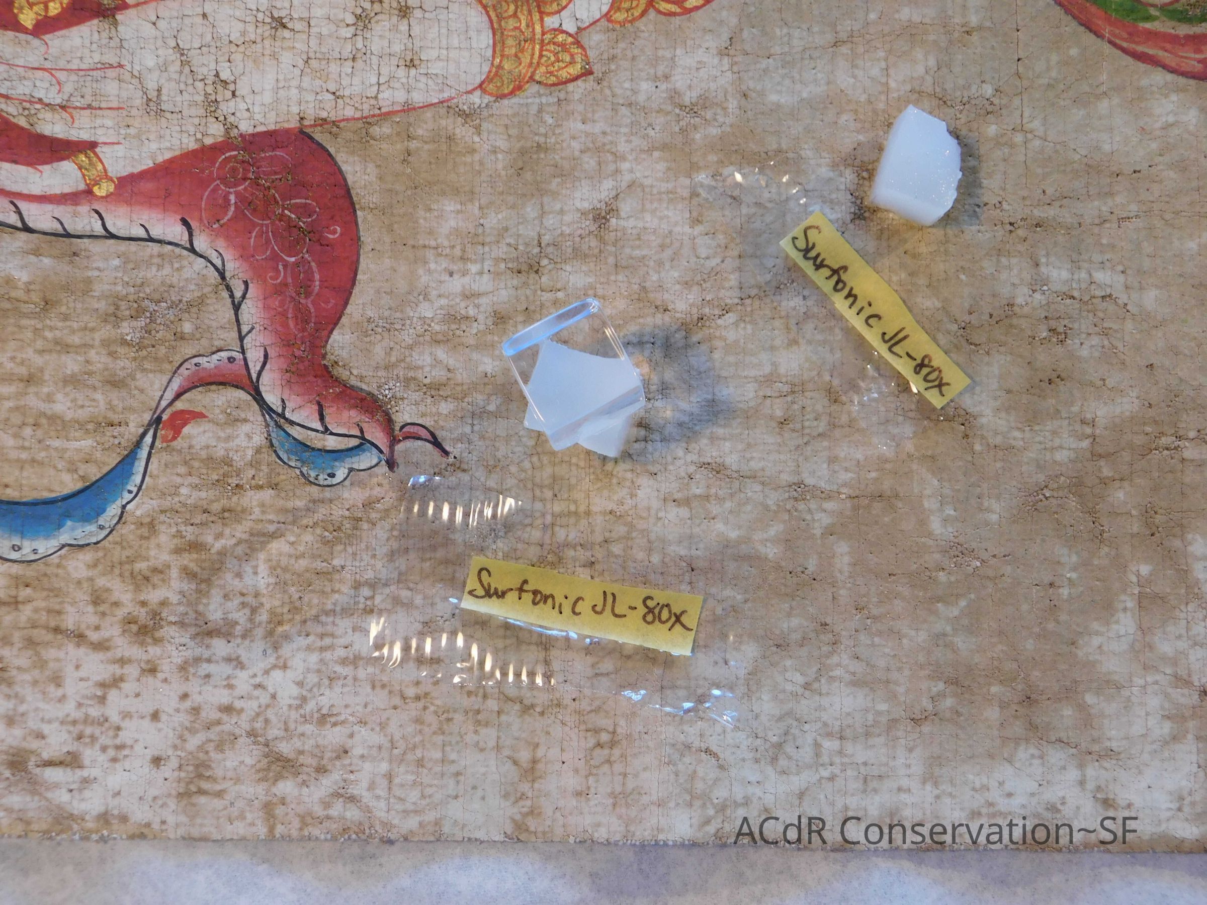 Placed 8 small blocks of agar gels with (2x) EDTA; DPTA; bicine; surfonic JL-80x across background soiled areas to test surface cleaning potential. Checked at three times throughout day (11am, 2pm, 5pm), however contact btwn agar and painting was distrubed late in the day, requiring a second attempt. Larger cubes of all four solutions of agar (2x) placed around dirty background areas under cube weights. Left to dehydrate until Mon 11/12 to allow for capillary action.