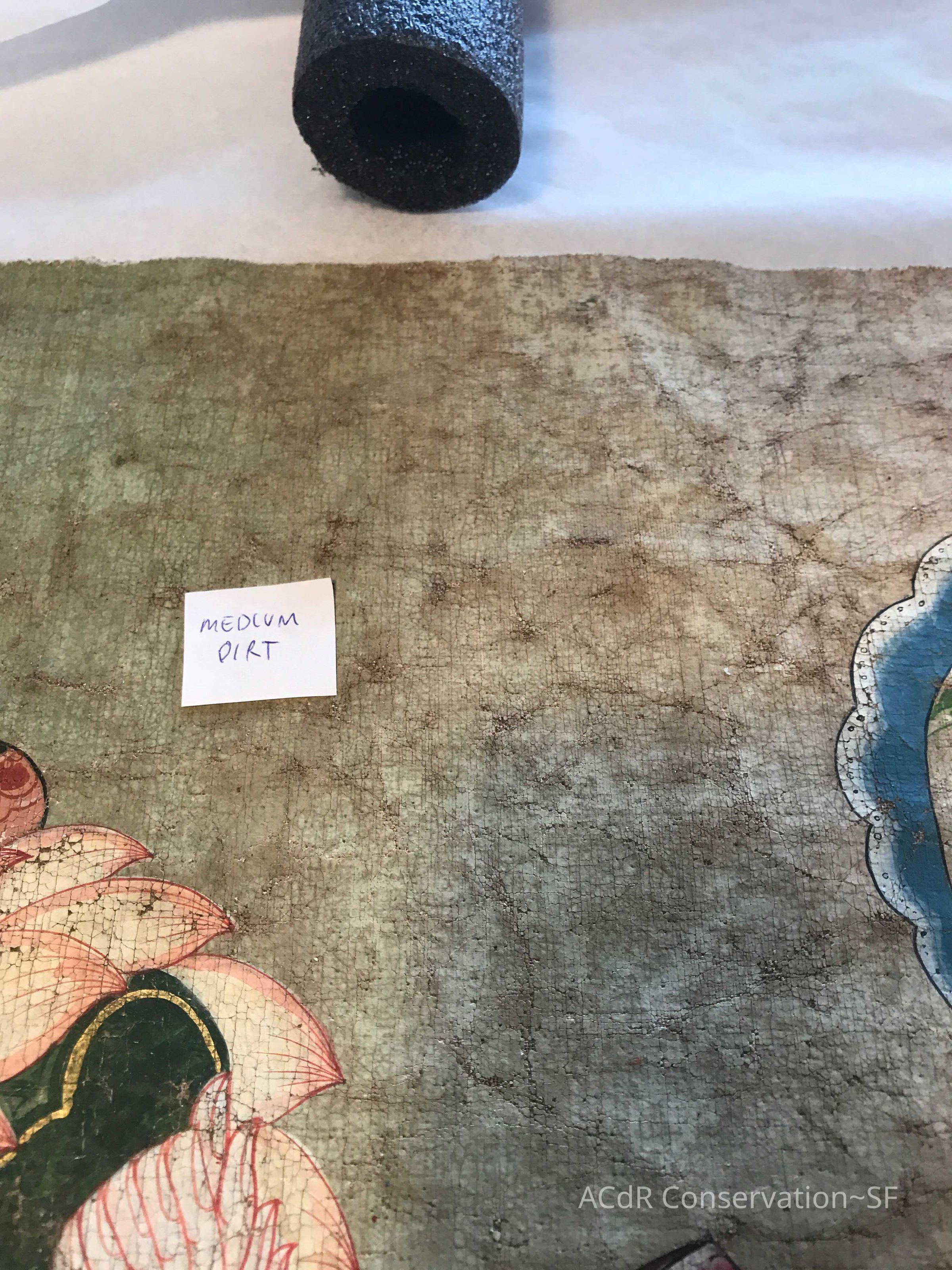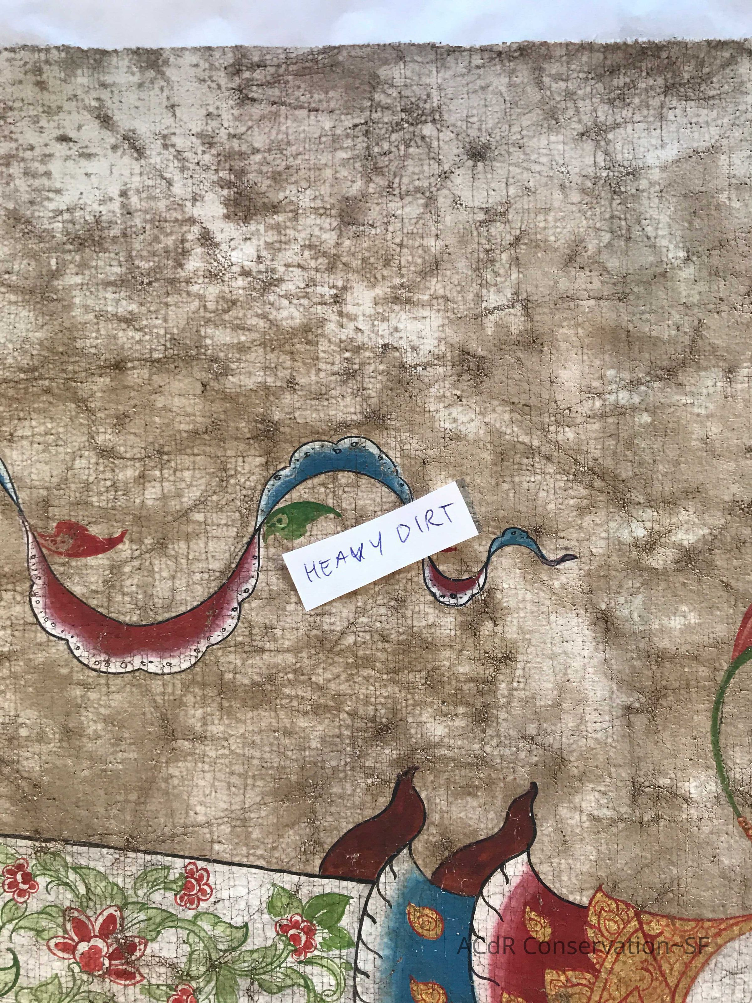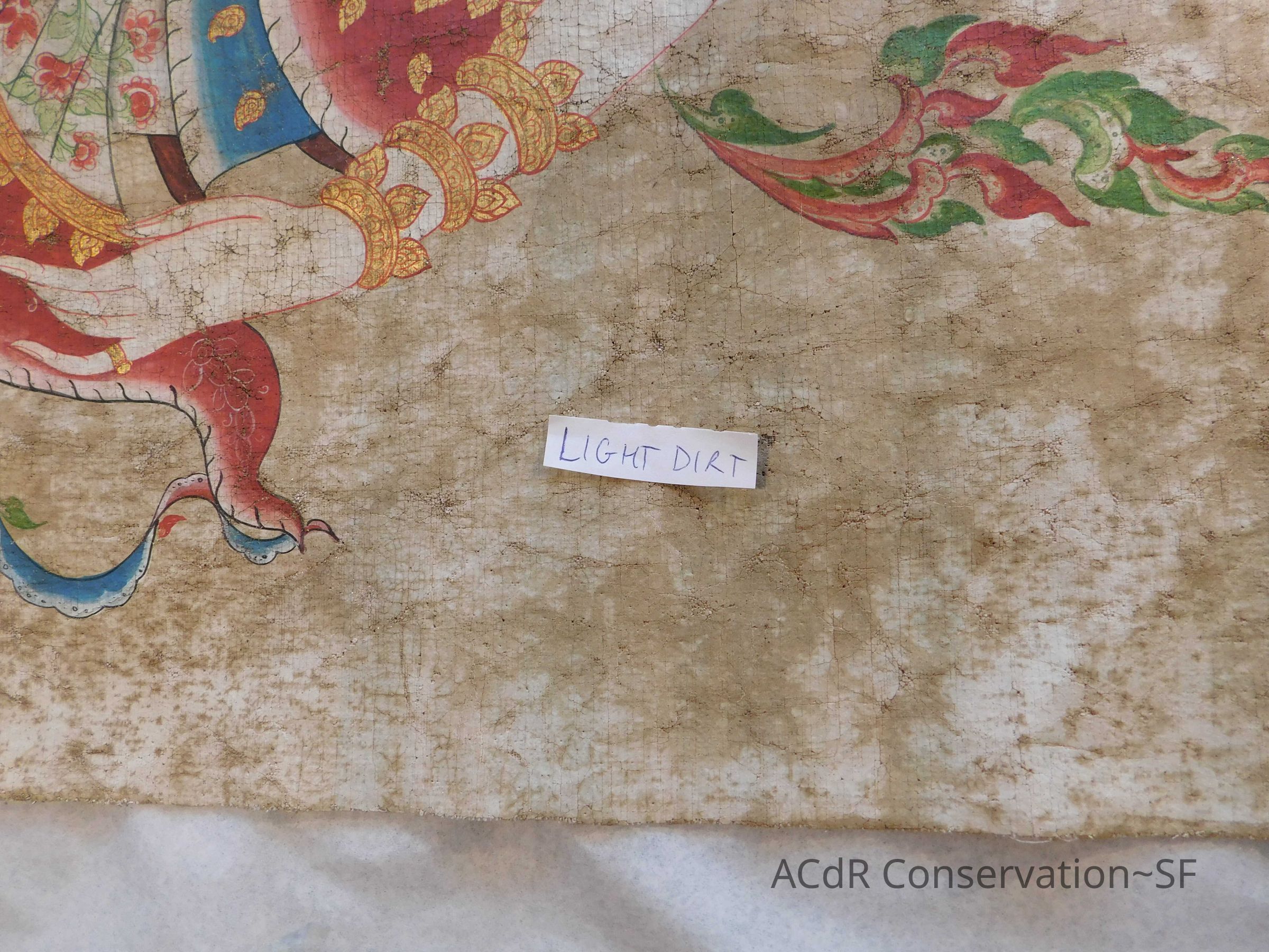 Brushed with soft brushes to remove granular paint flakes from surface. Applied methylcelllose (4%) to surface to consolidate. Vacuumed once dry and will look into further cleaning methods.