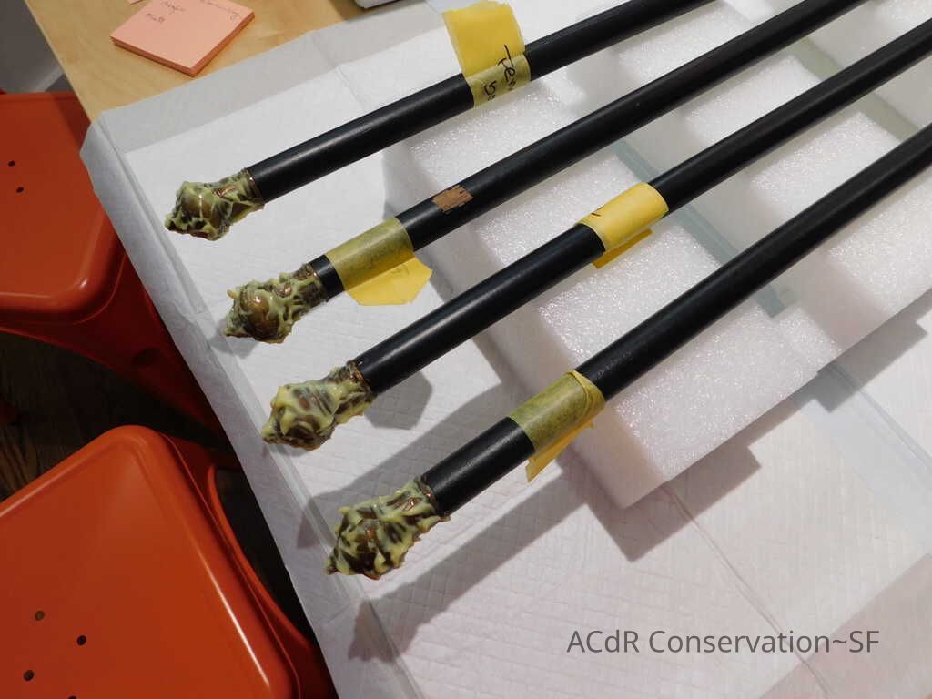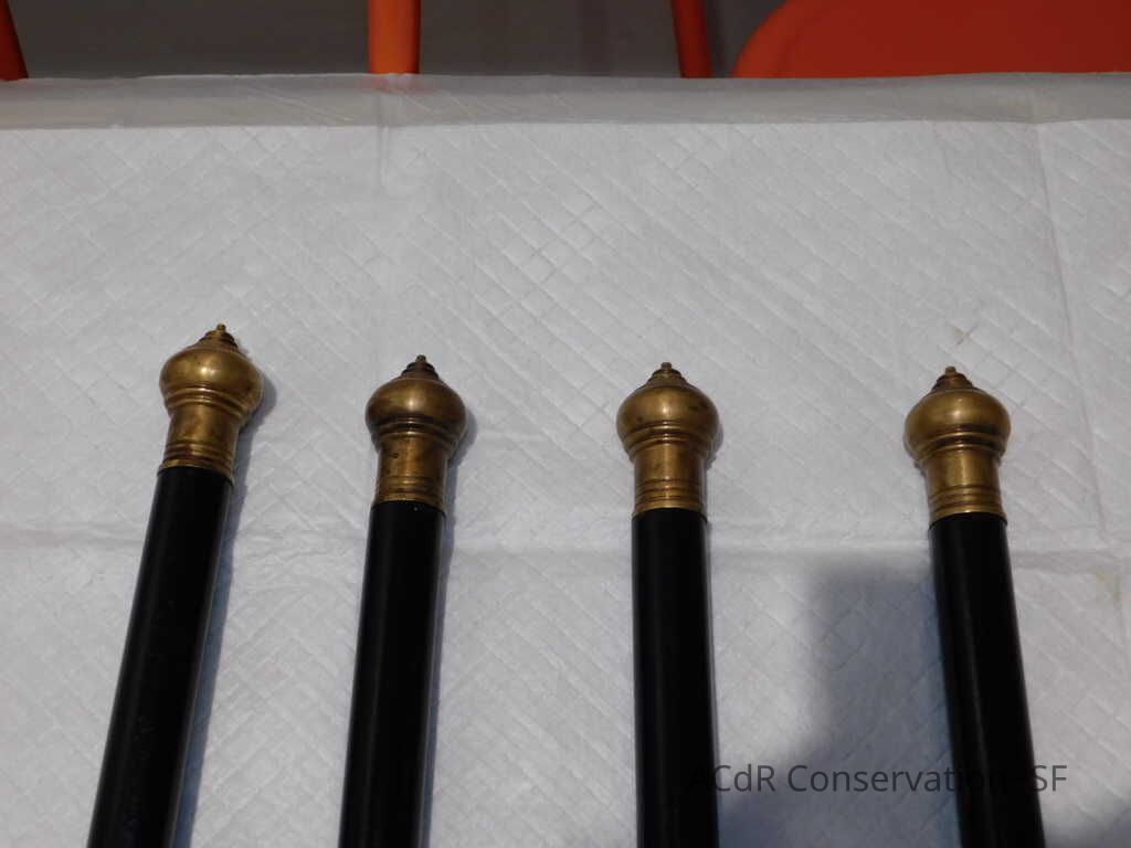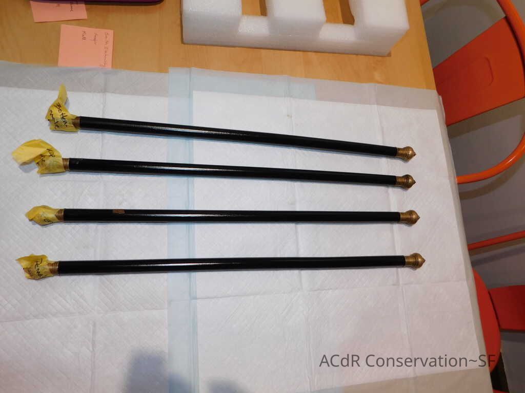 Removed wooden rods and cleaned edges. Applied regalrez 3% in shellsol with 1% tinuvin and 1& fumed silica on entire surface. Cleaned brass on rods with metal cleaner and honeypot wood.
