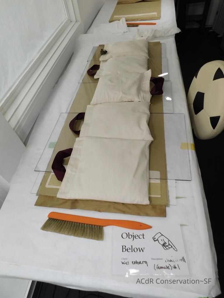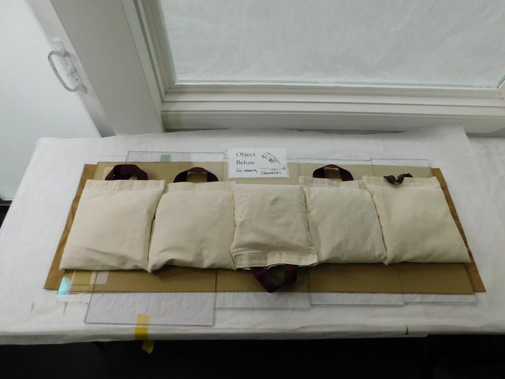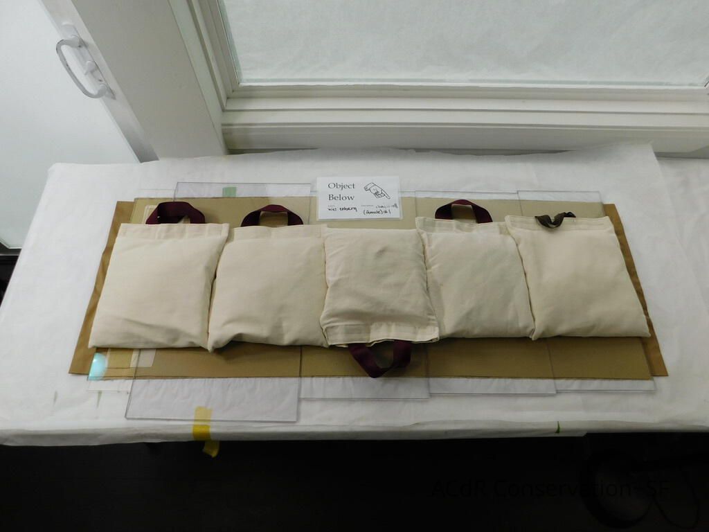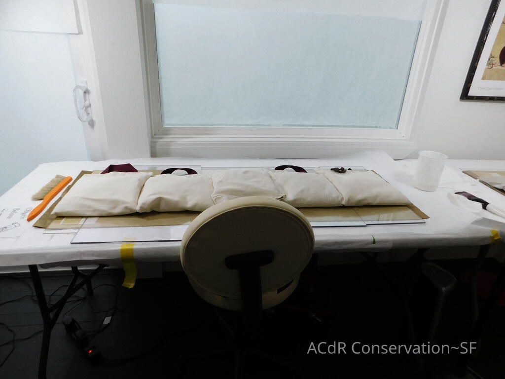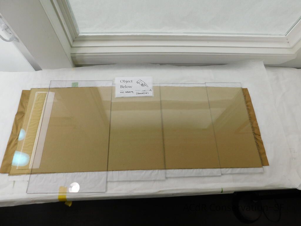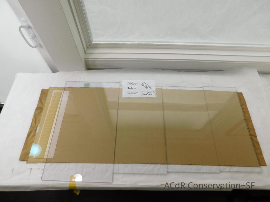Prepared 3% regalrez varnish in shellsol D38. Added 1% silica to regalrez varnish. Varnished artwork with 3% regalrez in shellsol D38 + Tinurin 292 + silica. Put artwork under weight.