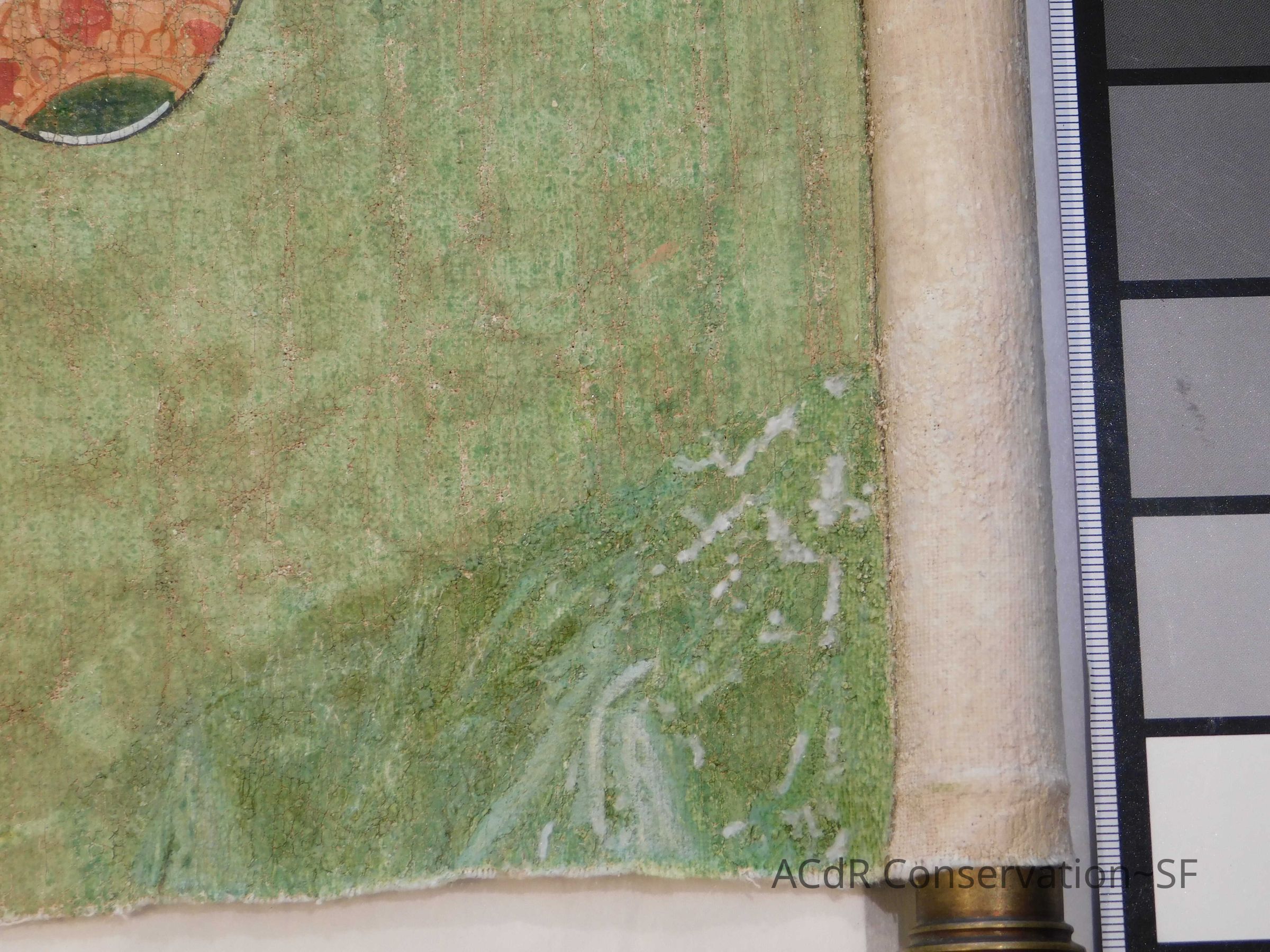 Began smoothing background appearance using wash of thinned watercolors to match what was completed on opposite scroll.