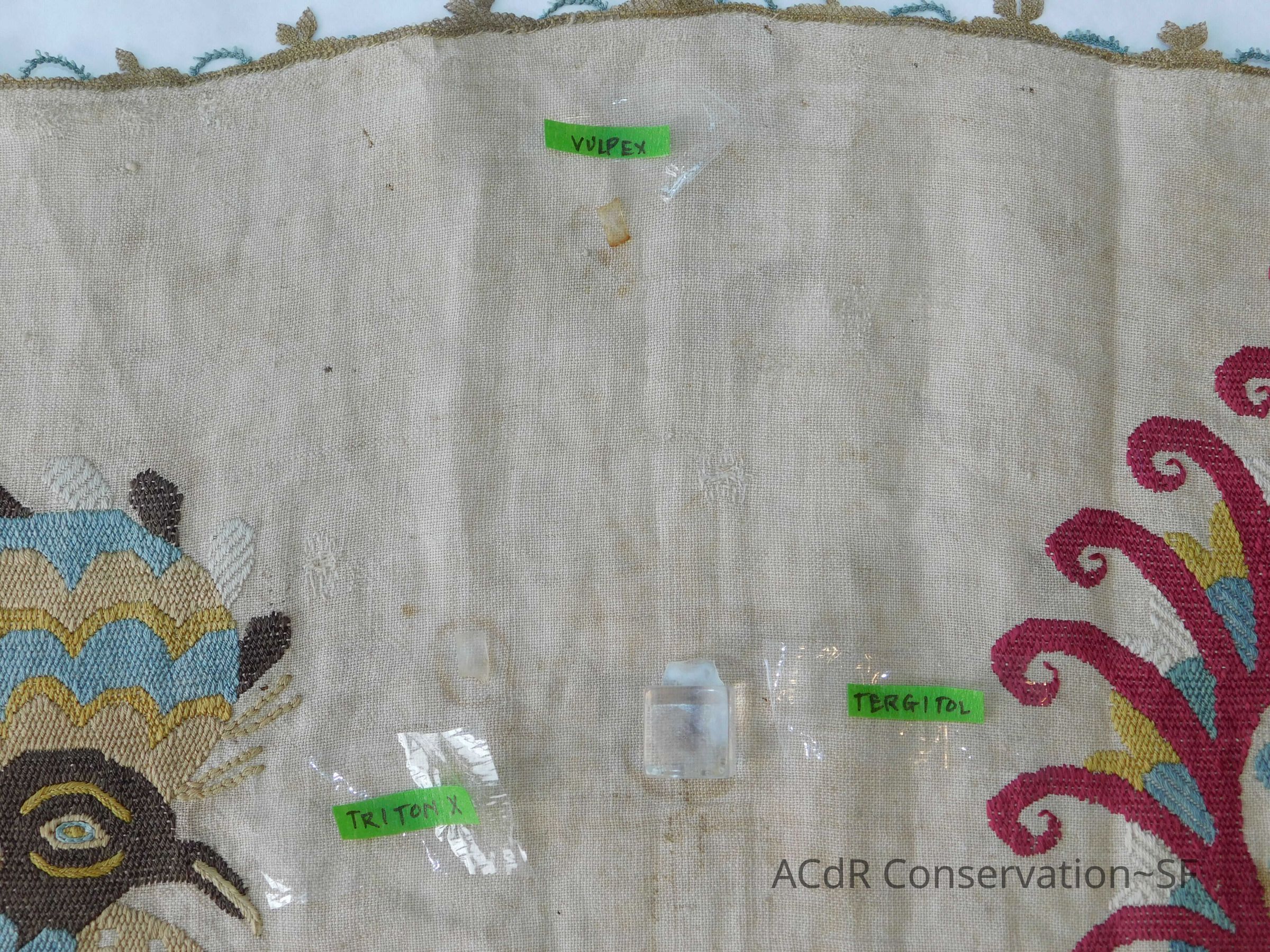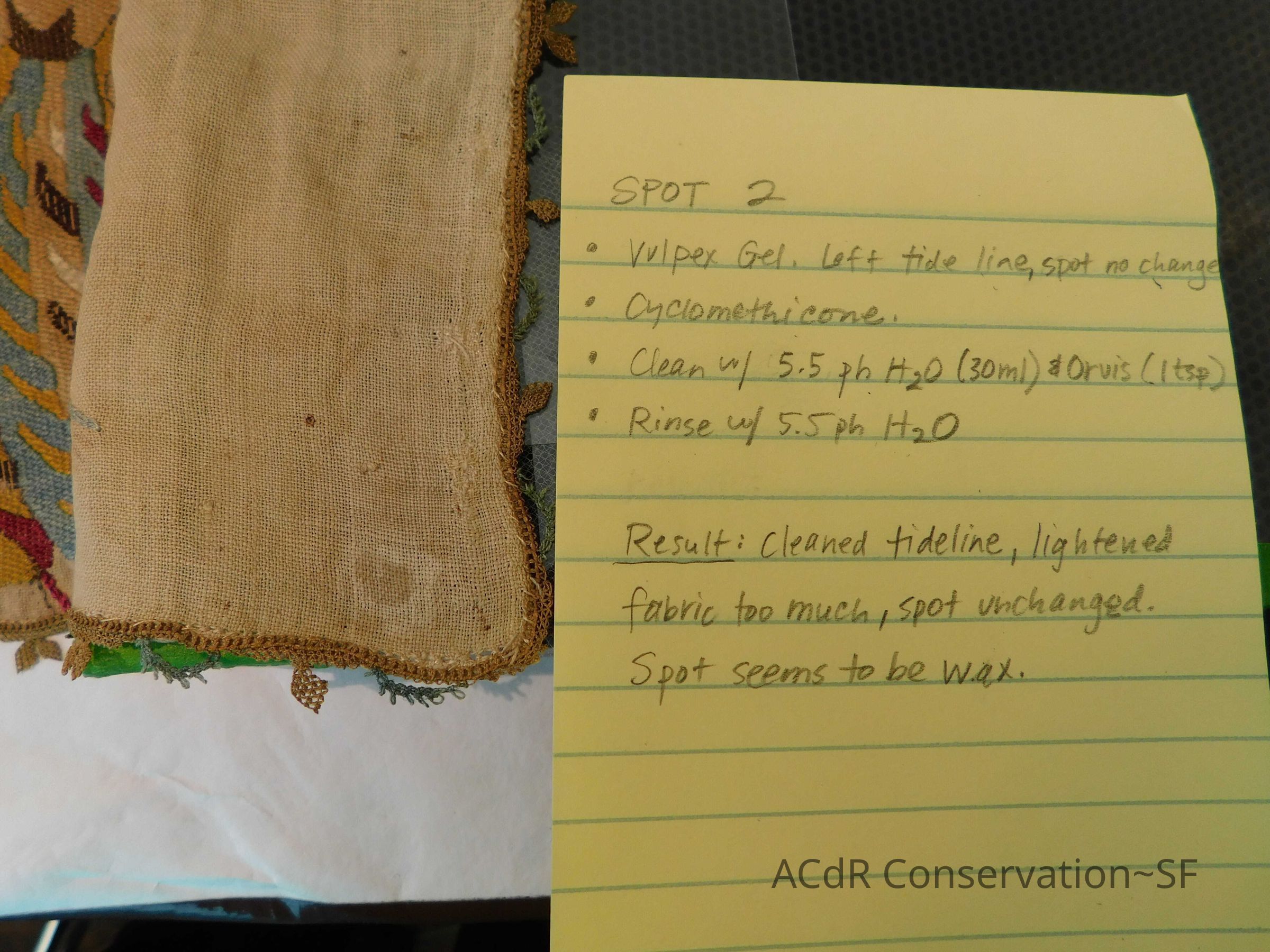 Tested stain lifting gels on textile: Tergitol, Vulpex, Triton-X. Placed gel on stain and cover with silicone release paper and weighted plex cubes. Add label for type of gel as 4% agorose with 1% surfactant. Cyclomethicone D4 on spots and tidelines. Used 5.5 pH adjusted distilled H2O, adding one each to cup macro-emulsions of surfactants (A, B, C)Spot 1: A alone: partially cleaned timeline, whitened fabric too much. Wet again with cyclomethicone (100% volatile, allows wetting the surface. Alternate cleaning - allow to dry). A w/ Orvis paste, roll on spot with small sponge. Roll spot with pH 5.5 H2O. Result: cleaned tideline, lightened spot, lightened fabric too much. Will have to tea dye cloth.Spot 2: First layer cyclomethicone. Then 30 mL pH 5.5 H2O, mixed in 1 tsp Orvis paste and rinse with H2O. Result: cleaned tideline; lightened fabric too much with spot unchanged. Spot seems to be adhesive. Tried to remove with acetone on suction platen: cyclomethicone, acetone, pH H2O.Spot 3: Cyclomethicone on platen, left to dry. 5.5 pH H2O blotted on. Result: lightened stain, caused tideline, didn’t lighten fabric.