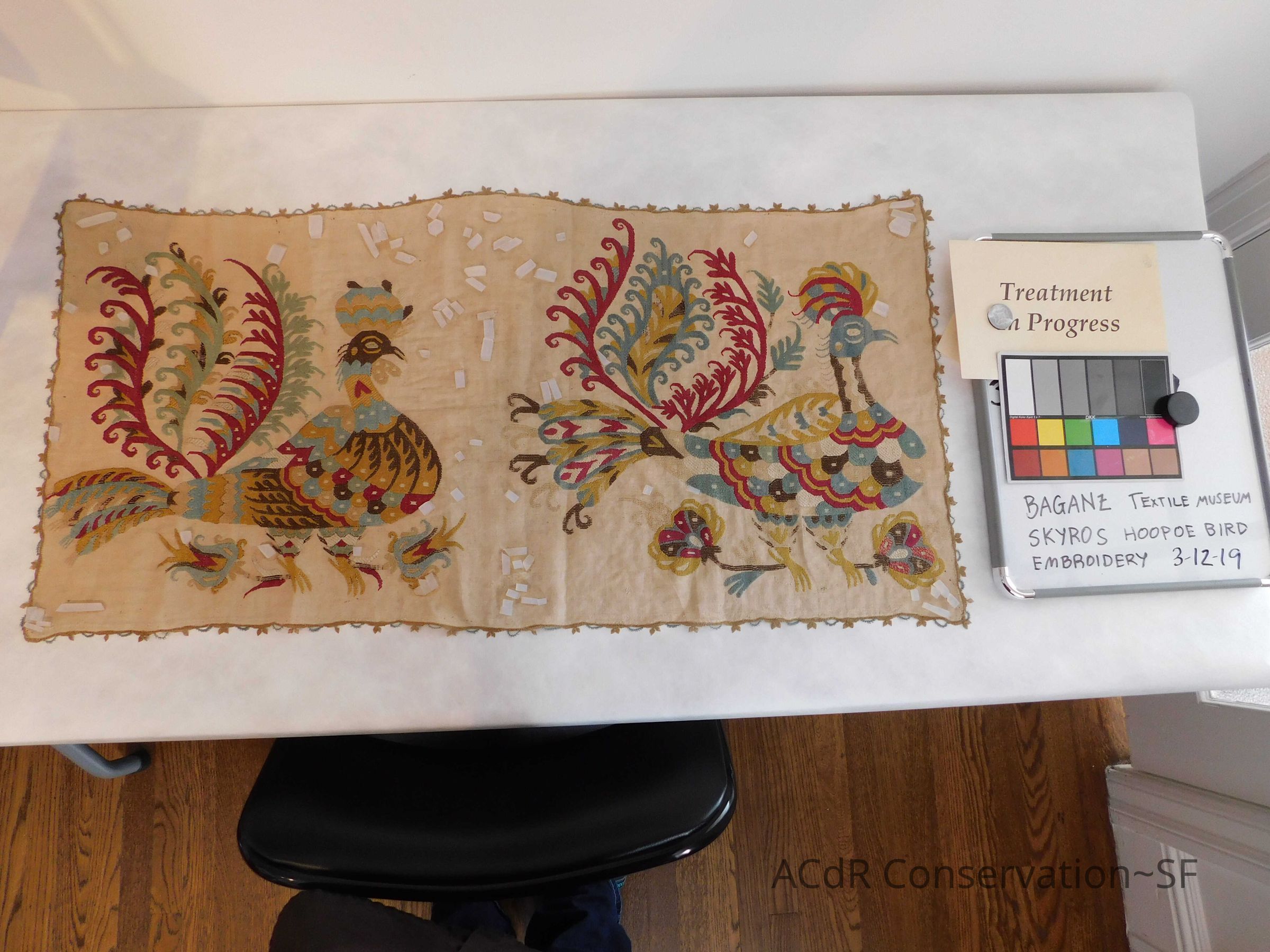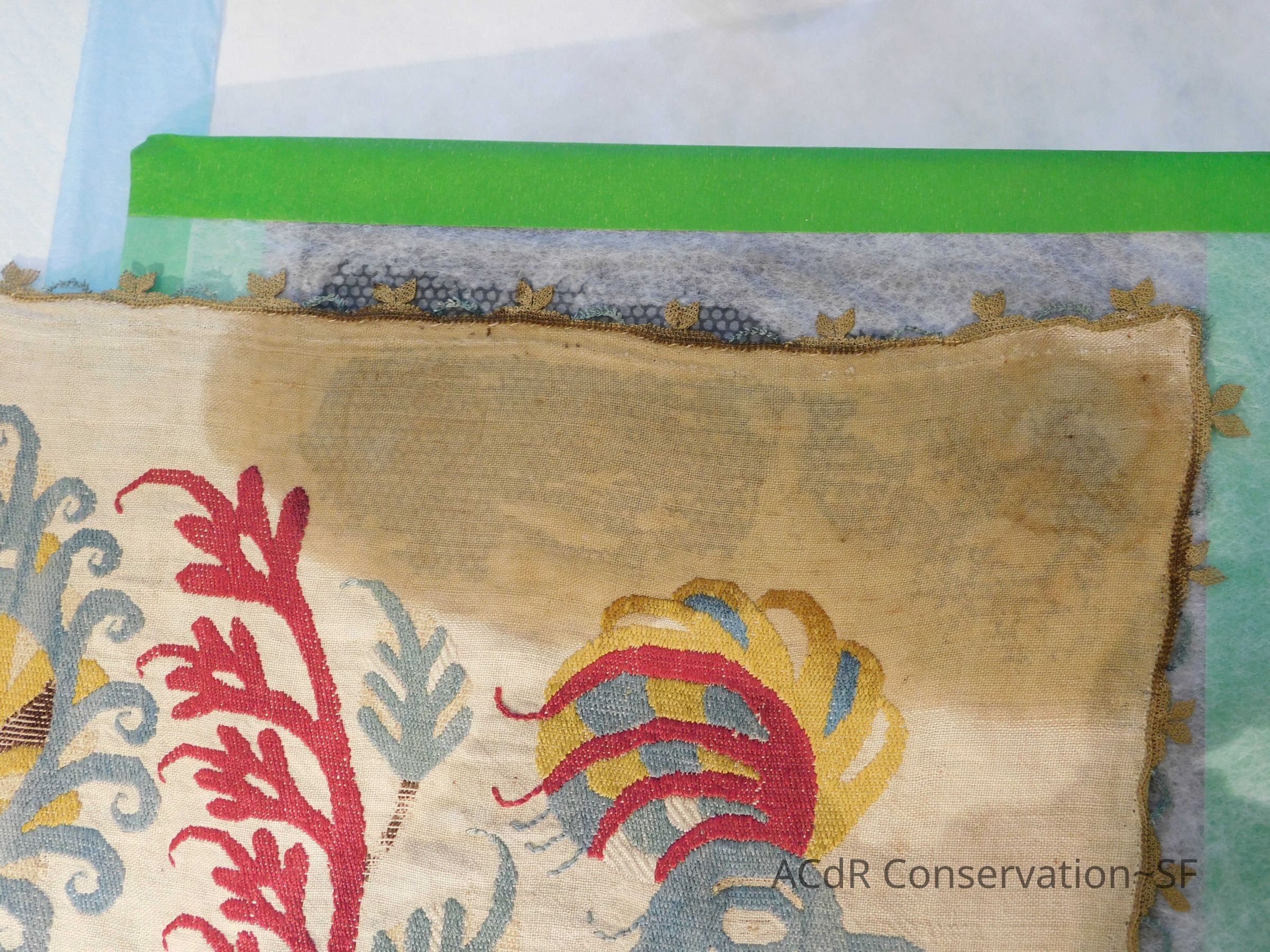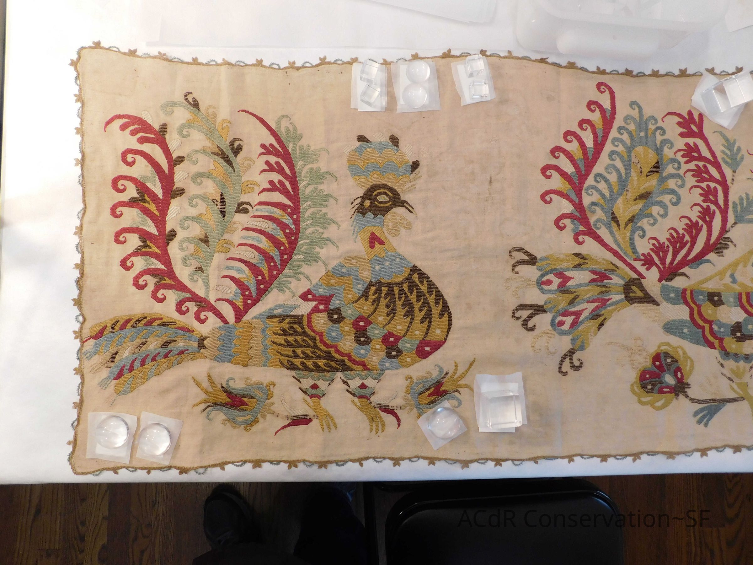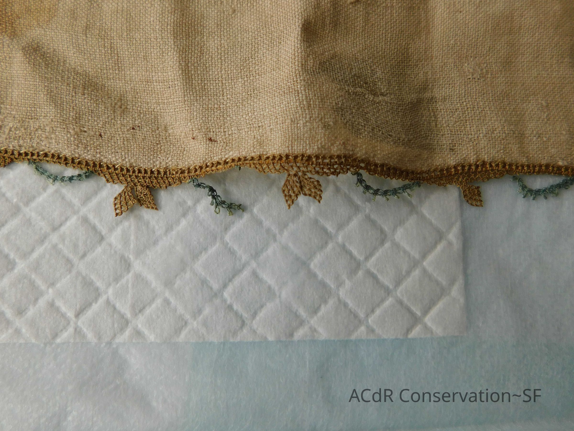 Made folder (46" x 28") with blueboard. Lined with ethafoam, taped down with remay tape. Added layer of glassine, taped down. Lastly, a layer of abaca tissue over the embroidery. Used packing tape to mount page protectors on outside with photo of object and treatment report.