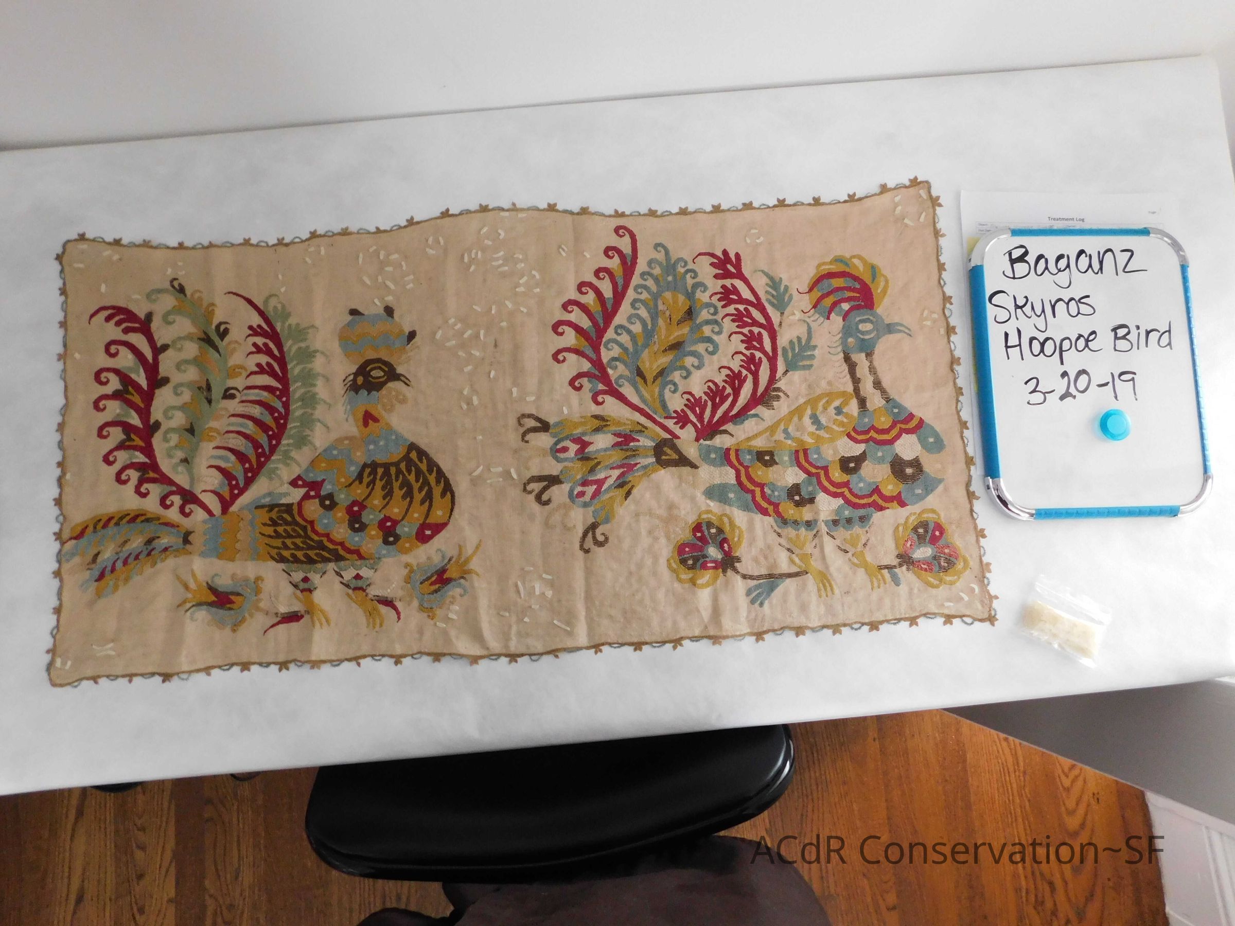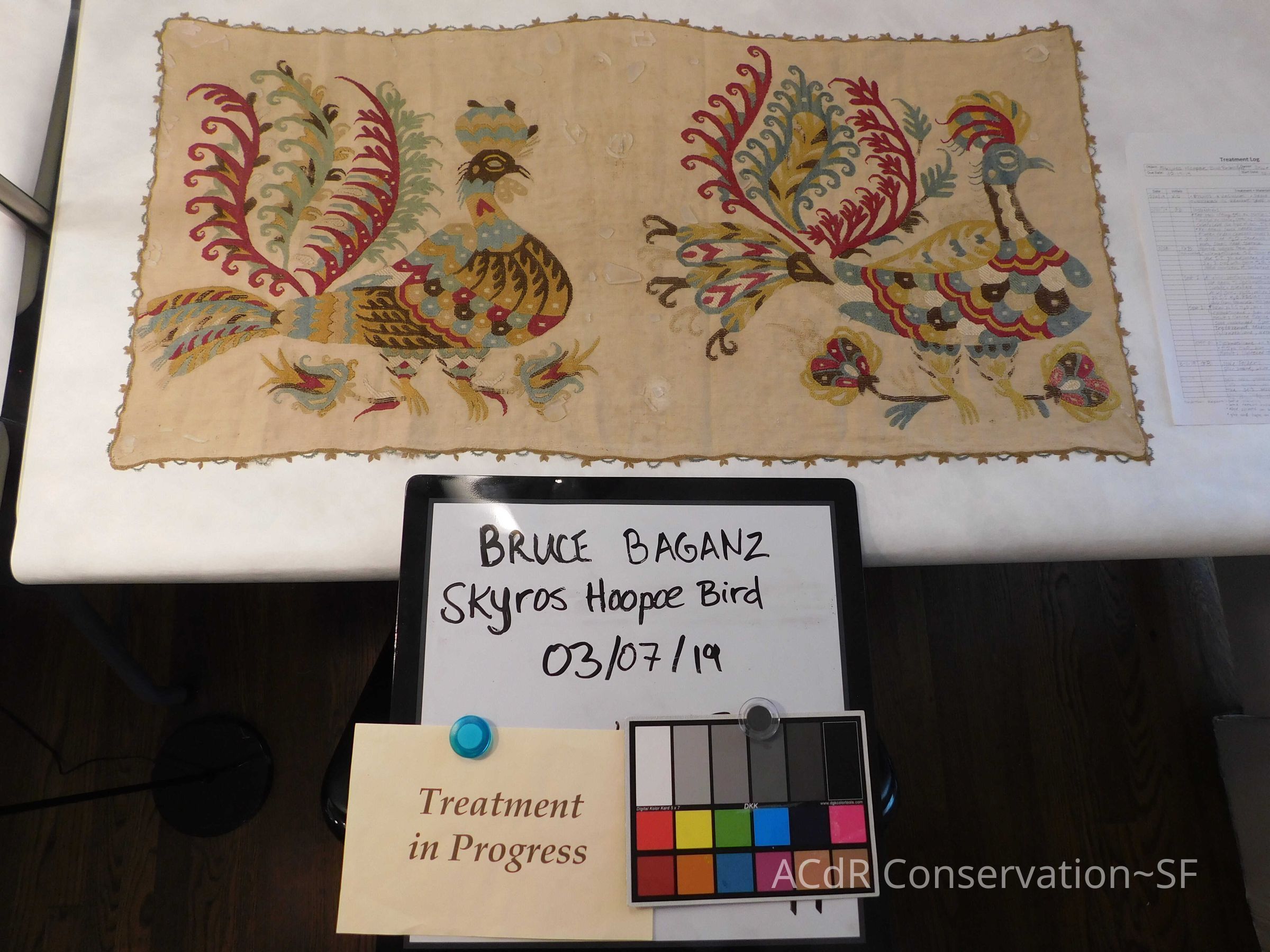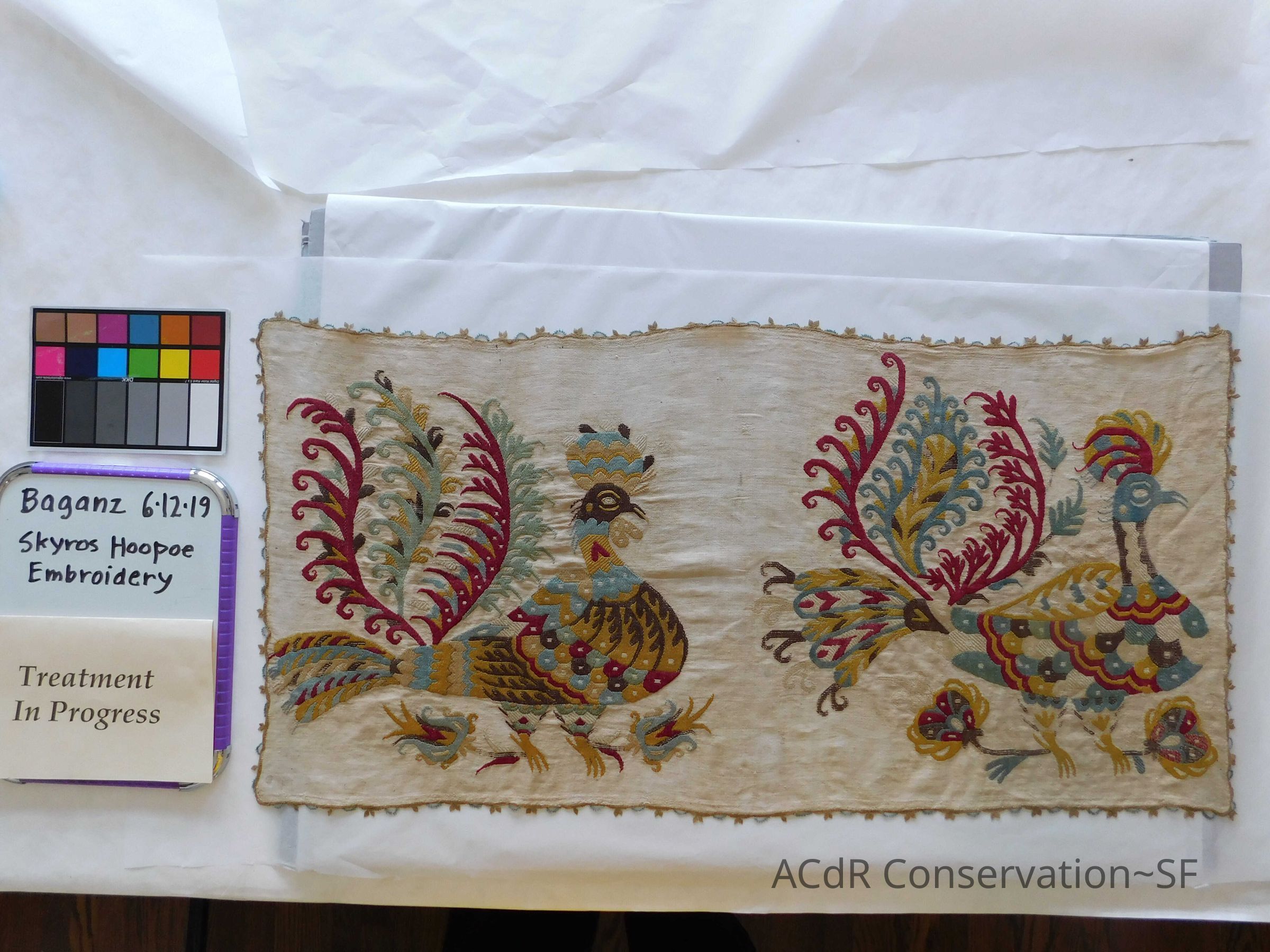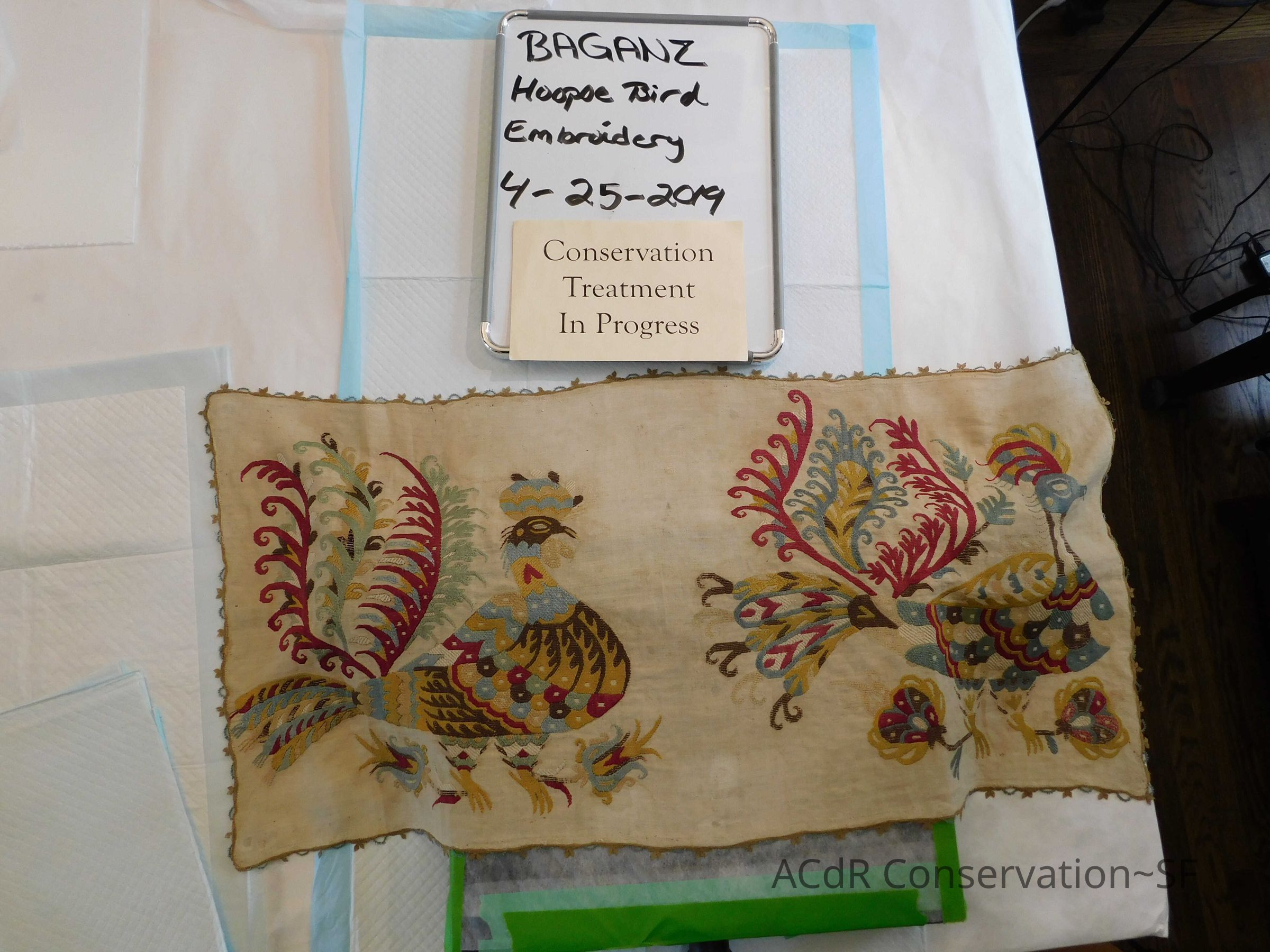 Made folder (46" x 28") with blueboard. Lined with ethafoam, taped down with remay tape. Added layer of glassine, taped down. Lastly, a layer of abaca tissue over the embroidery. Used packing tape to mount page protectors on outside with photo of object and treatment report.