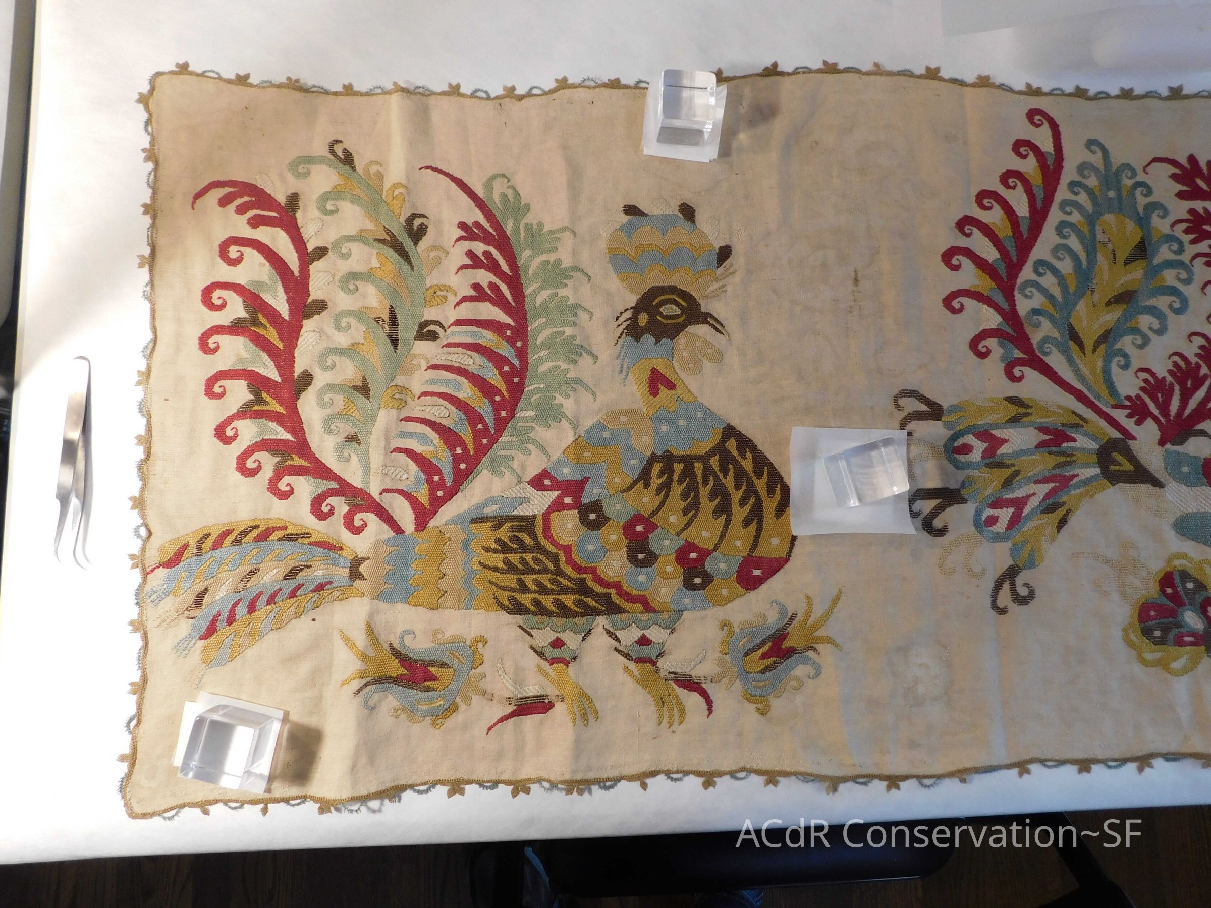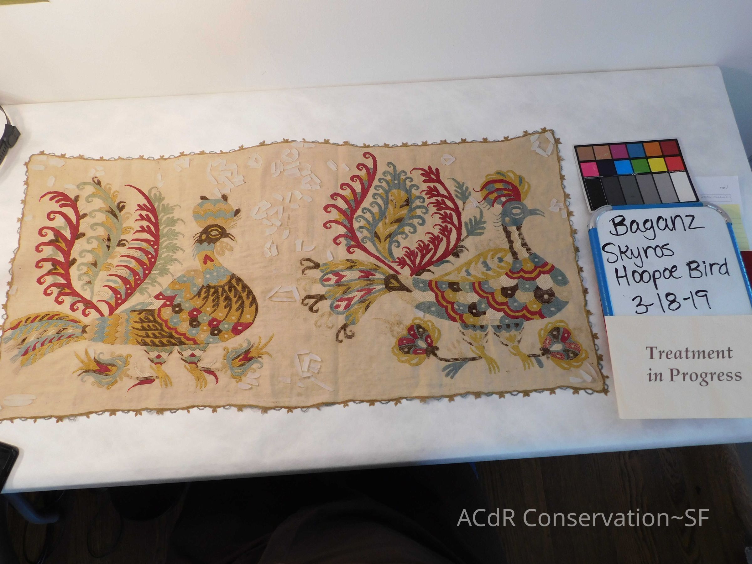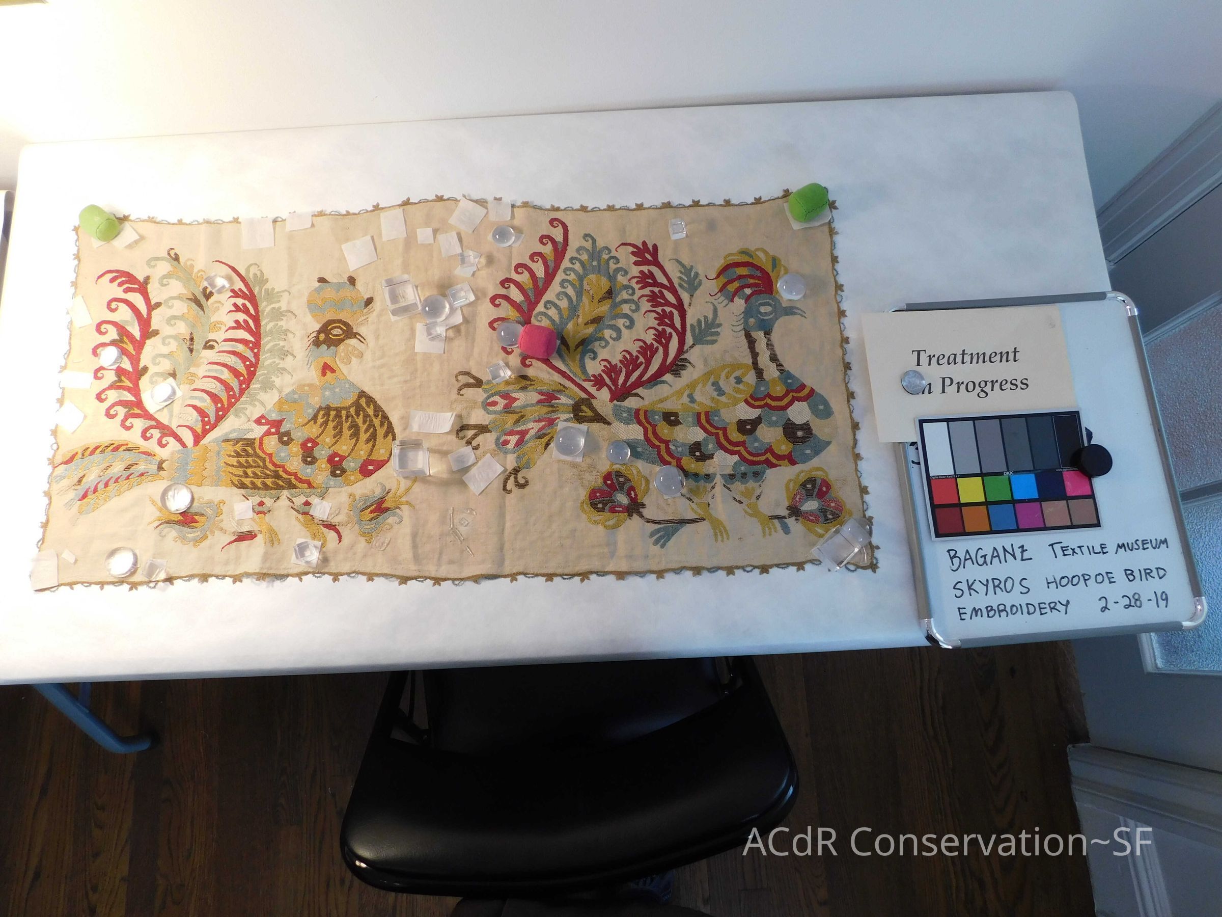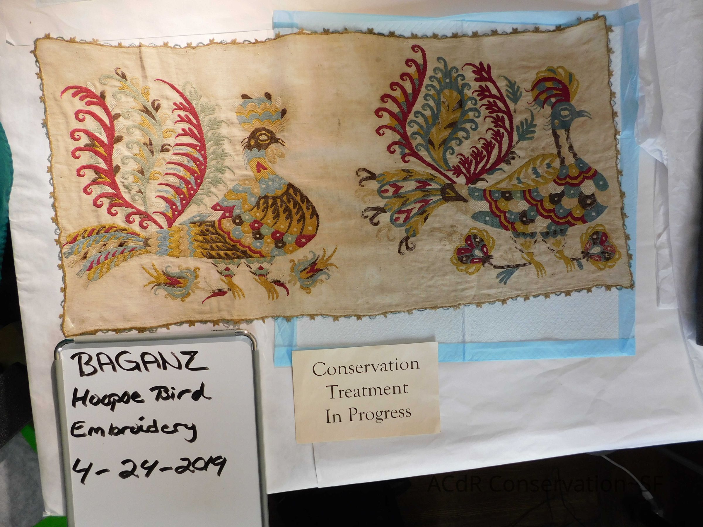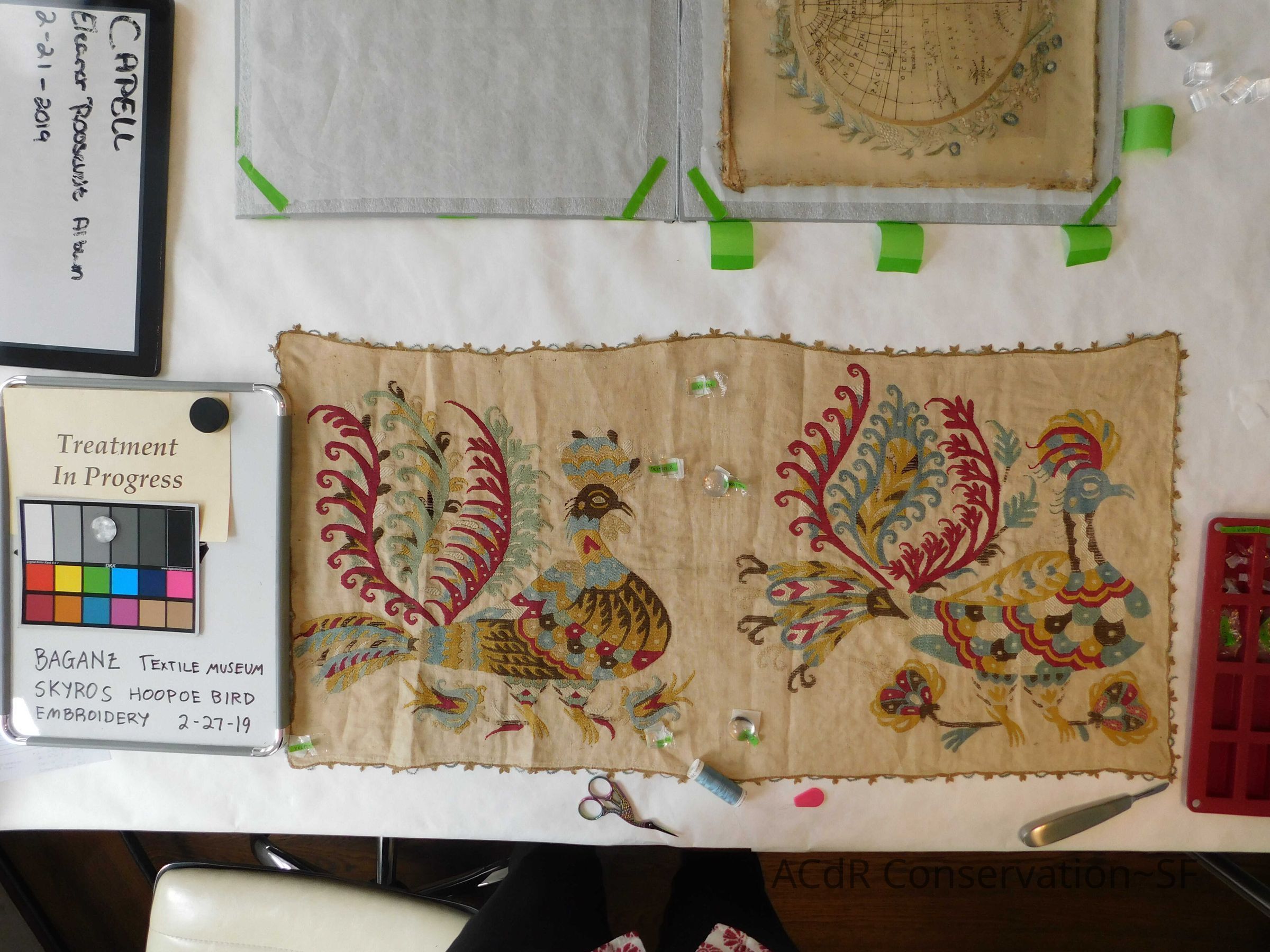 Made folder (46" x 28") with blueboard. Lined with ethafoam, taped down with remay tape. Added layer of glassine, taped down. Lastly, a layer of abaca tissue over the embroidery. Used packing tape to mount page protectors on outside with photo of object and treatment report.