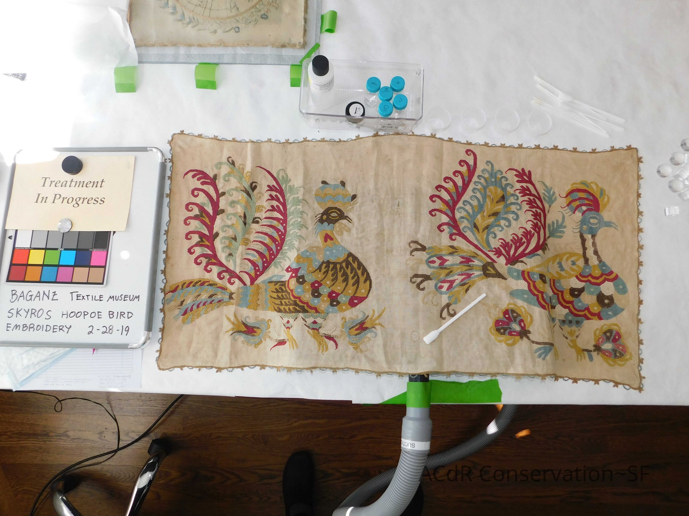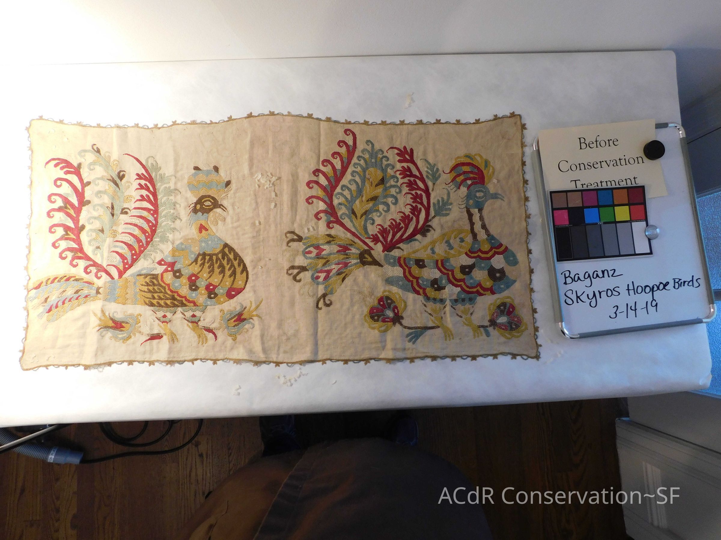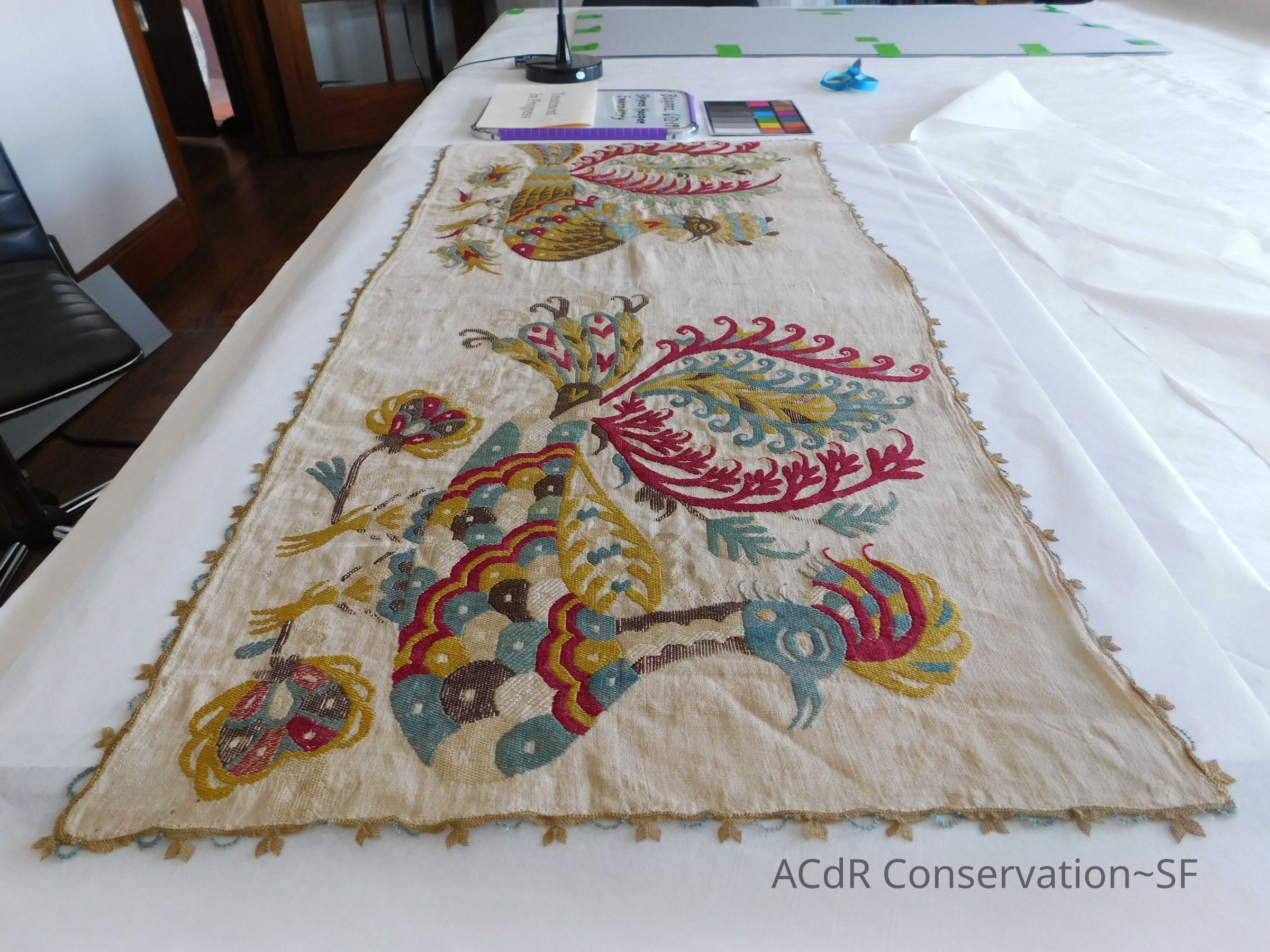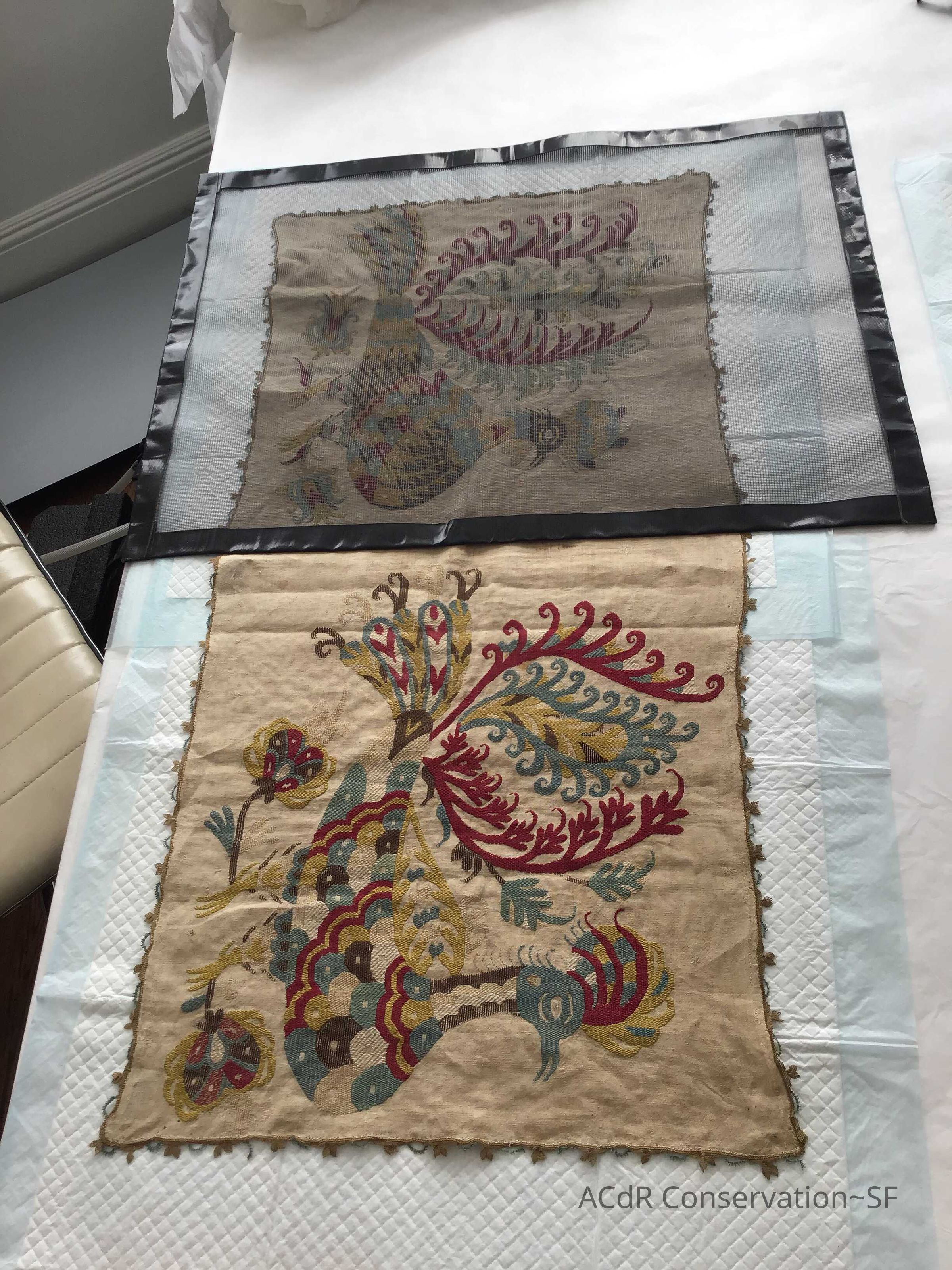Made folder (46" x 28") with blueboard. Lined with ethafoam, taped down with remay tape. Added layer of glassine, taped down. Lastly, a layer of abaca tissue over the embroidery. Used packing tape to mount page protectors on outside with photo of object and treatment report.