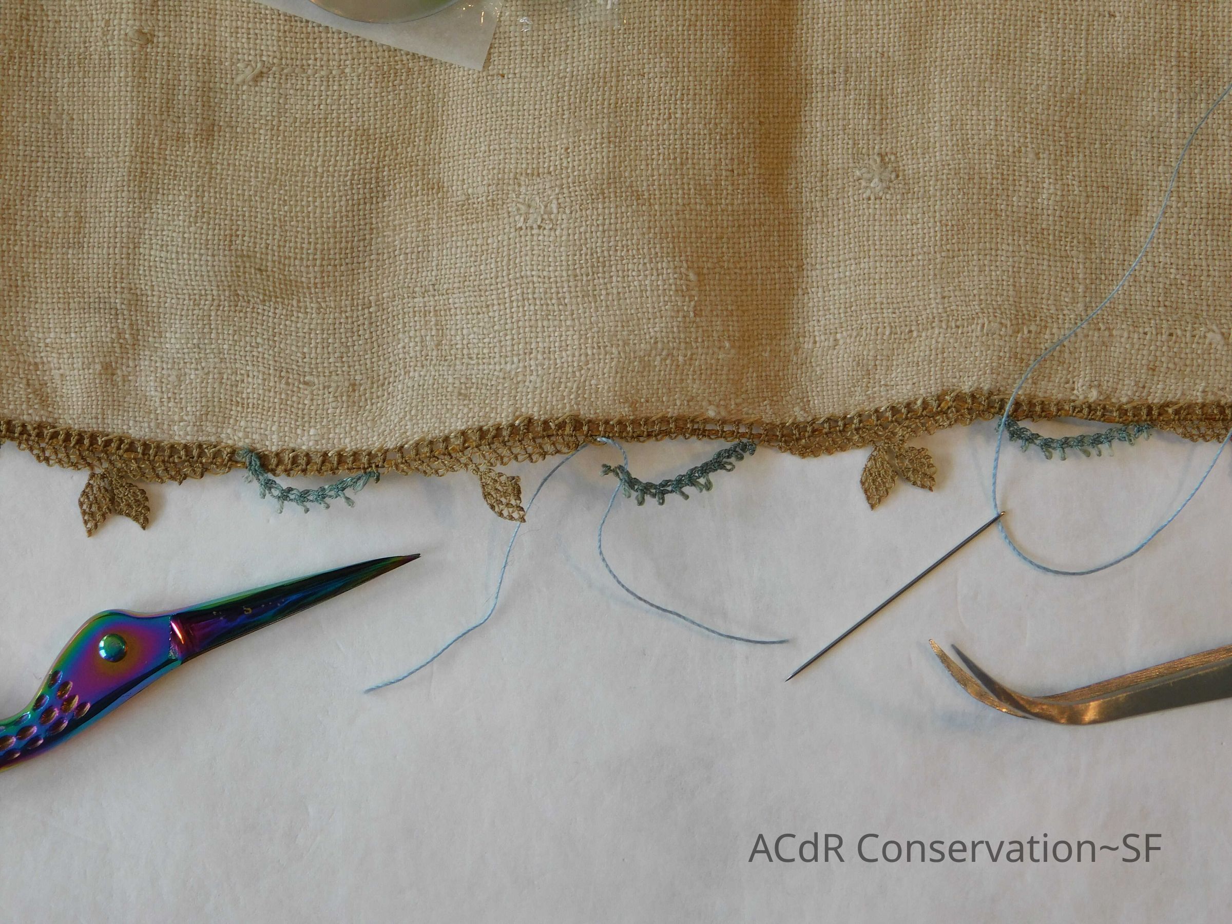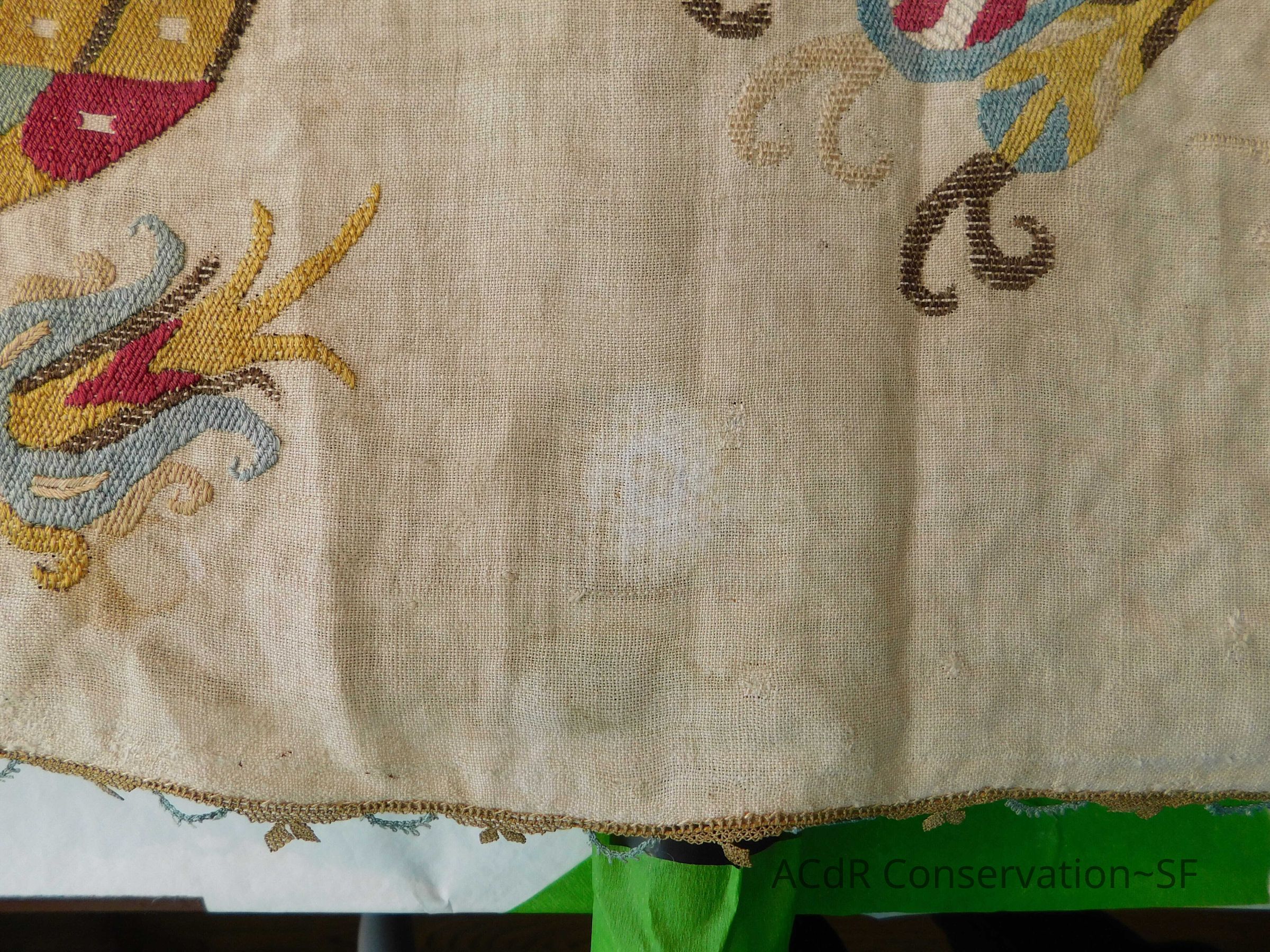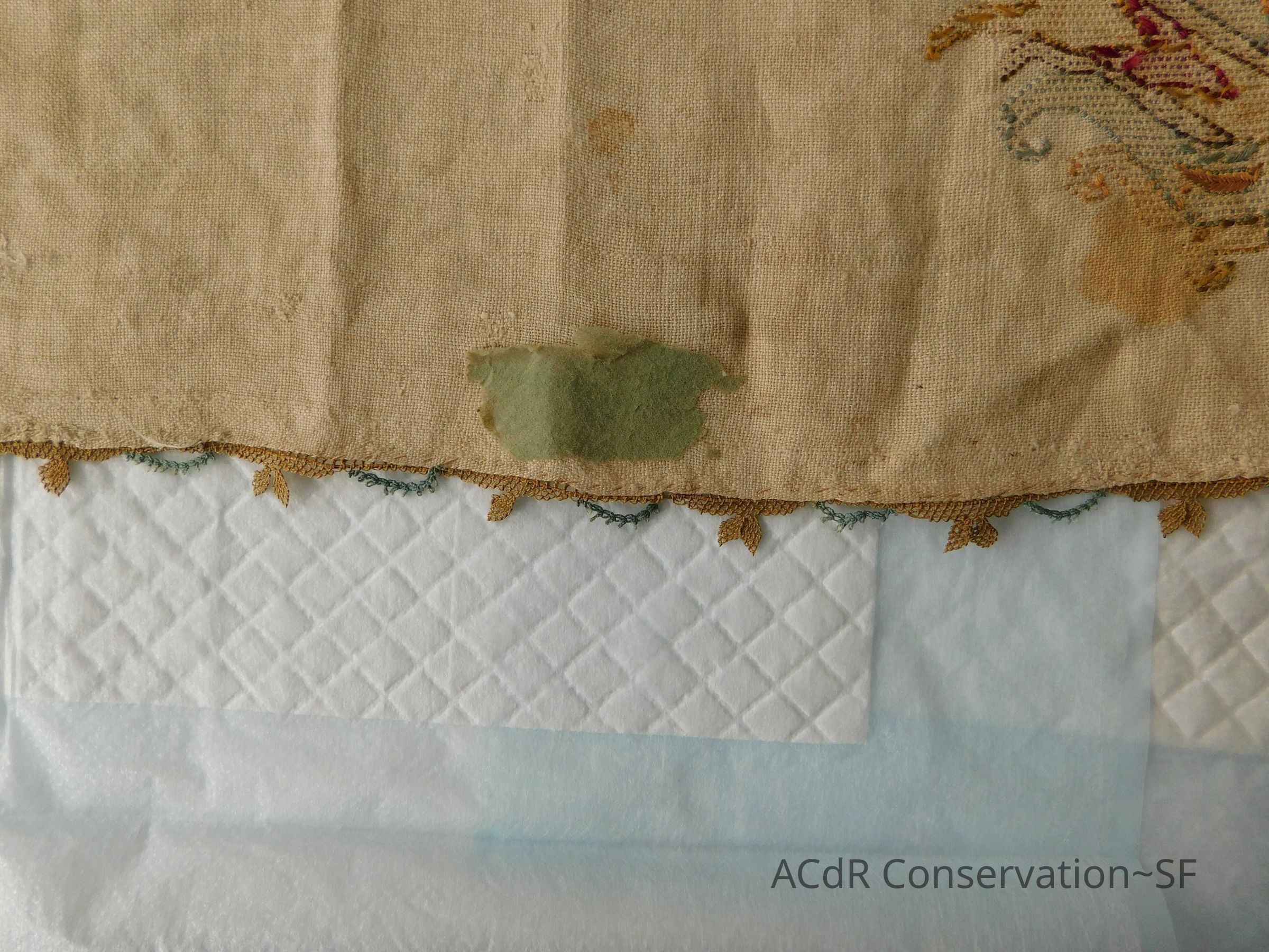 Pressed out undulations and wrinkles, using three layers of blue board covered with four layers of tissue. Pressed using tacking iron or heat spatula in smaller areas, around not directly on embroidery. Slightly dampened small piece of Pellon by spraying with distilled water. Saturated and squeezed out excess. Use a layer of tissue above and below Pellon. Removed damp Pellon after pressing one time to avoid over-wetting textile. Continued pressing with tissue. Used smallsponge brush to dampen small areas between embroidery.