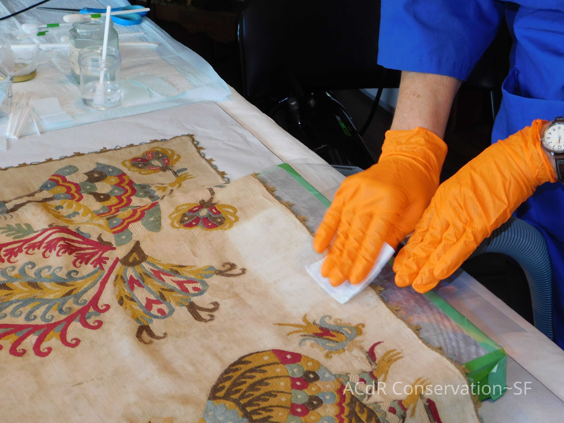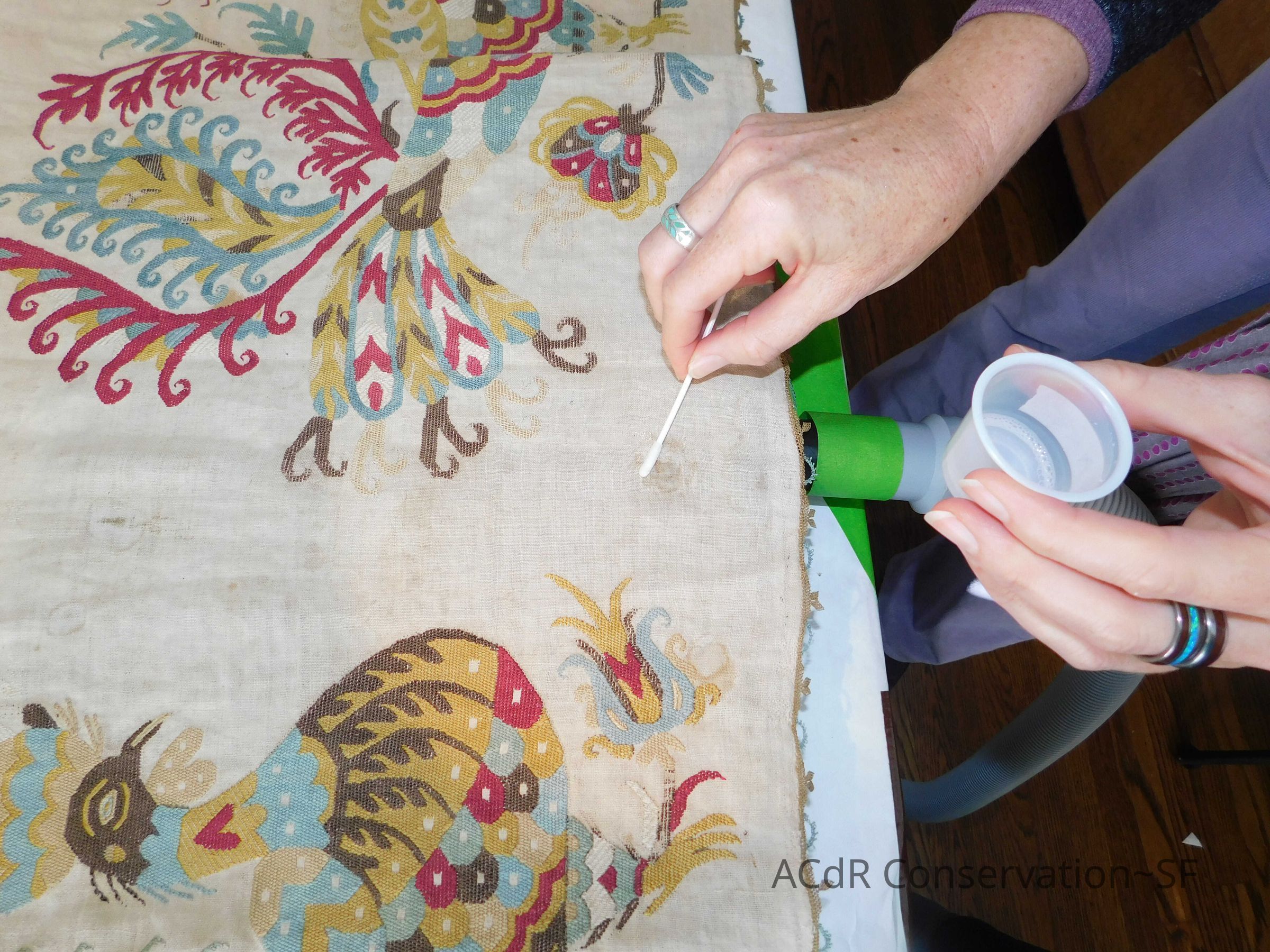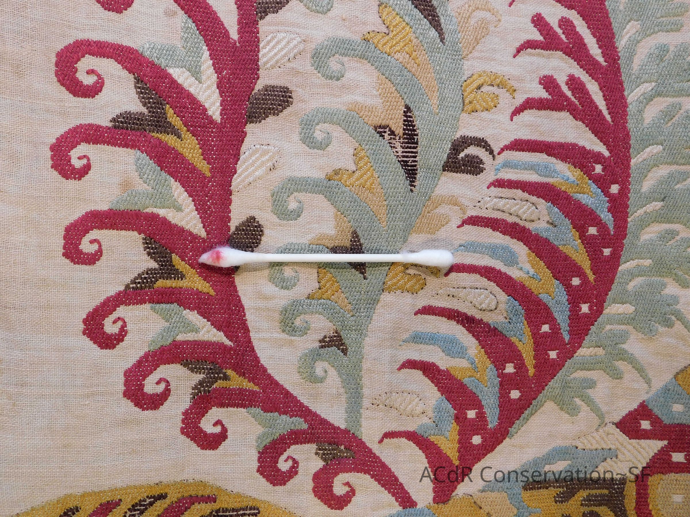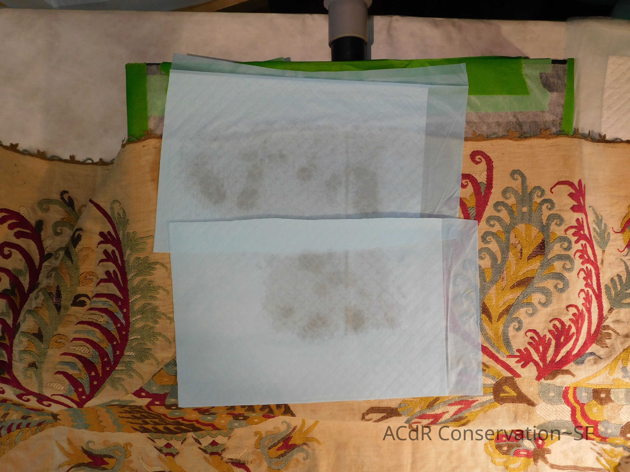 Cleaned textile with cyclomethicone and sponge brush using cleaning solution: 50ml dist. H20 / 2g chlor. T 3-20 / 0.5g bleach gel / 1g. orvus paste / 1 oz isopropyl 90% / 0.5 oz hydrogen peroxide. Dabbed with sponge brush, blotted with absorbent pad, dabbed again with cyclomethicone ( to remove cleaning solution).