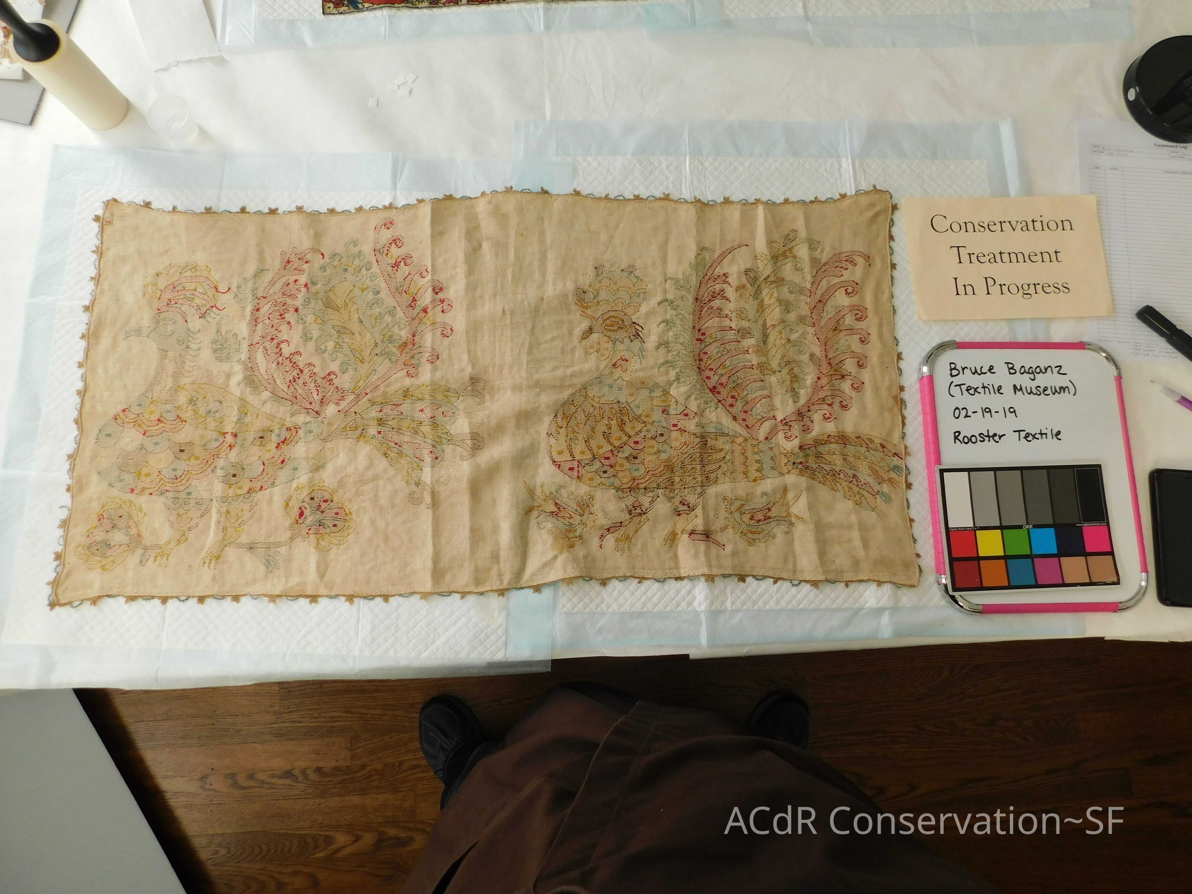 Cut 2 sheets of thicker blueboard to mount textile. Centered textile on board and taped bottom edge with remay tape, then pulled fabric taught to tape top edge. Trimmed corners to mitered edge. Taped sides and pulled taught. Taped corners. Photographed.