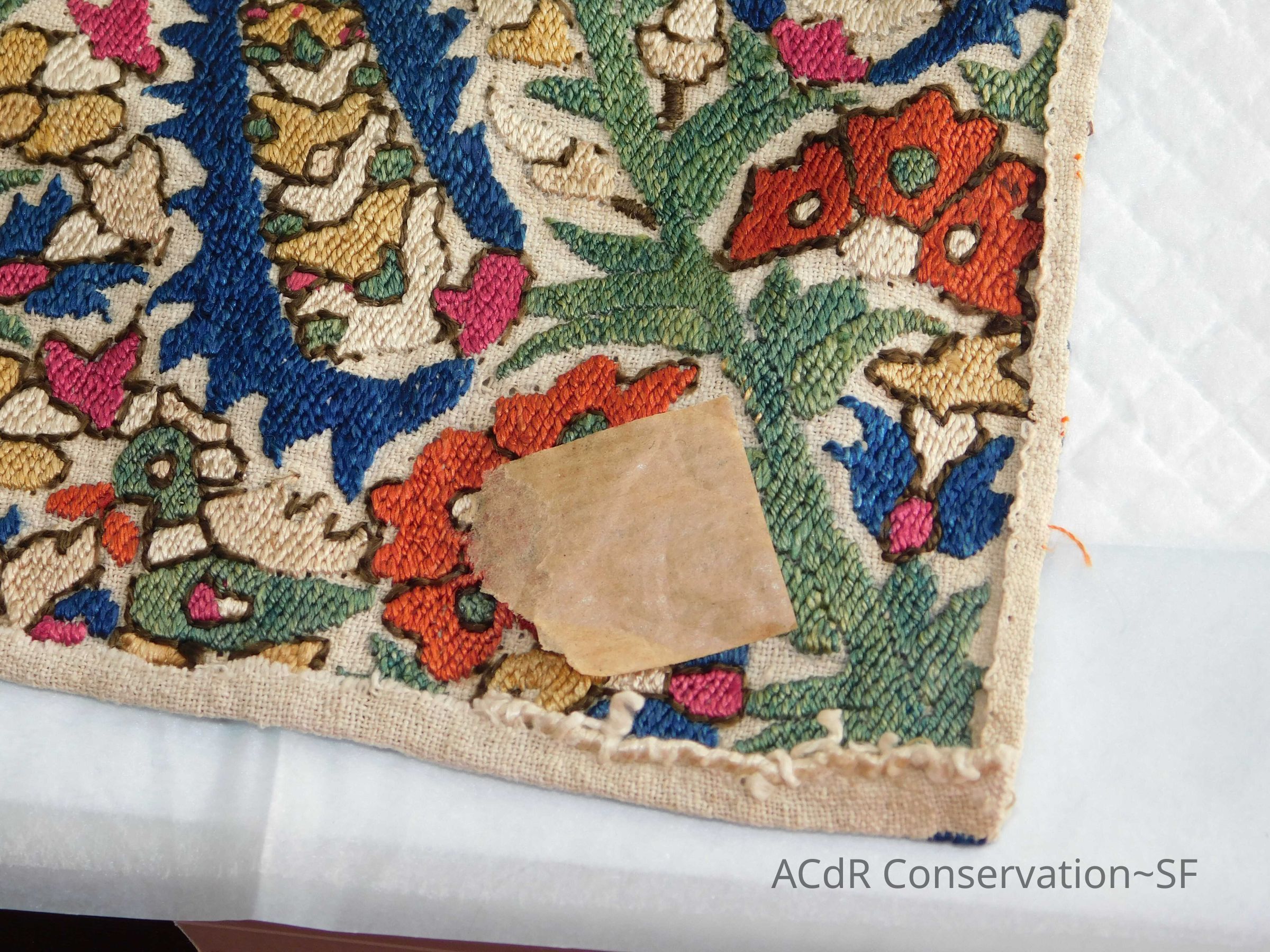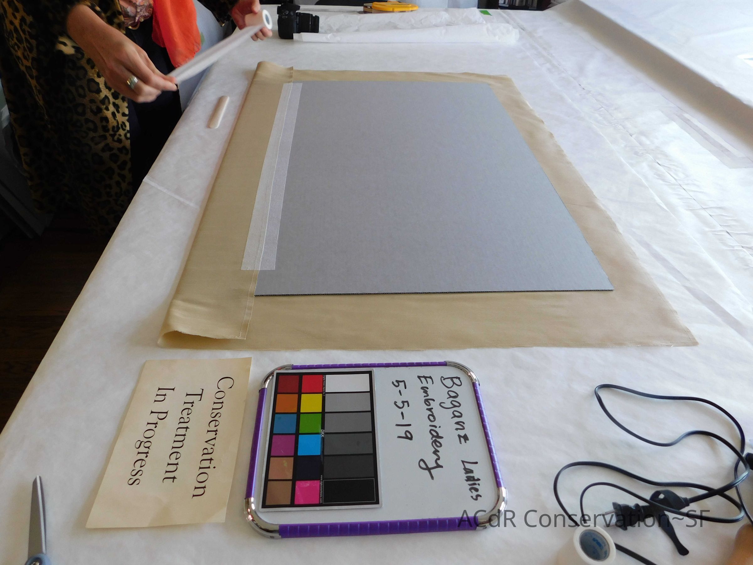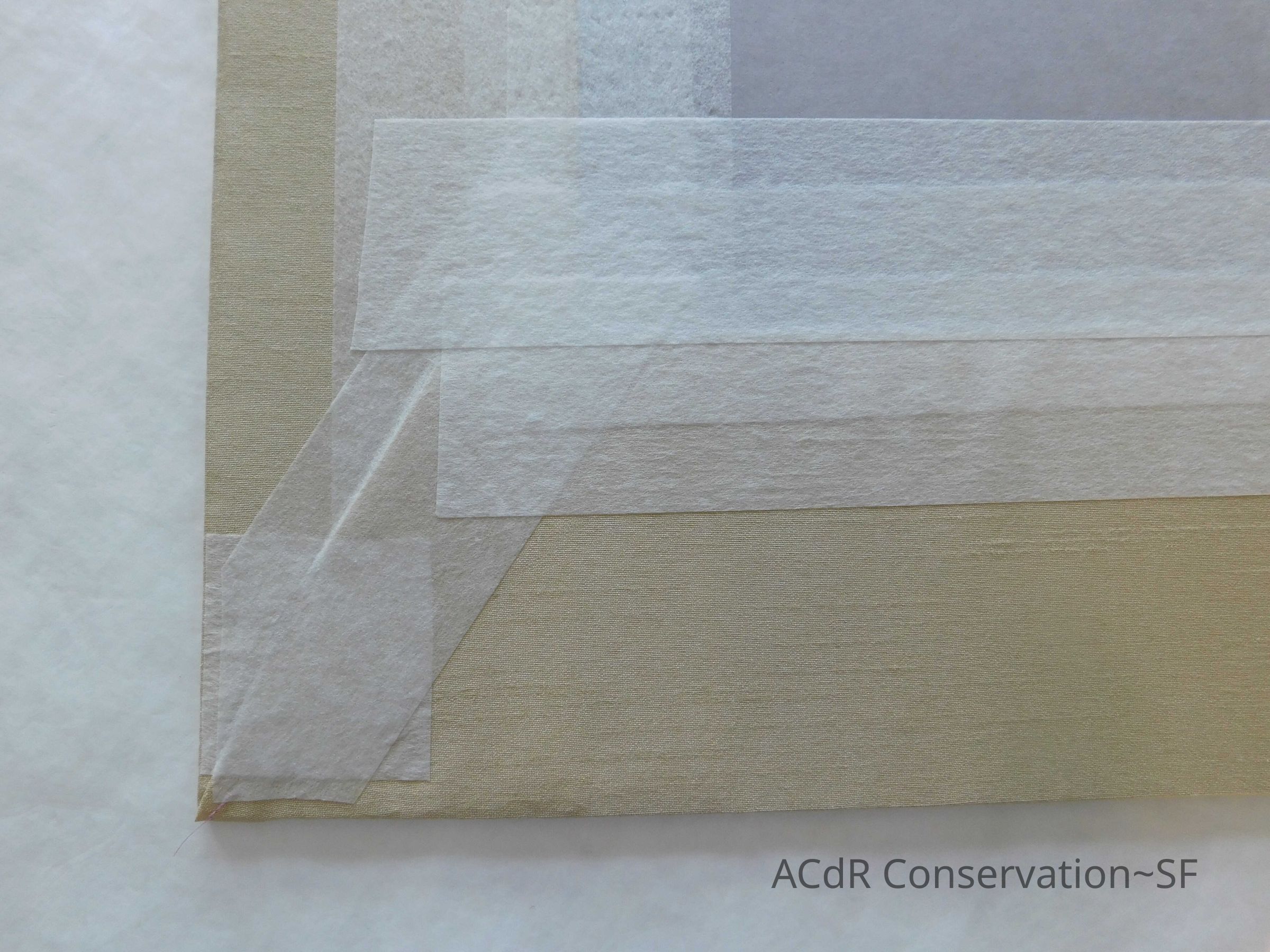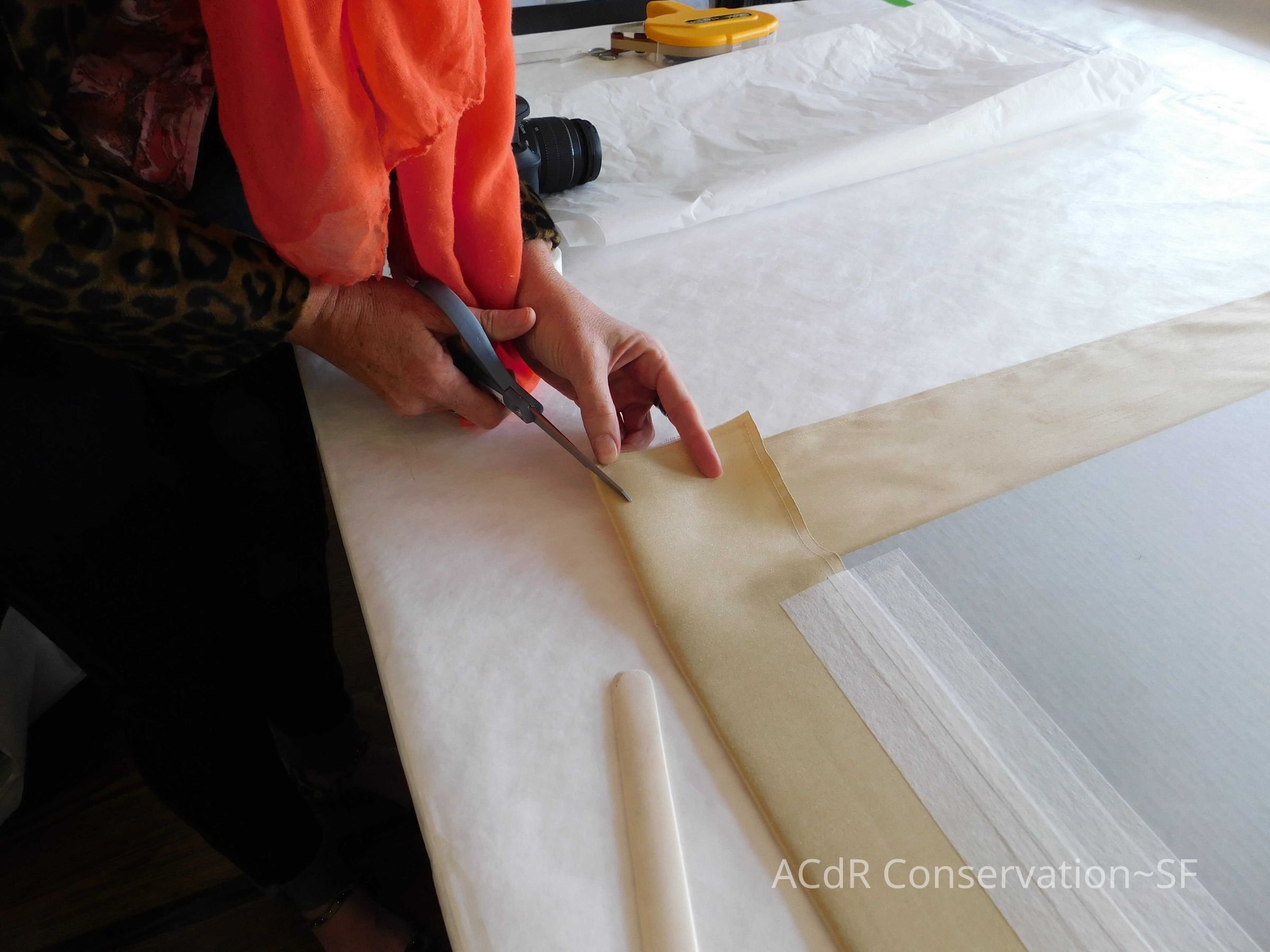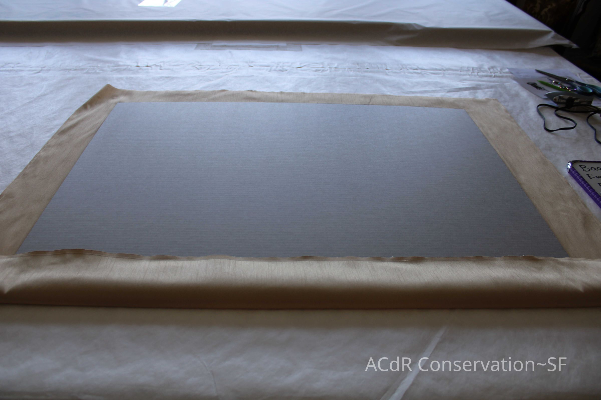 Mounted textile with lining to blue board using thick "S" blue board. Added 3" to top/sides, 4" to bottom so board size equaled 35 1/4" W x 27" H. Pressed miter in place with tacking iron on low. Held in place with remay tape. Taped edges in place, pulling lining taught. Used three layers of tape, offset and overlapped.