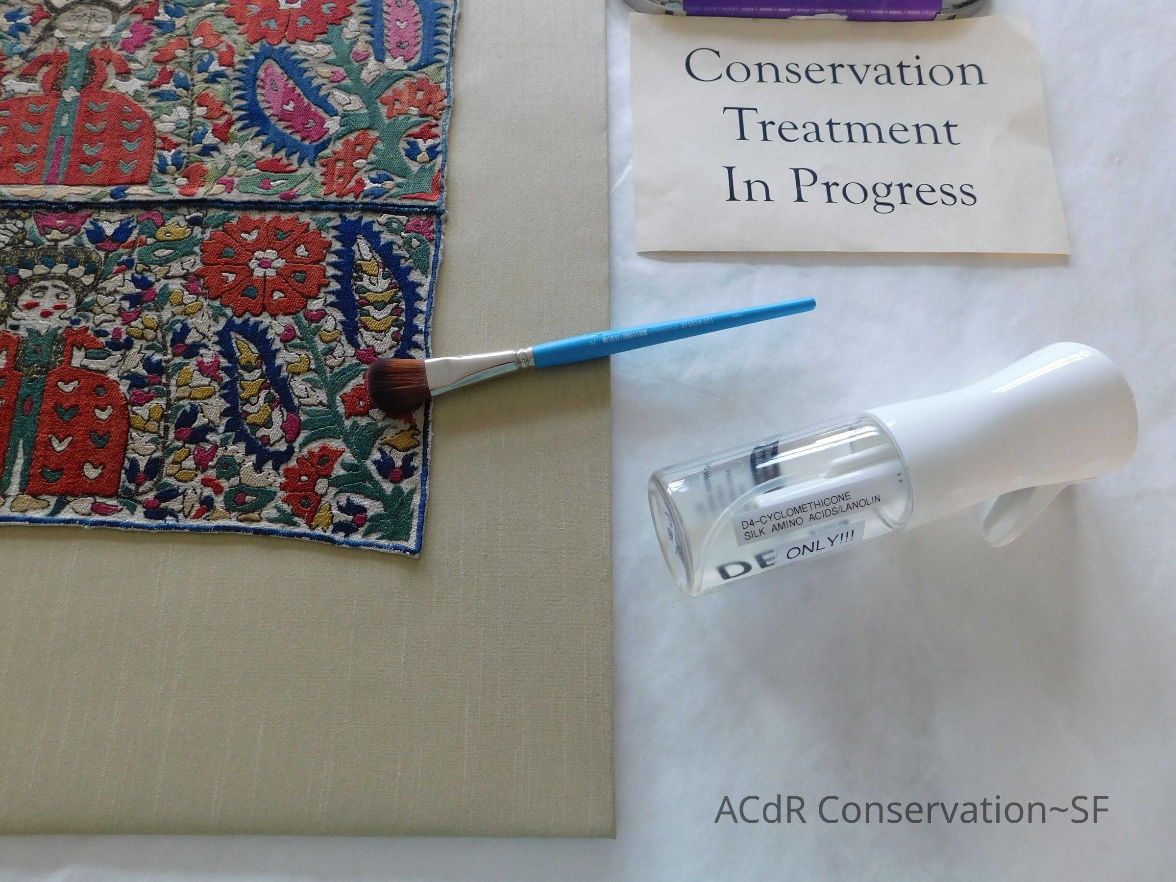 Conditioned textile with D4 mixture (Cyclomethicone/silk/amino acids/lanolin). Sprayed onto large soft brush and brushed textile gently and thoroughly.
