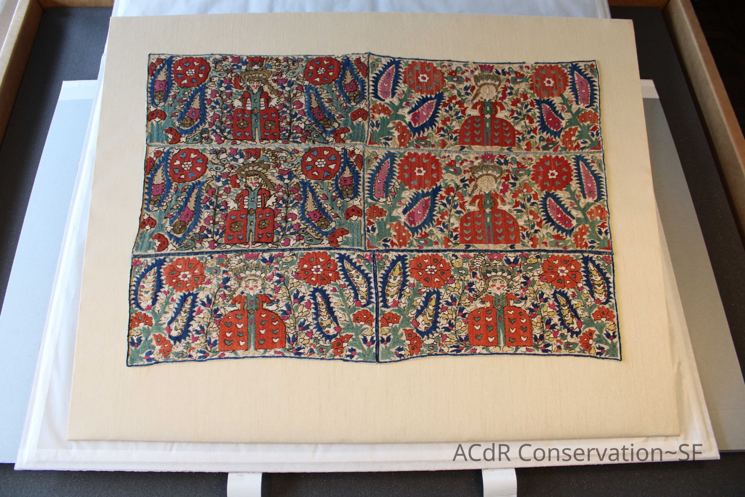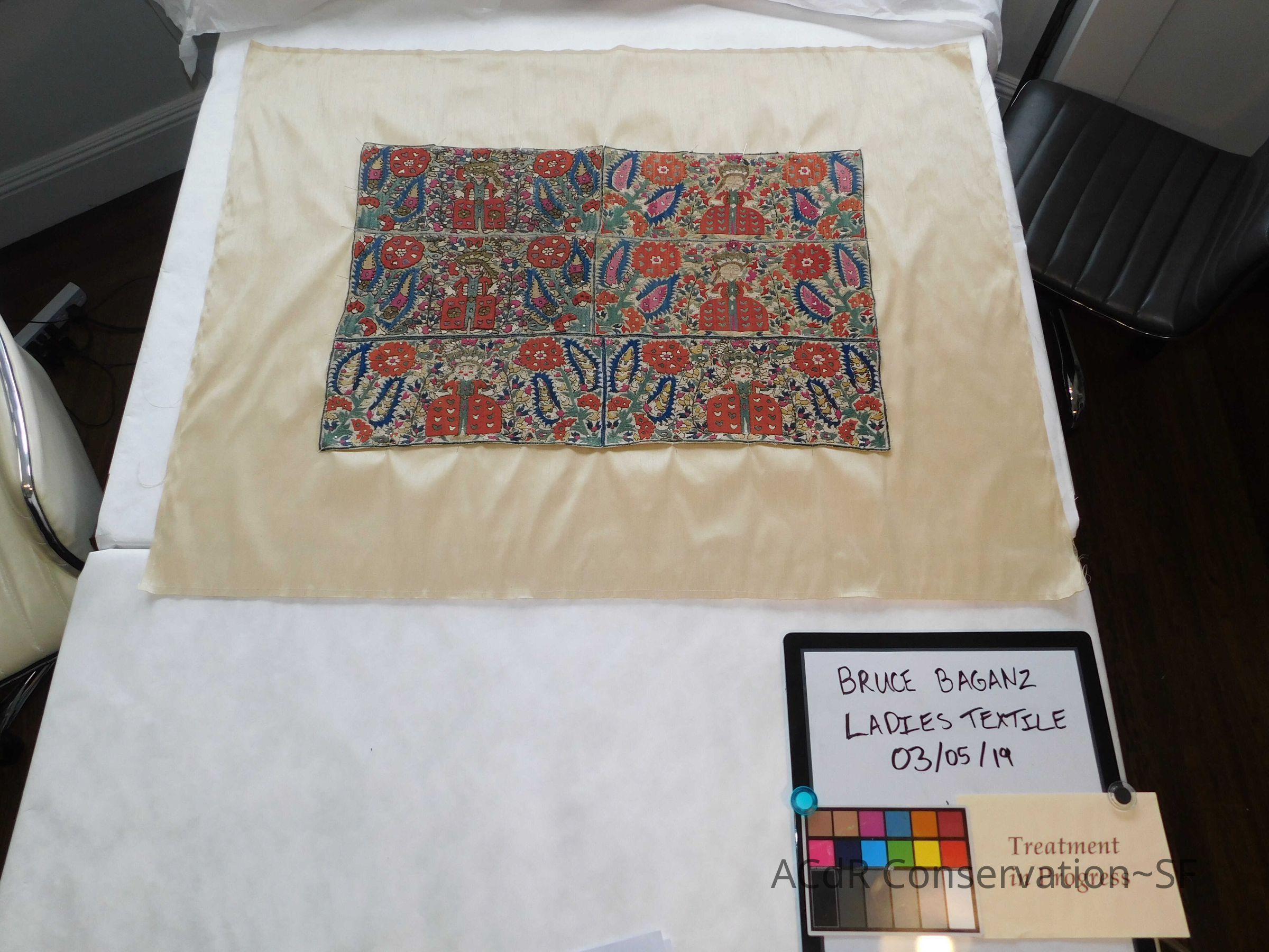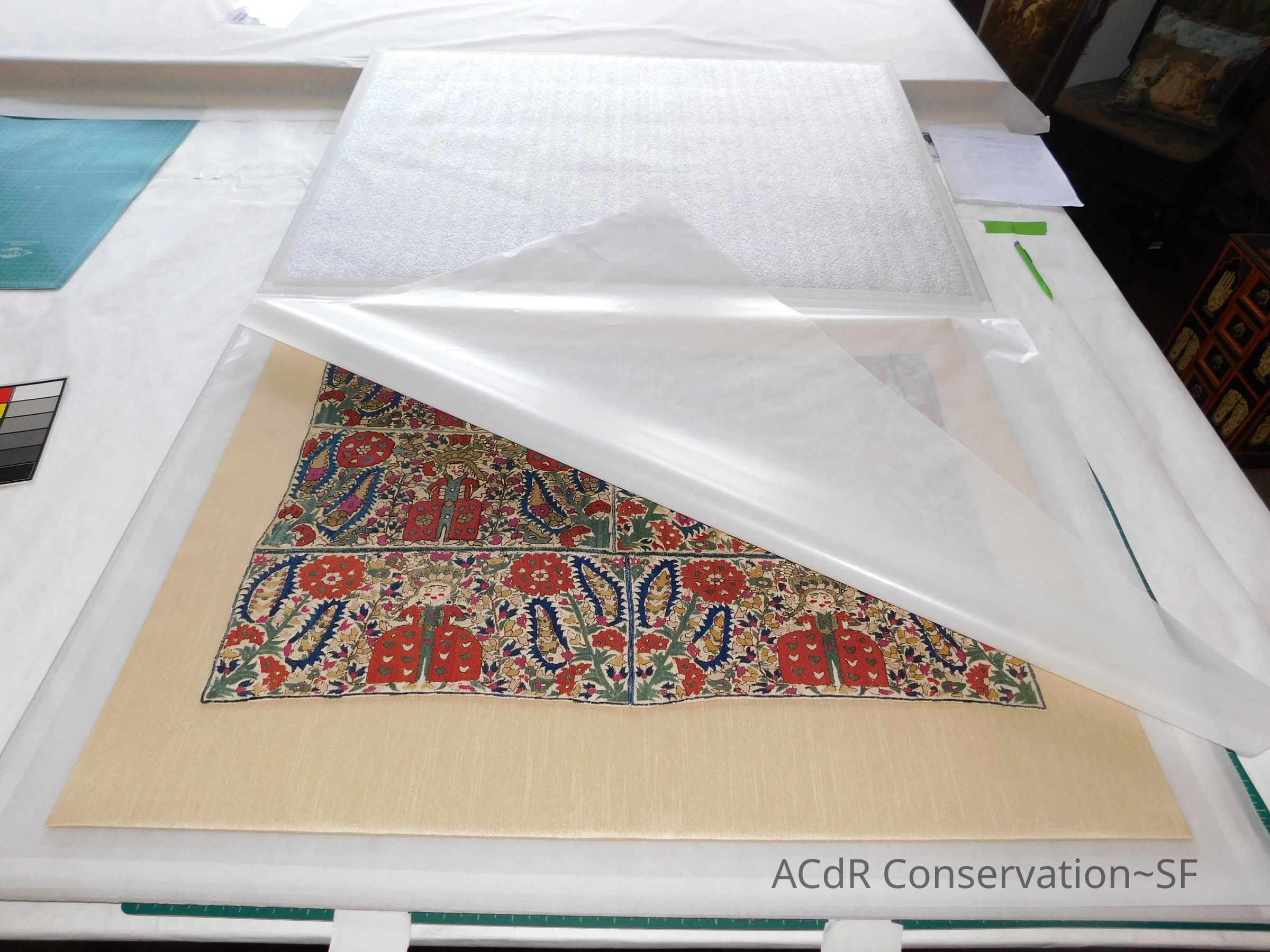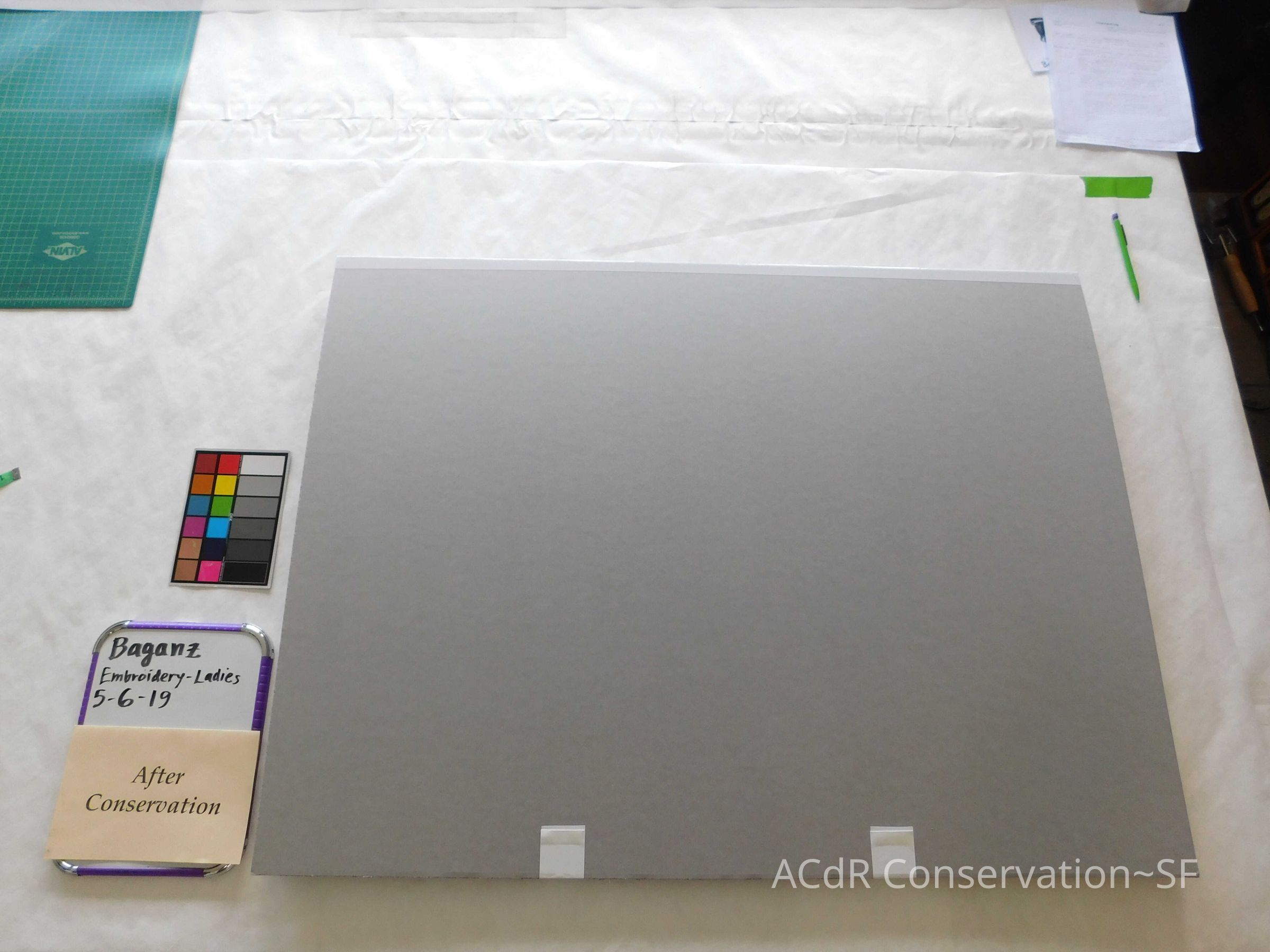 Made a storage folder, 4 in. longer and wider than mounted textile (39" x 31"). Blueboard hinged with white duct tape inside & out. Lined with ethafoam taped in place with remay. Folded a layer of glassine opposite to the side with hinge and closed folder with two duct tape fasteners. Photo documented and created 2 mylar sleeves for exterior.