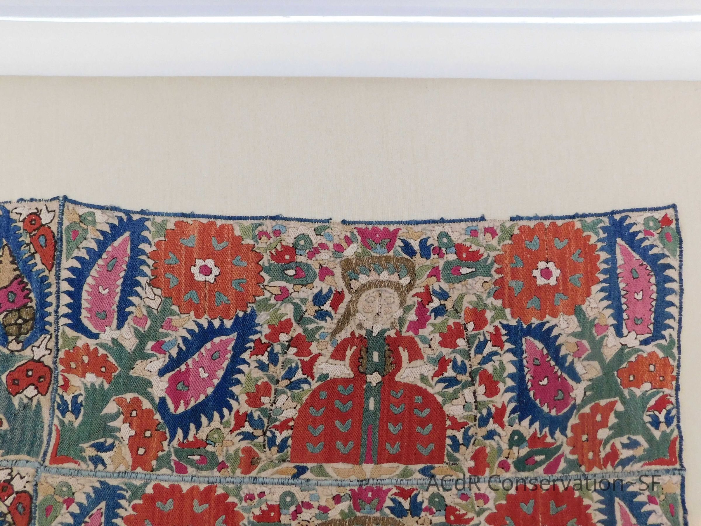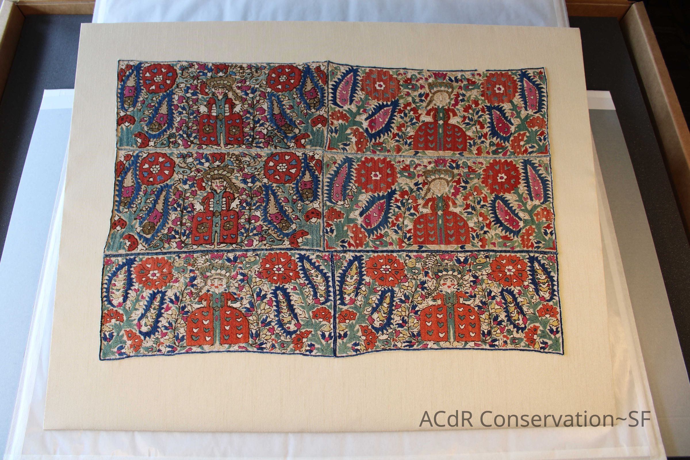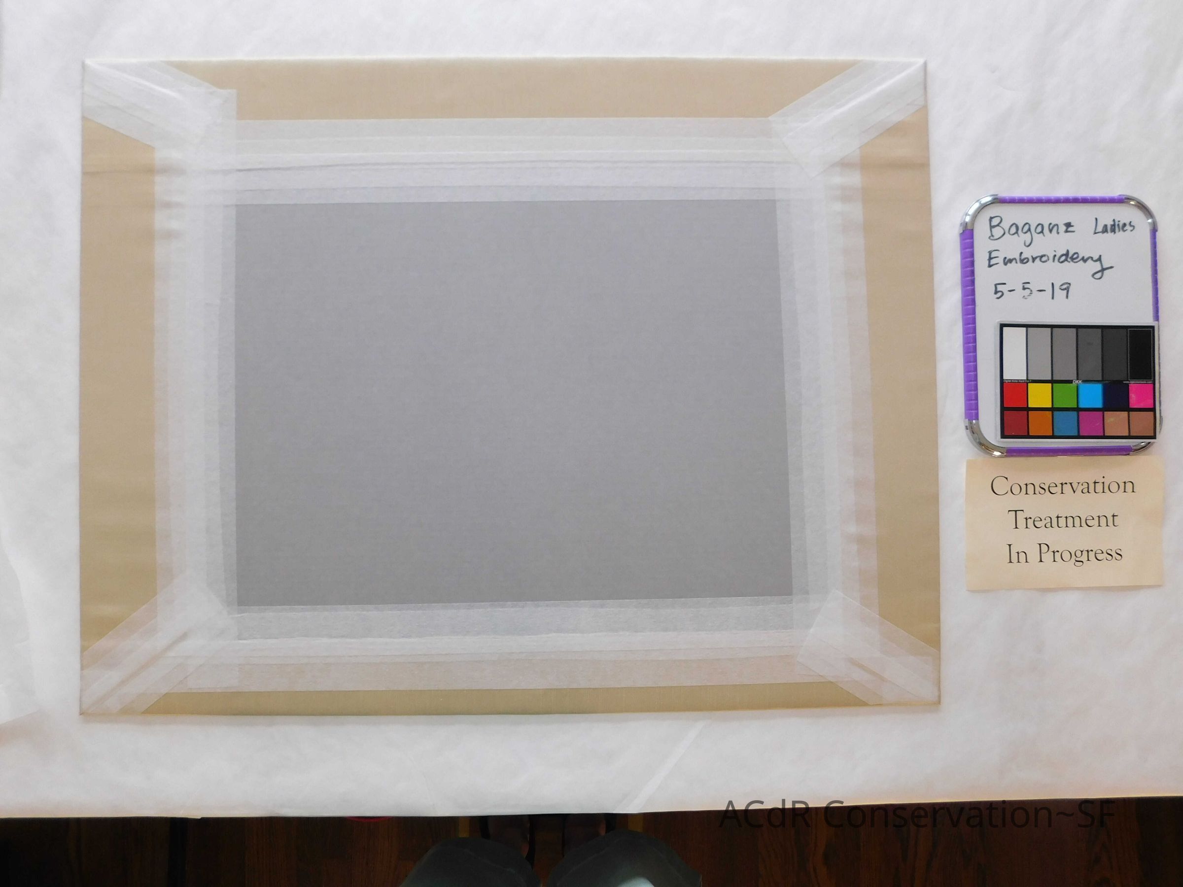 Made a storage folder, 4 in. longer and wider than mounted textile (39" x 31"). Blueboard hinged with white duct tape inside & out. Lined with ethafoam taped in place with remay. Folded a layer of glassine opposite to the side with hinge and closed folder with two duct tape fasteners. Photo documented and created 2 mylar sleeves for exterior.