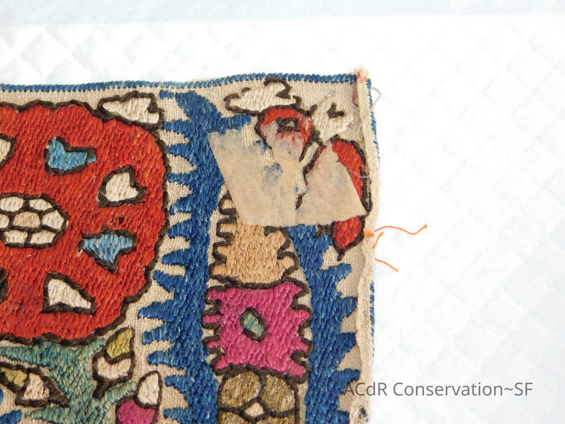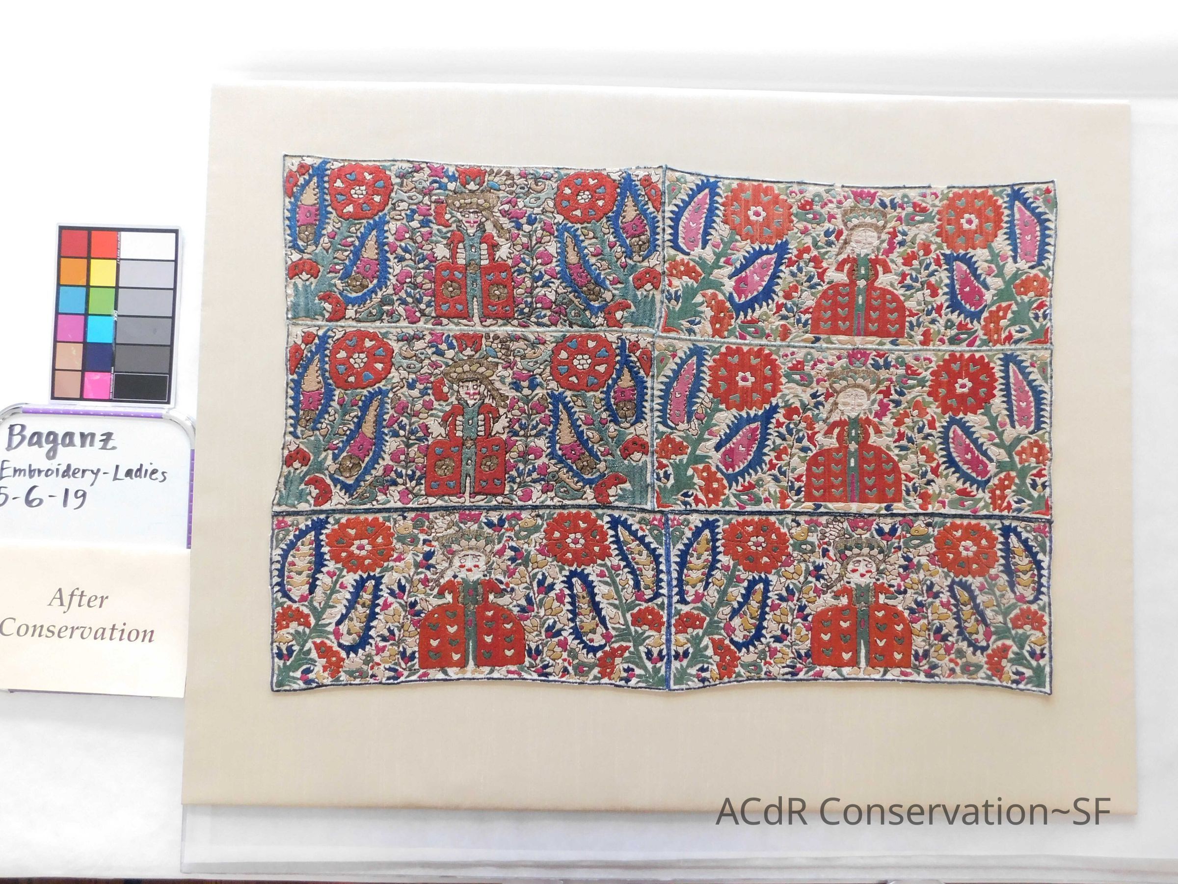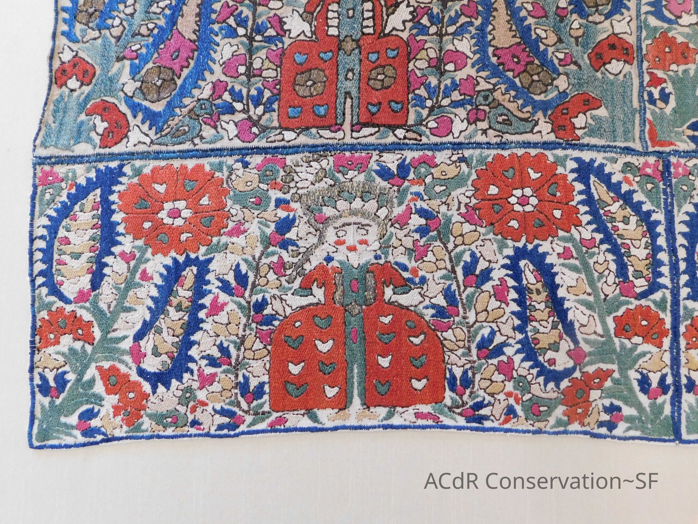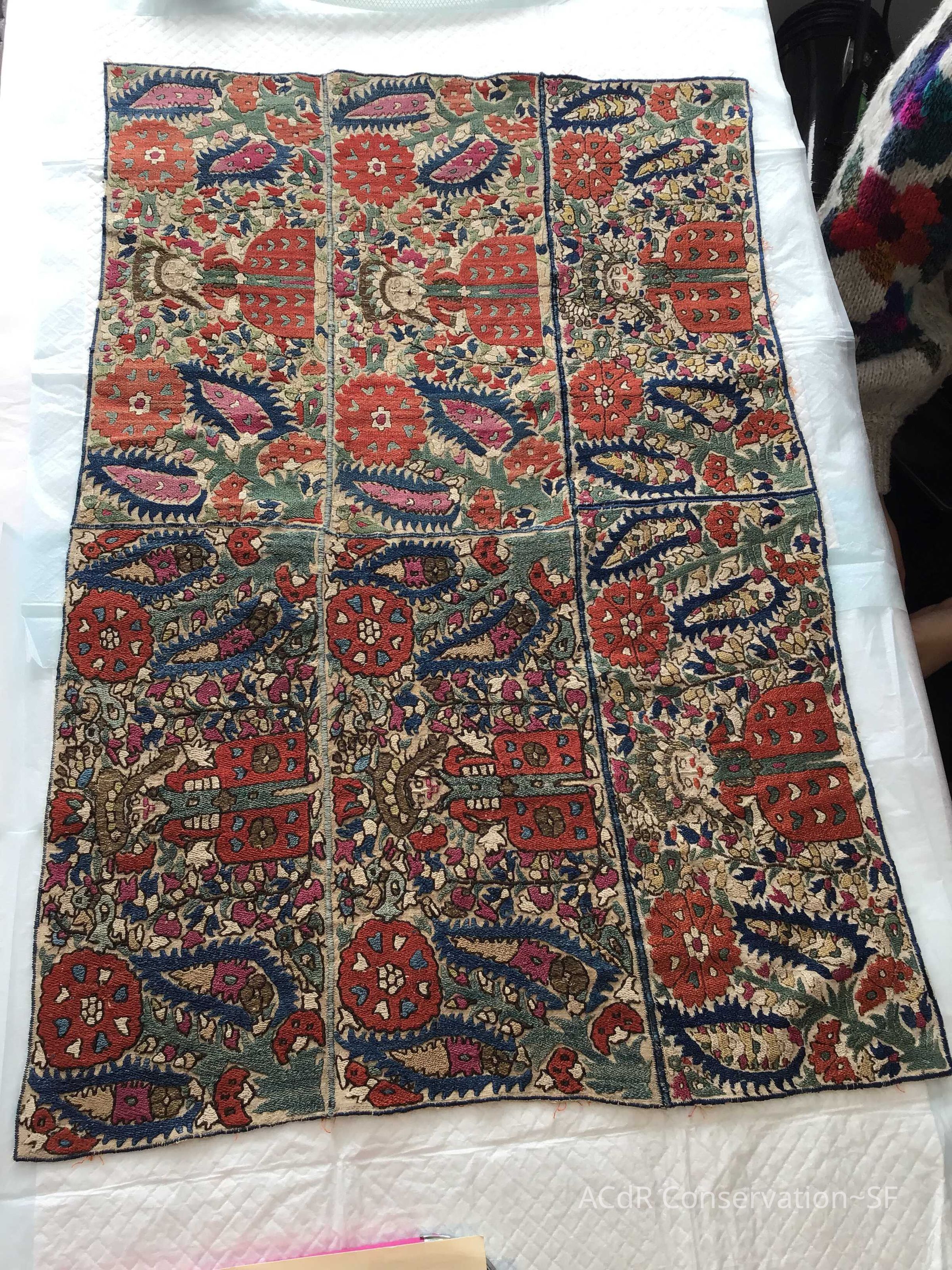 Made a storage folder, 4 in. longer and wider than mounted textile (39" x 31"). Blueboard hinged with white duct tape inside & out. Lined with ethafoam taped in place with remay. Folded a layer of glassine opposite to the side with hinge and closed folder with two duct tape fasteners. Photo documented and created 2 mylar sleeves for exterior.