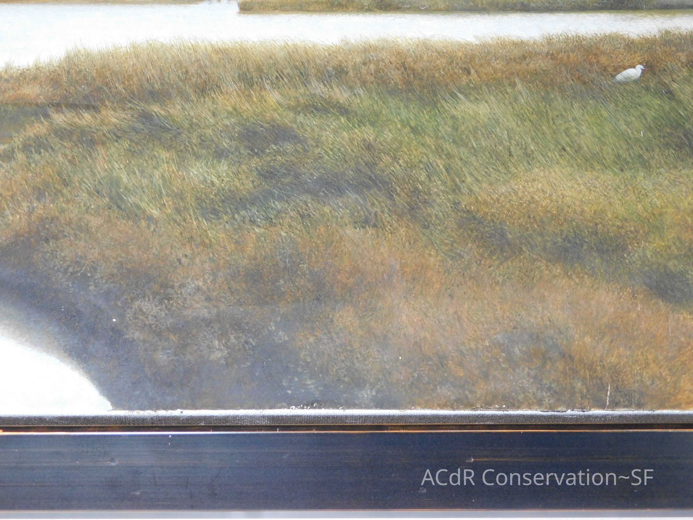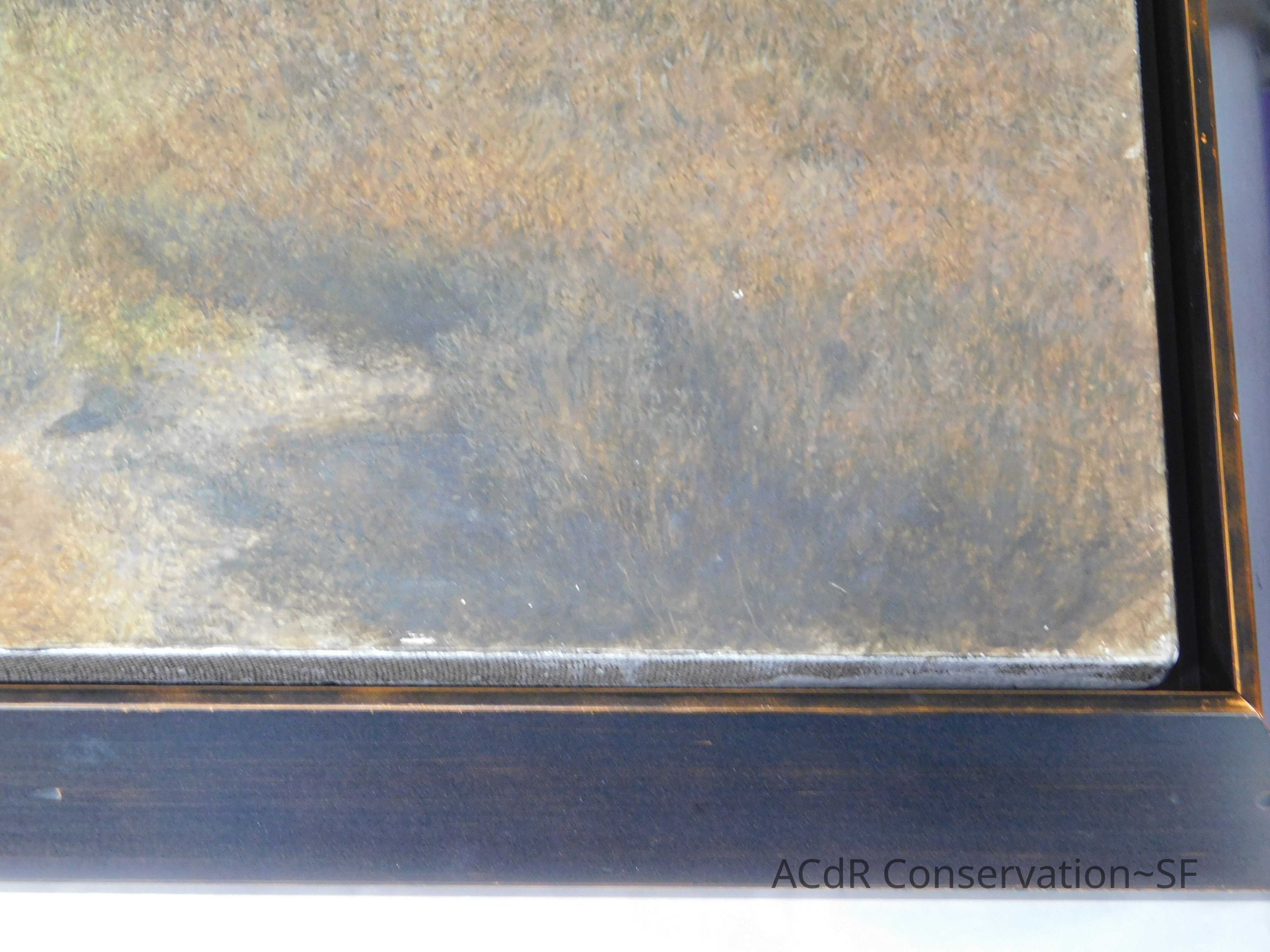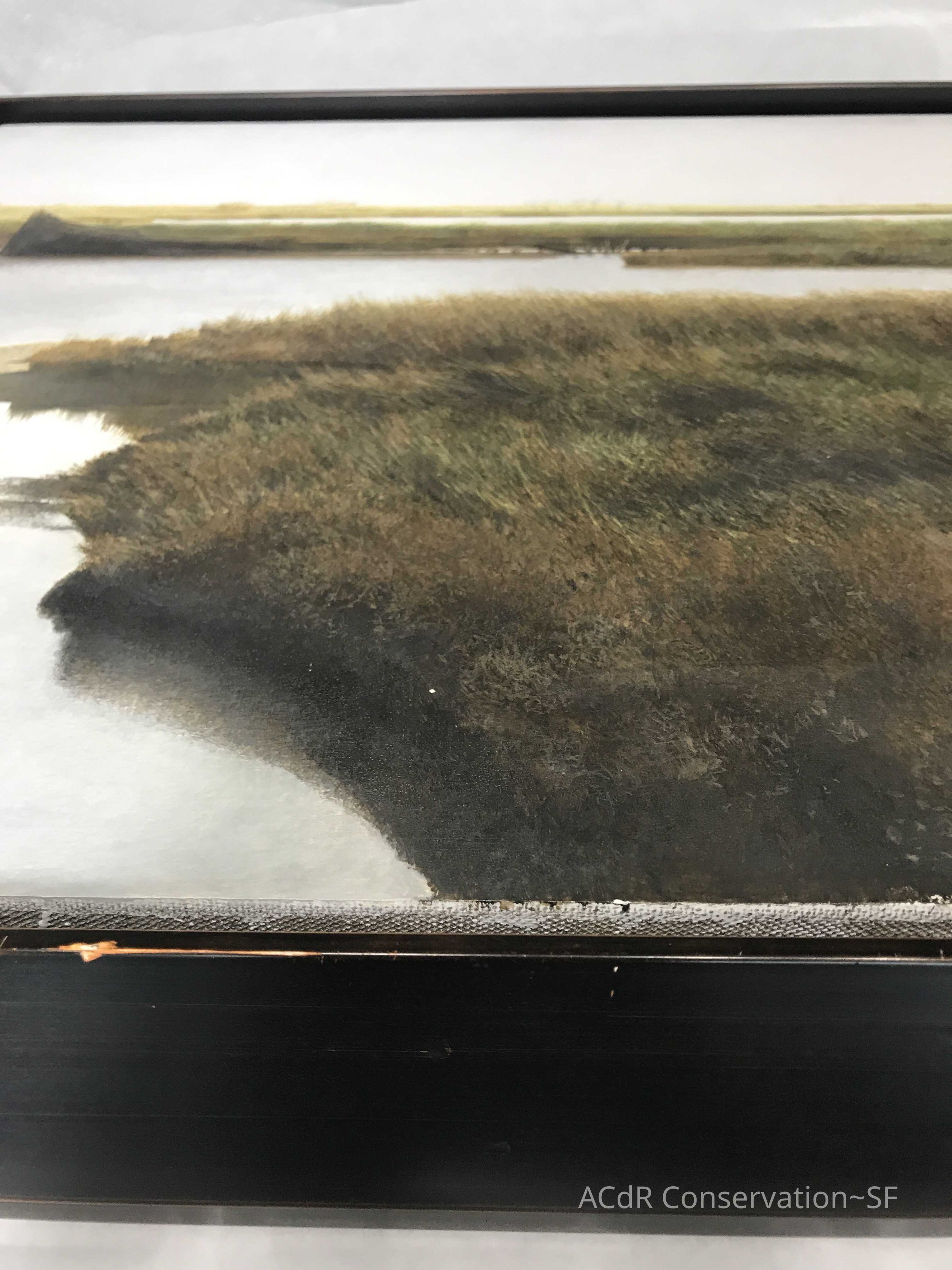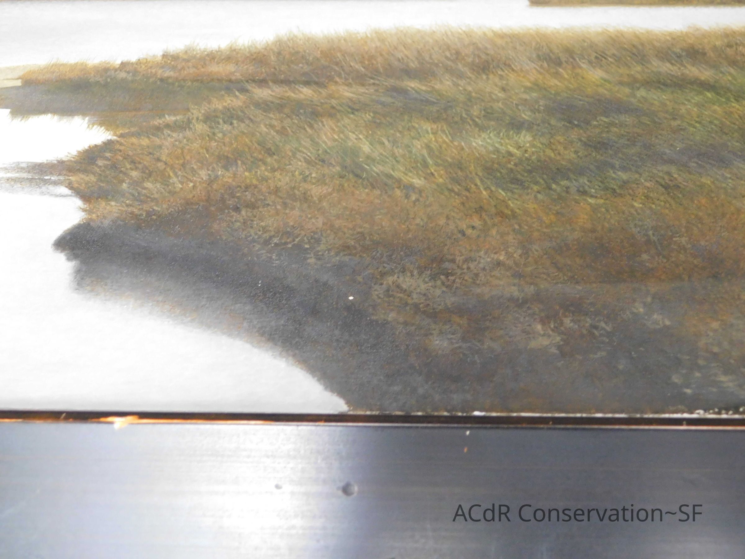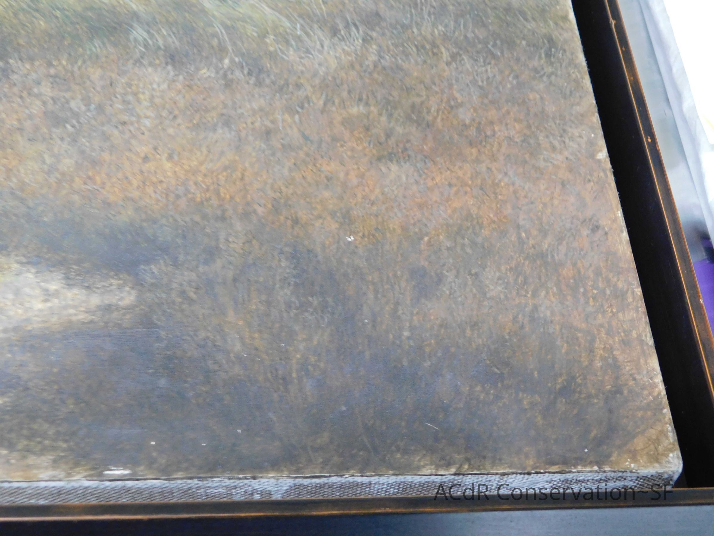 Blanching of surface and white accretions across painting and frame