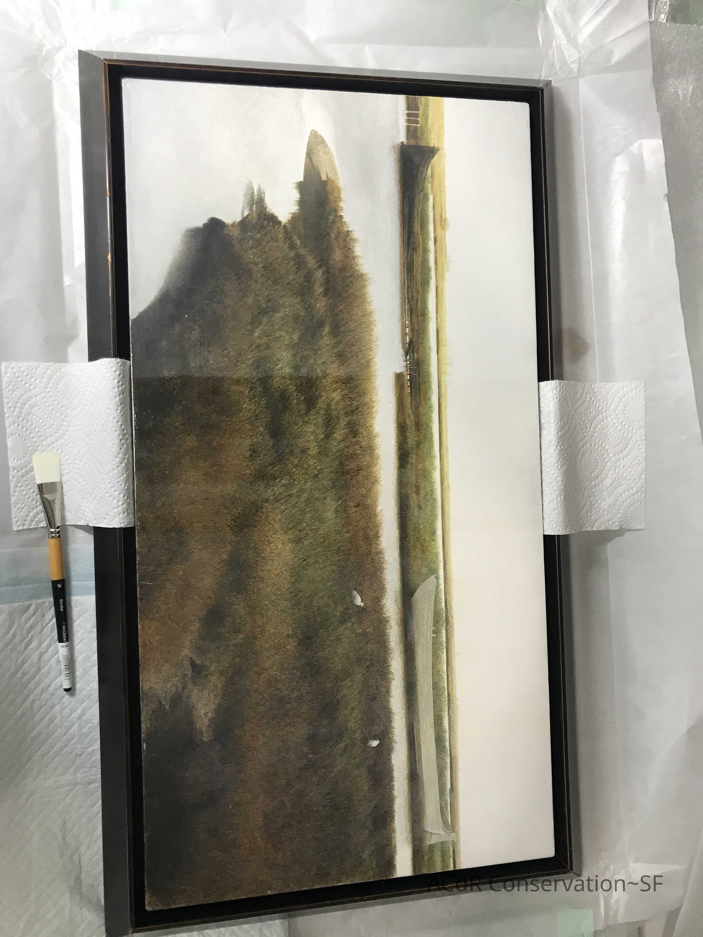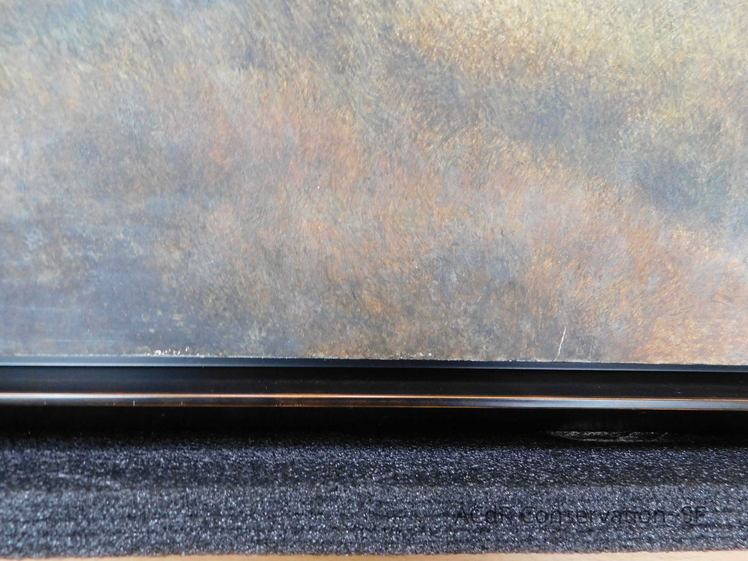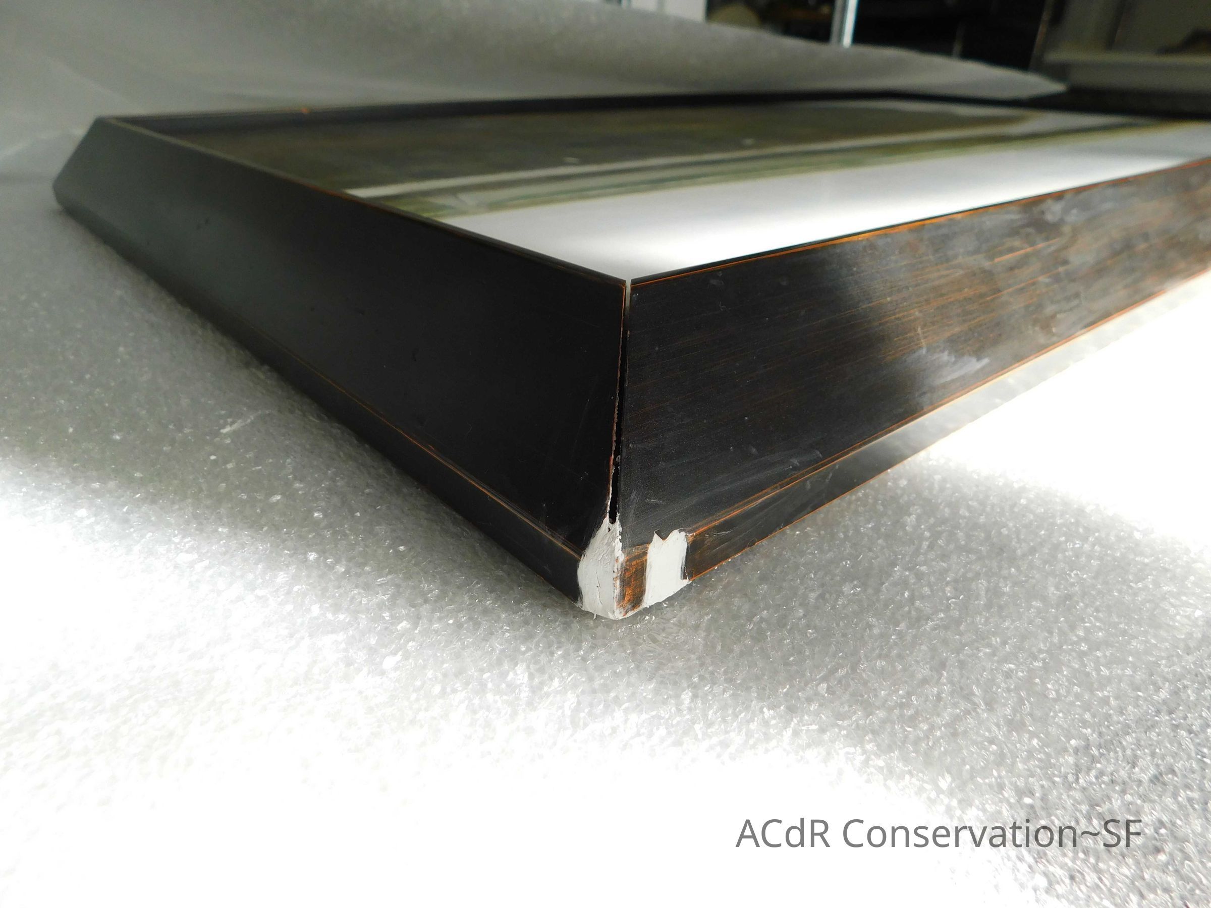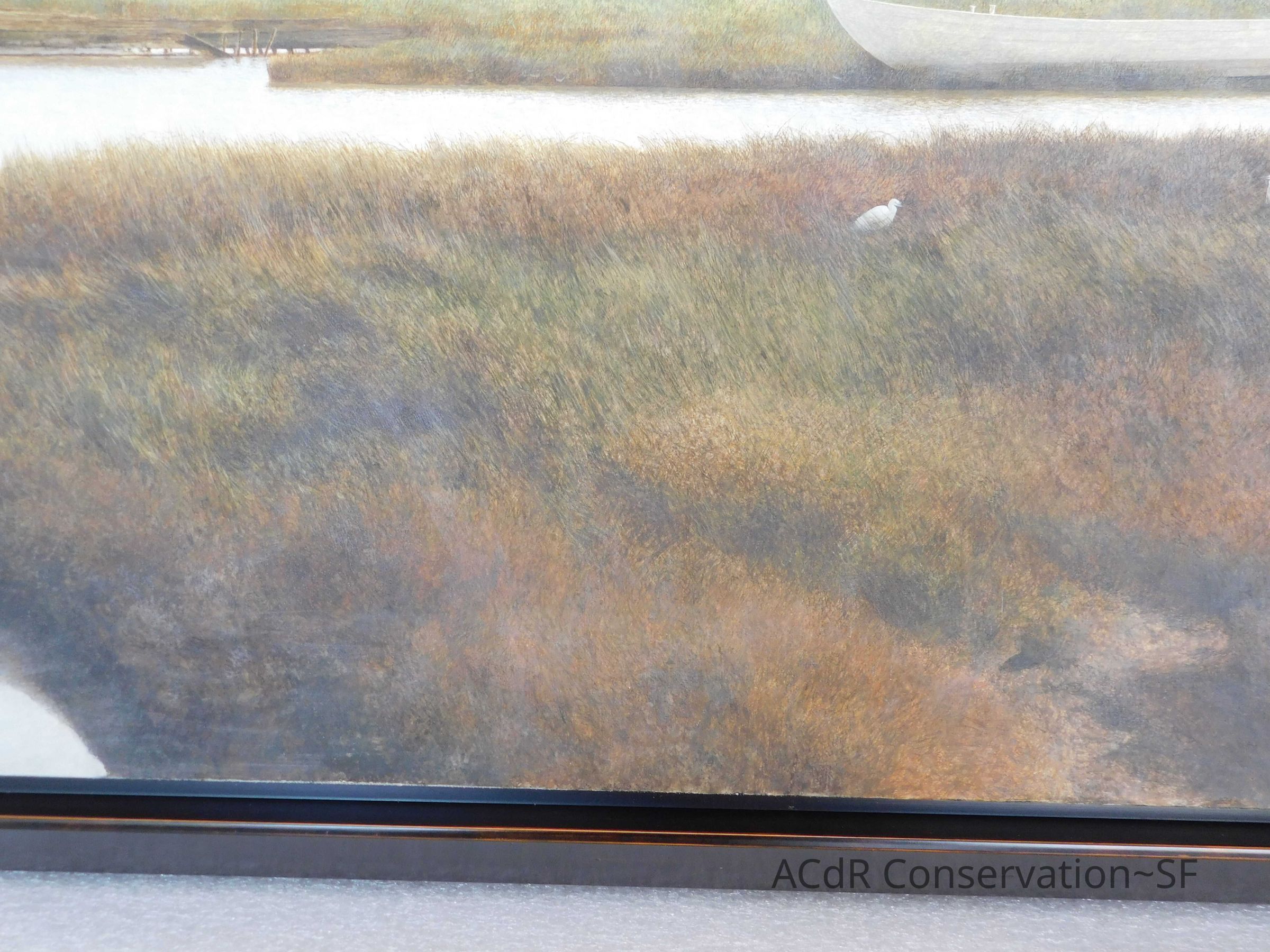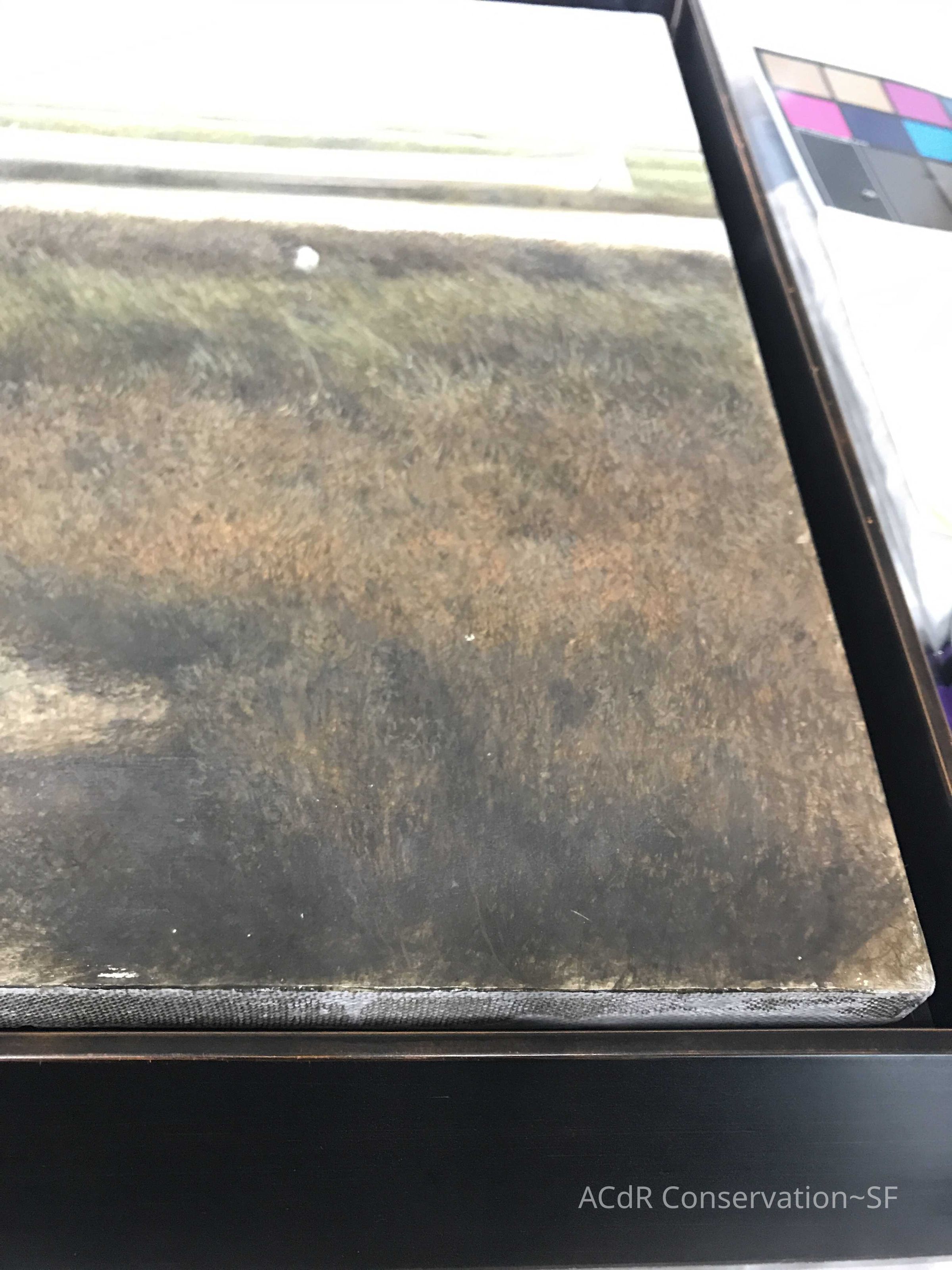 Blanching of surface and white accretions across painting and frame