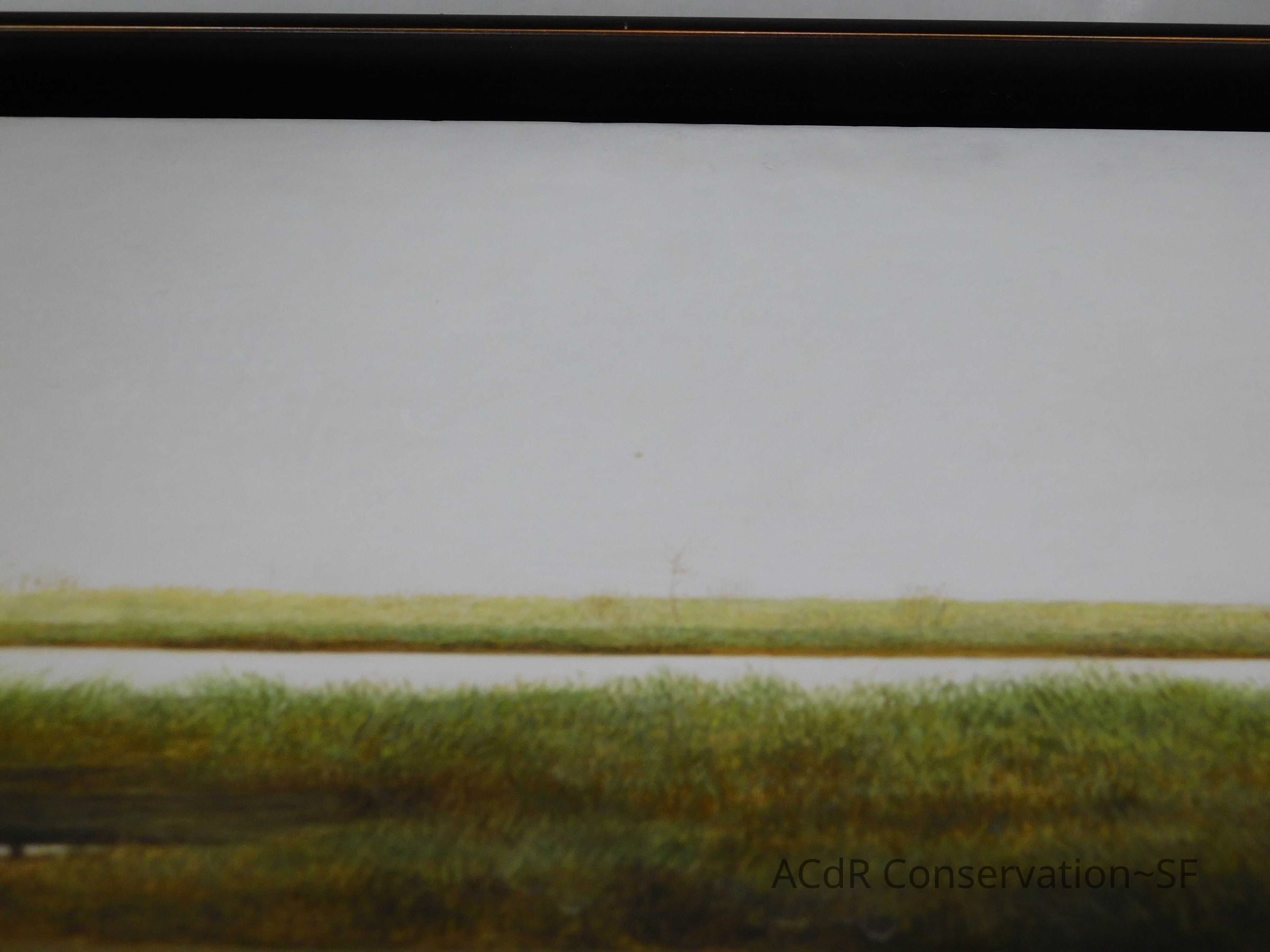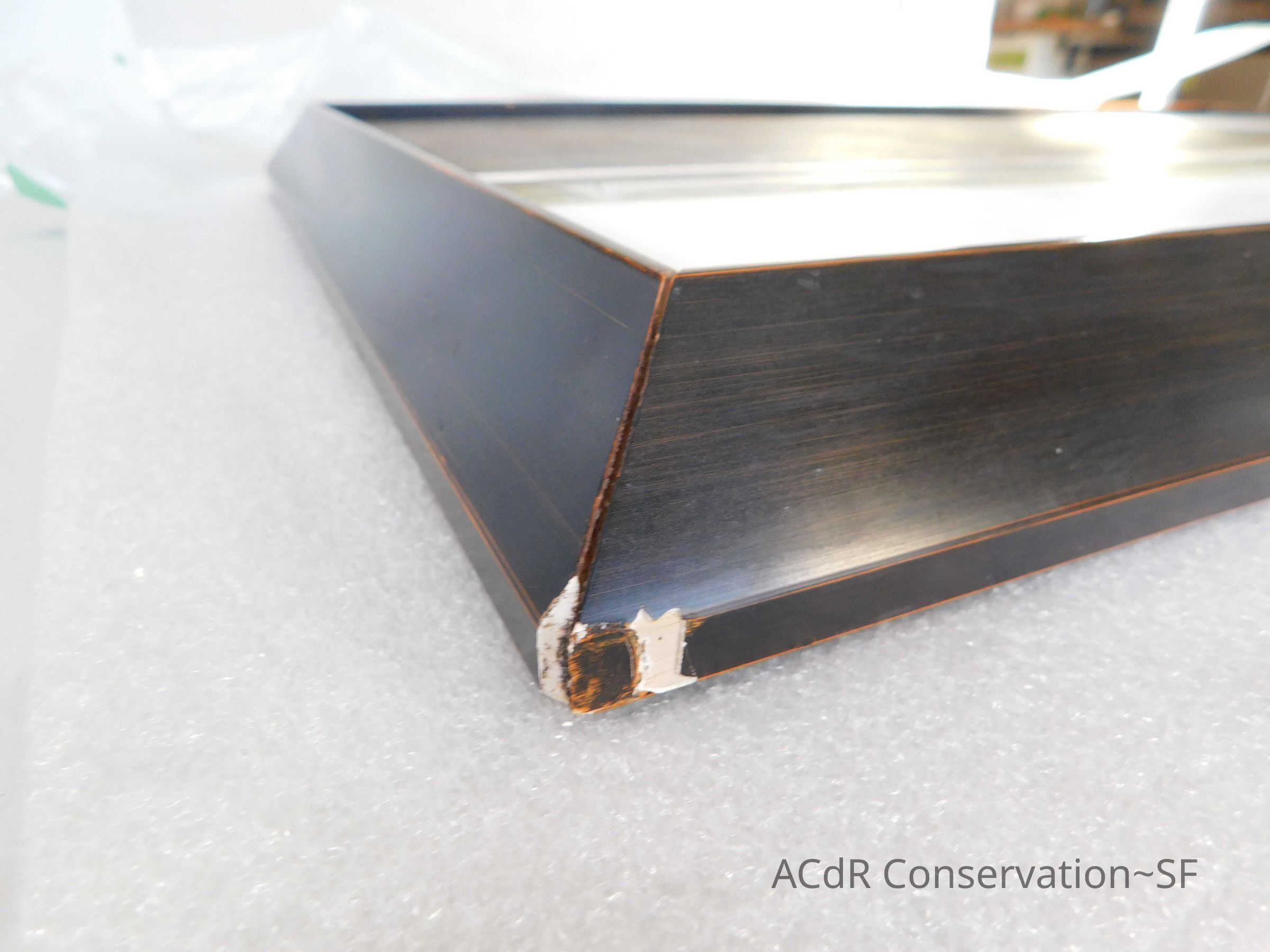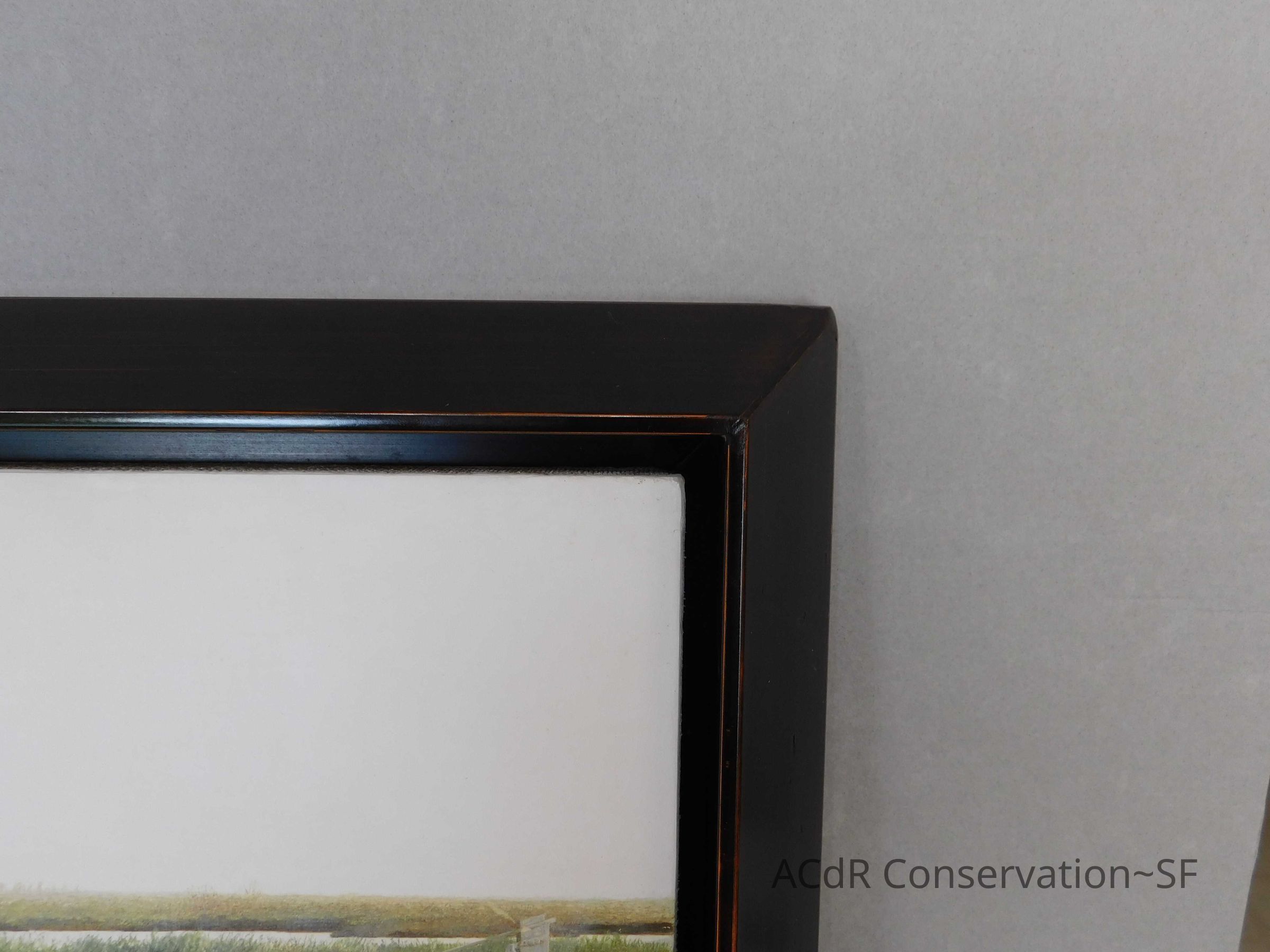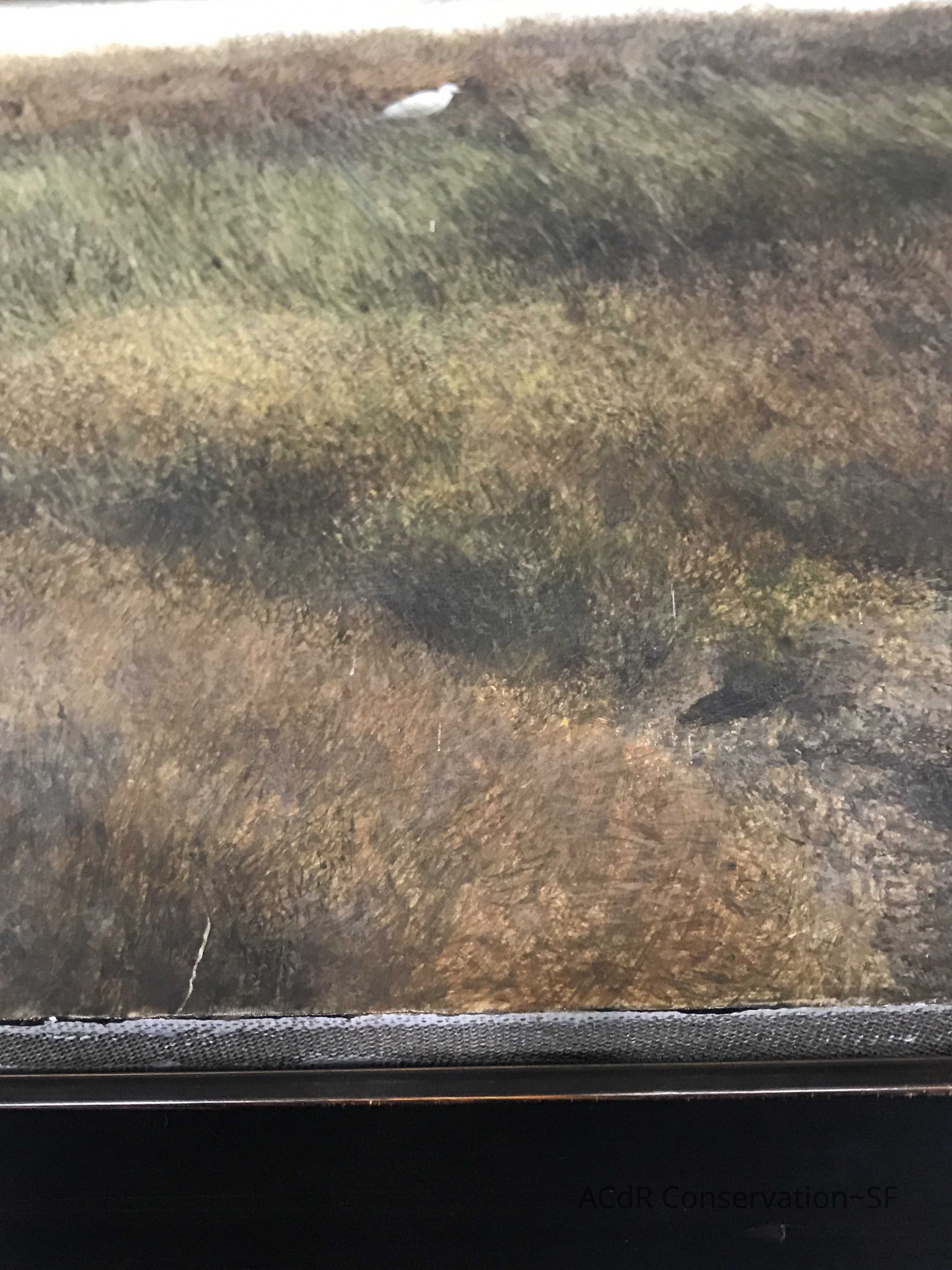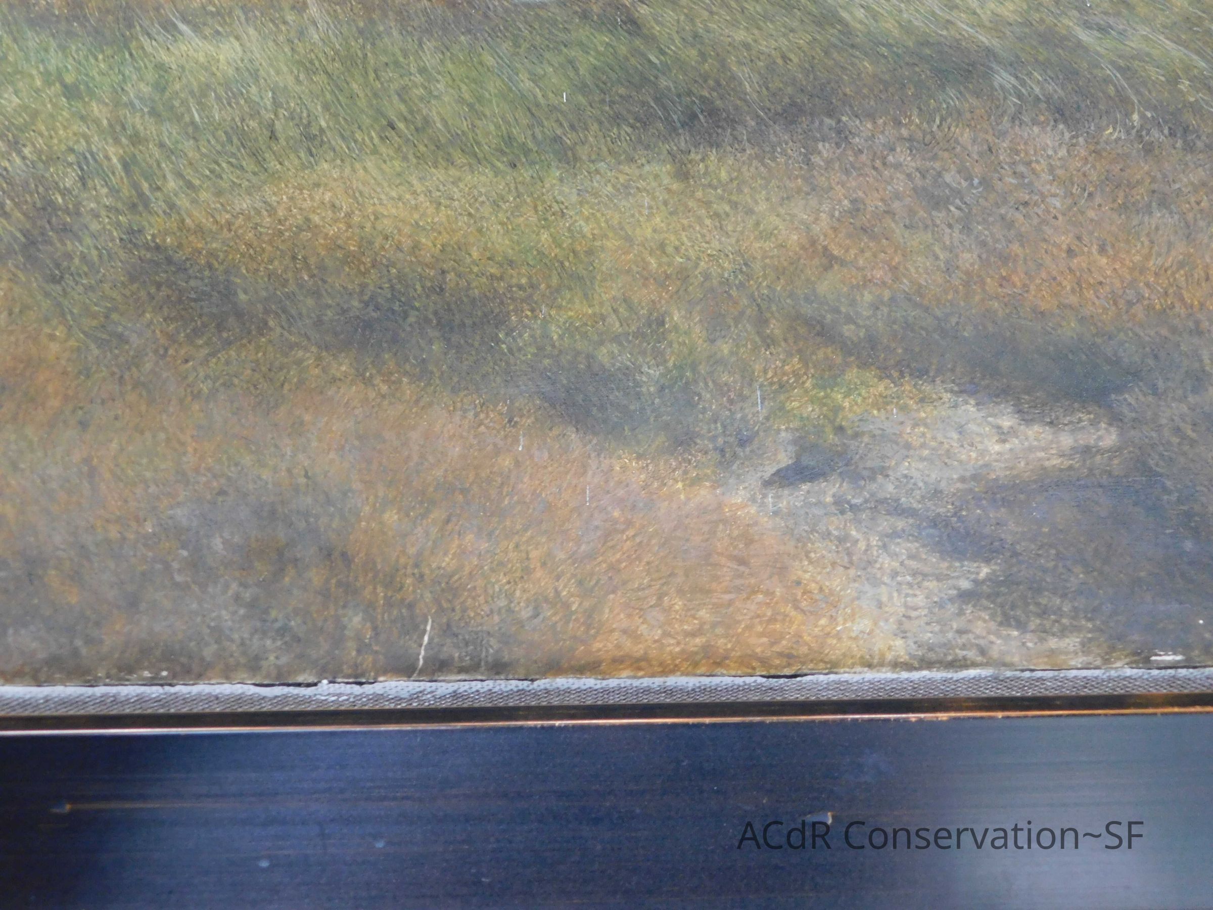 Blanching of surface and white accretions across painting and frame