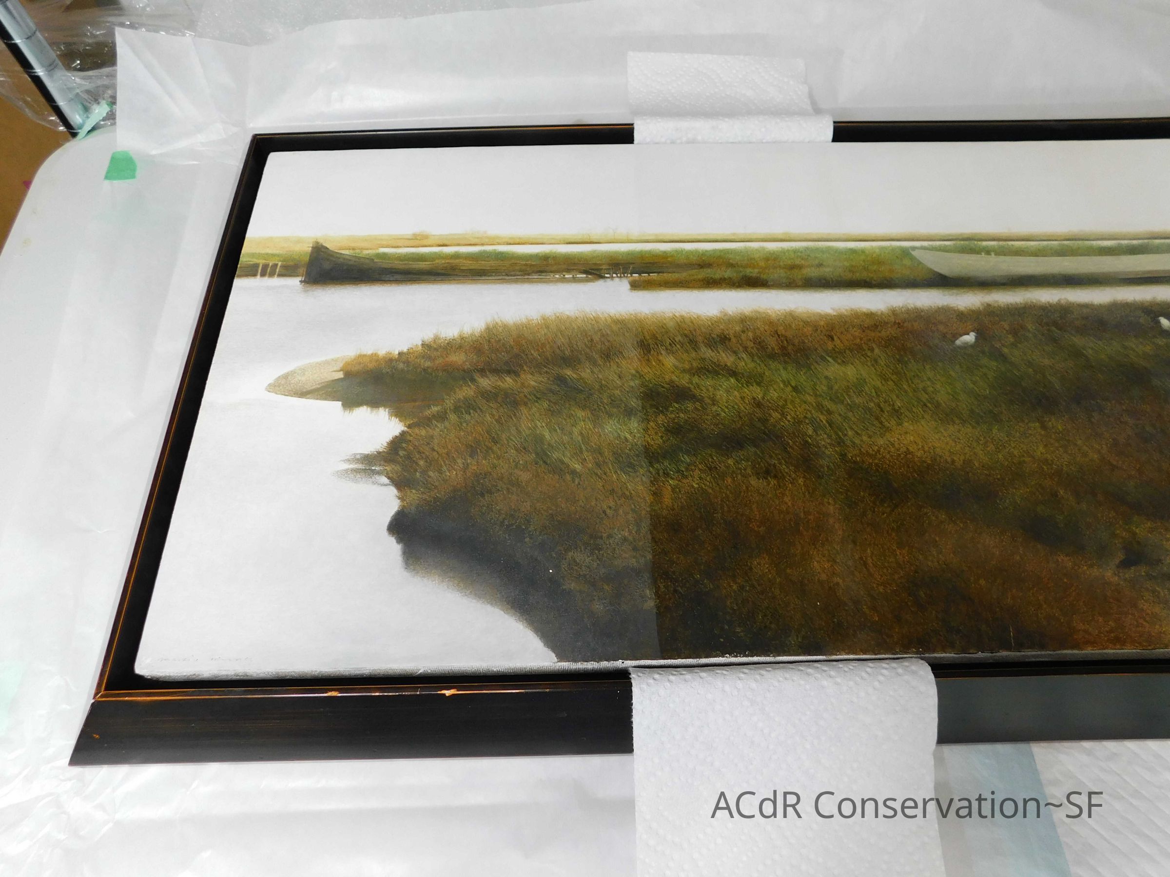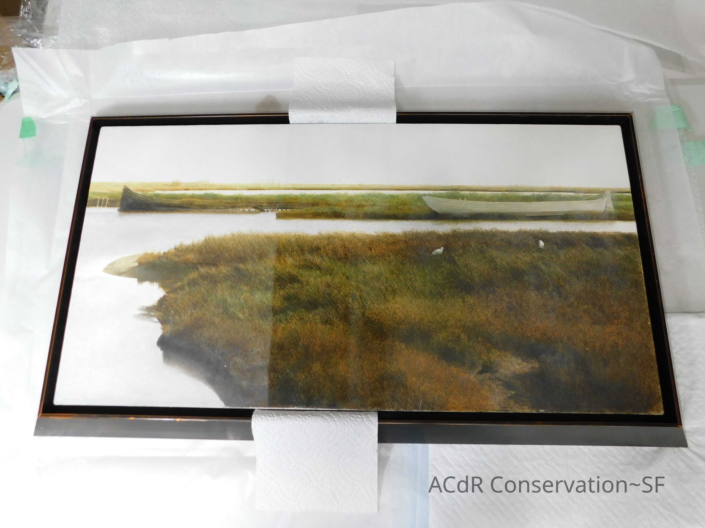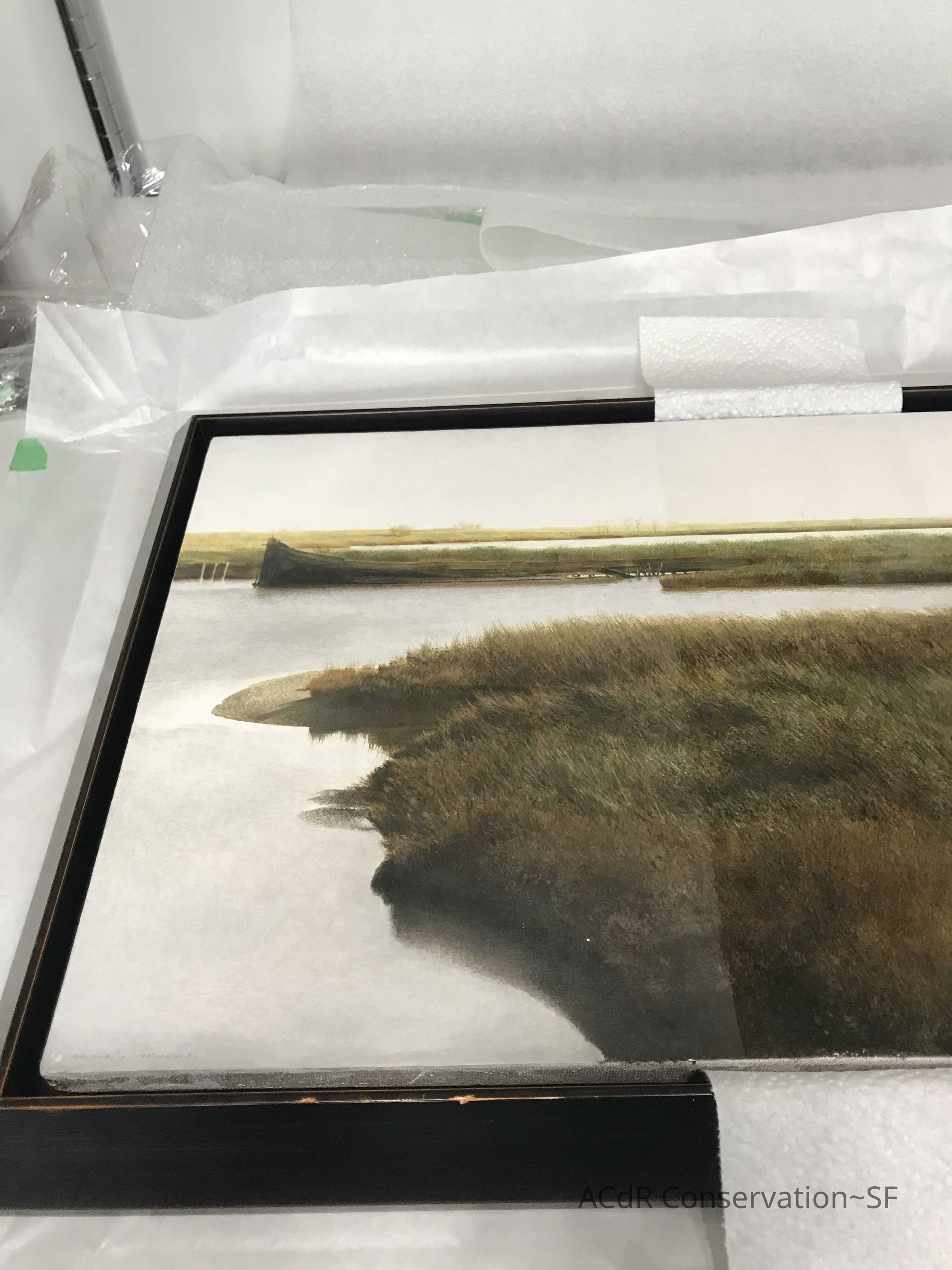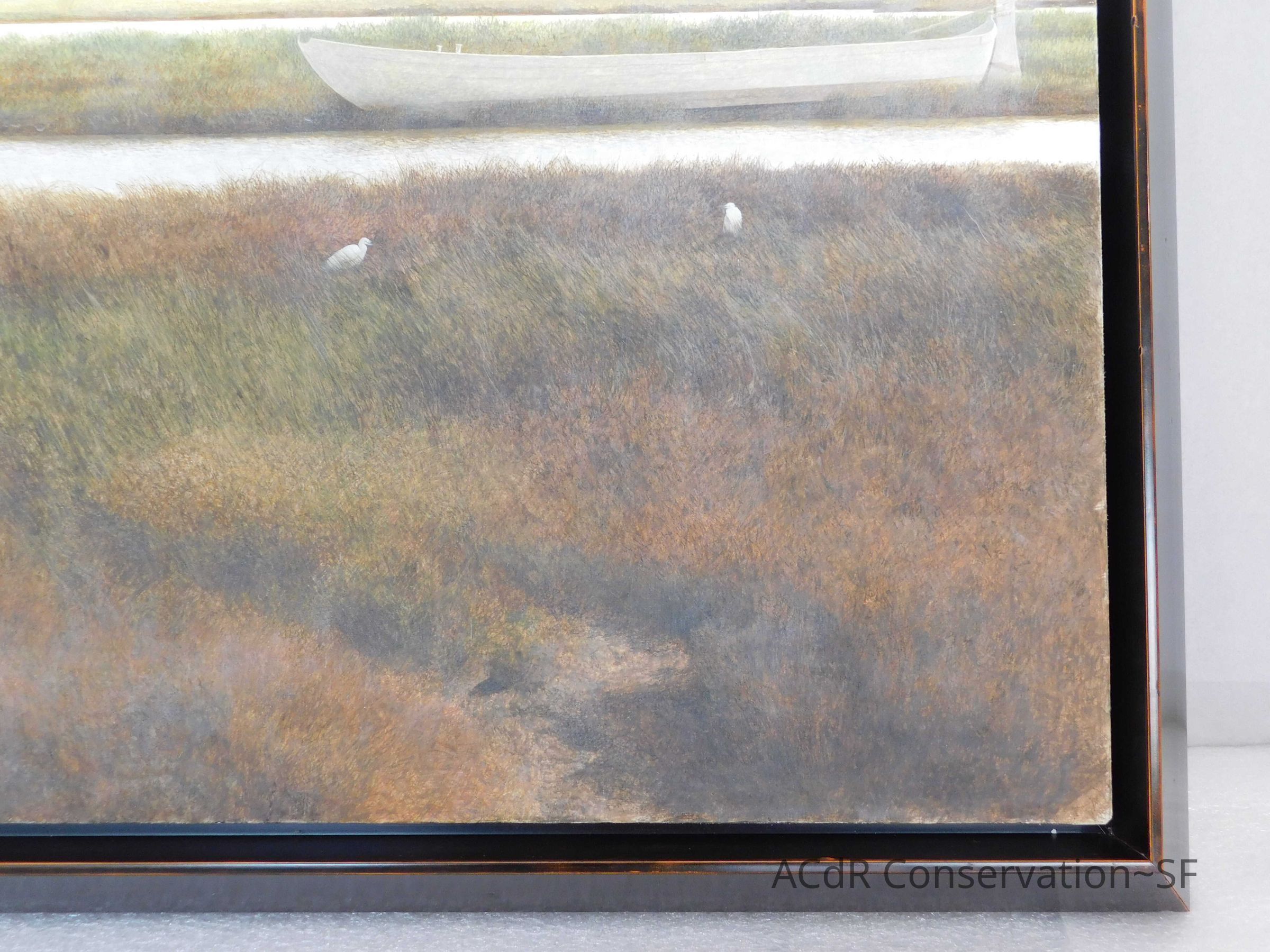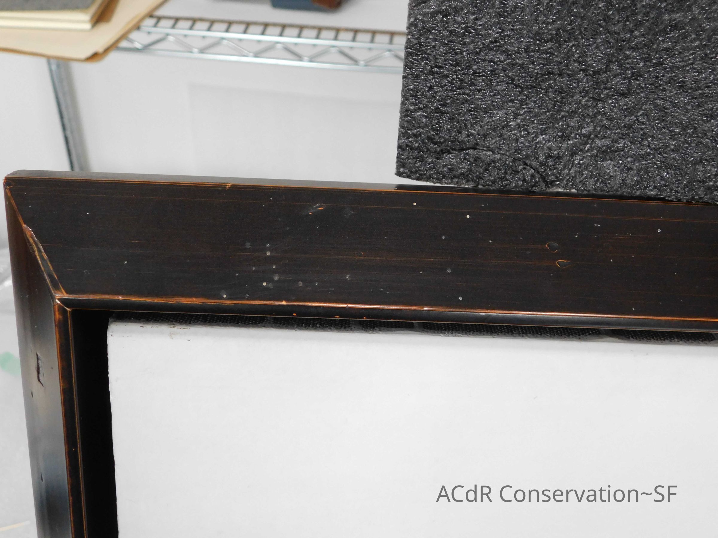 Blanching of surface and white accretions across painting and frame