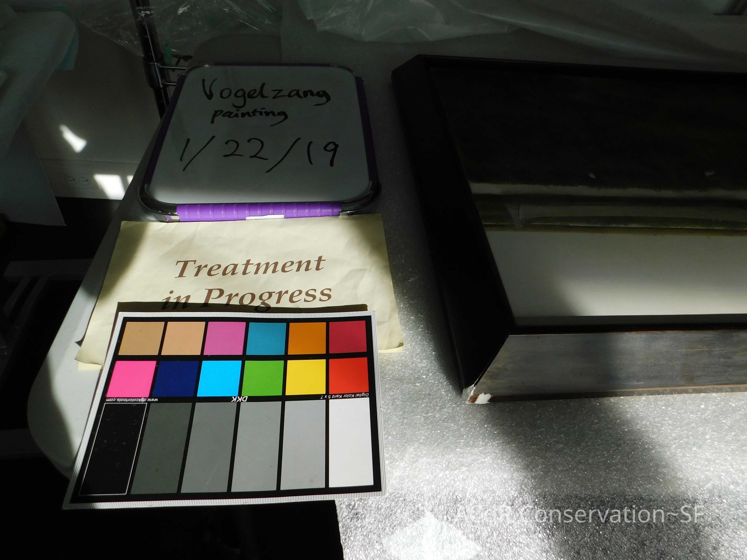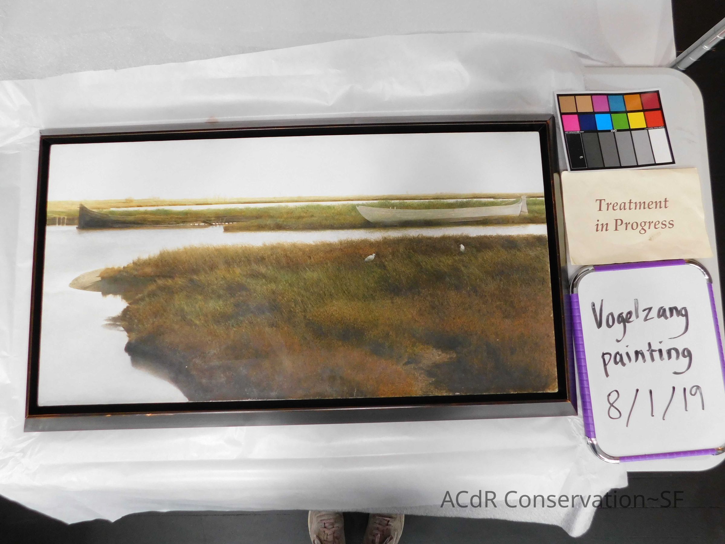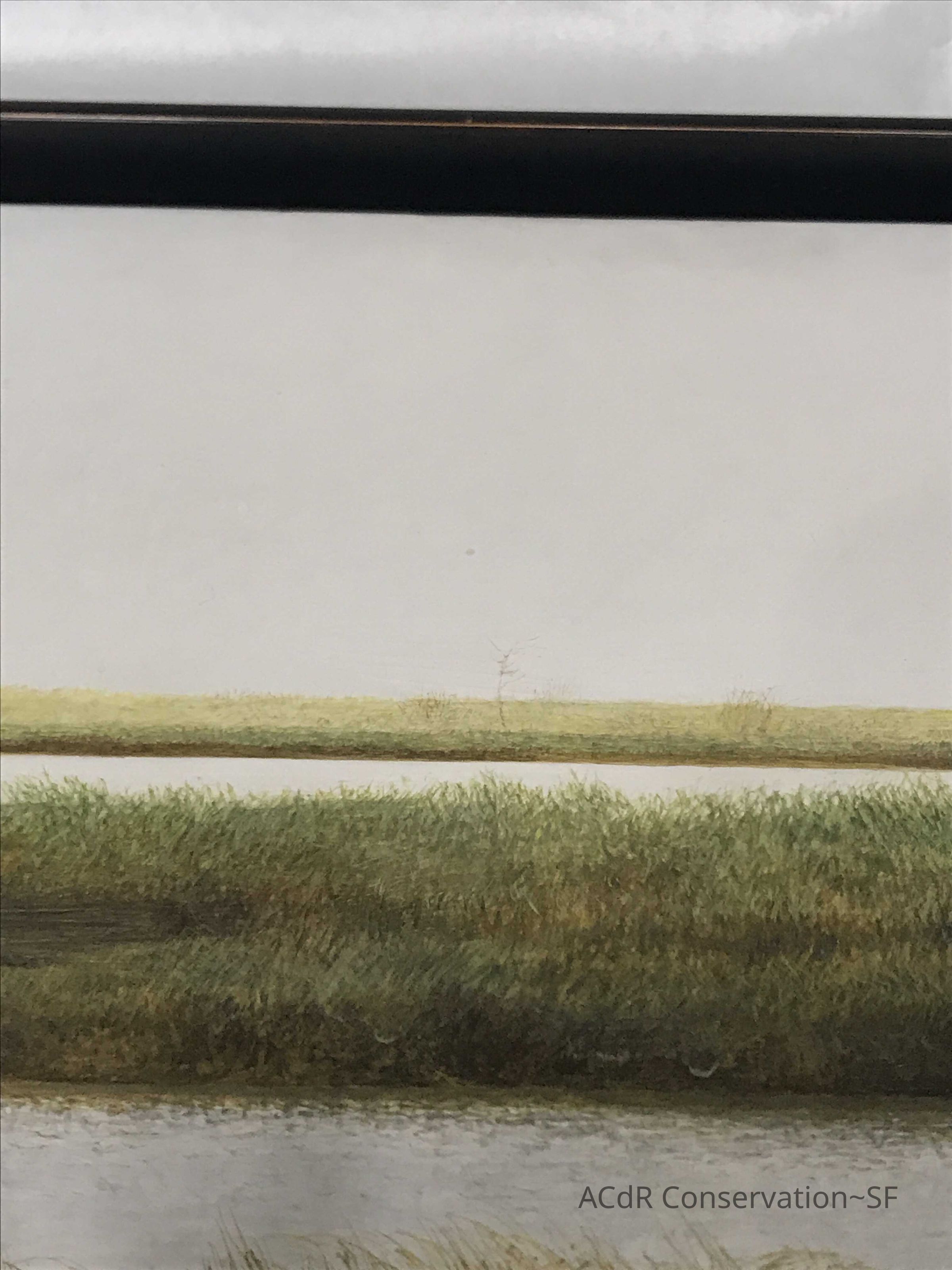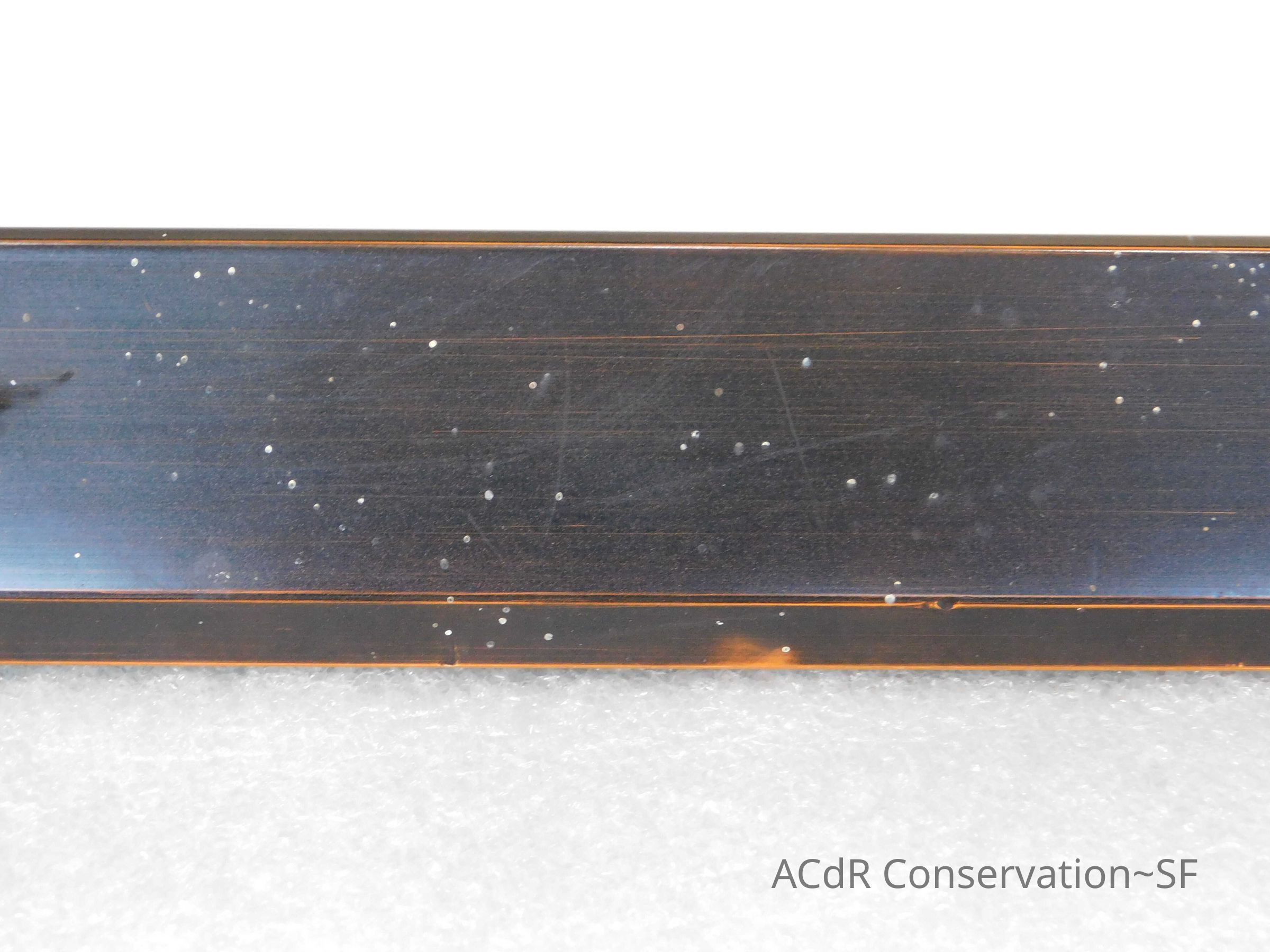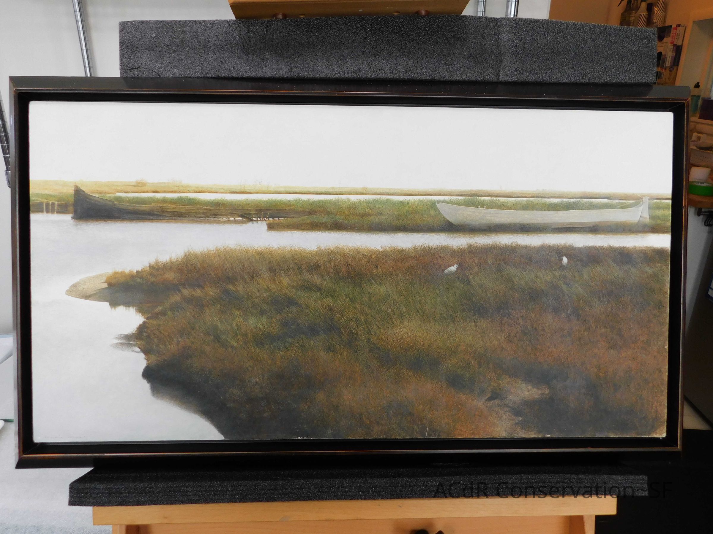 Blanching of surface and white accretions across painting and frame