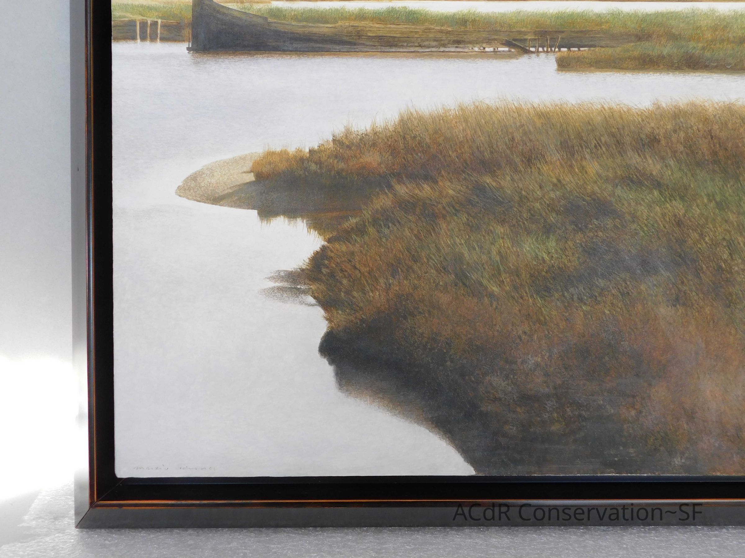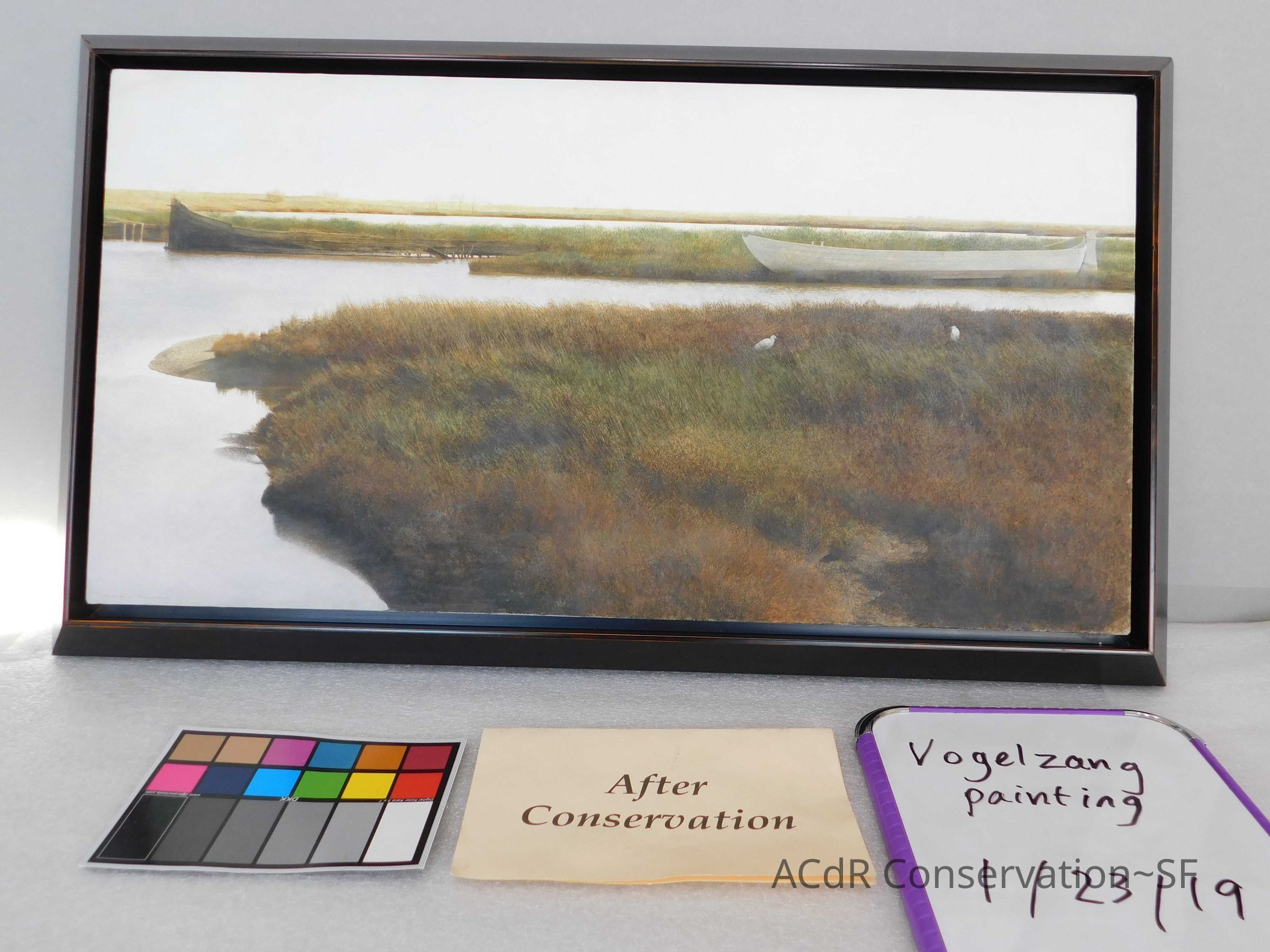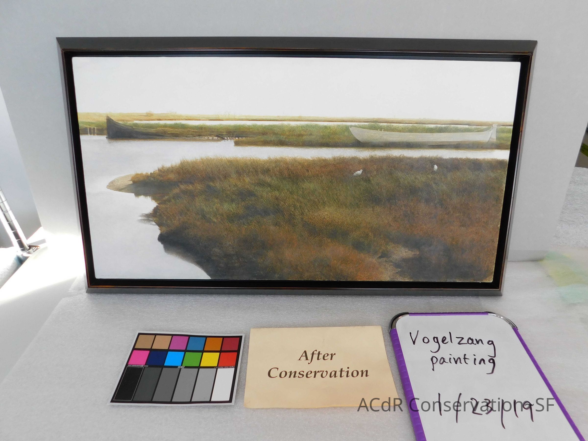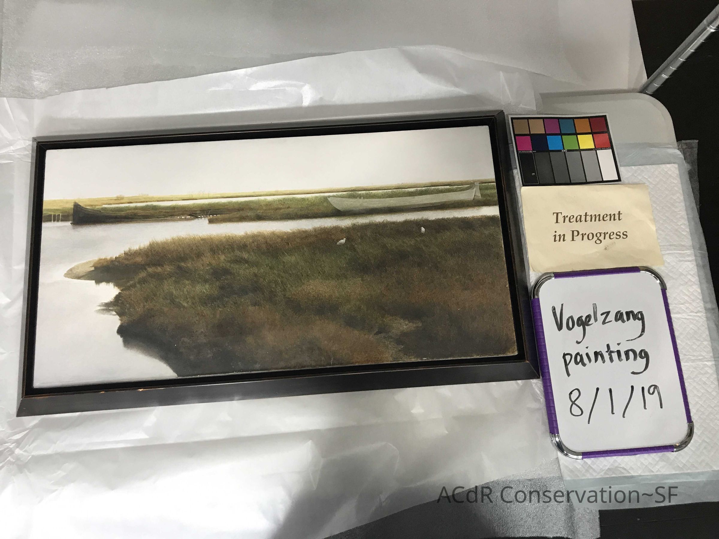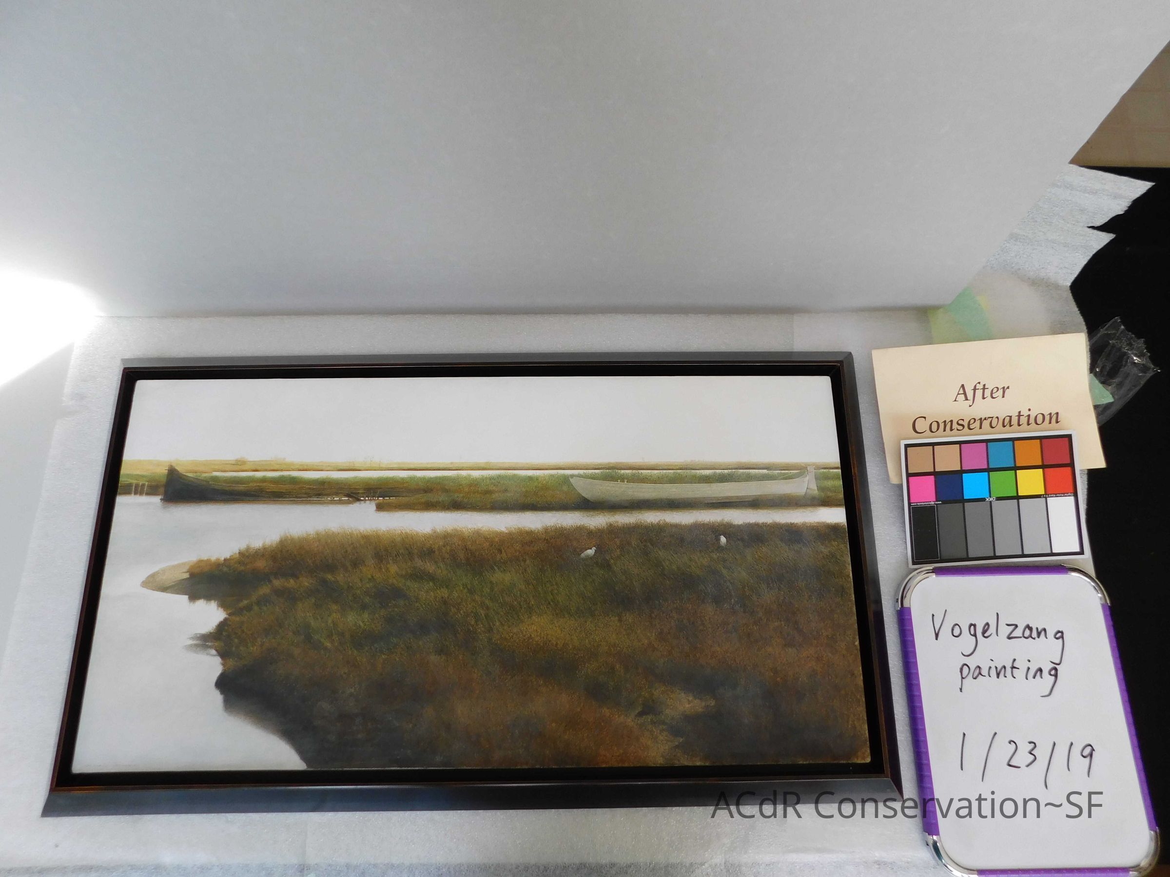 Blanching of surface and white accretions across painting and frame