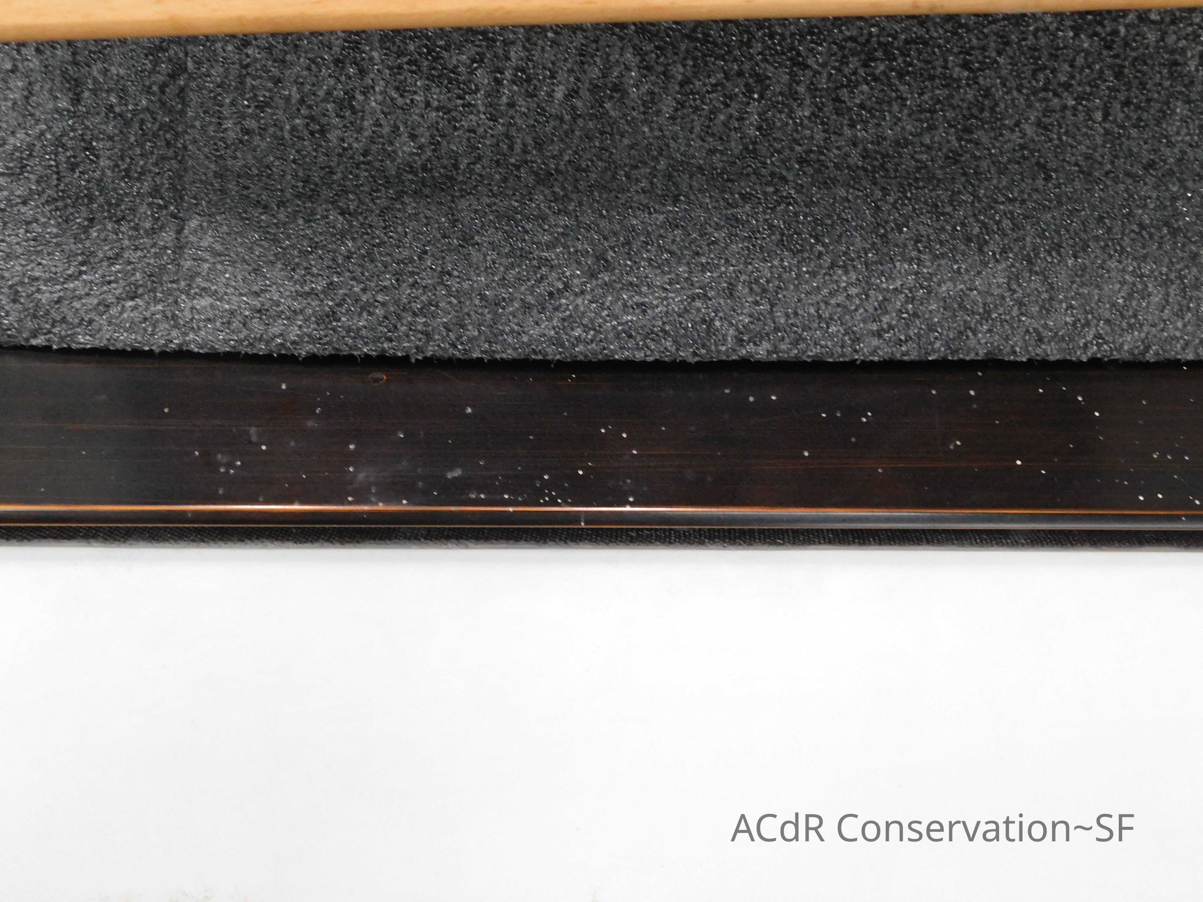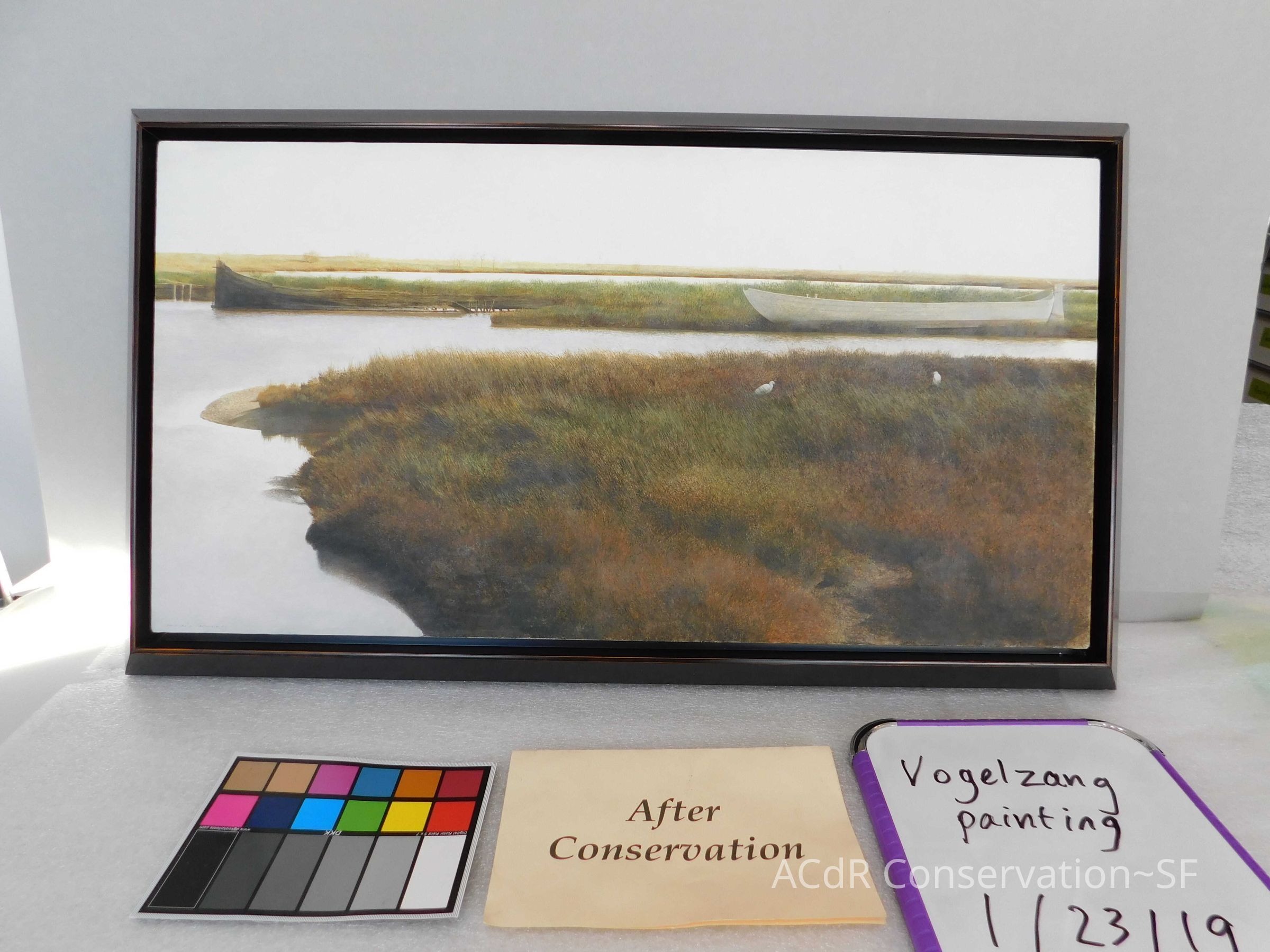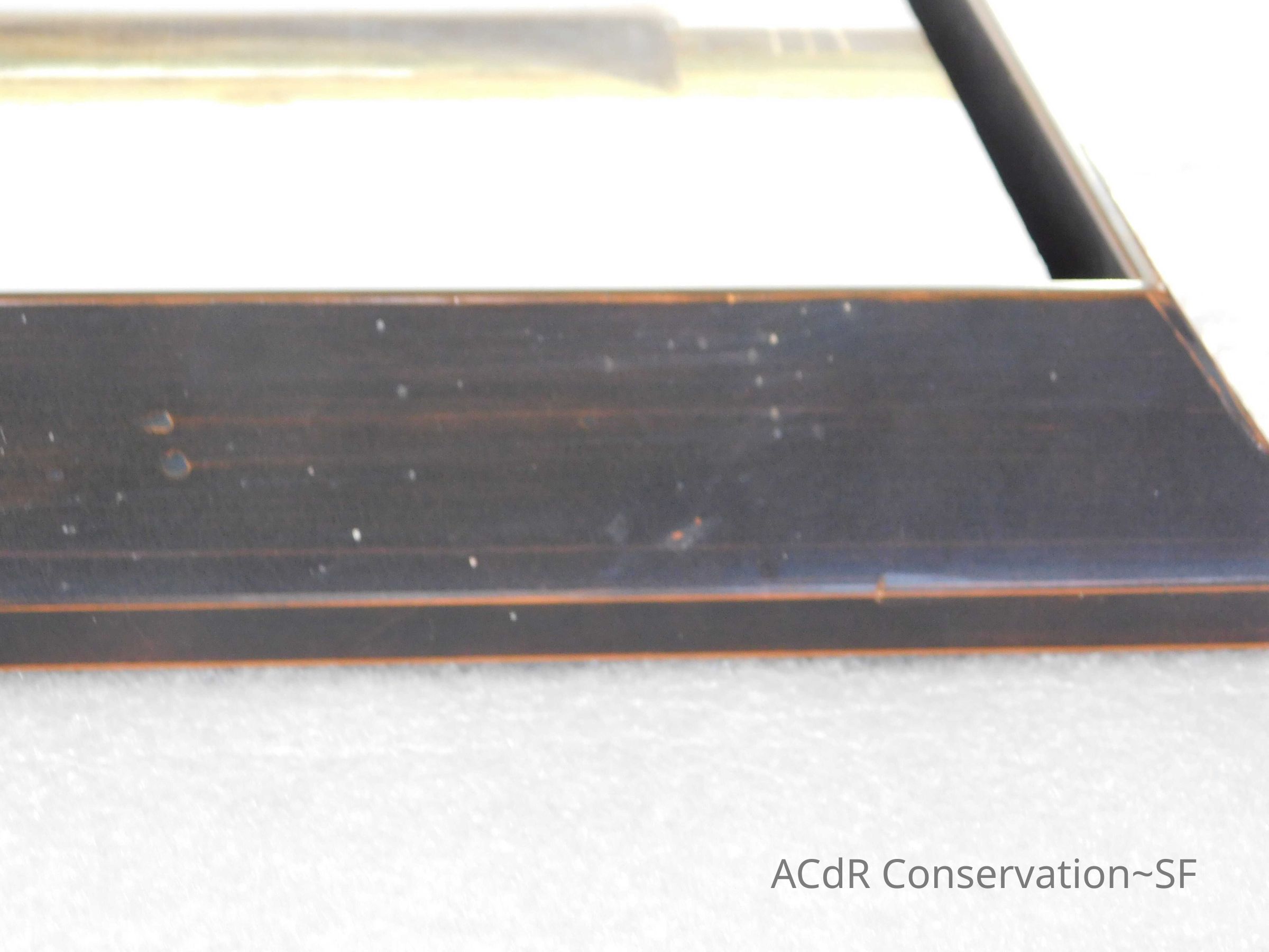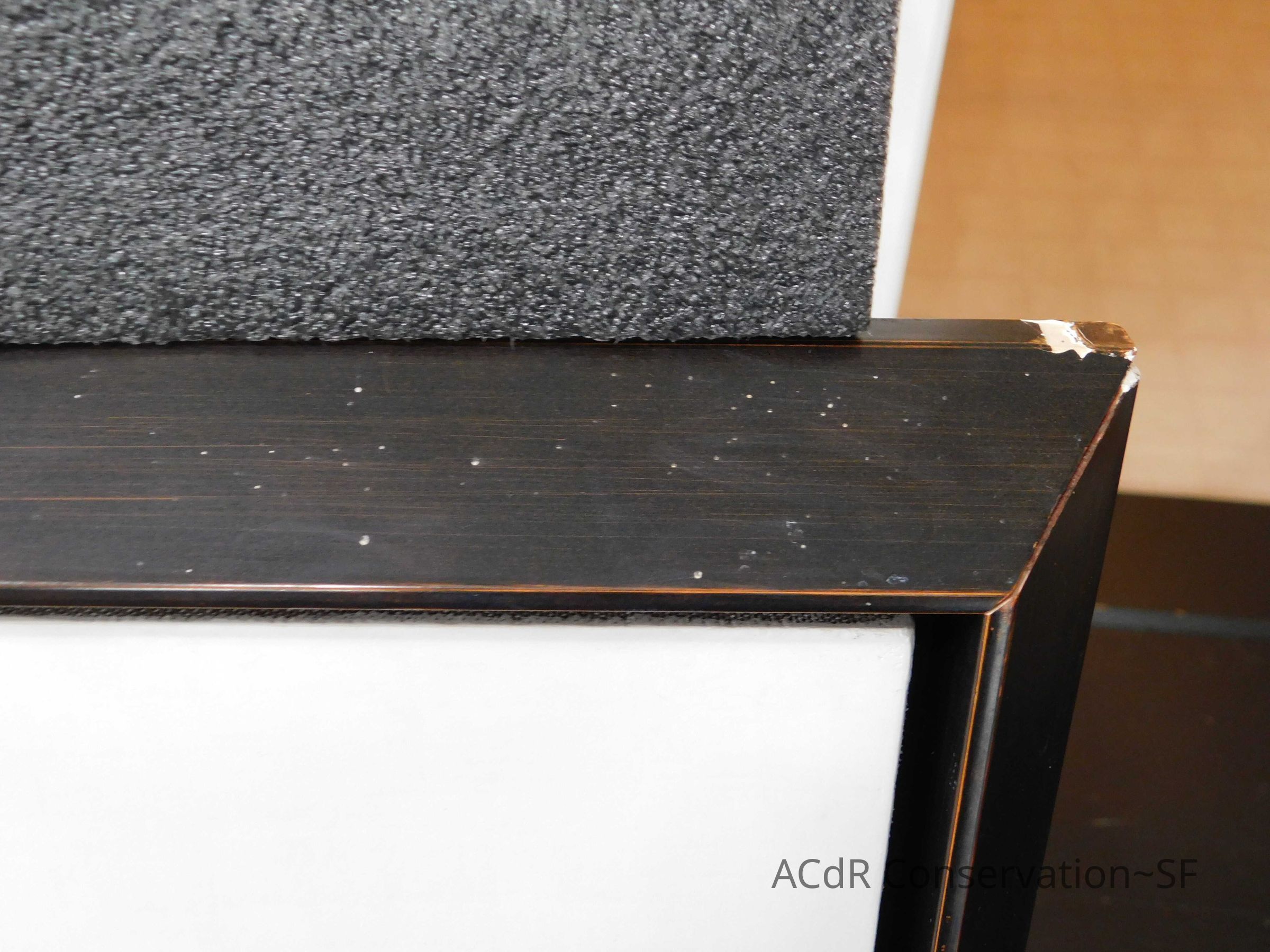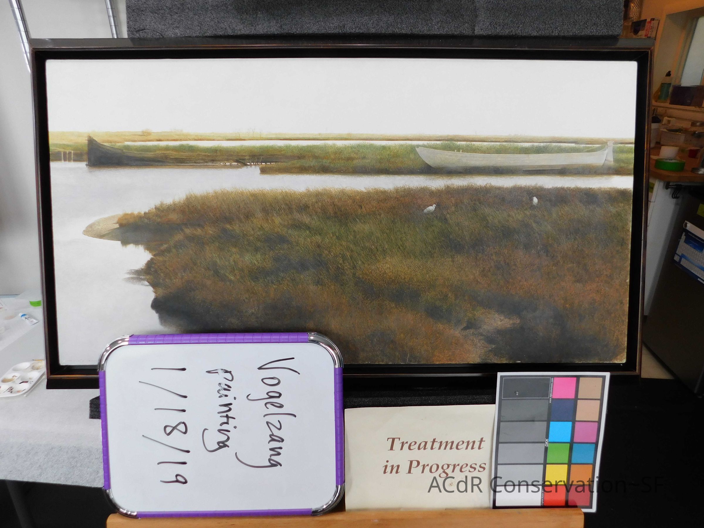Blanching of surface and white accretions across painting and frame