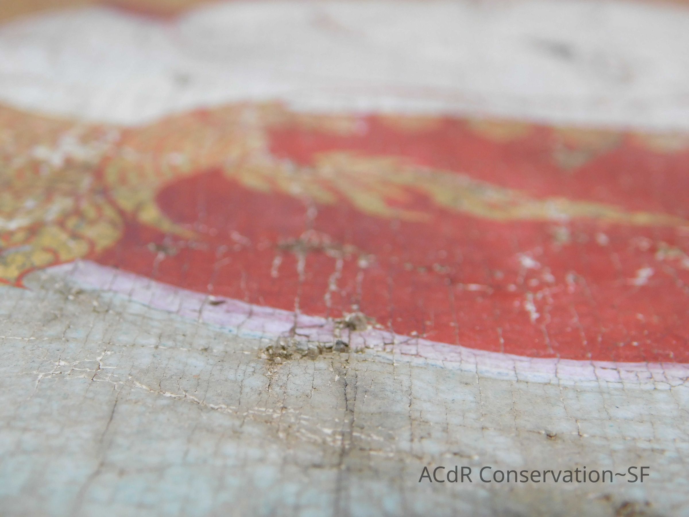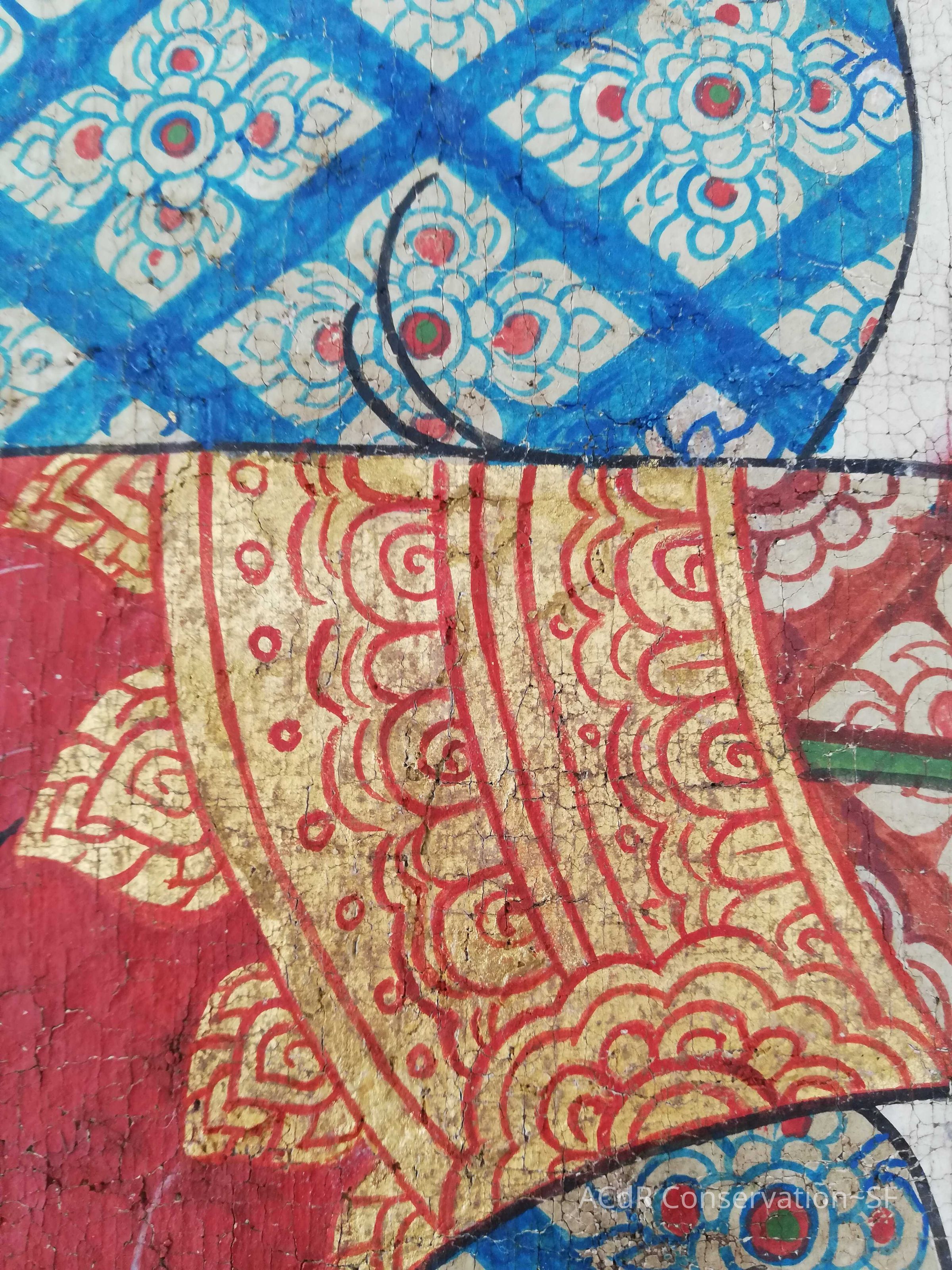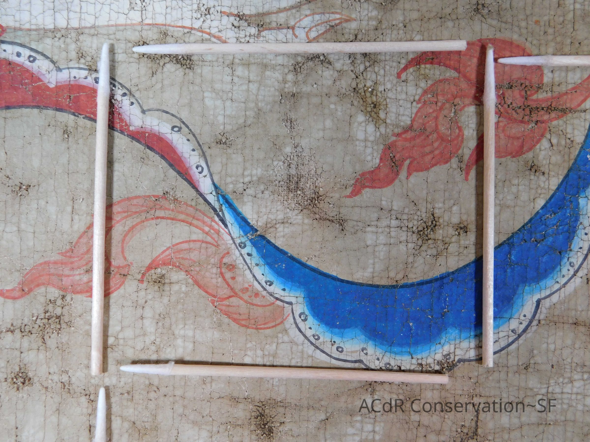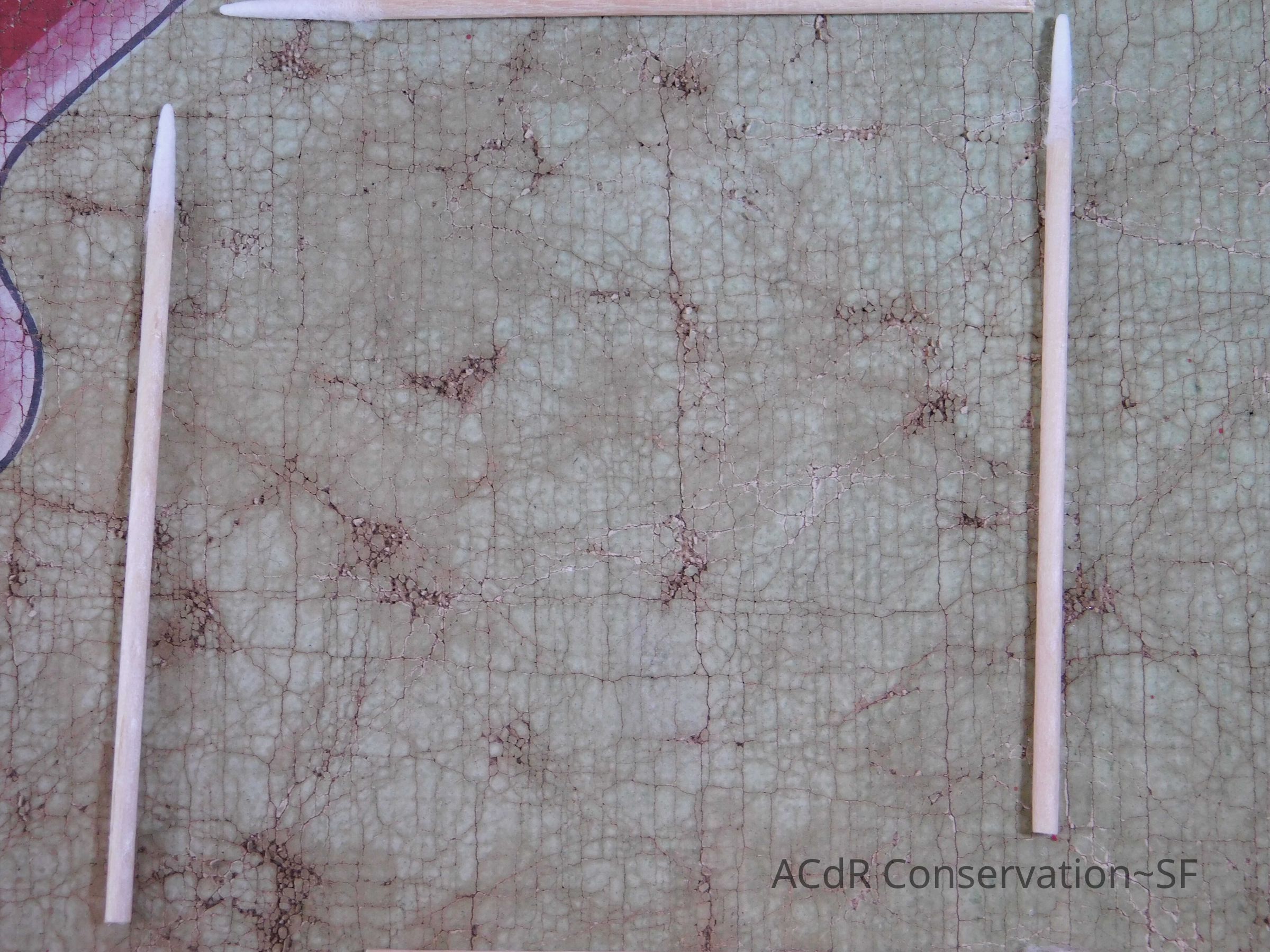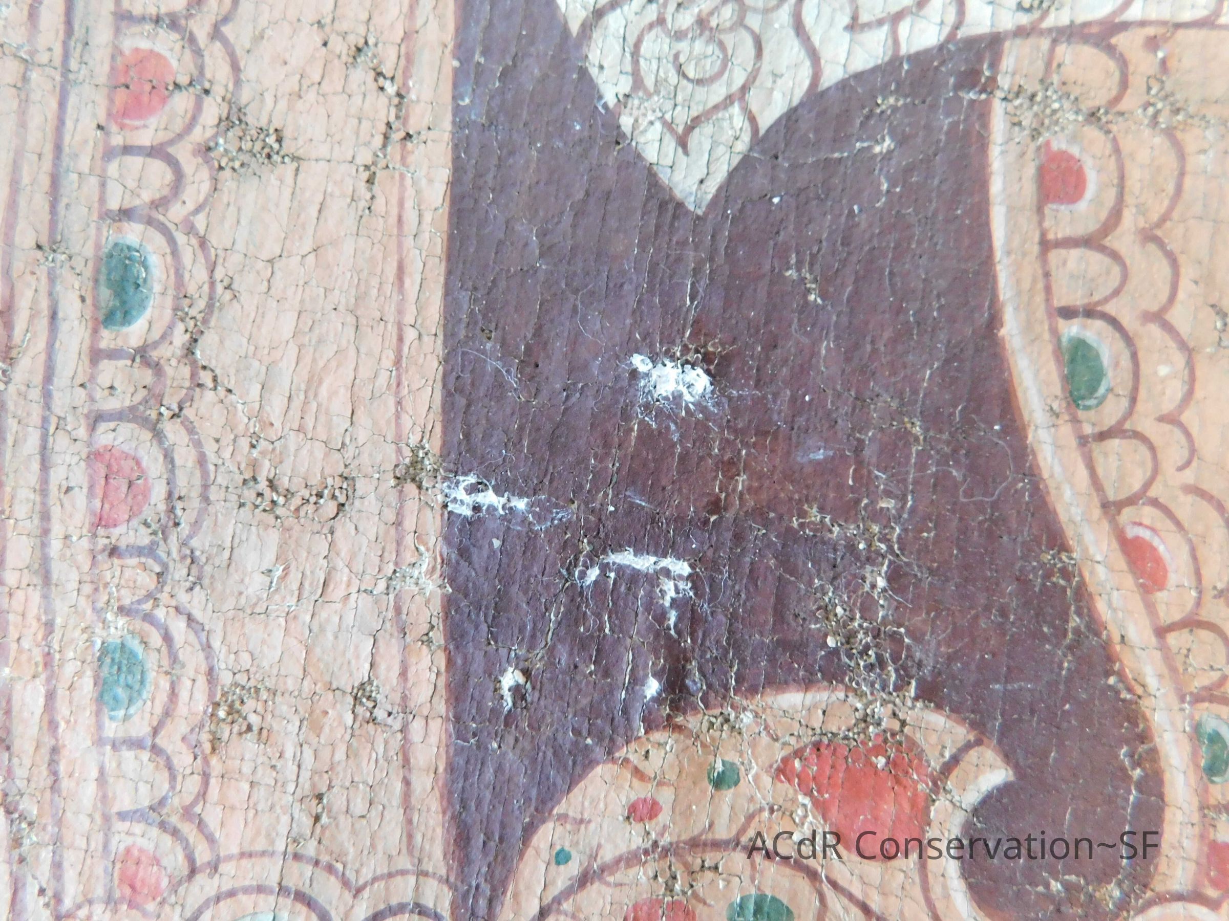 Paint layer consolidation with 3% Klucel in isoproyl on stand and feet area.