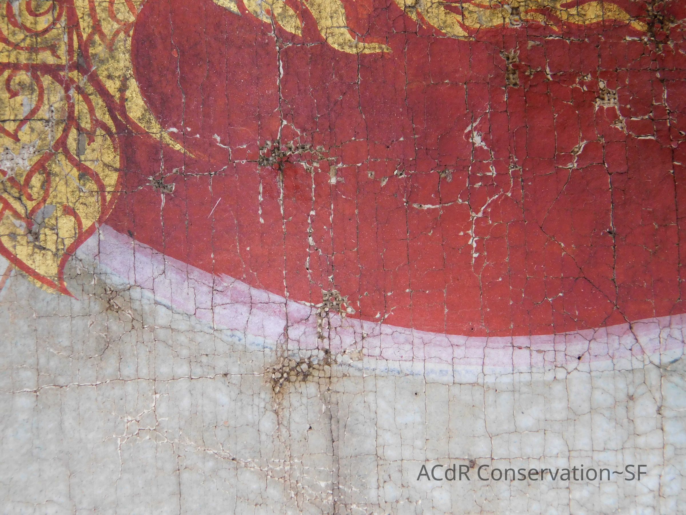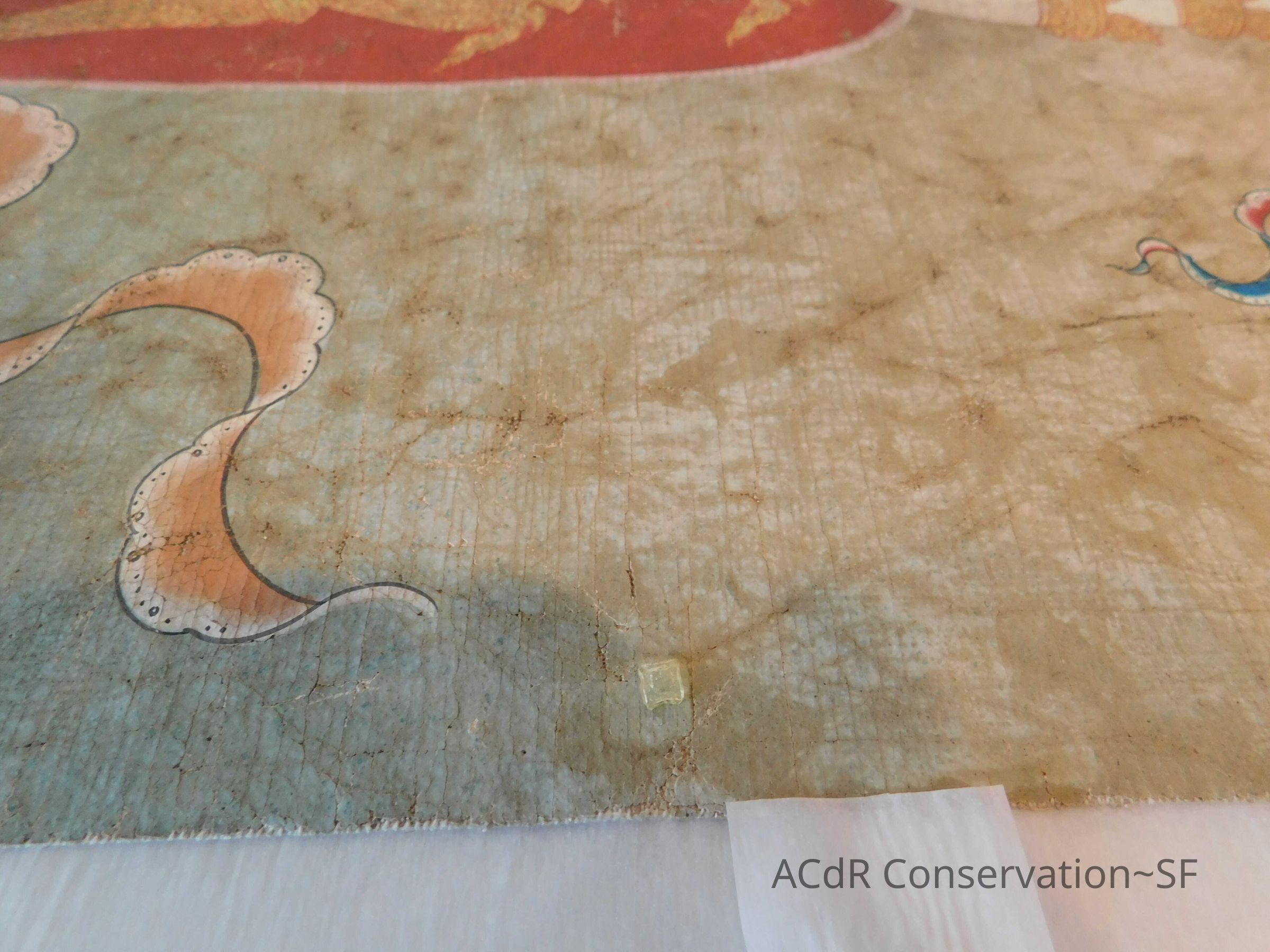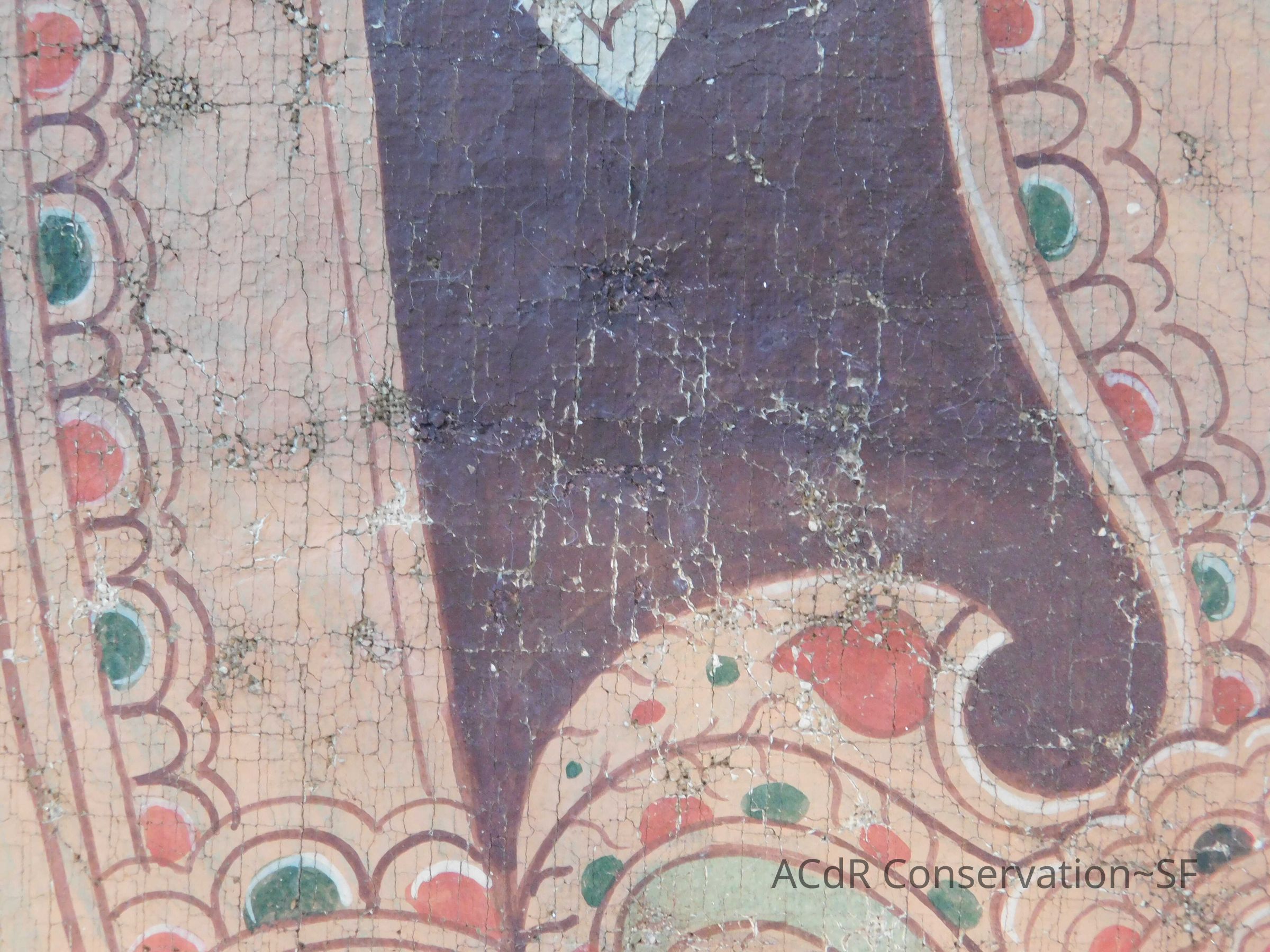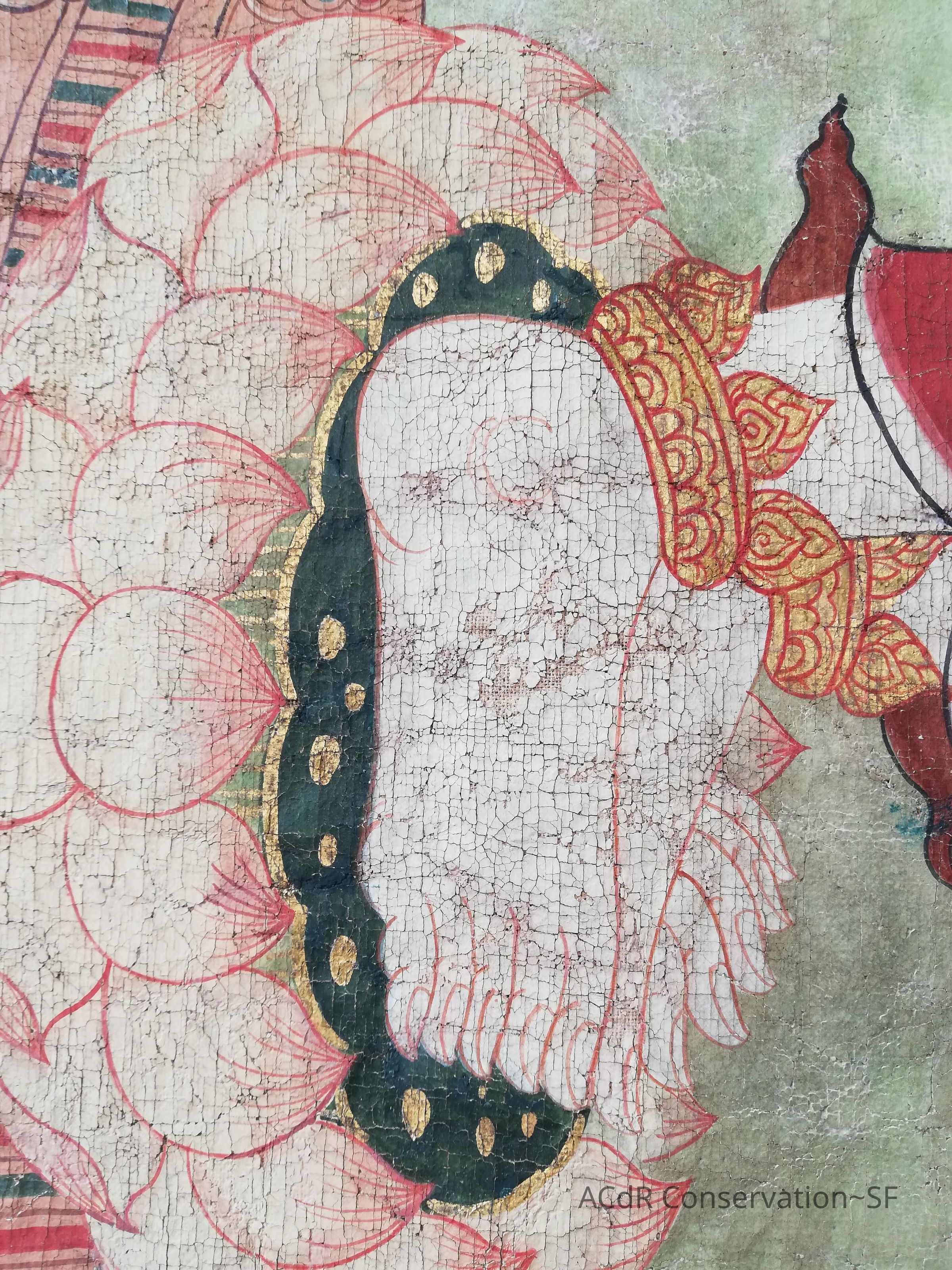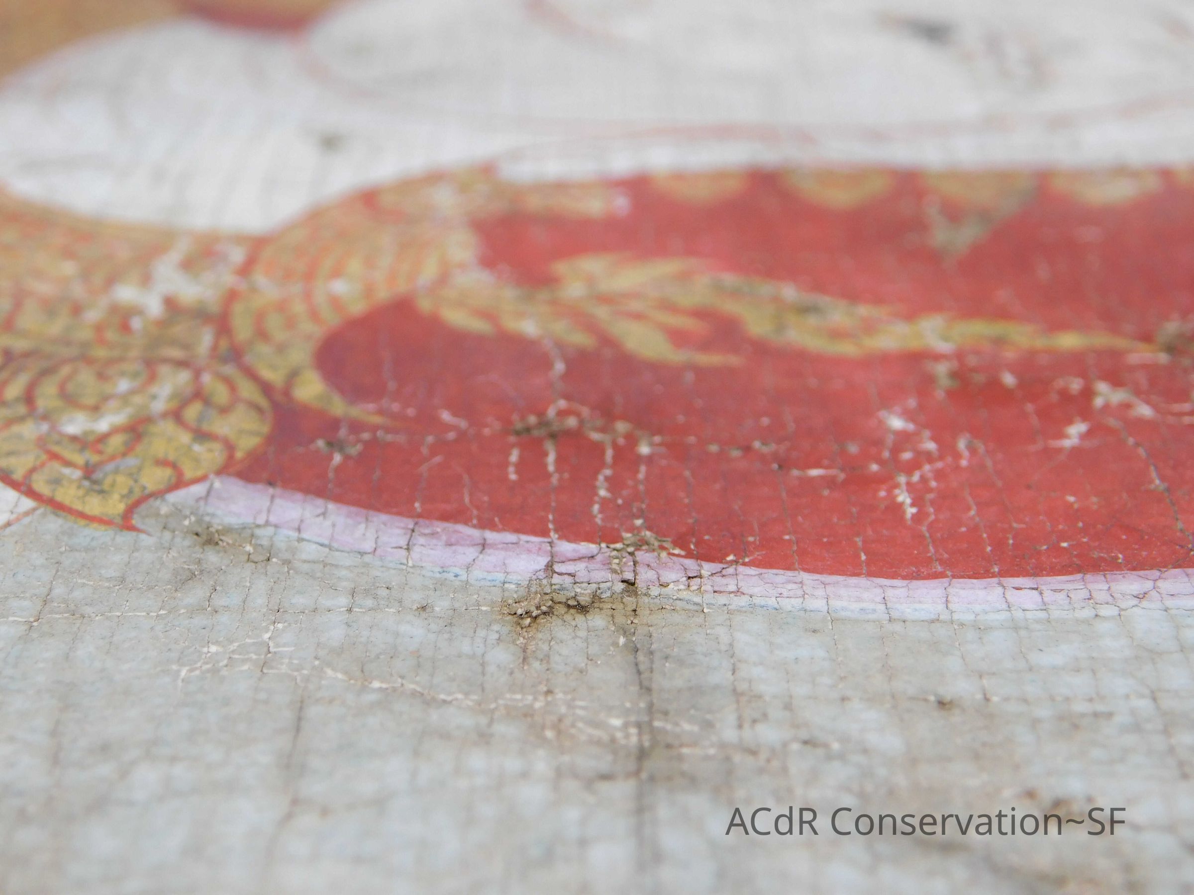 Paint layer consolidation with 3% Klucel in isoproyl on stand and feet area.