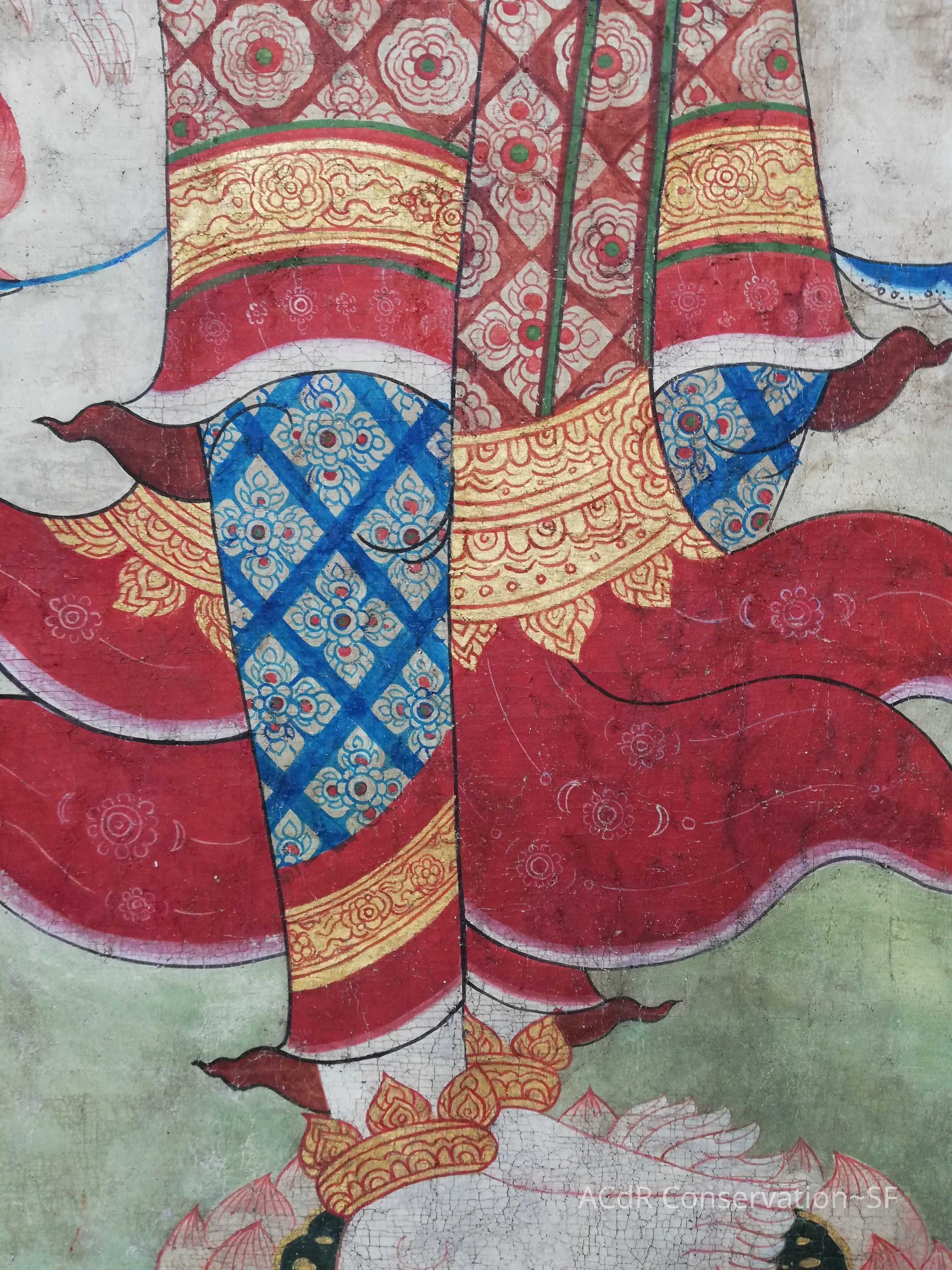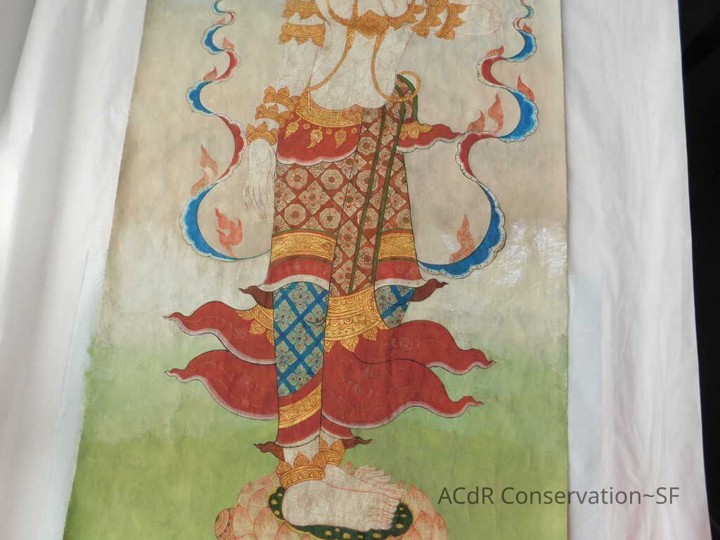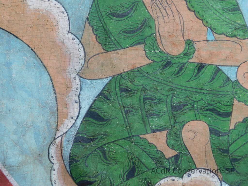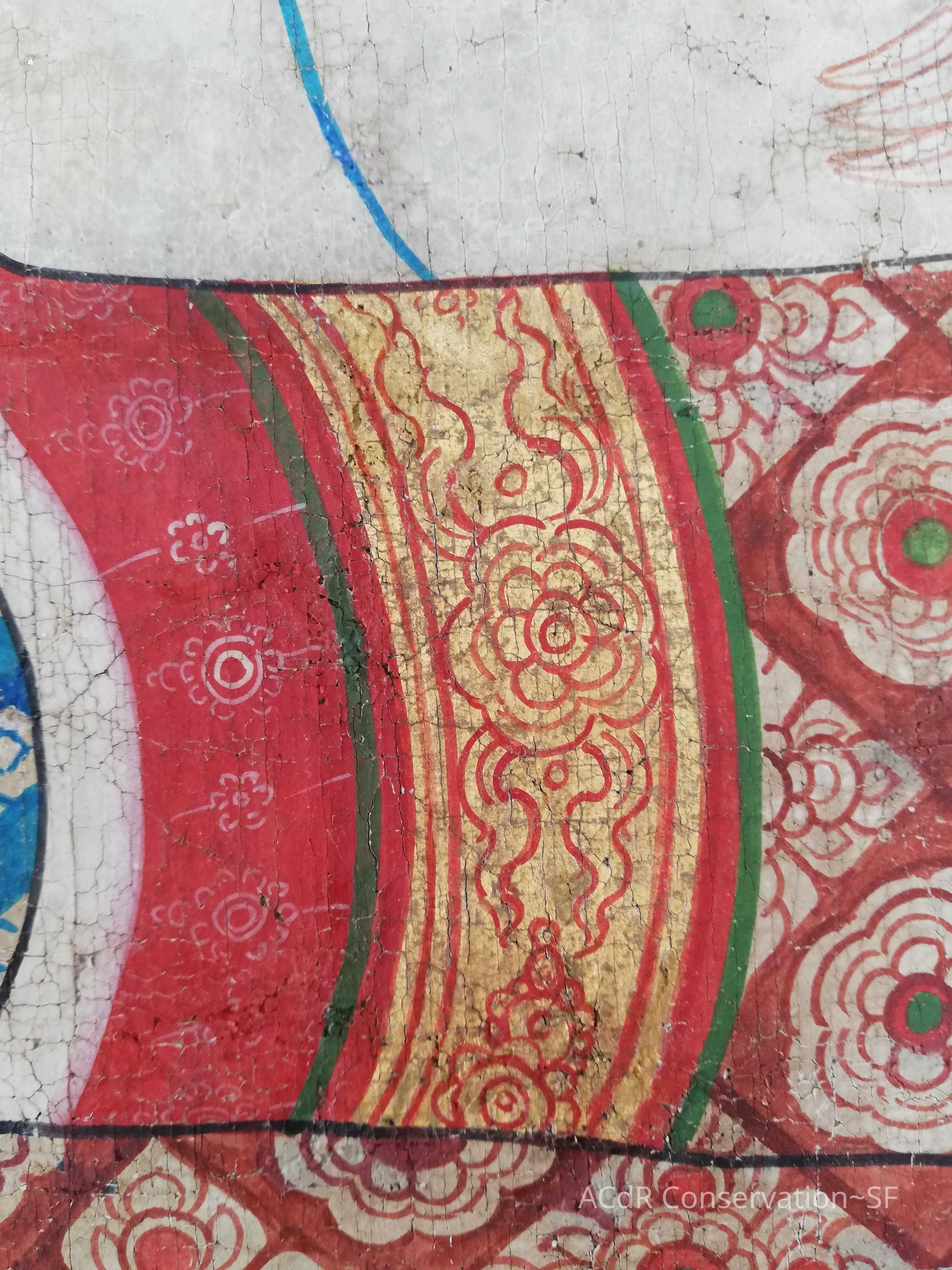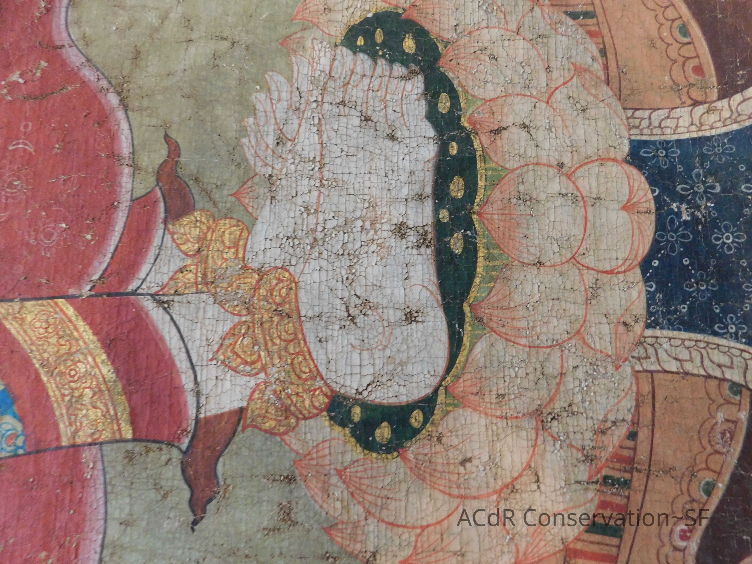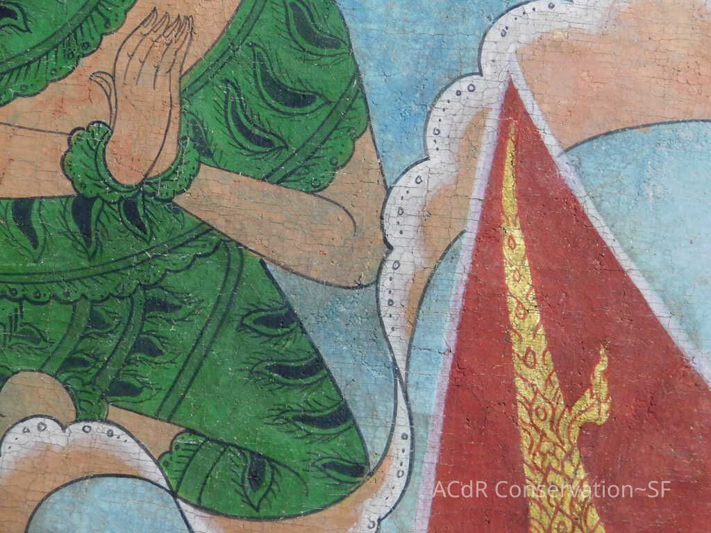 Paint layer consolidation with 3% Klucel in isoproyl on stand and feet area.