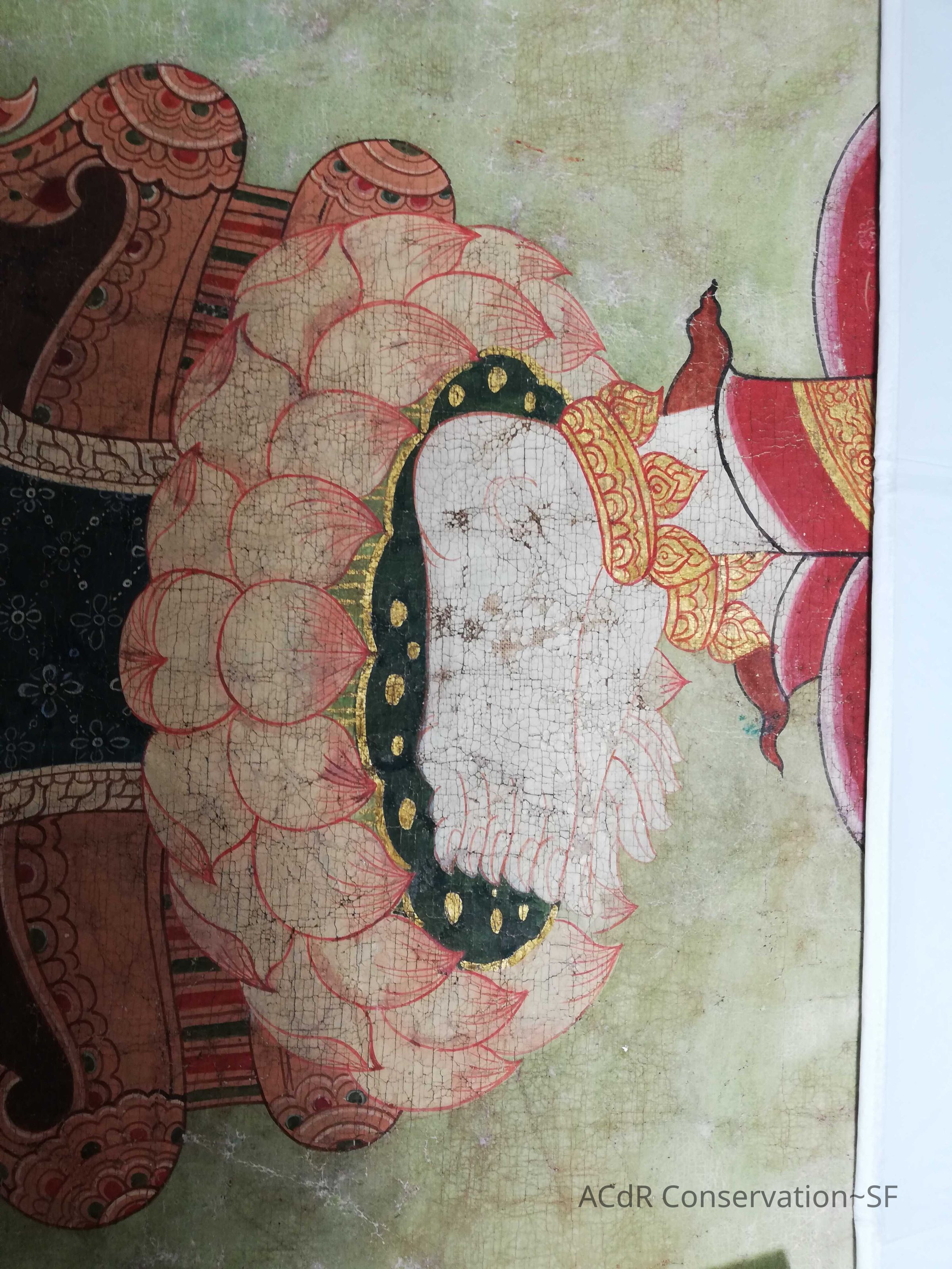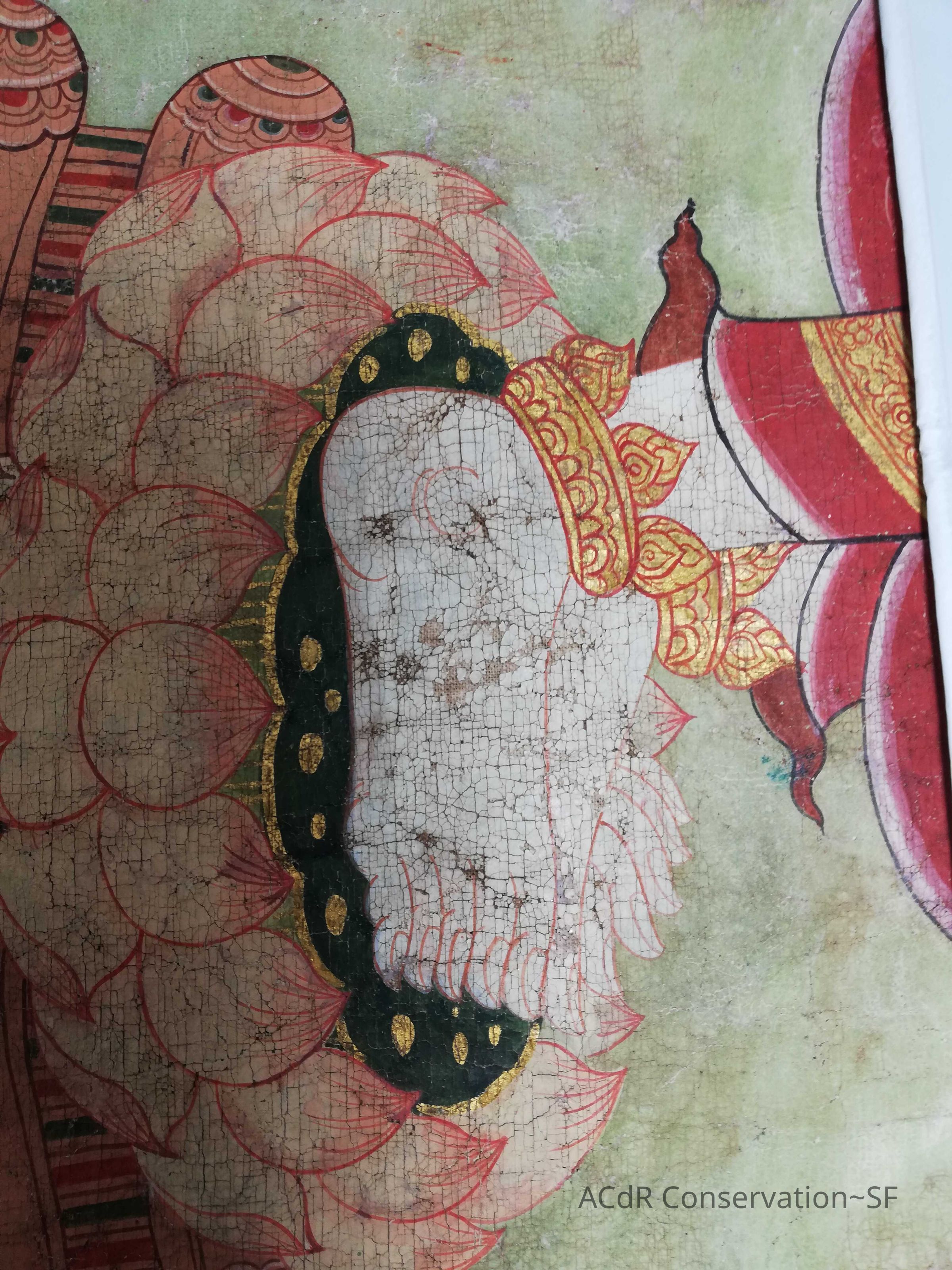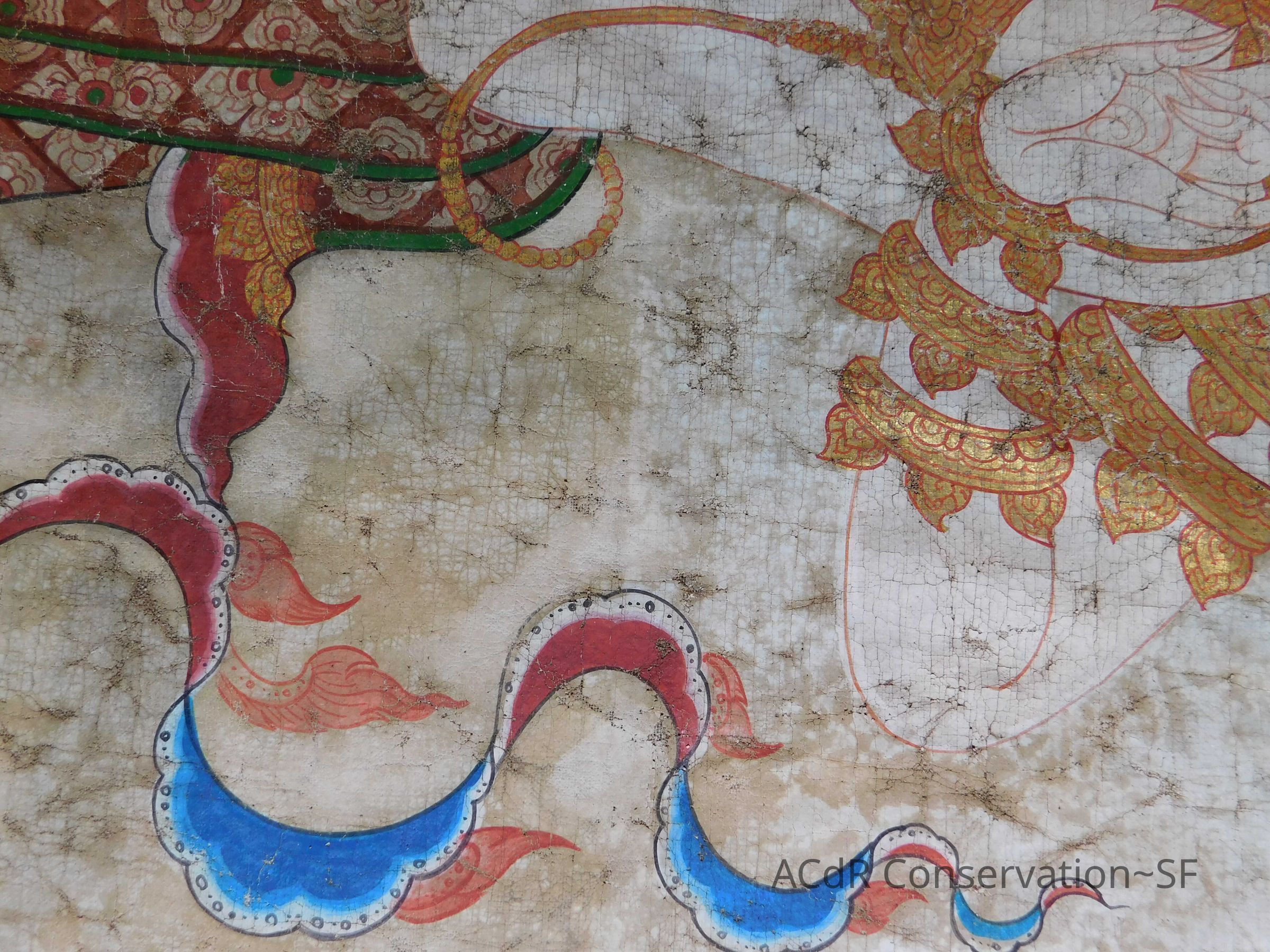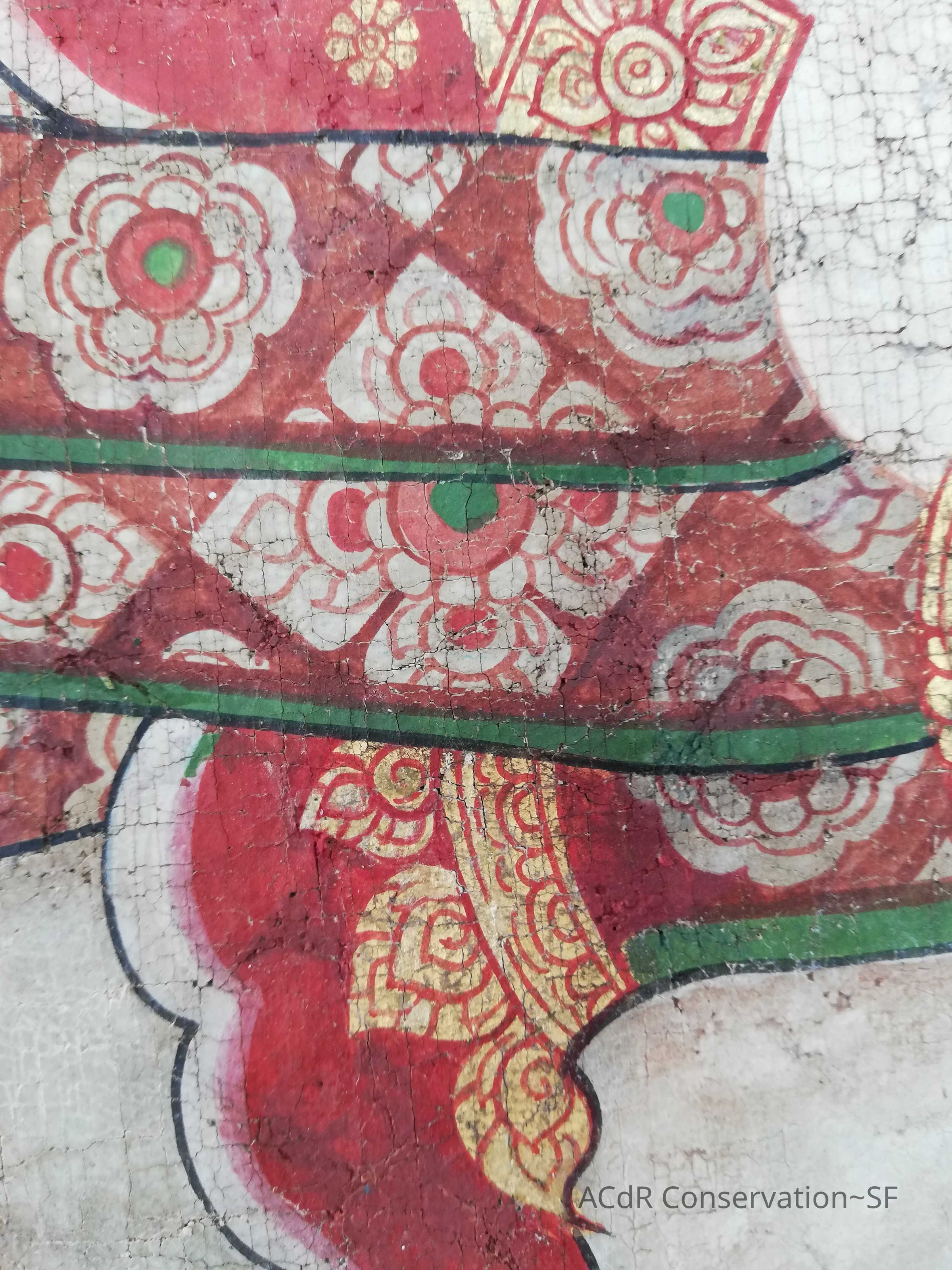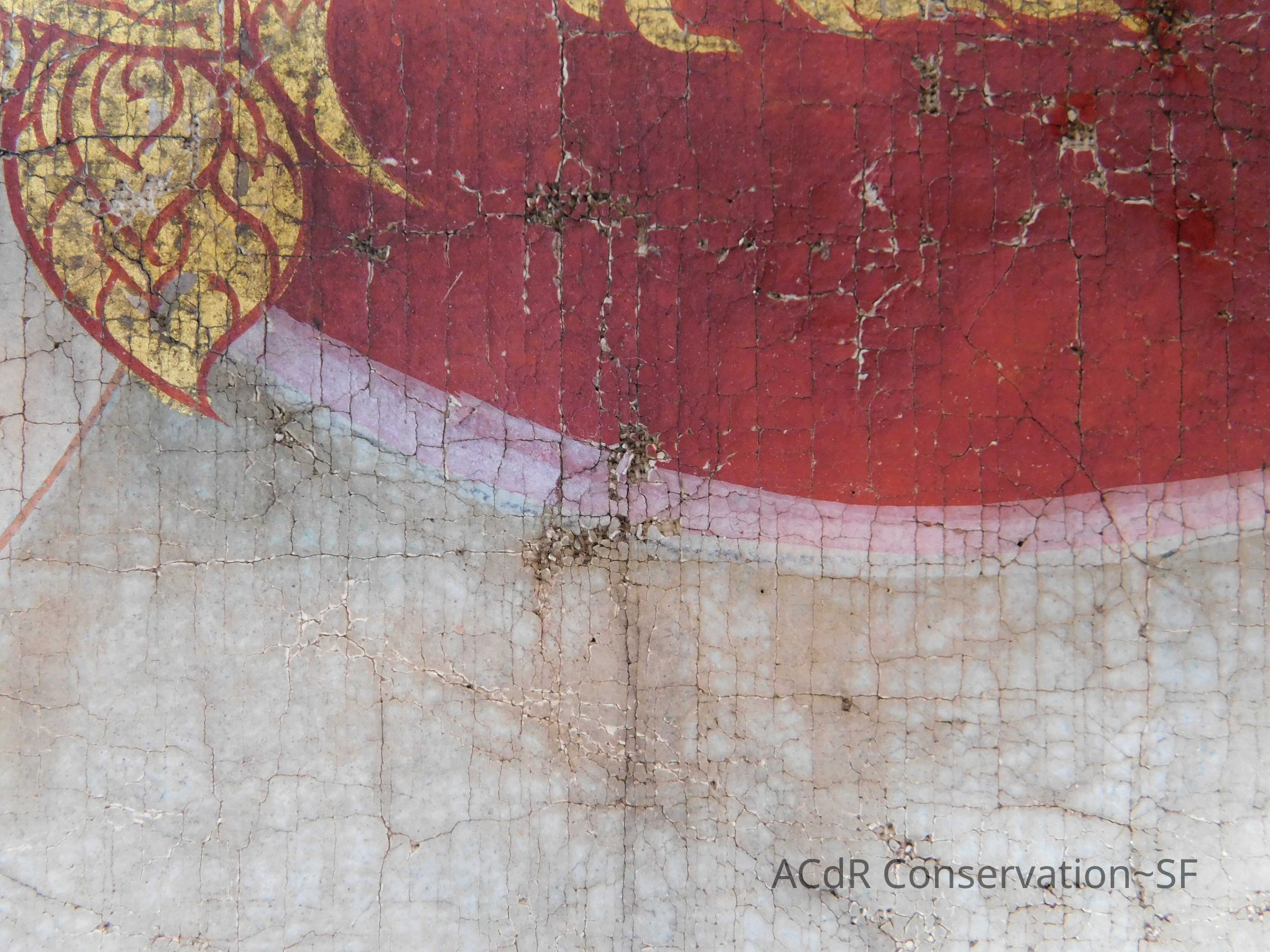 Paint layer consolidation with 3% Klucel in isoproyl on stand and feet area.