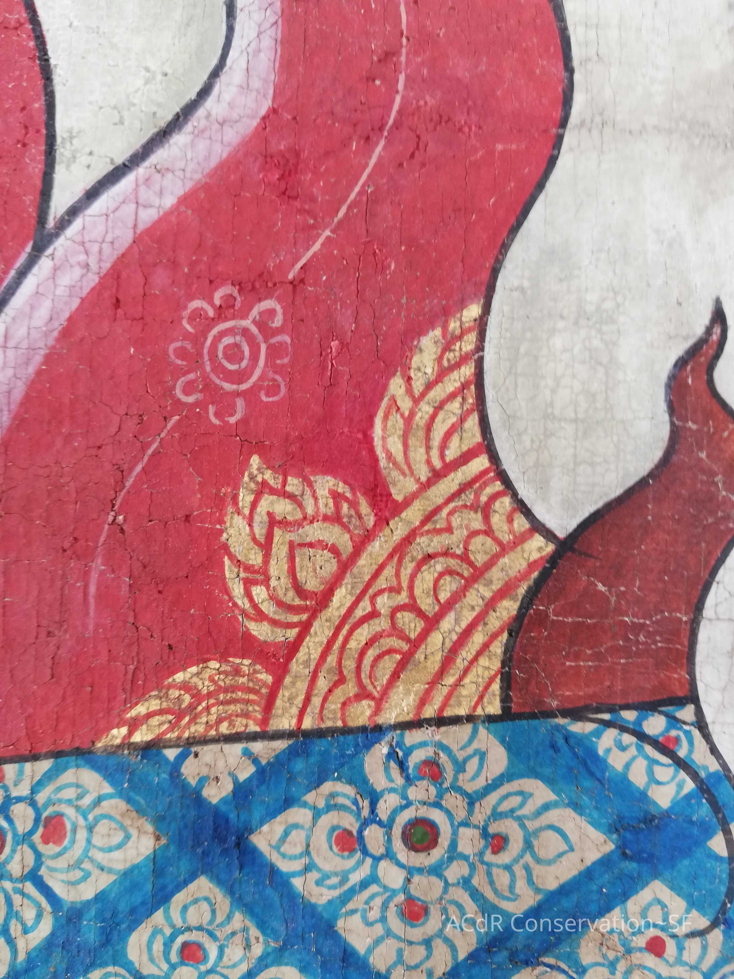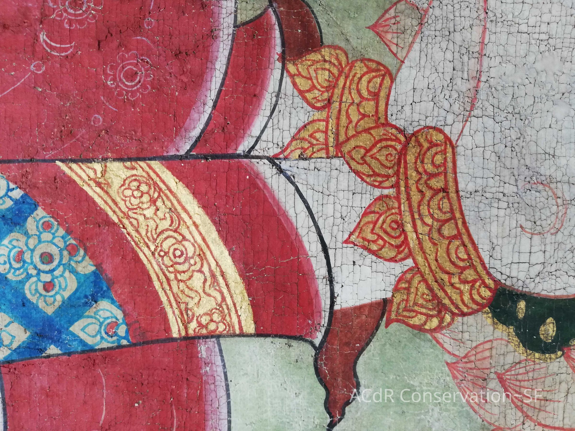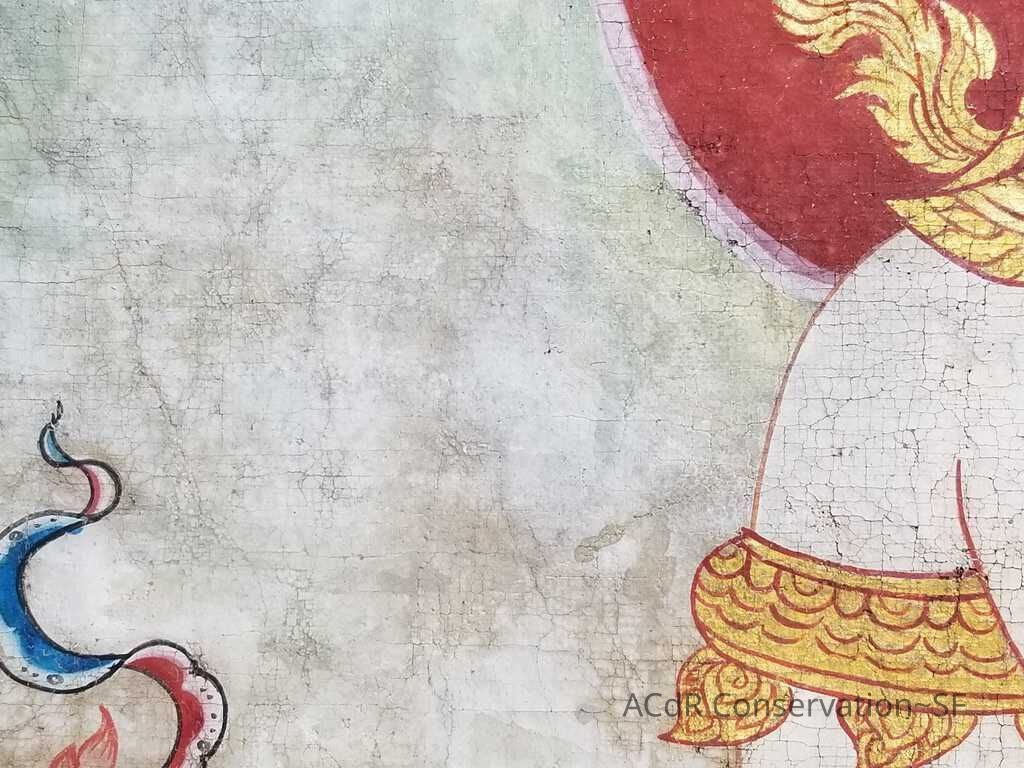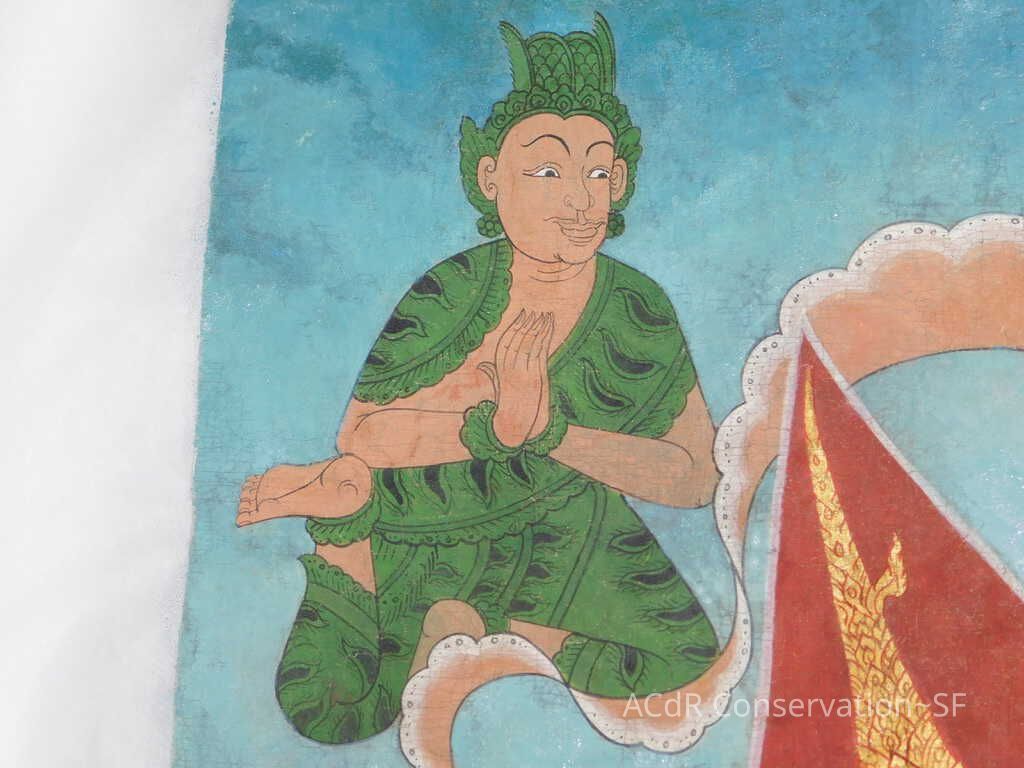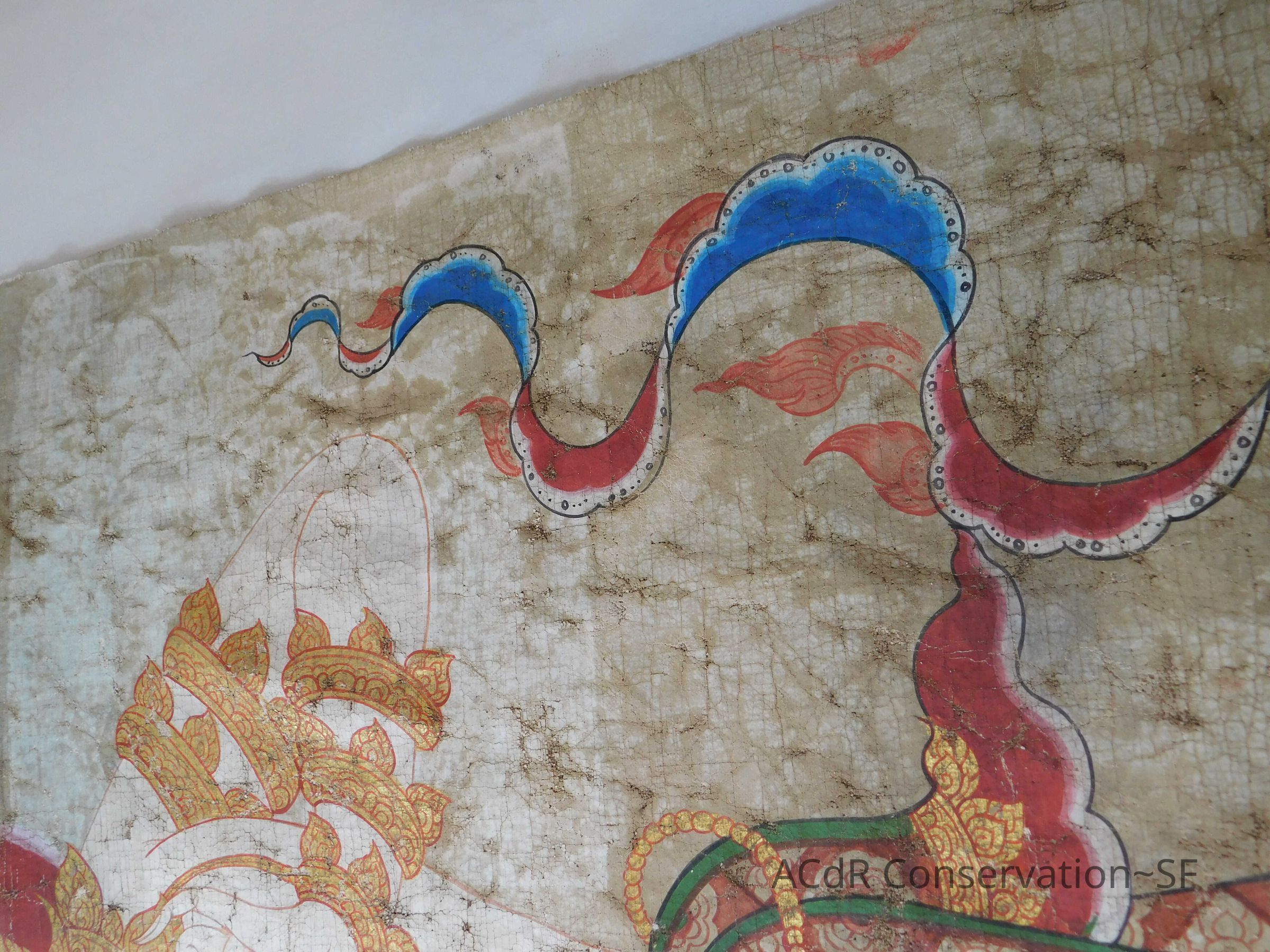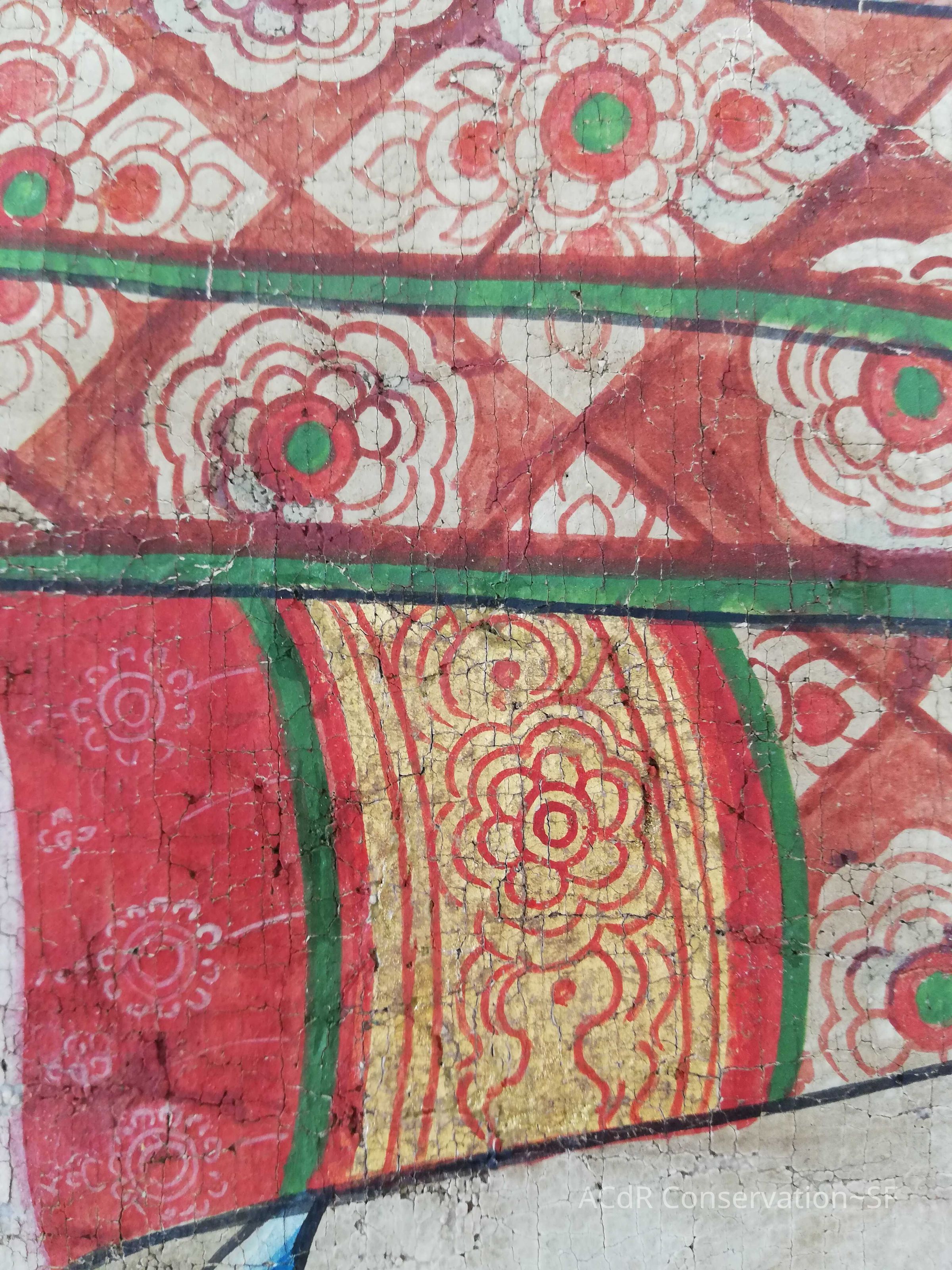 Paint layer consolidation with 3% Klucel in isoproyl on stand and feet area.