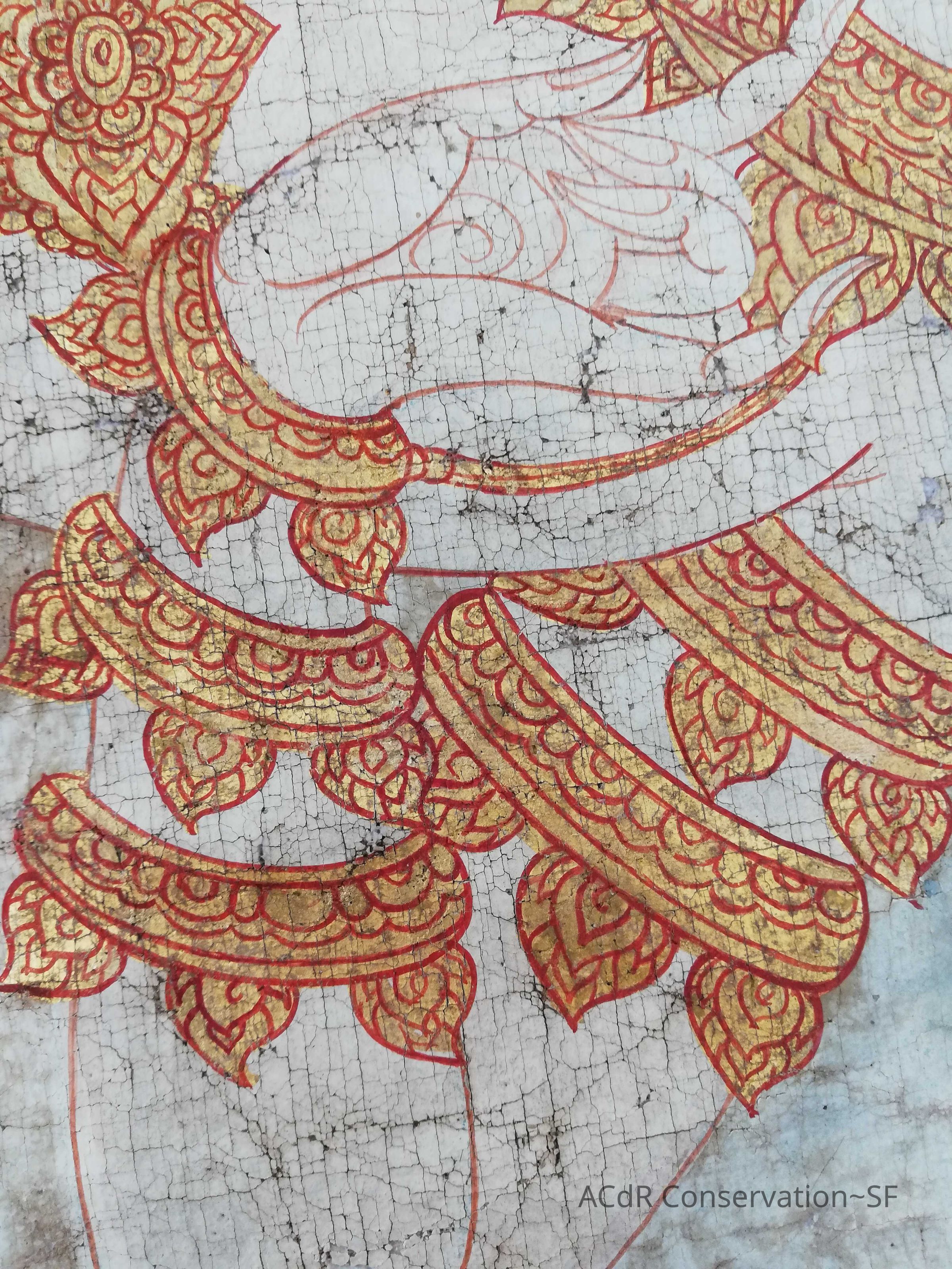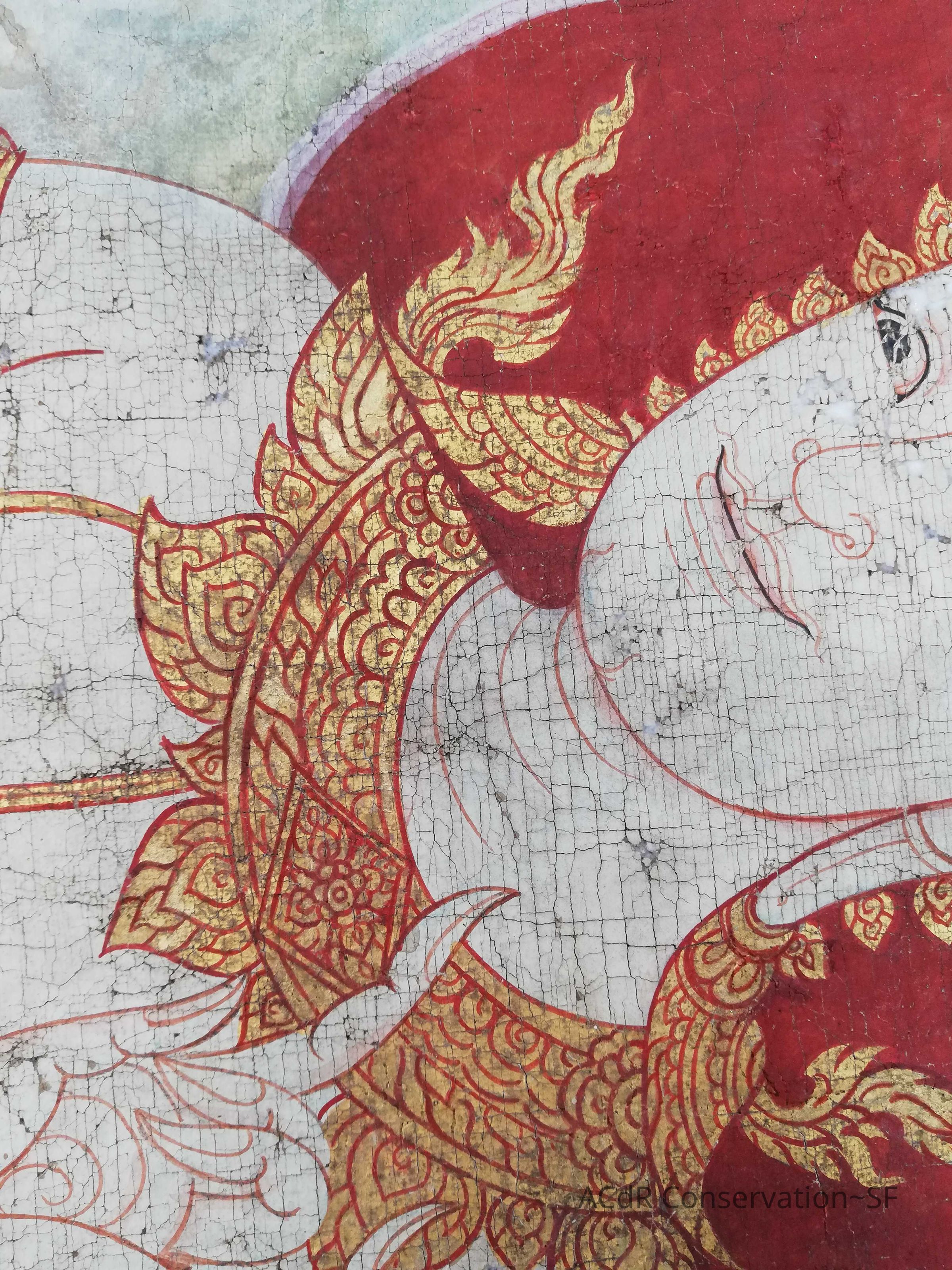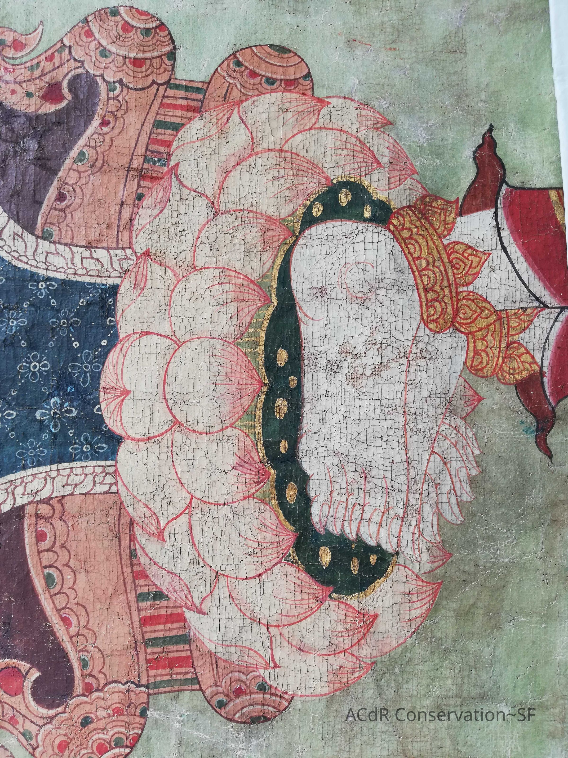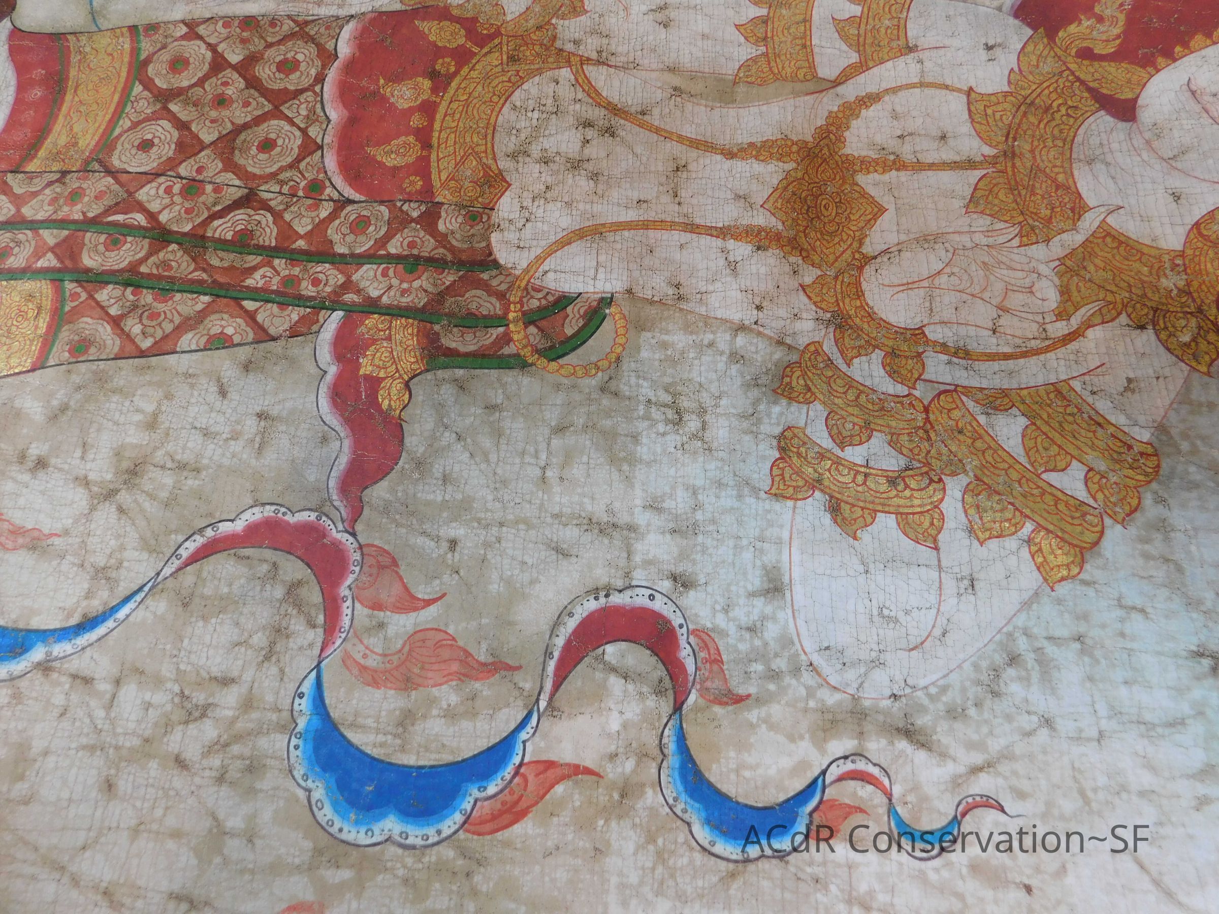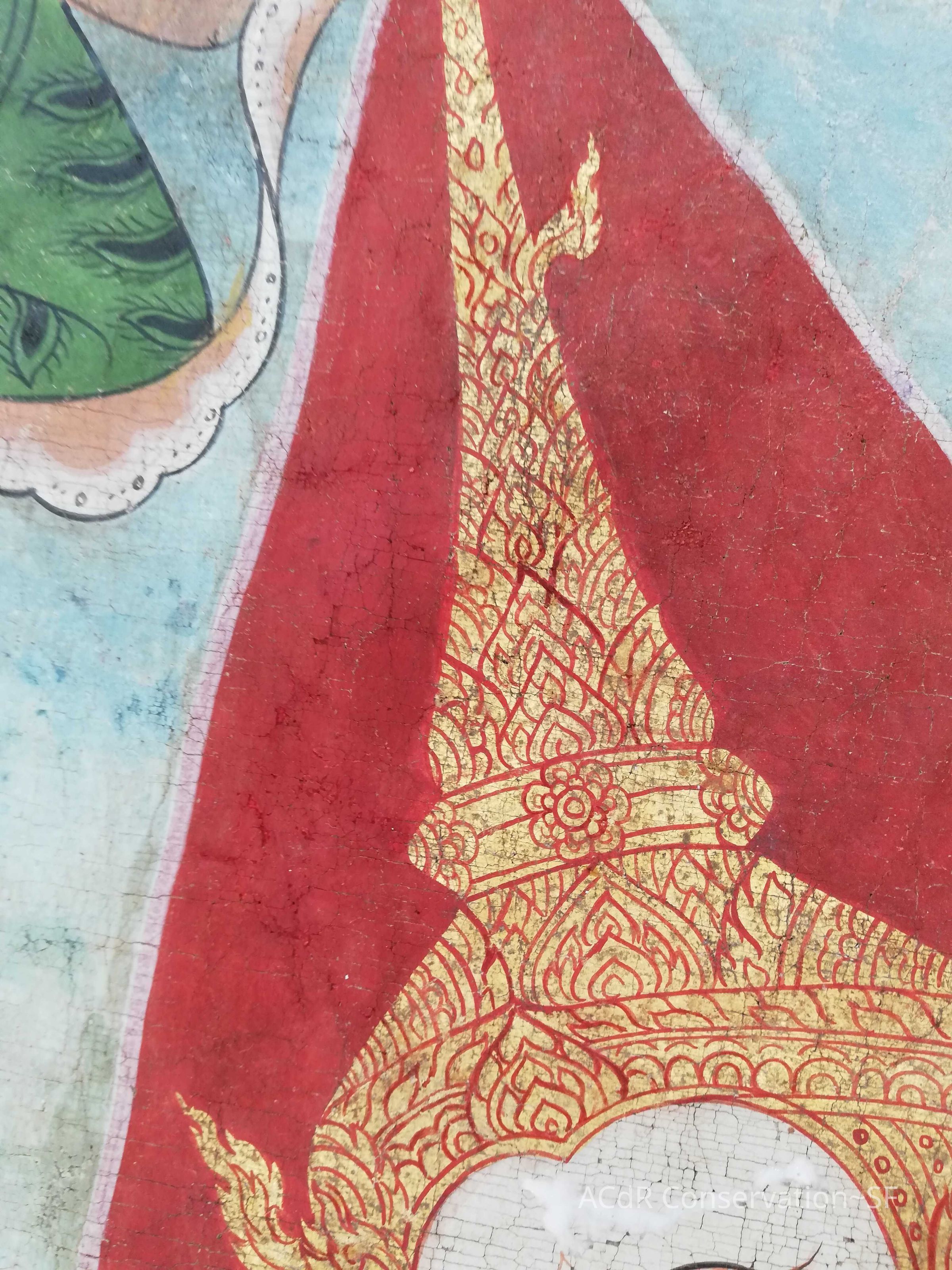 Paint layer consolidation with 3% Klucel in isoproyl on stand and feet area.