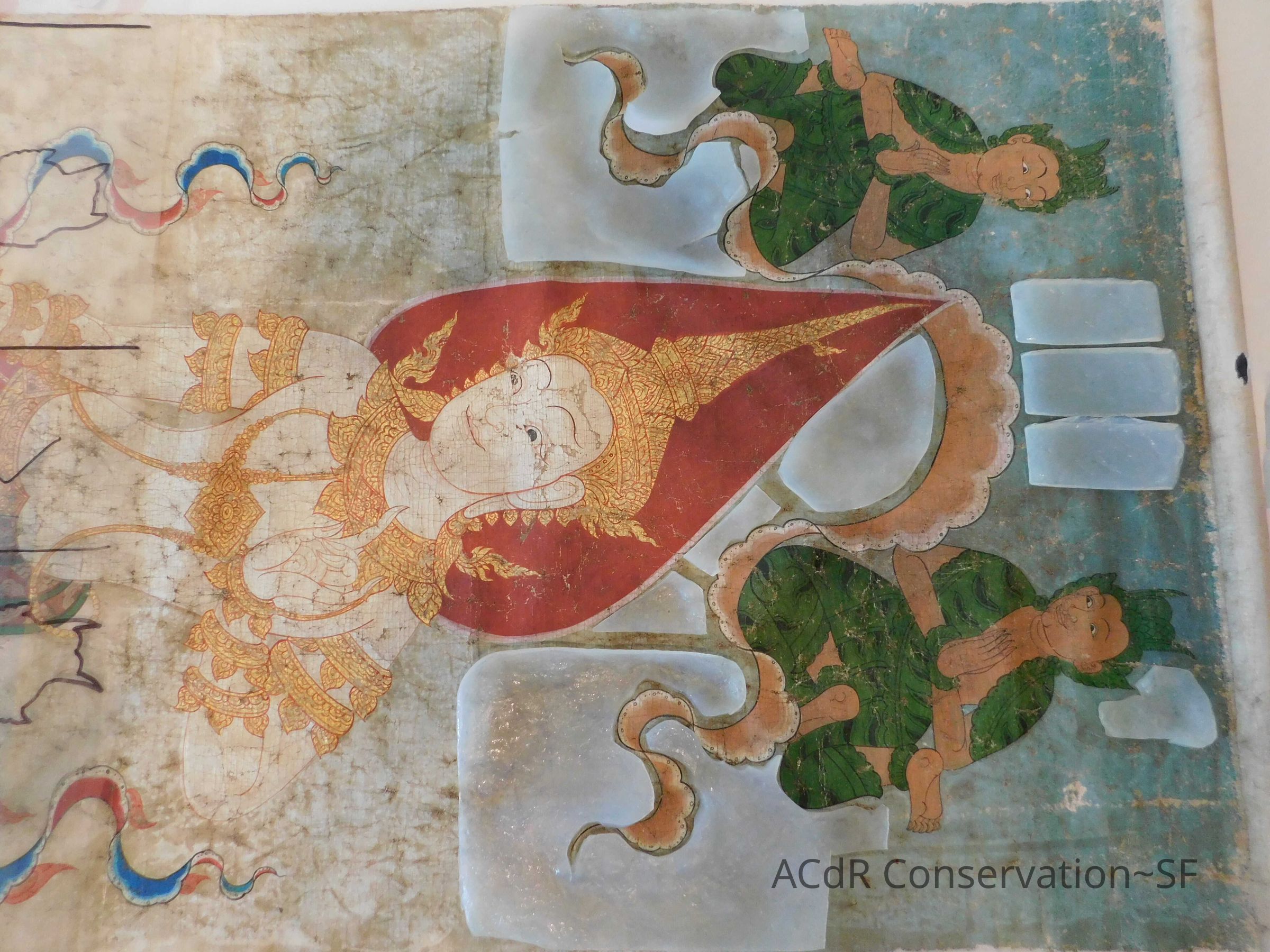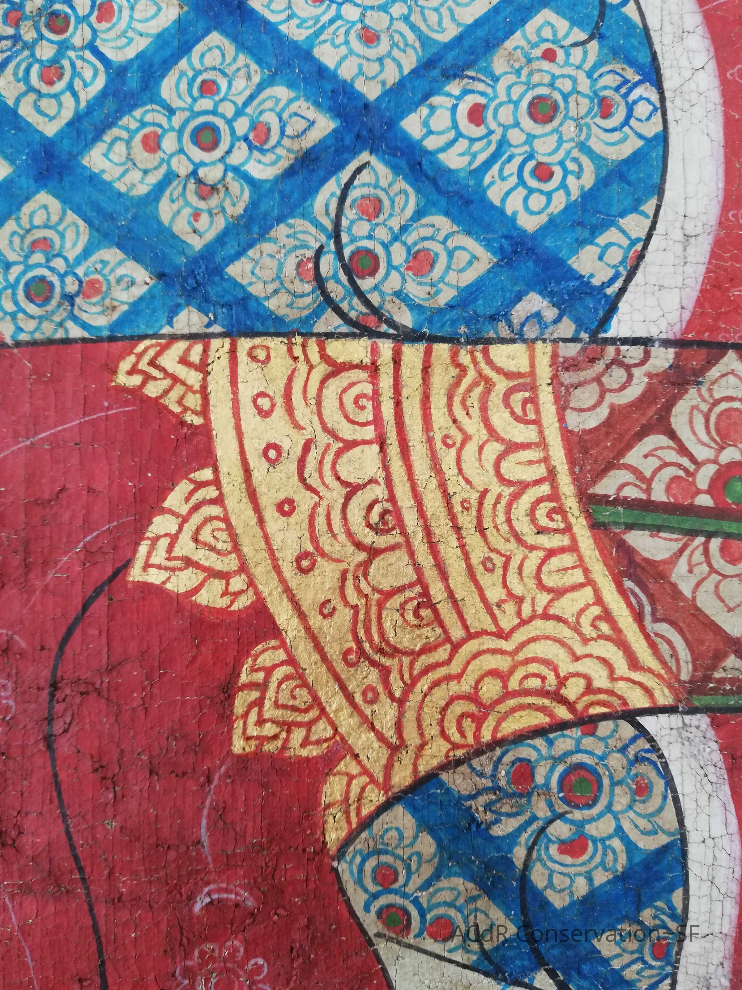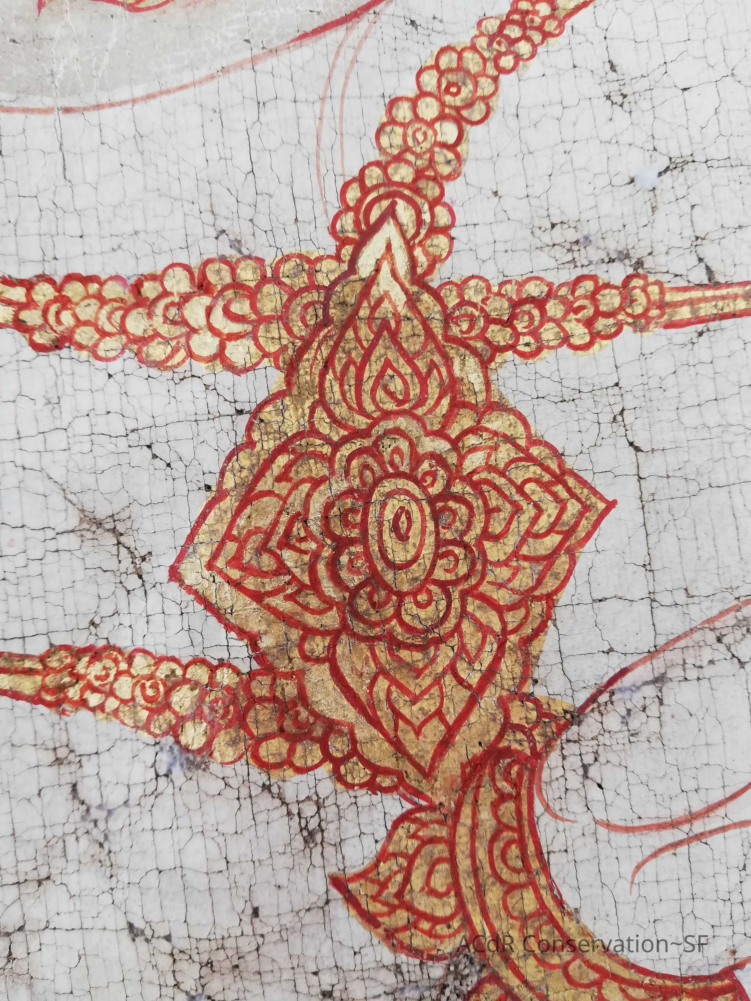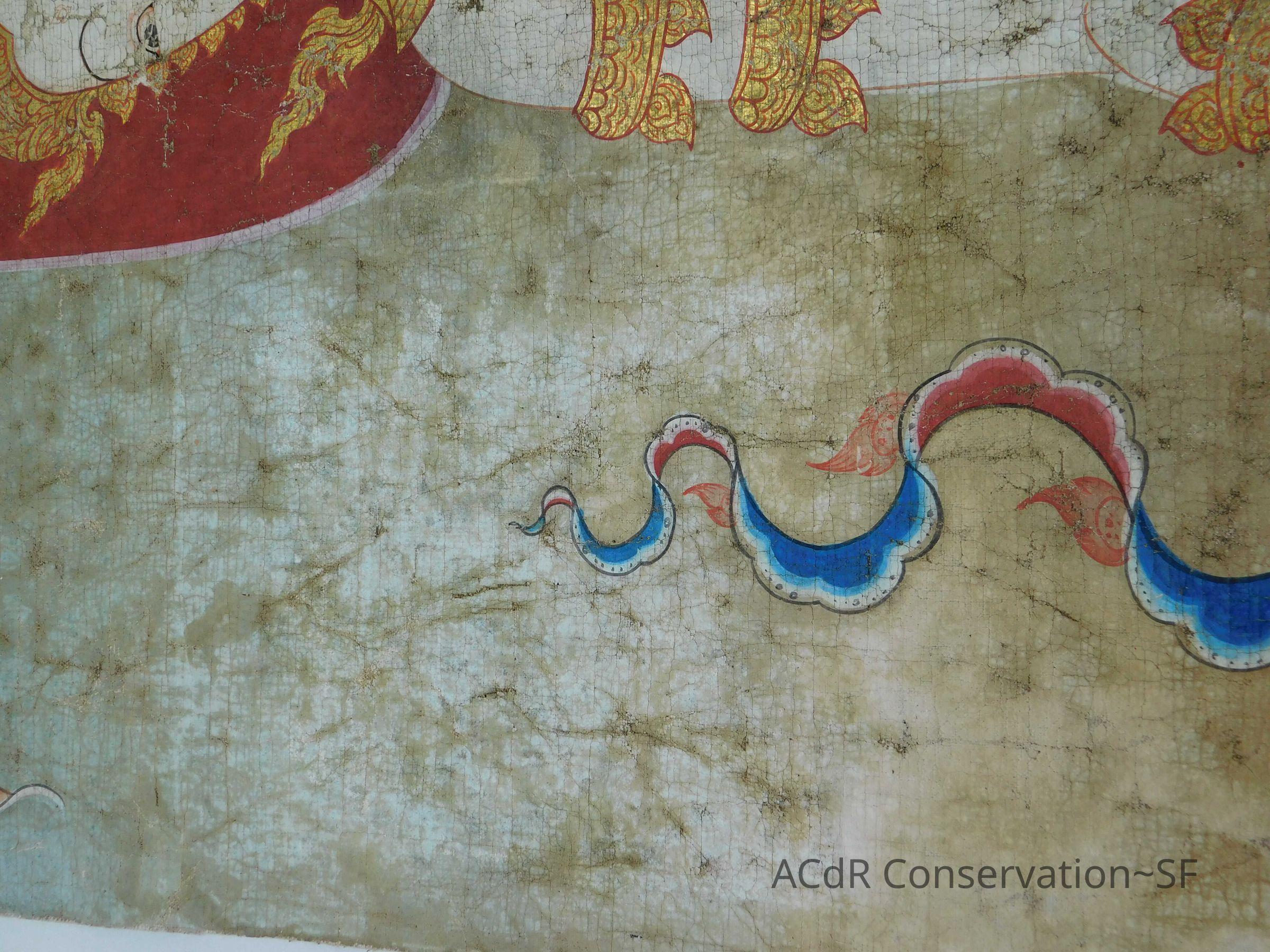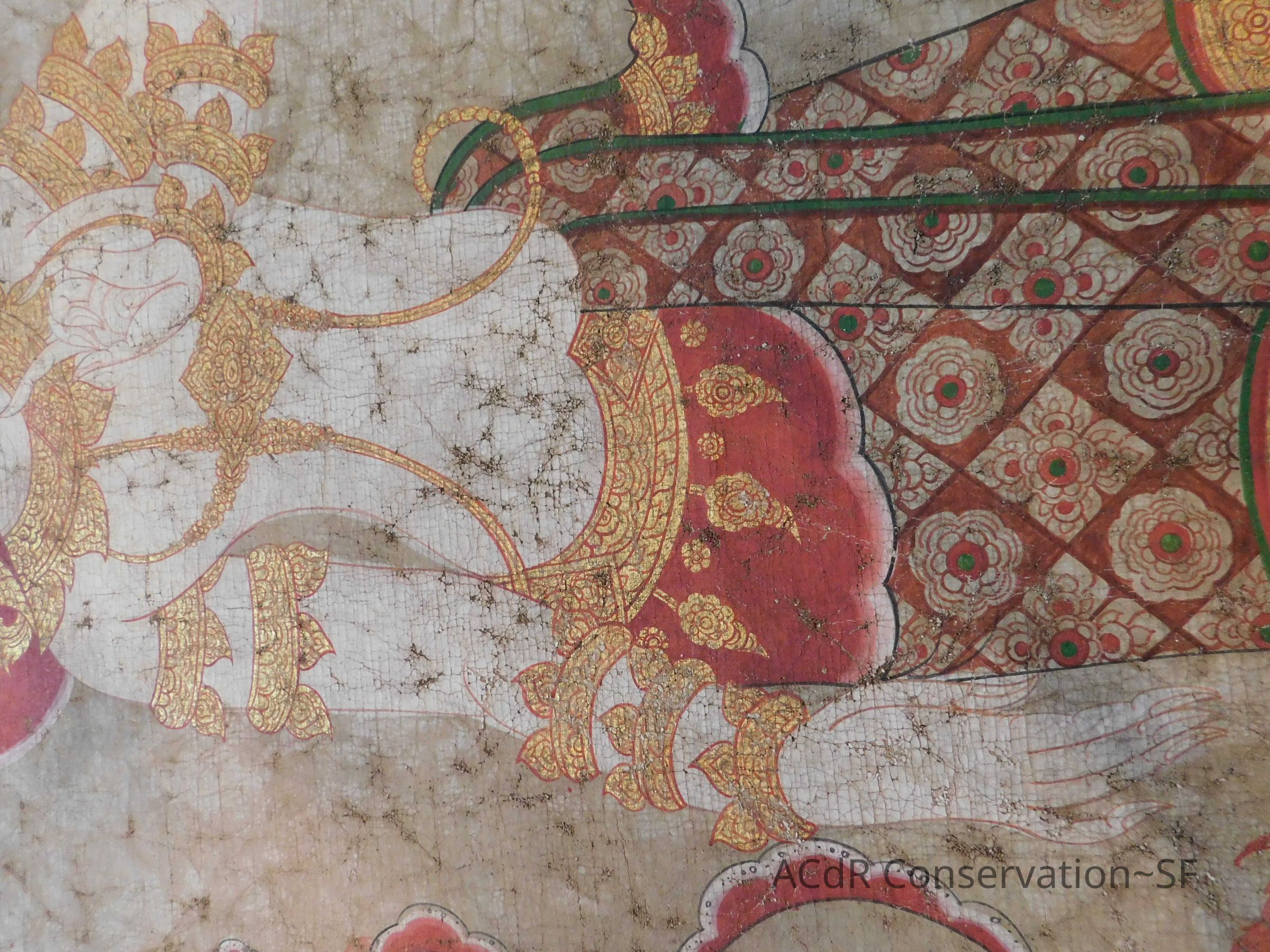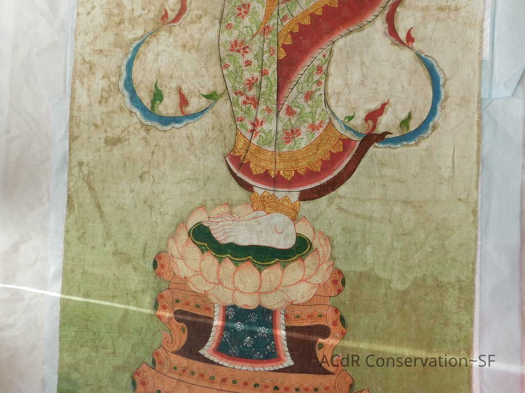 Paint layer consolidation with 3% Klucel in isoproyl on stand and feet area.