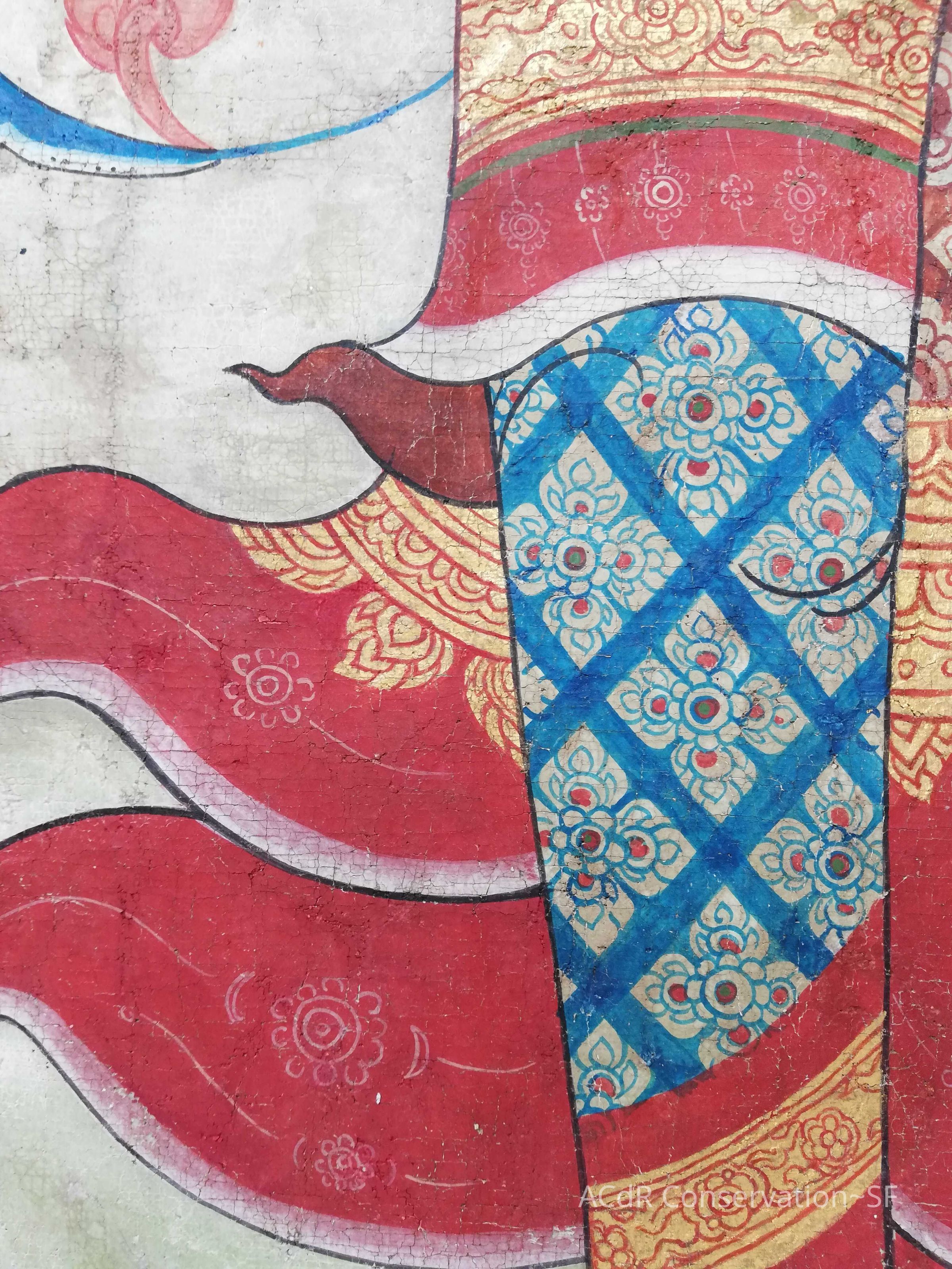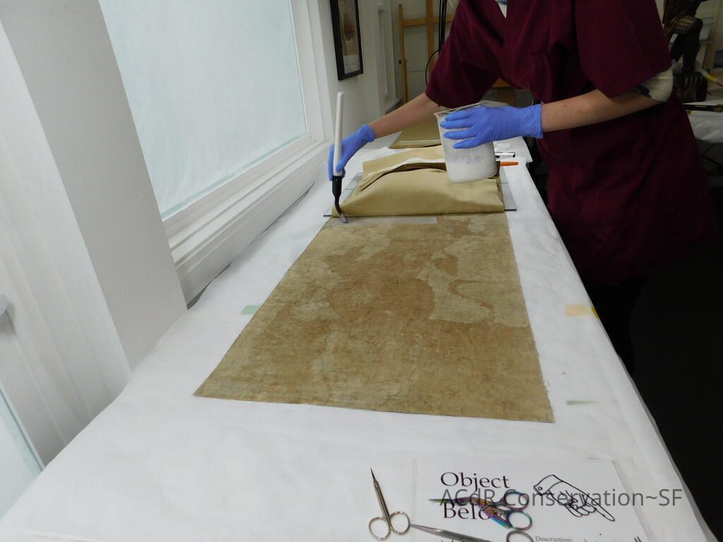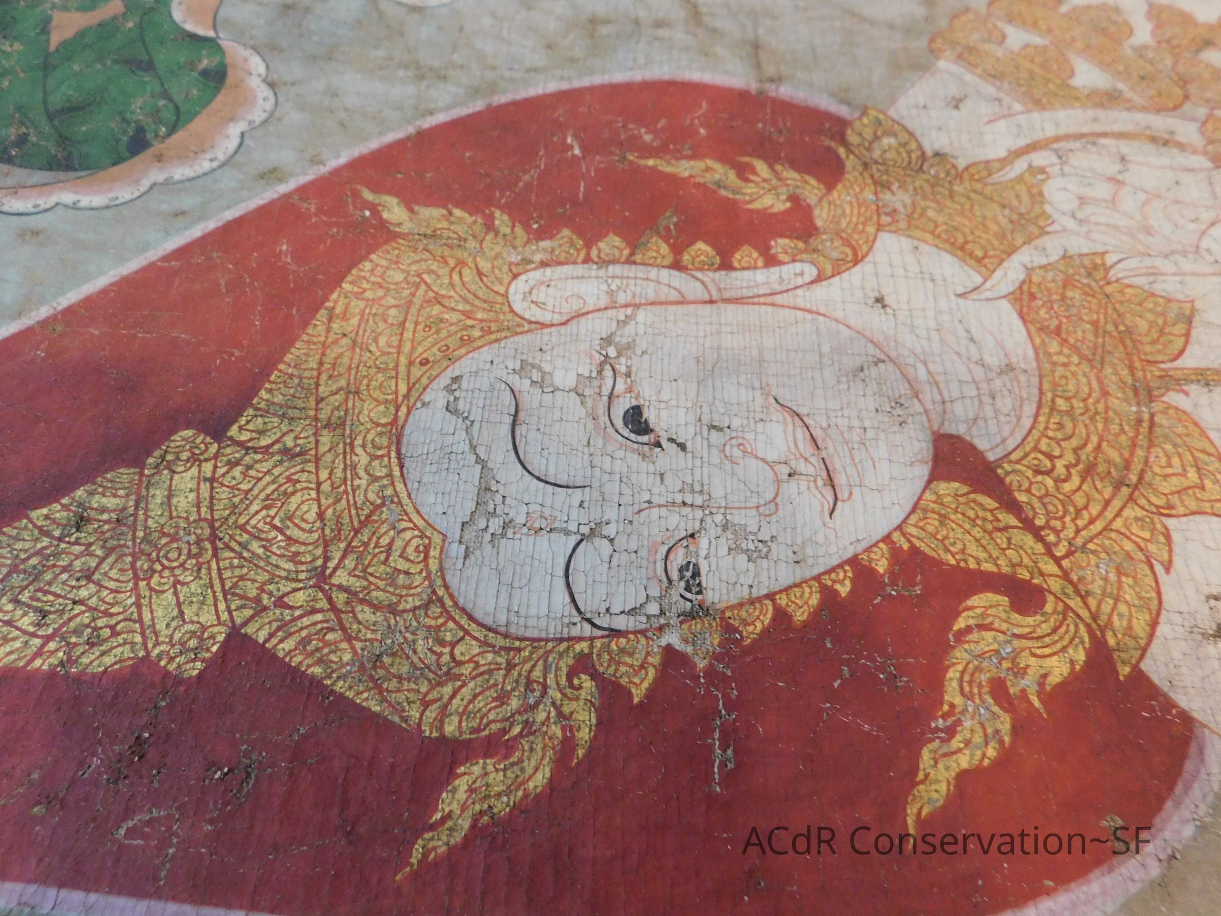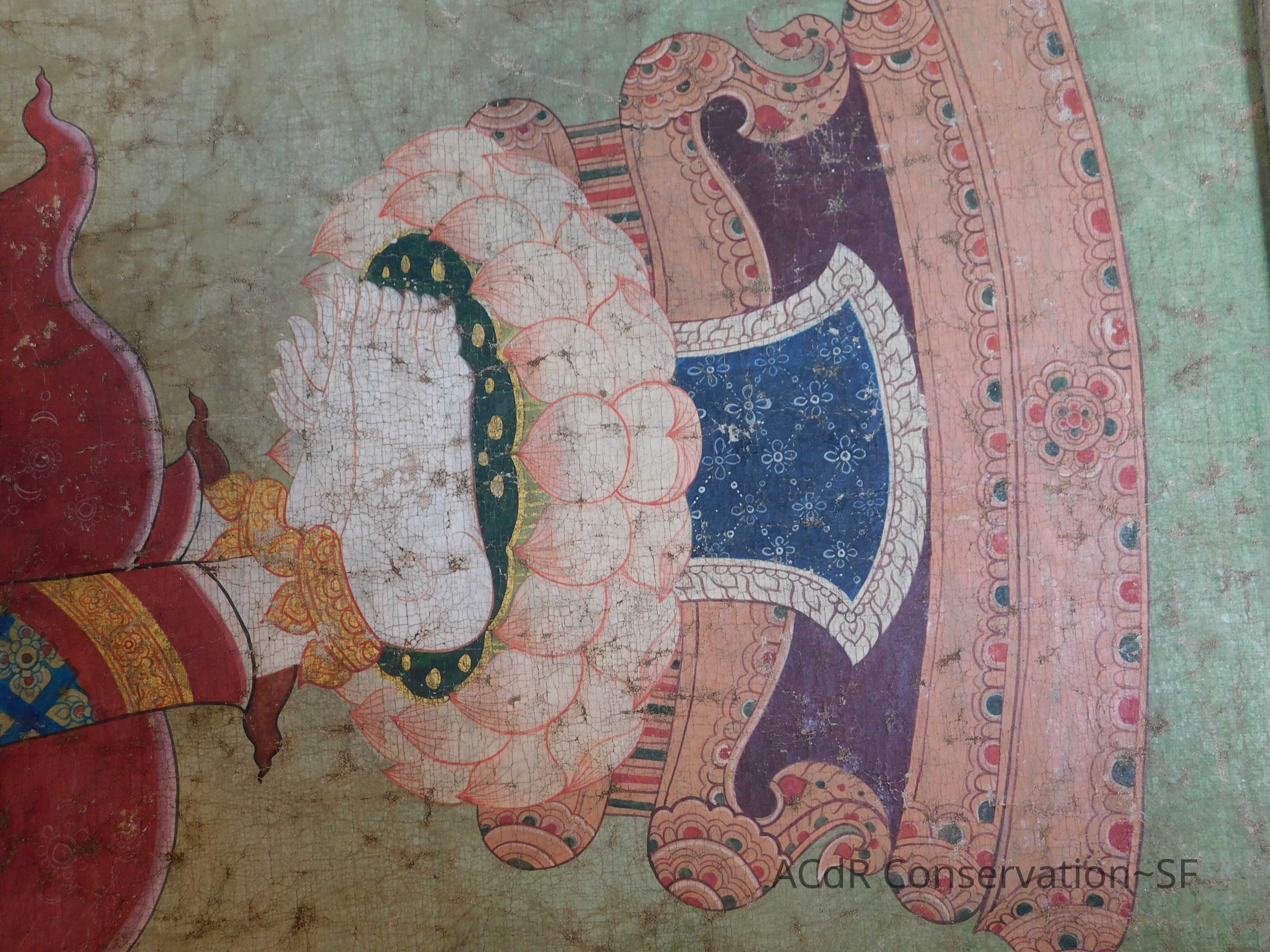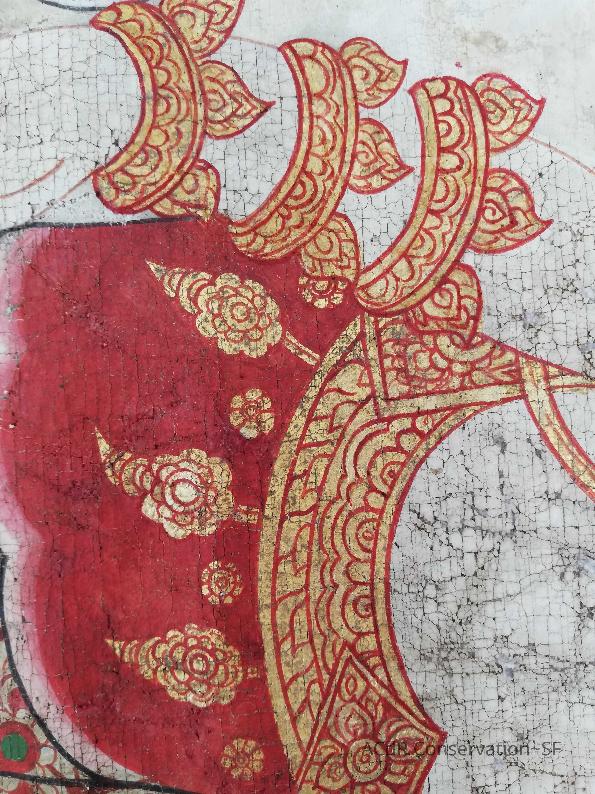 Paint layer consolidation with 3% Klucel in isoproyl on stand and feet area.