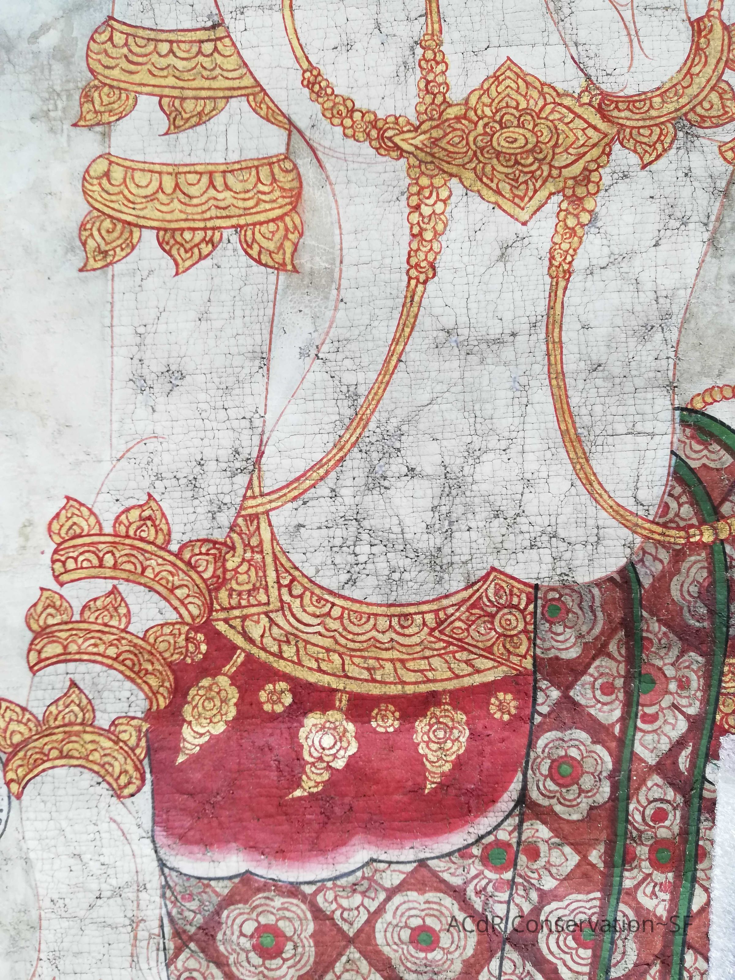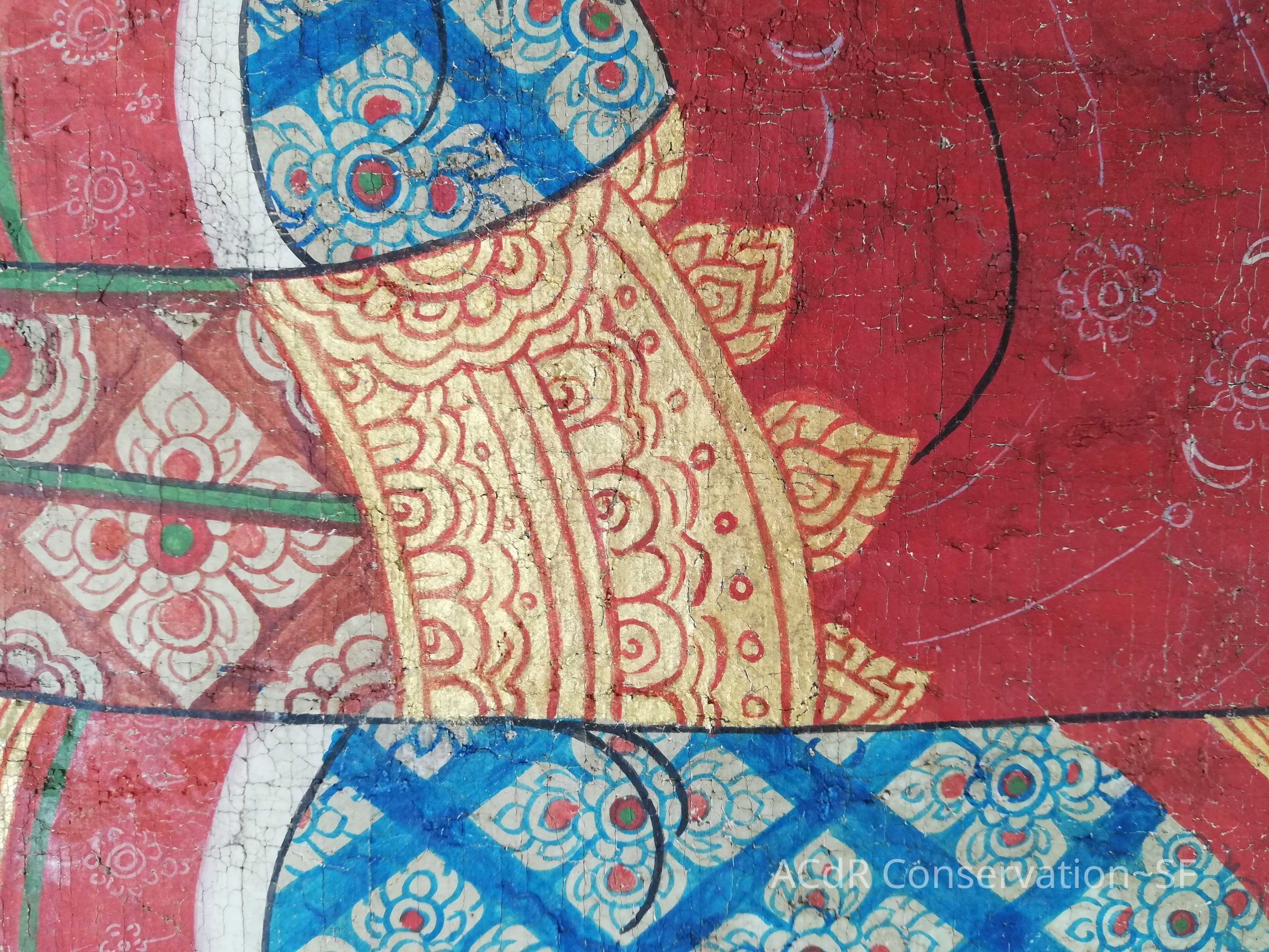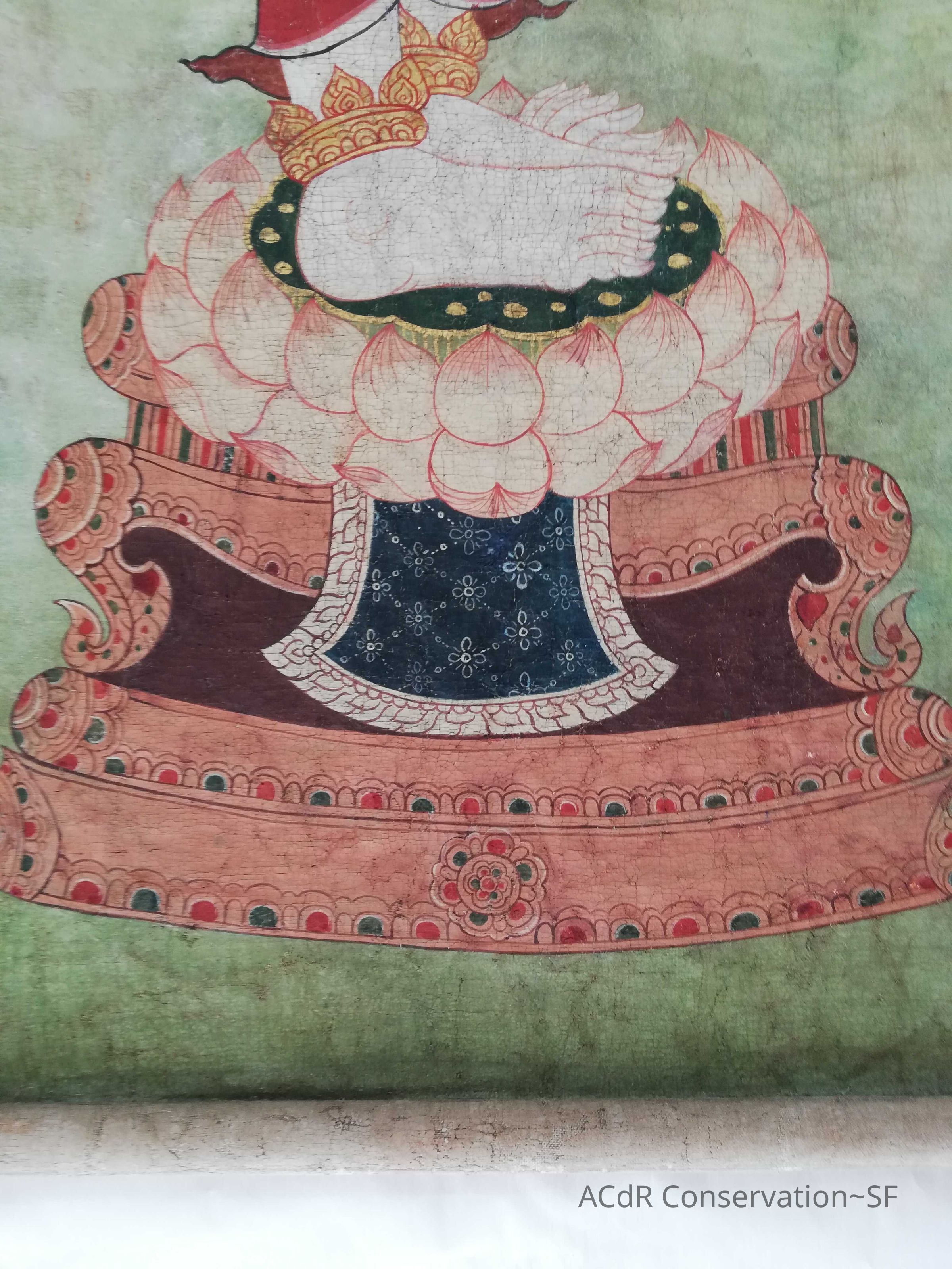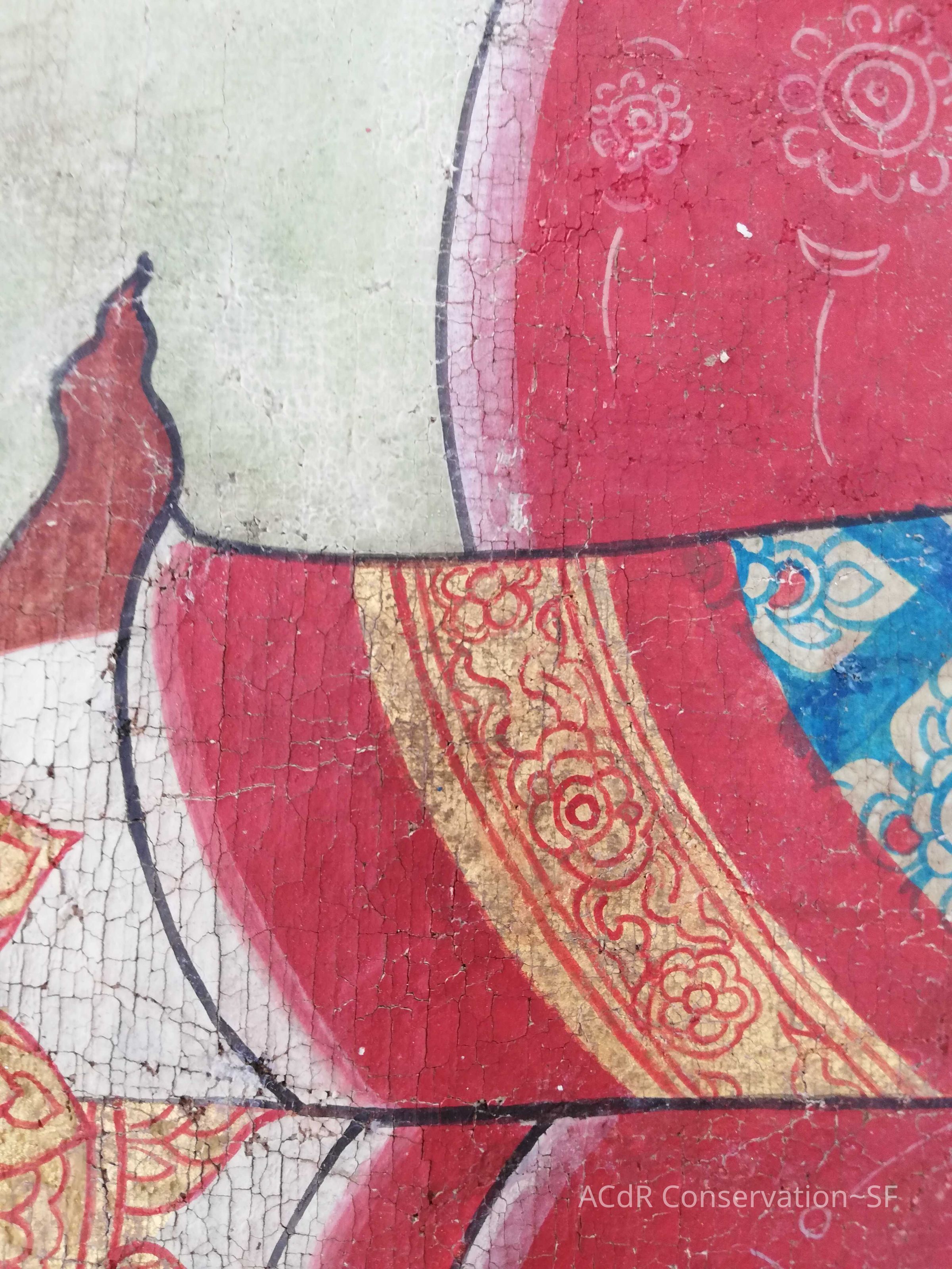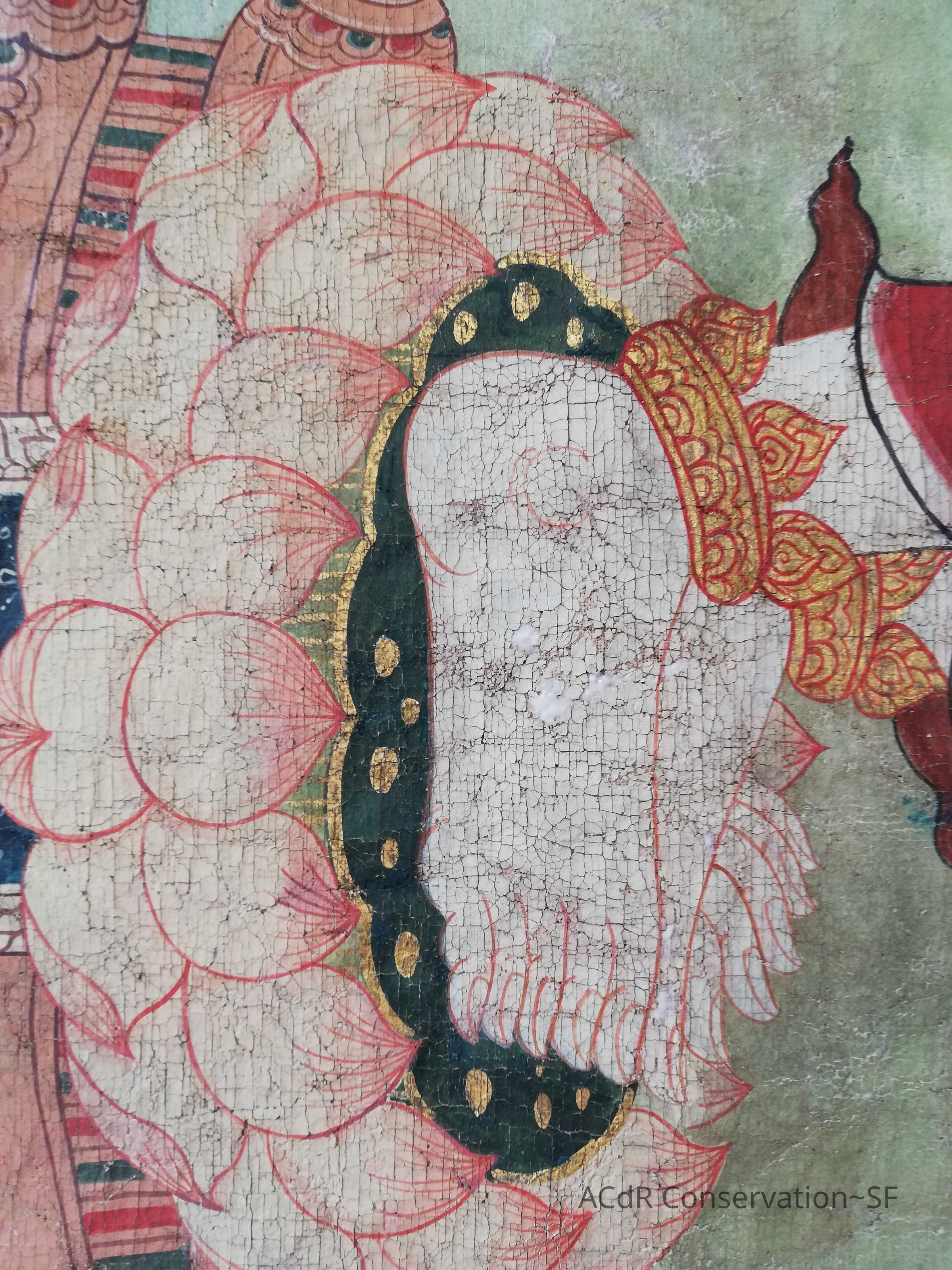 Paint layer consolidation with 3% Klucel in isoproyl on stand and feet area.