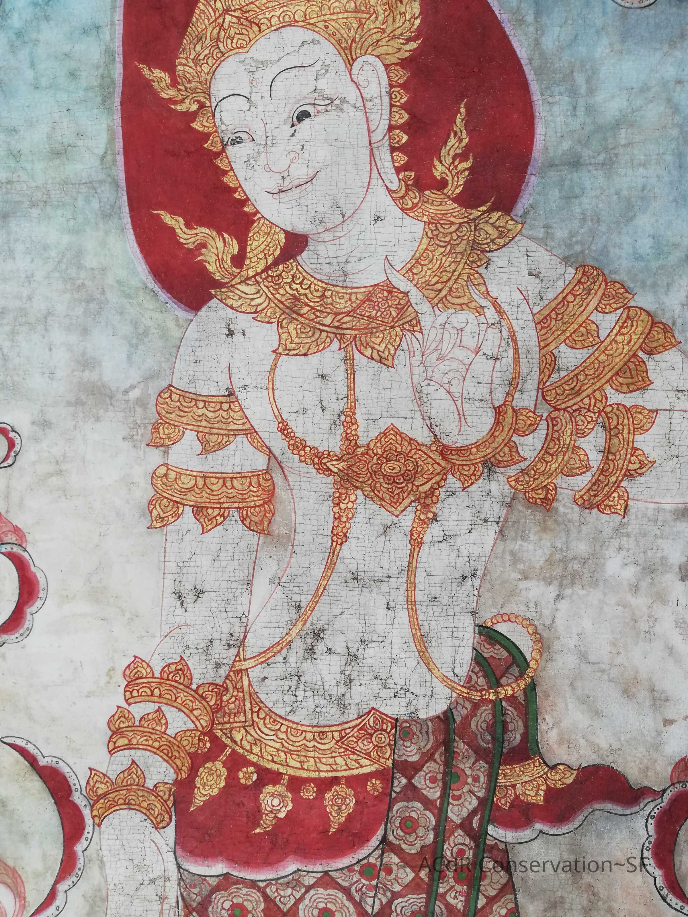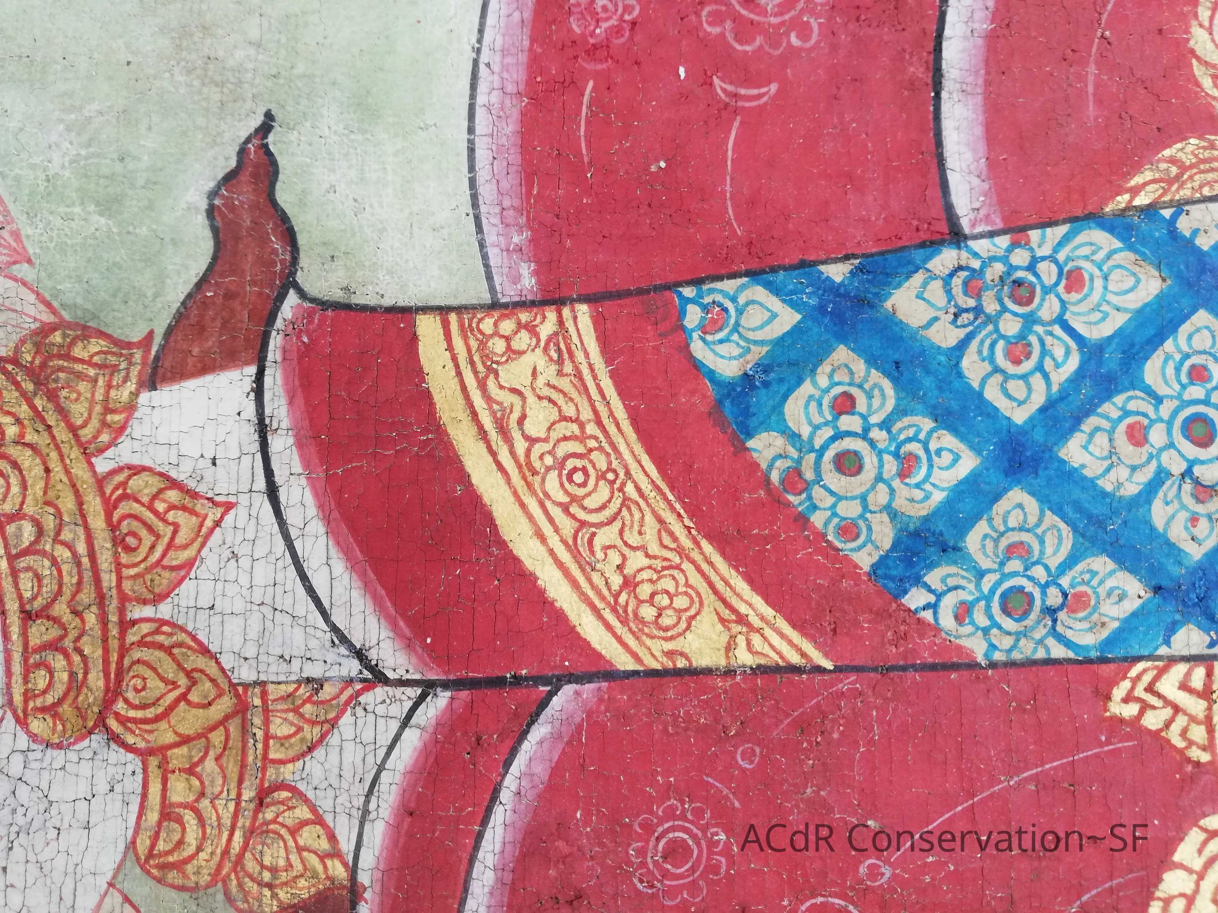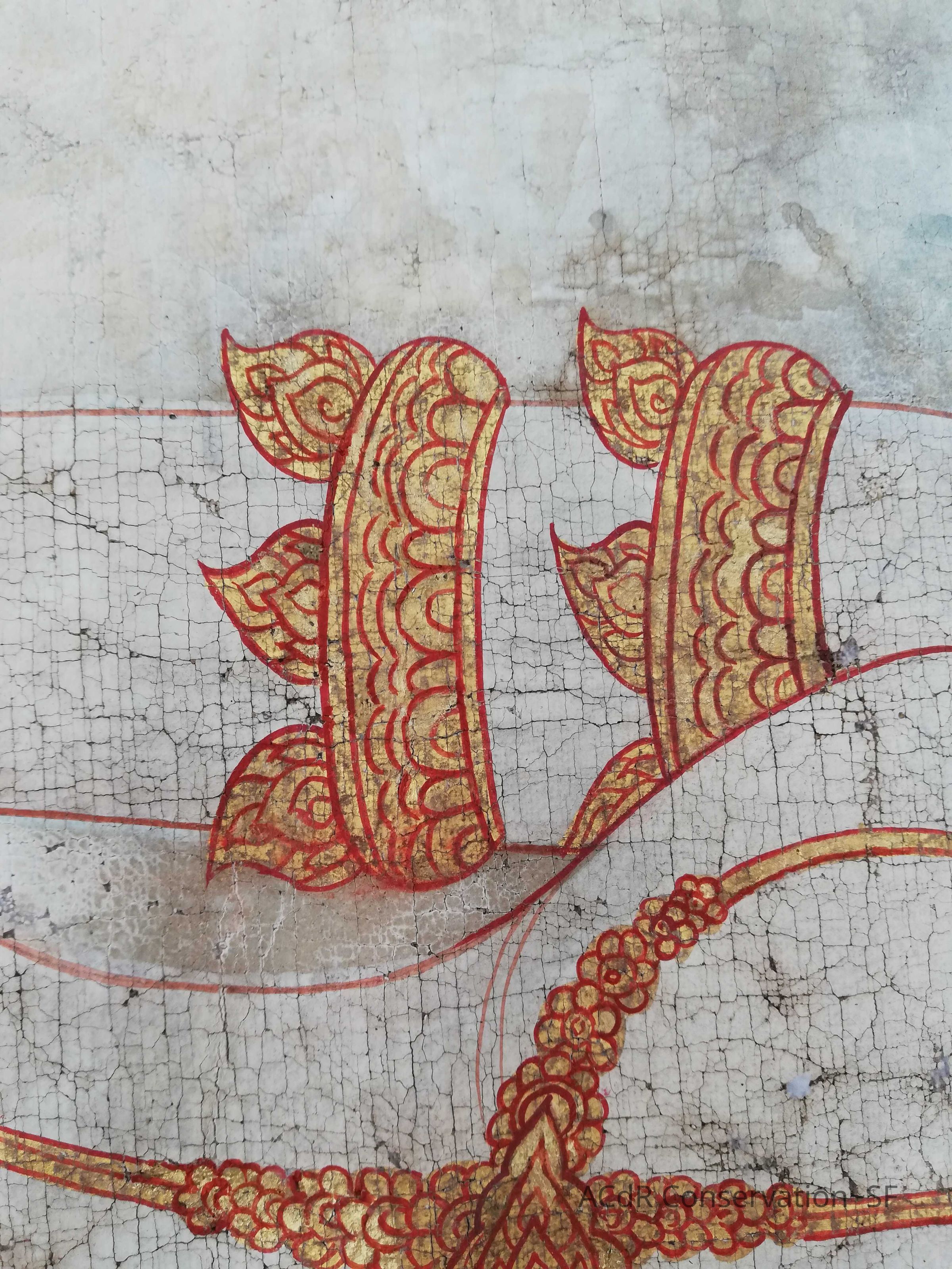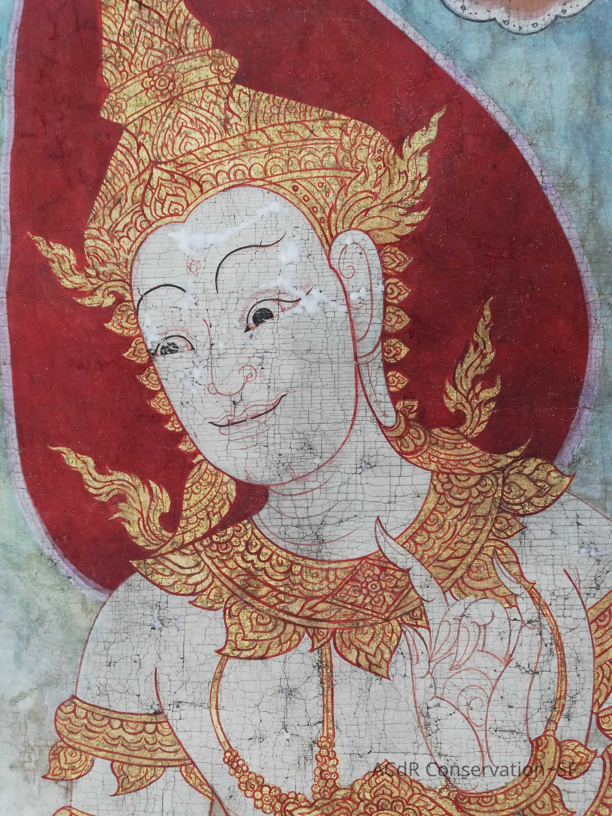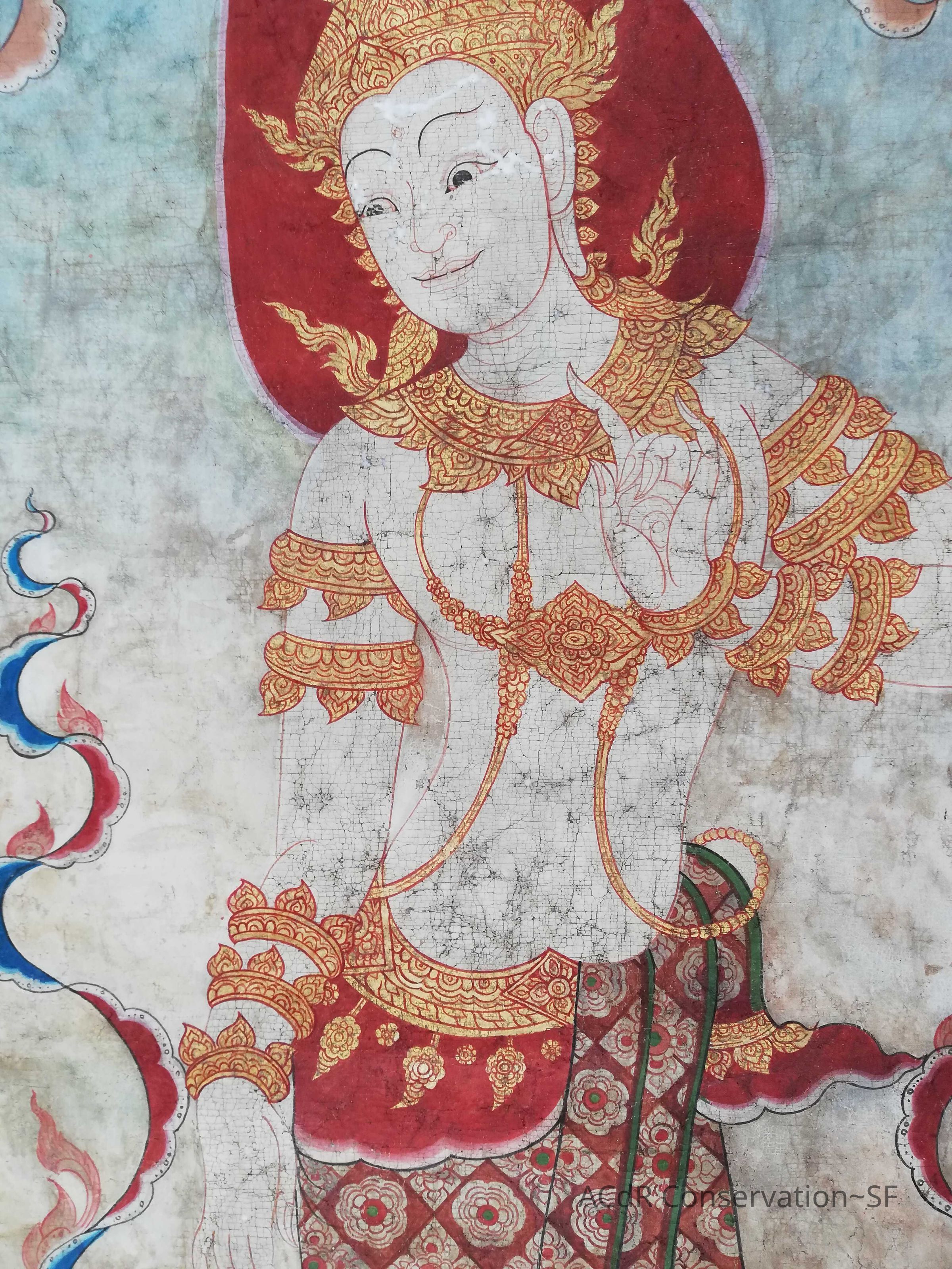 Paint layer consolidation with 3% Klucel in isoproyl on stand and feet area.