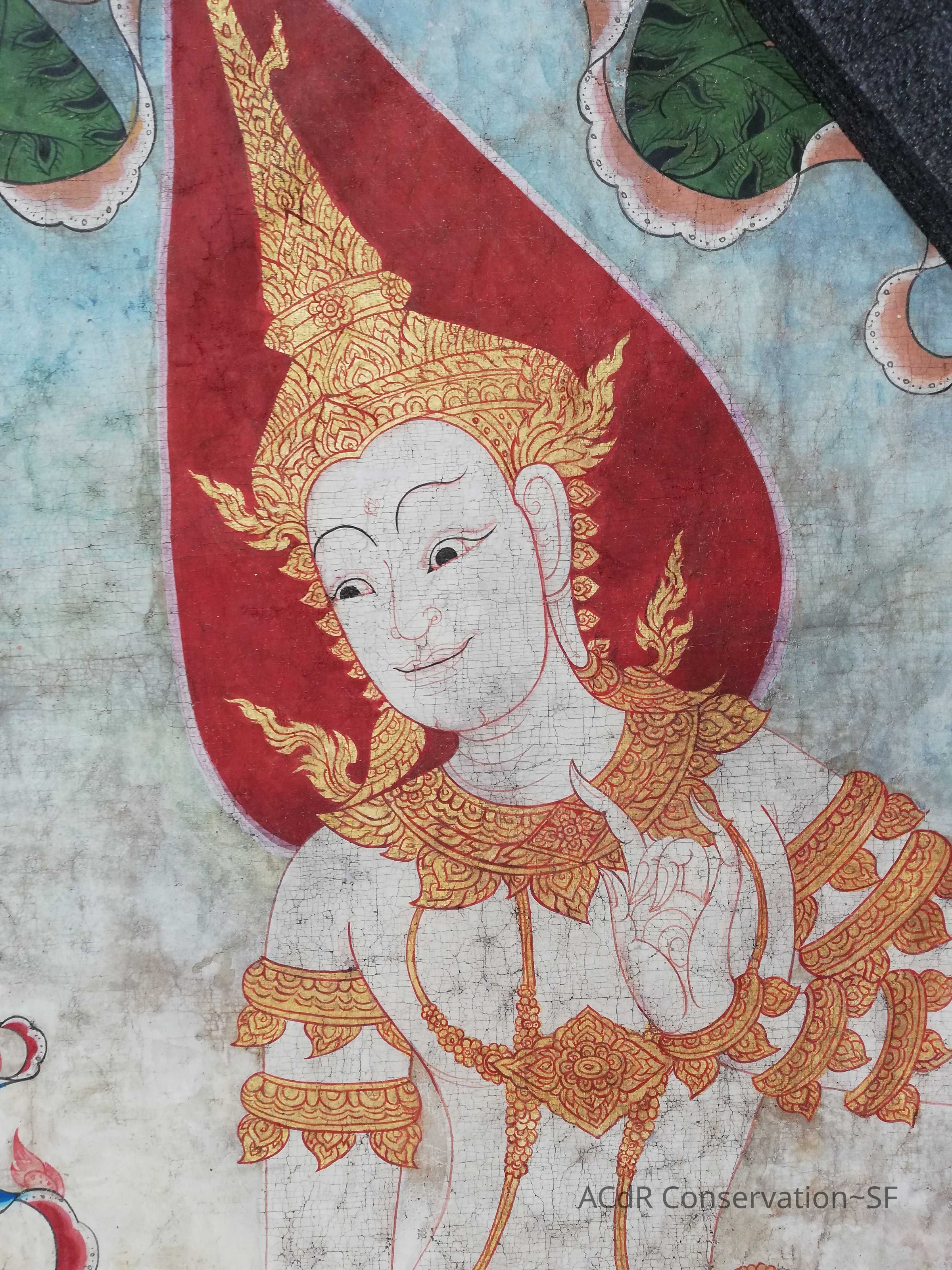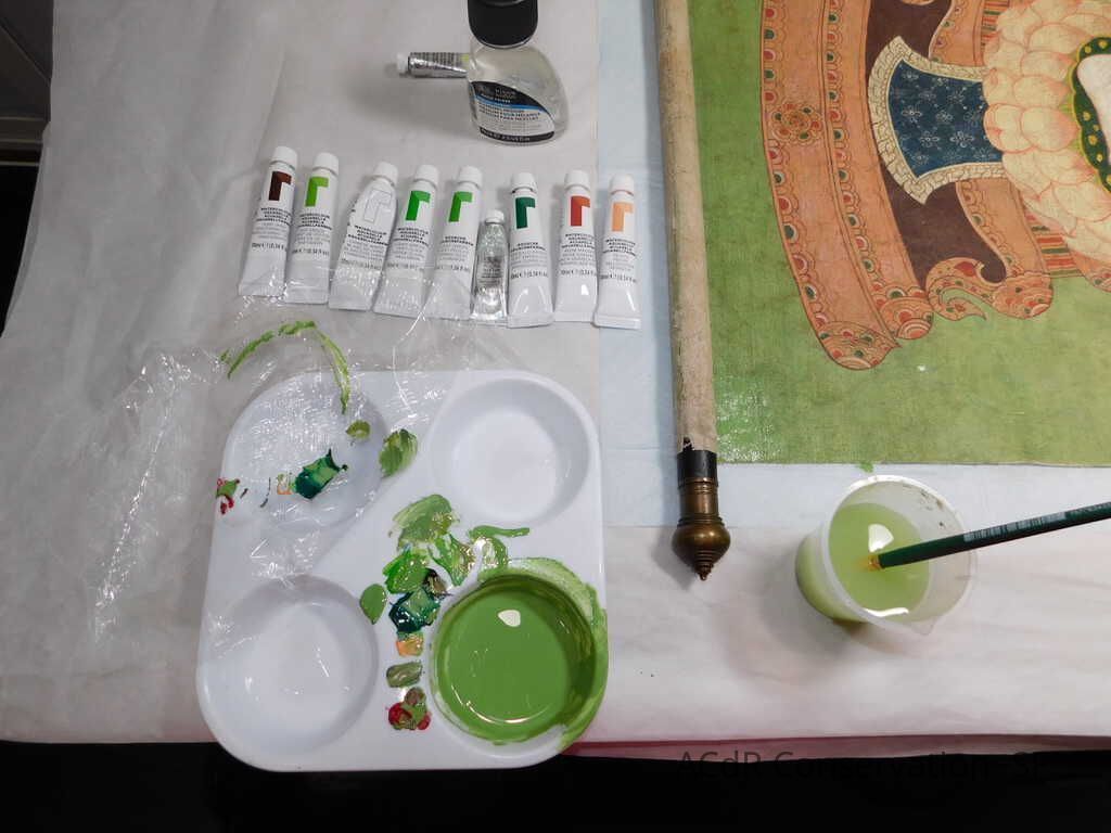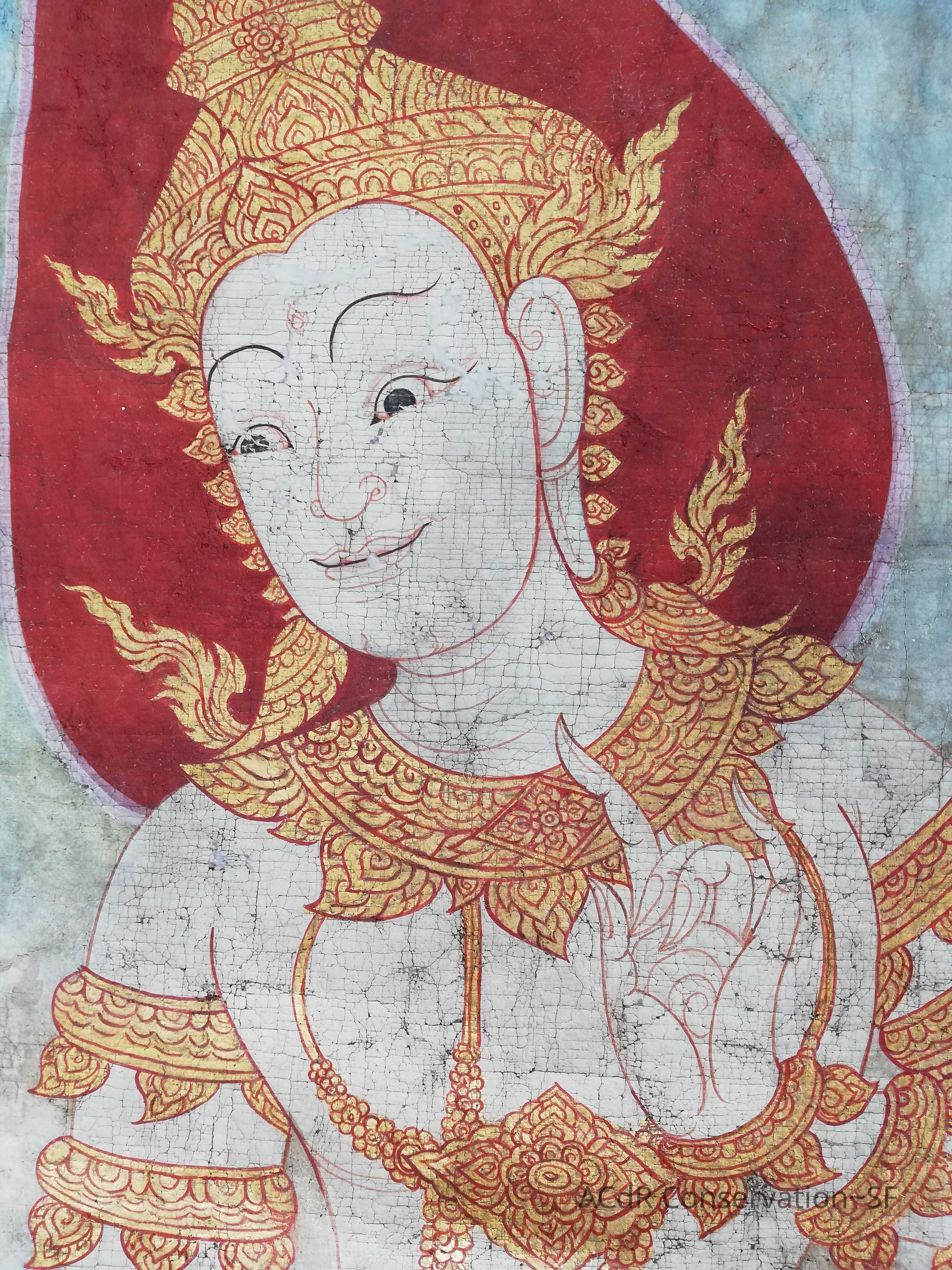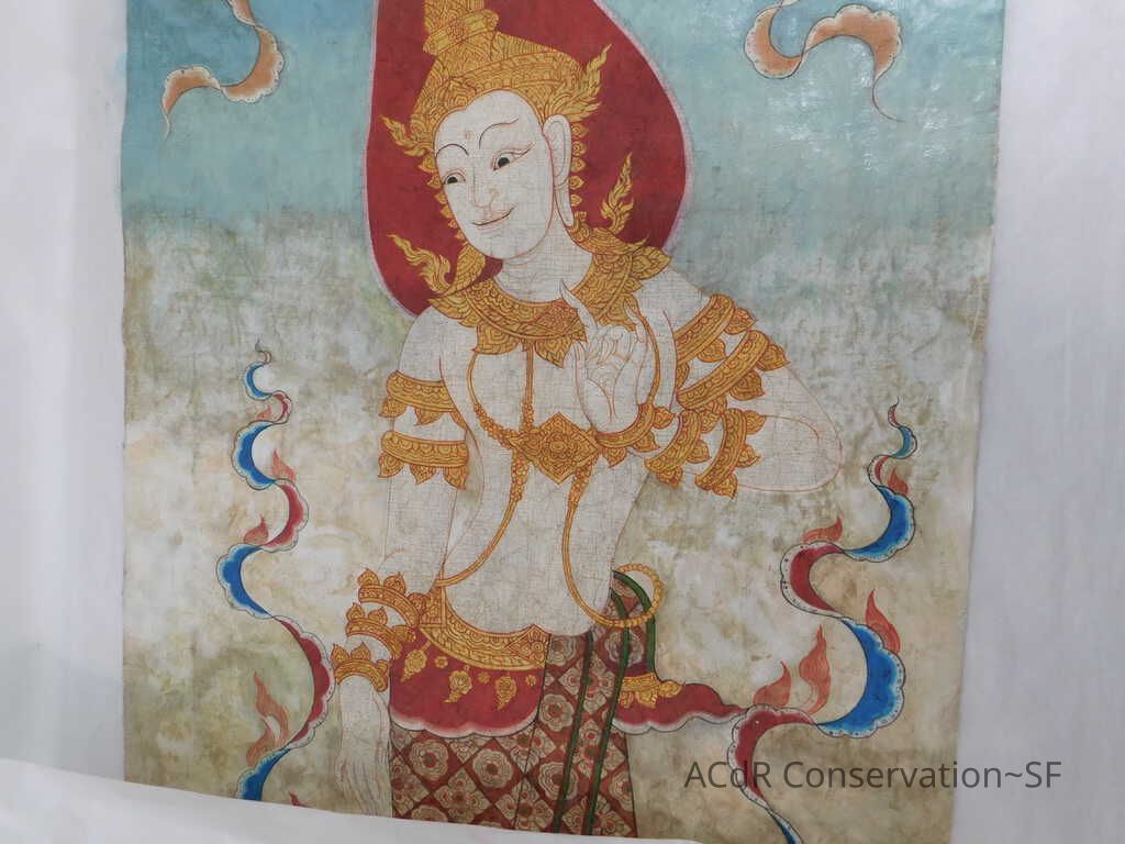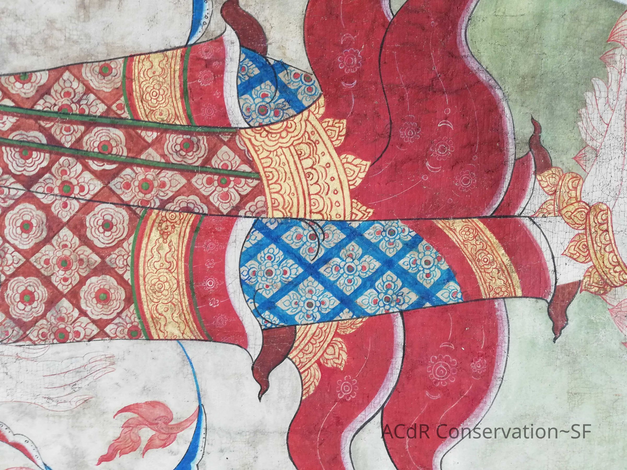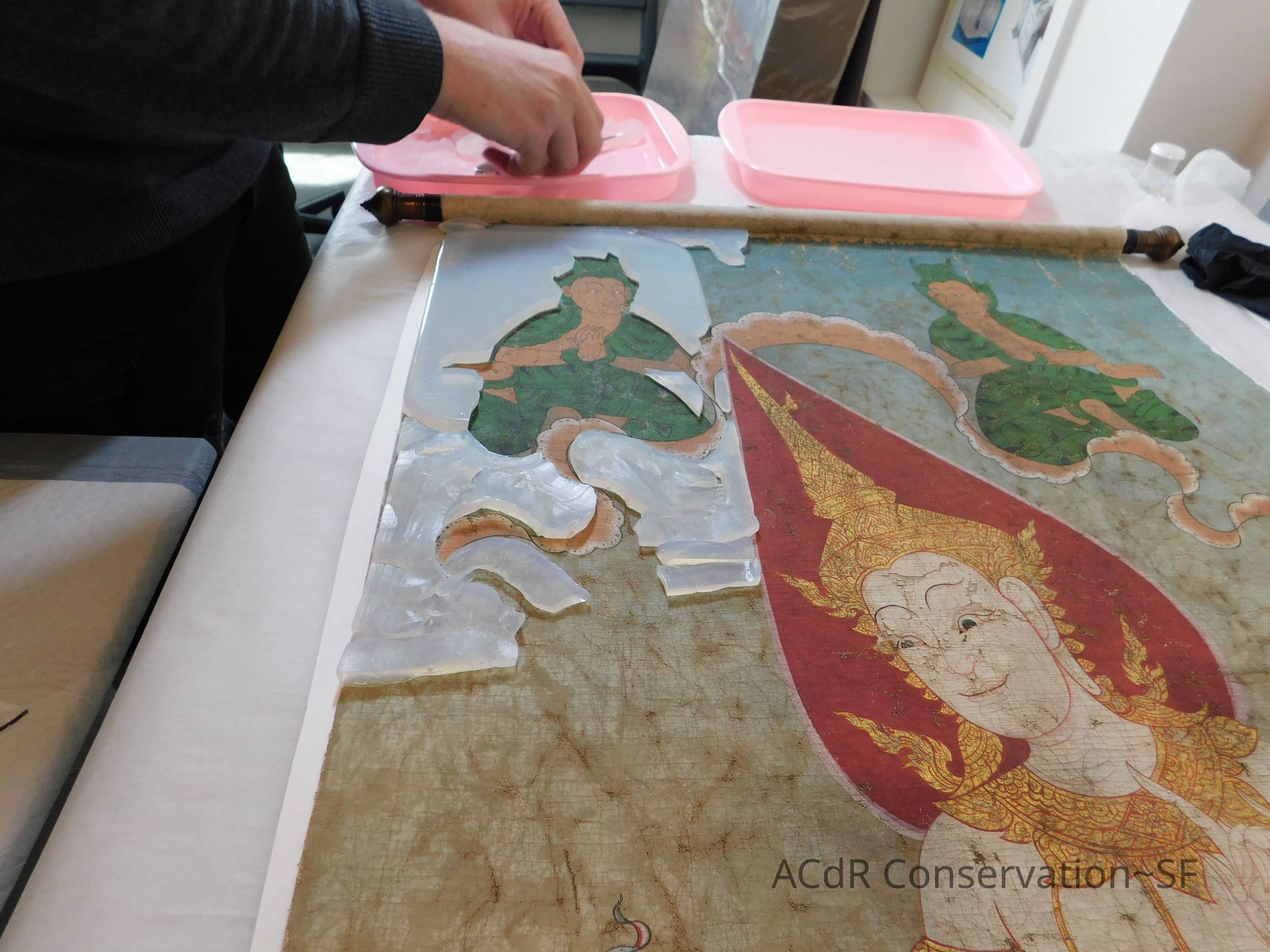 Paint layer consolidation with 3% Klucel in isoproyl on stand and feet area.