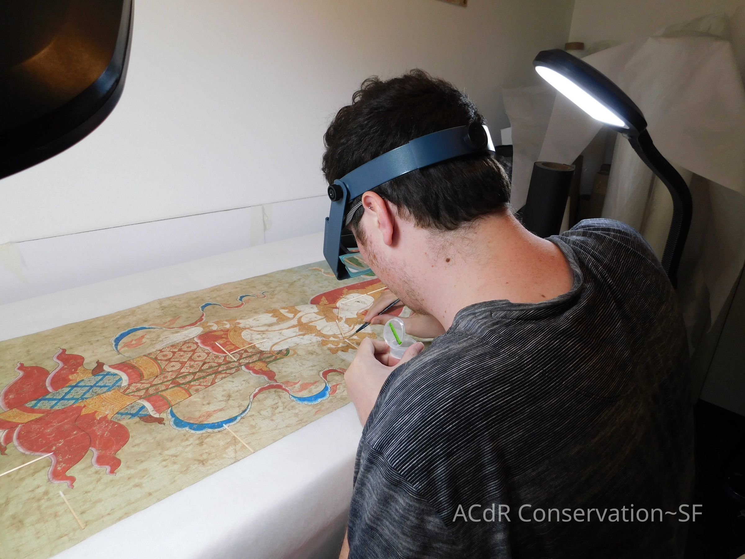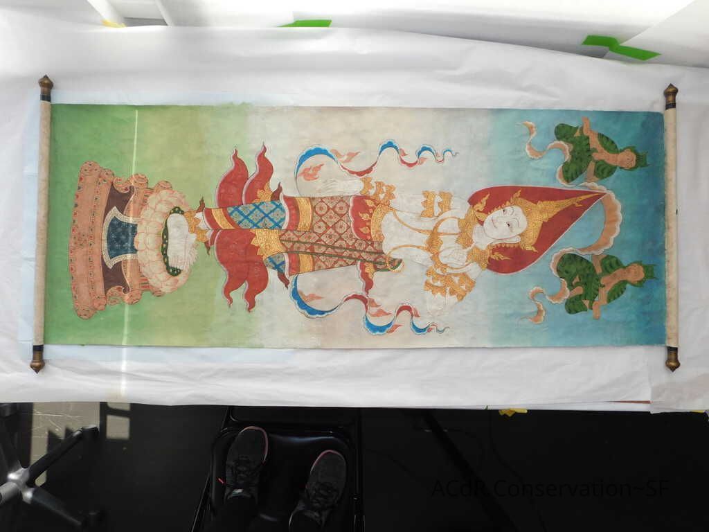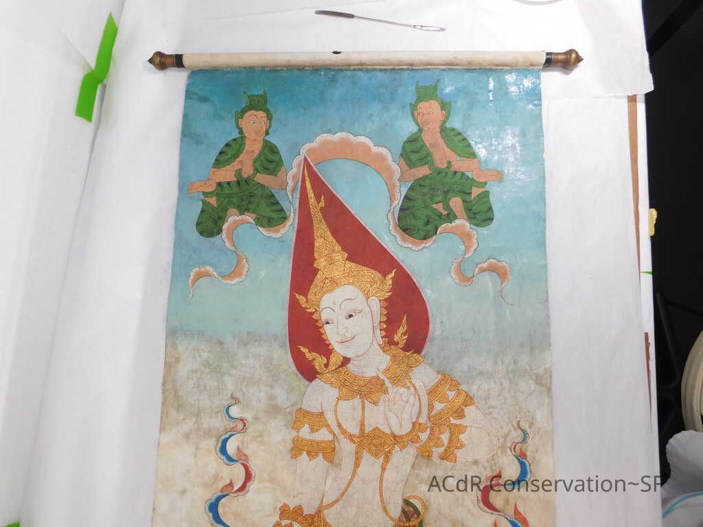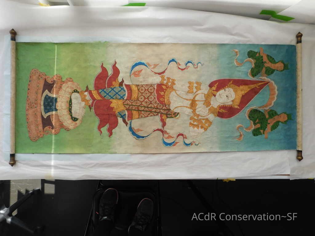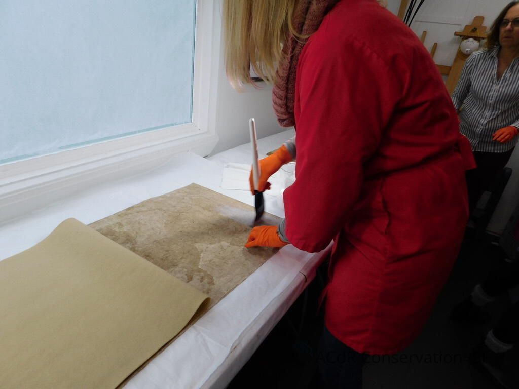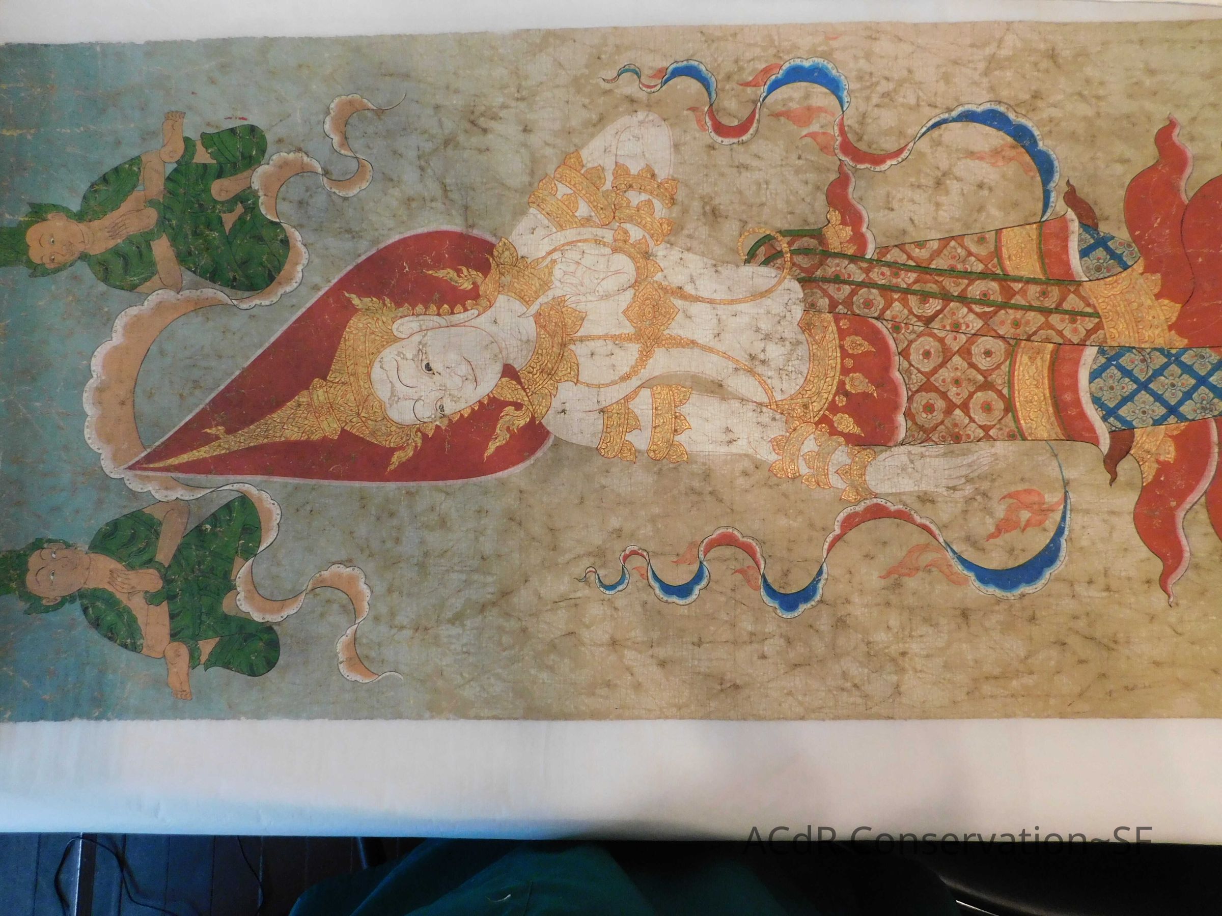 Paint layer consolidation with 3% Klucel in isoproyl on stand and feet area.