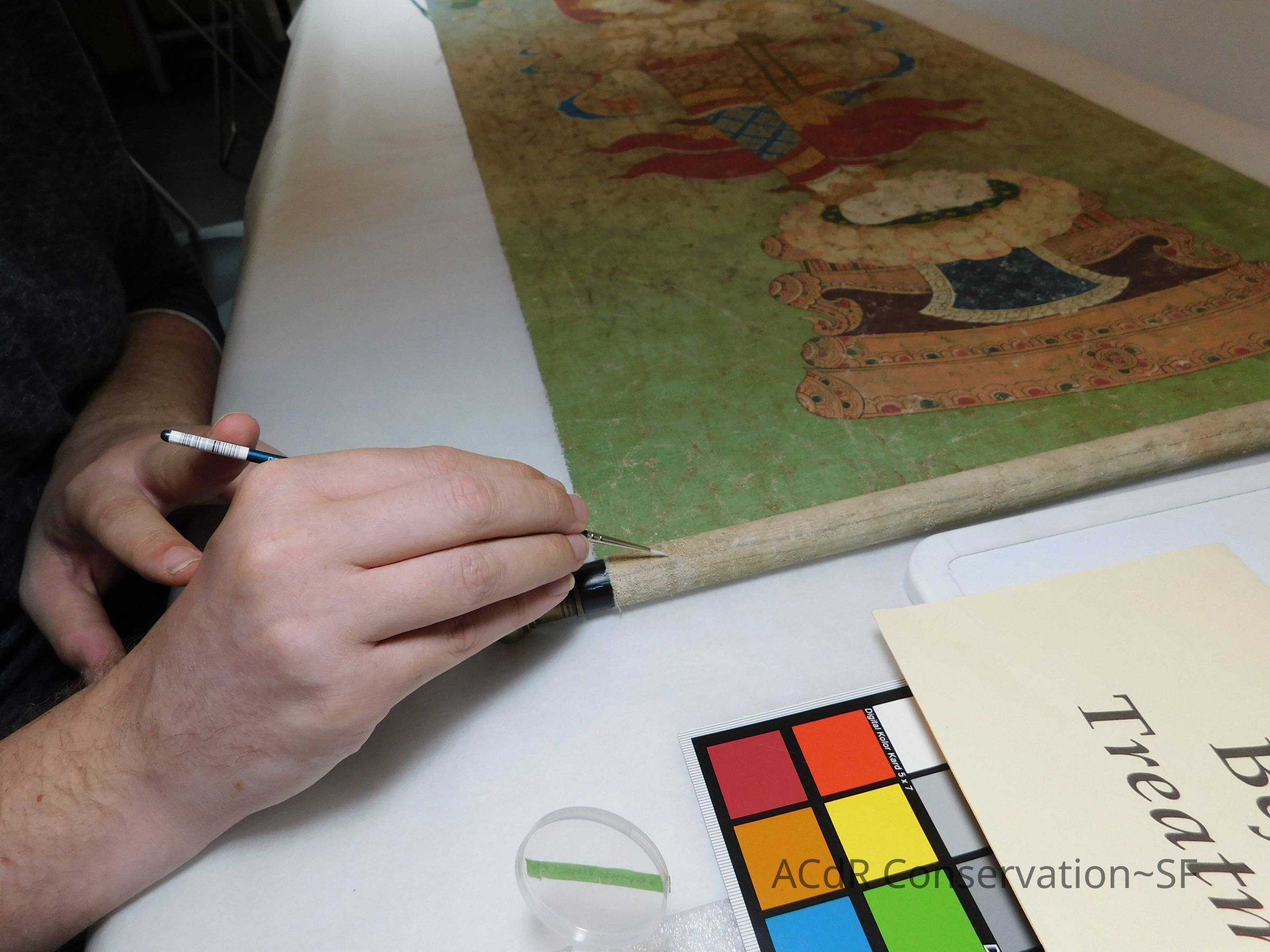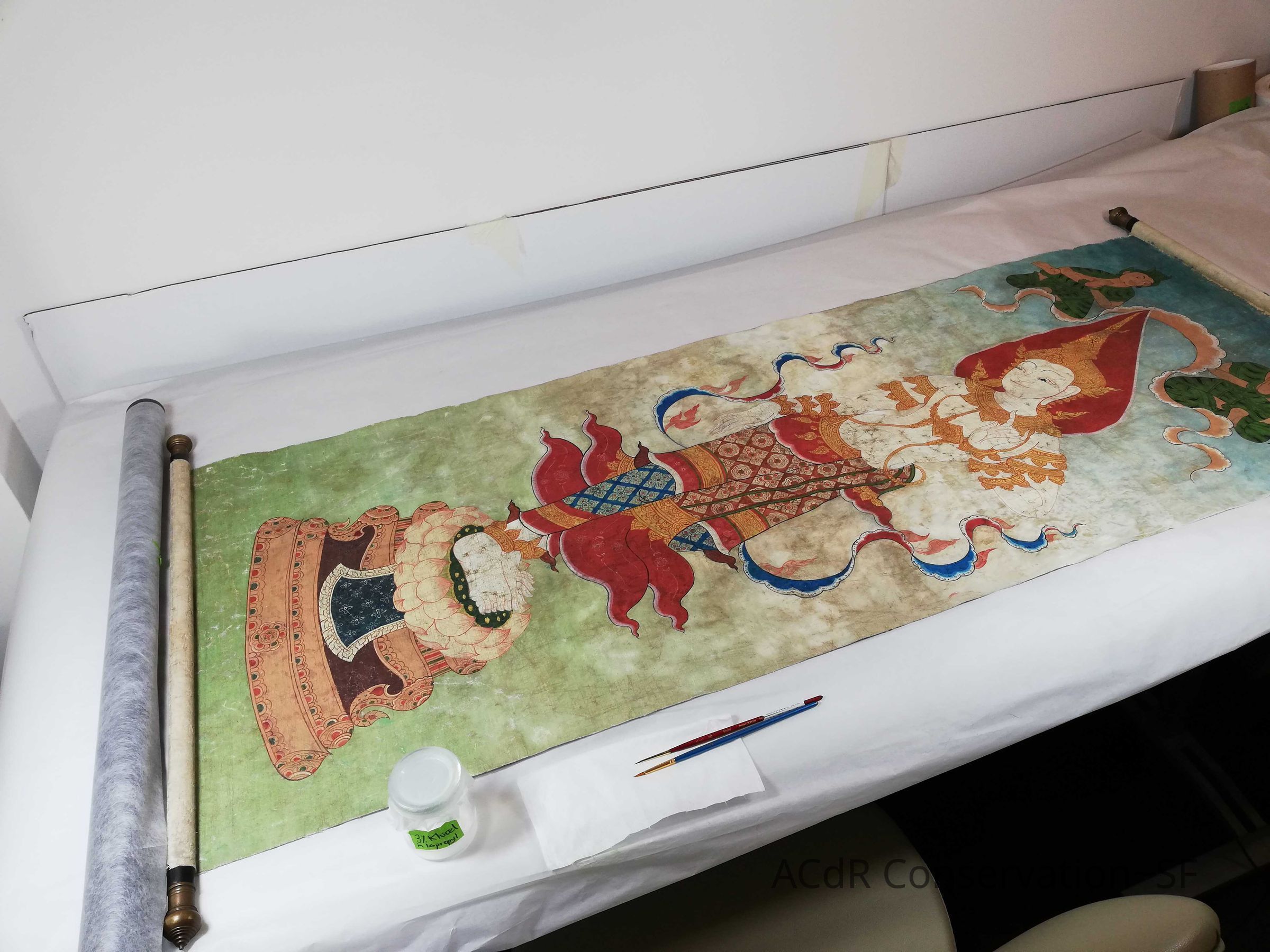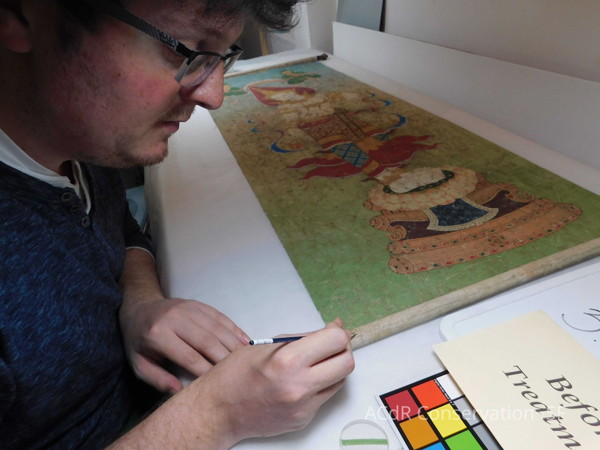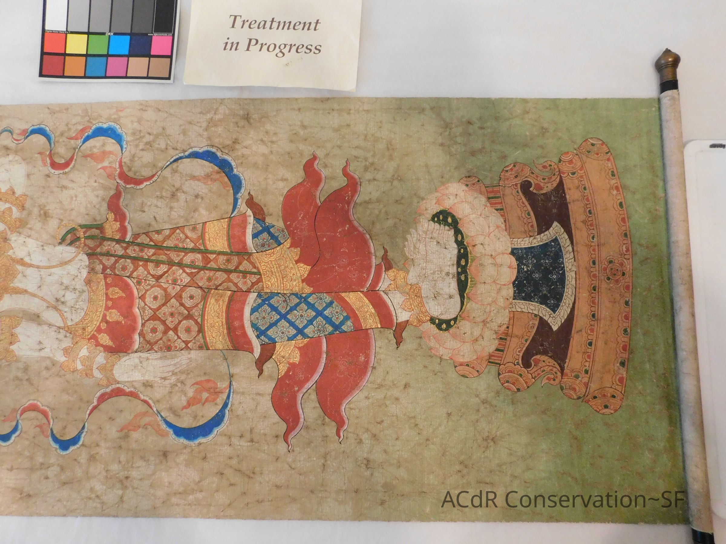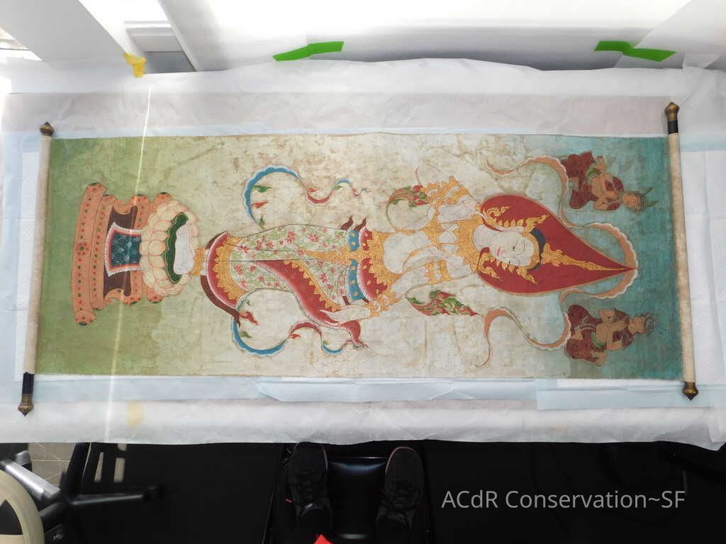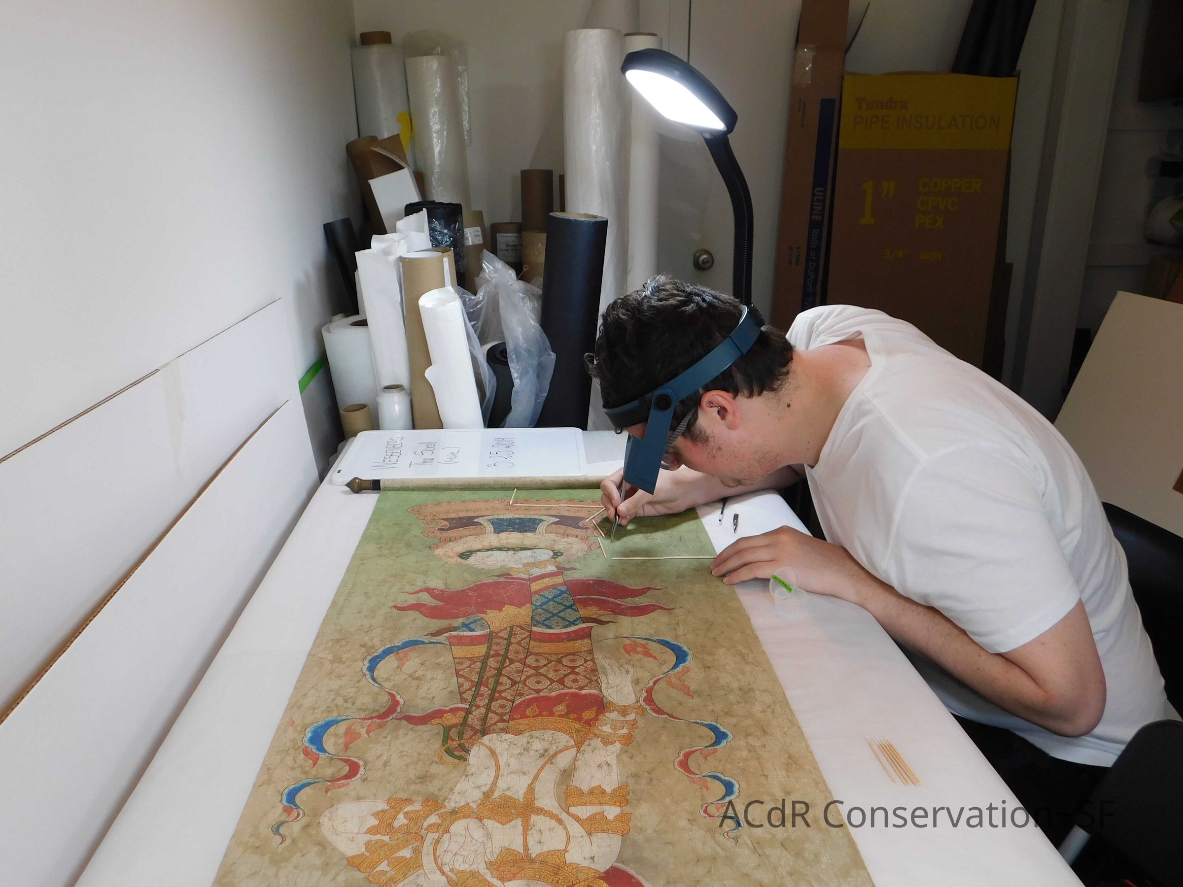 Paint layer consolidation with 3% Klucel in isoproyl on stand and feet area.